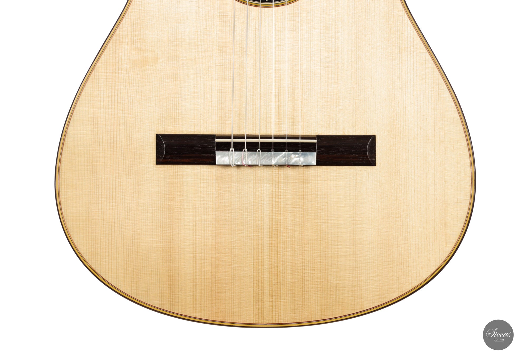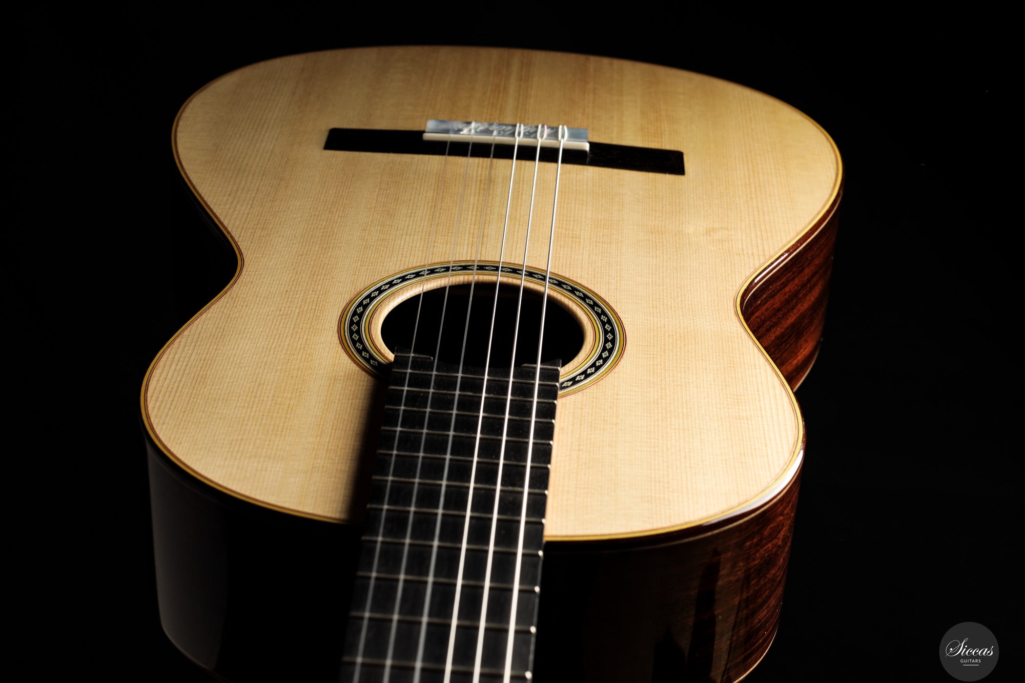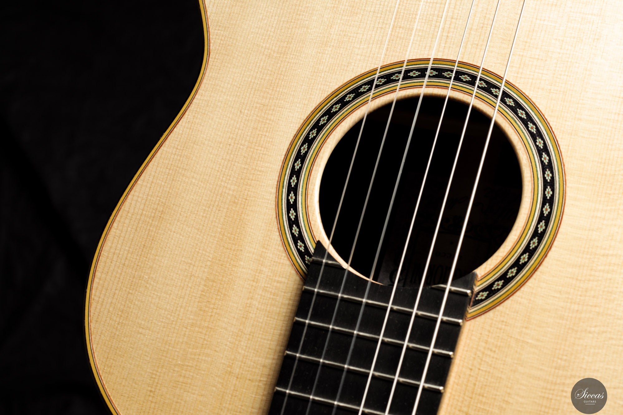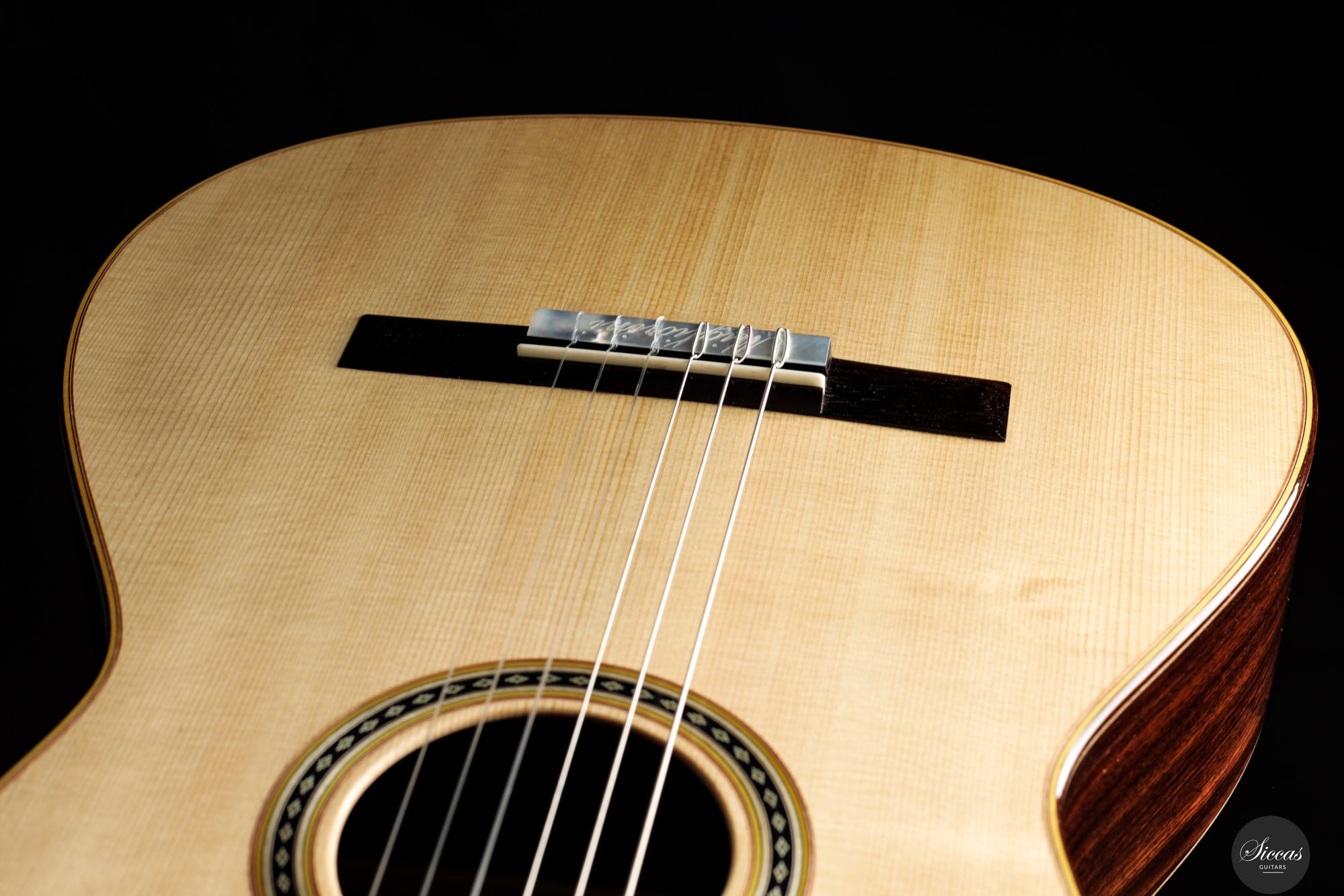Diese Double Top Gitarre aus dem Jahr 2025 verbindet zeitgenössisches Design mit traditioneller Handwerkskunst. Die äußere Fichtendecke ist mit einer inneren Zederschicht kombiniert und bildet eine reaktionsfreudige und flexible Struktur, die sehr leicht auf den Anschlag reagiert. Der Korpus aus indischem Palisander ist mit einer dünnen Nitrozelluloselackierung versehen, welche das Holz schützt und gleichzeitig seine Schwingungsfreiheit erhält. Alessi Mechaniken sorgen für ein geschmeidiges und stabiles Stimmen.