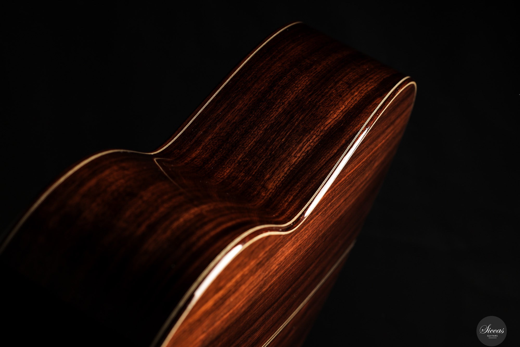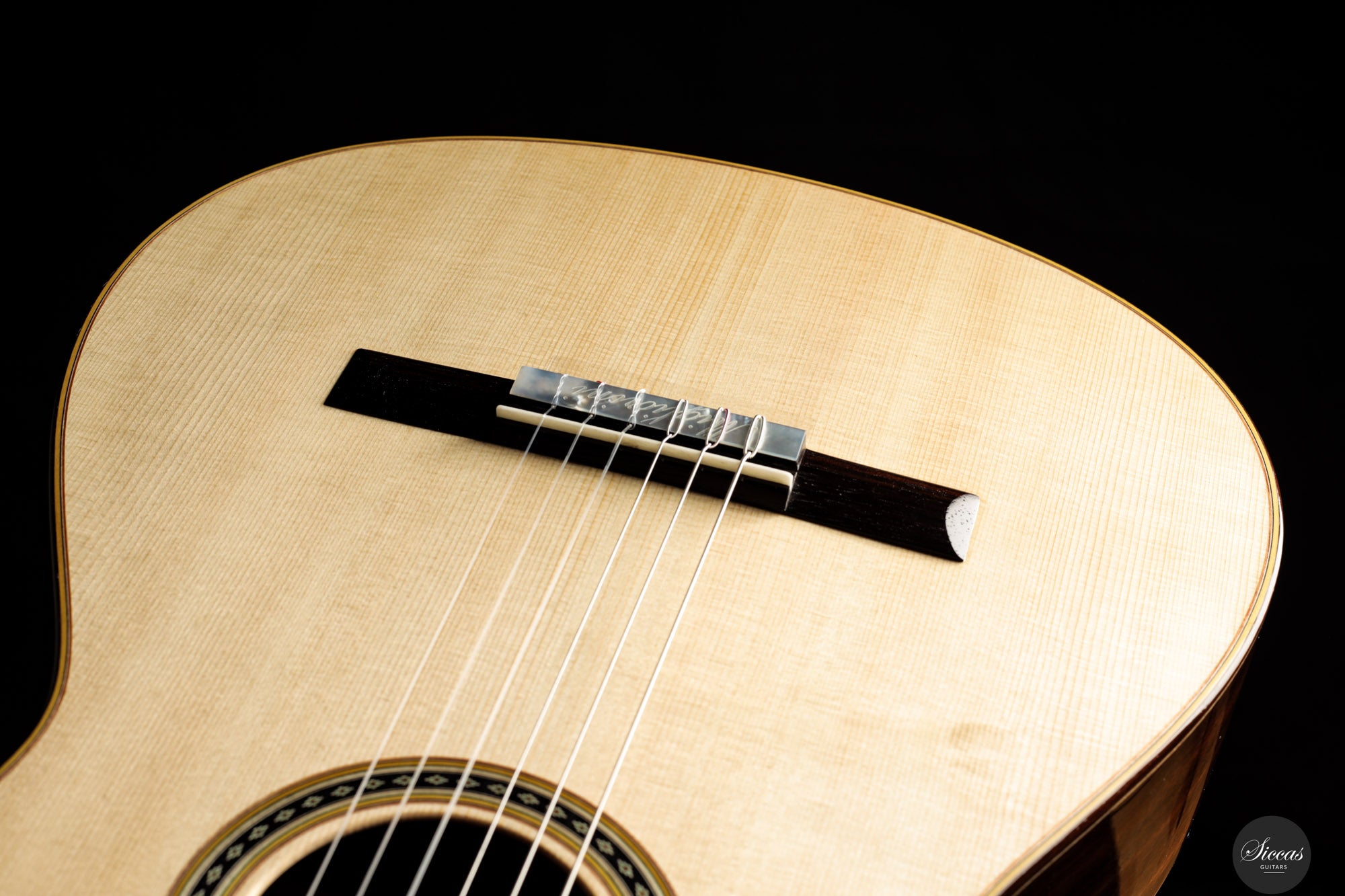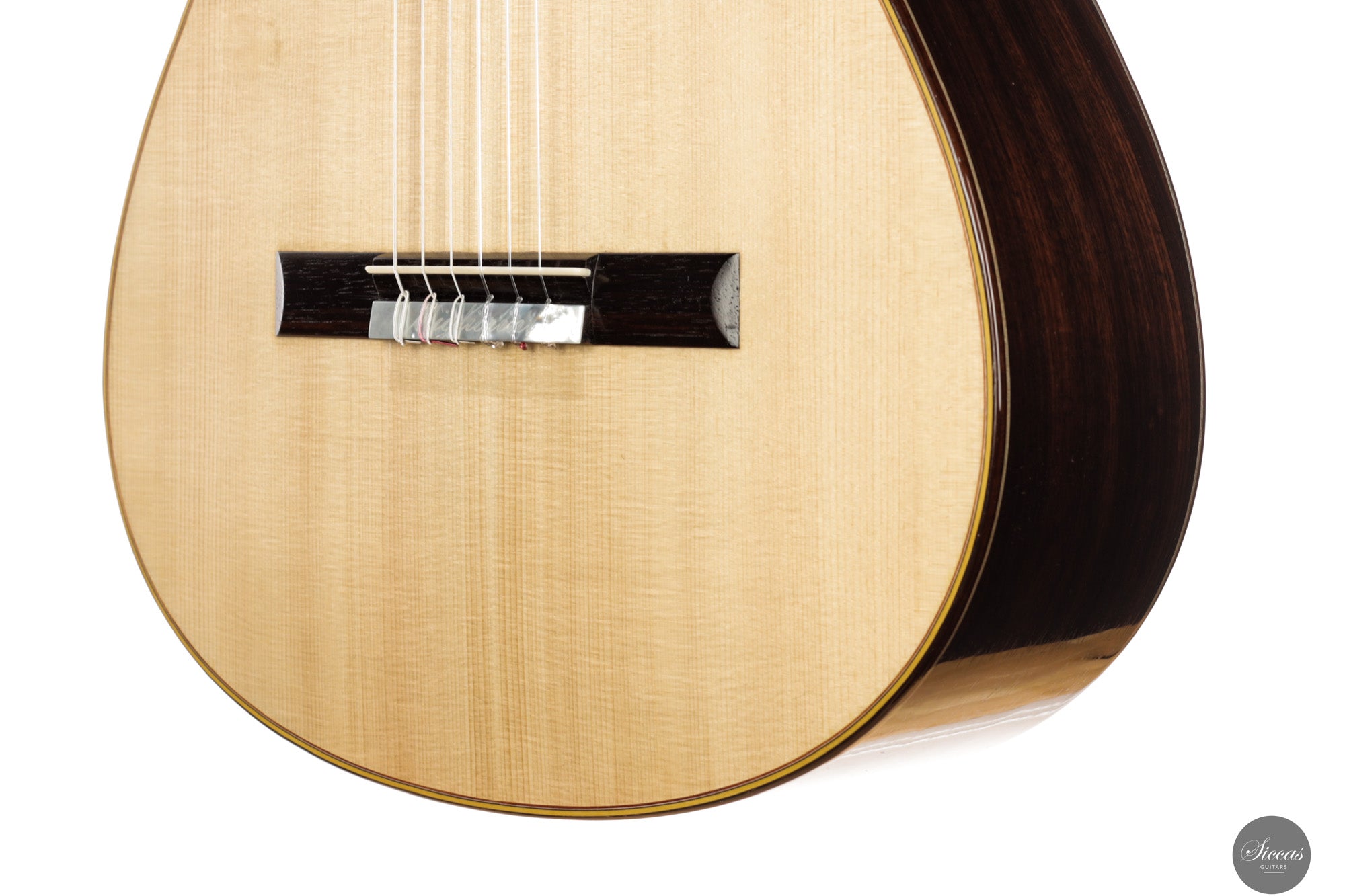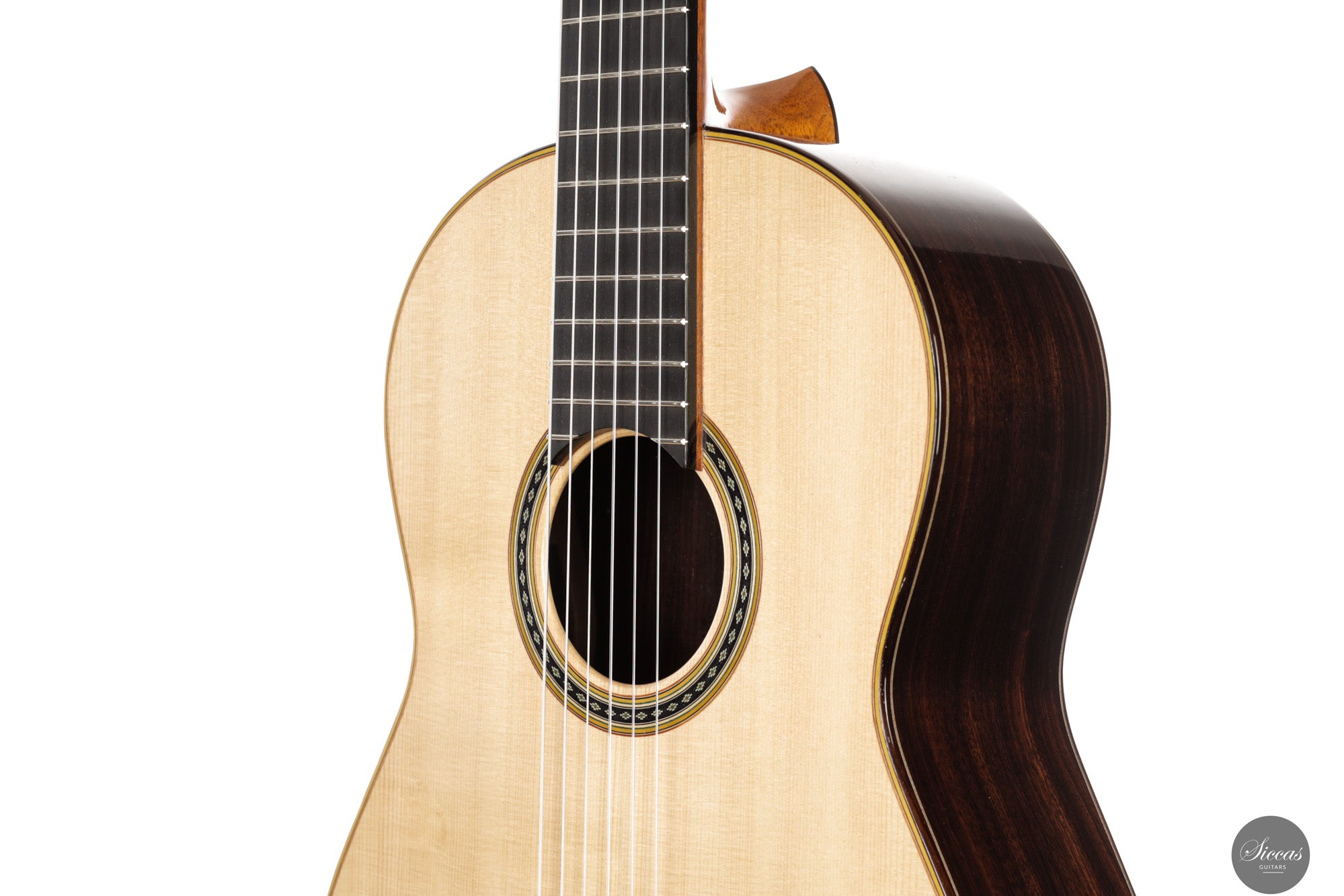 Diese Double Top Gitarre aus dem Jahr 2025 verbindet zeitgenössisches Design mit traditioneller Handwerkskunst. Die äußere Fichtendecke ist mit einer inneren Zederschicht kombiniert und bildet eine reaktionsfreudige und flexible Struktur, die sehr leicht auf den Anschlag reagiert. Der Korpus aus indischem Palisander ist mit einer dünnen Nitrozelluloselackierung versehen, welche das Holz schützt und gleichzeitig seine Schwingungsfreiheit erhält. Alessi Mechaniken sorgen für ein geschmeidiges und stabiles Stimmen.
