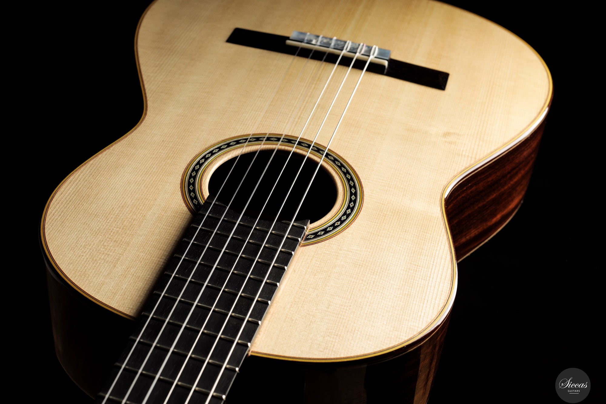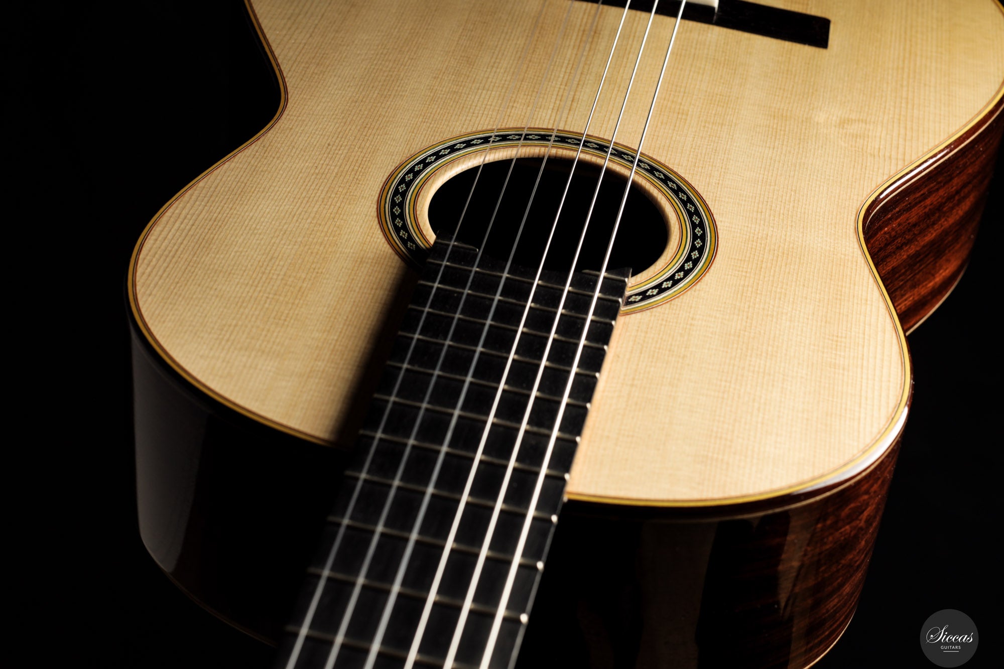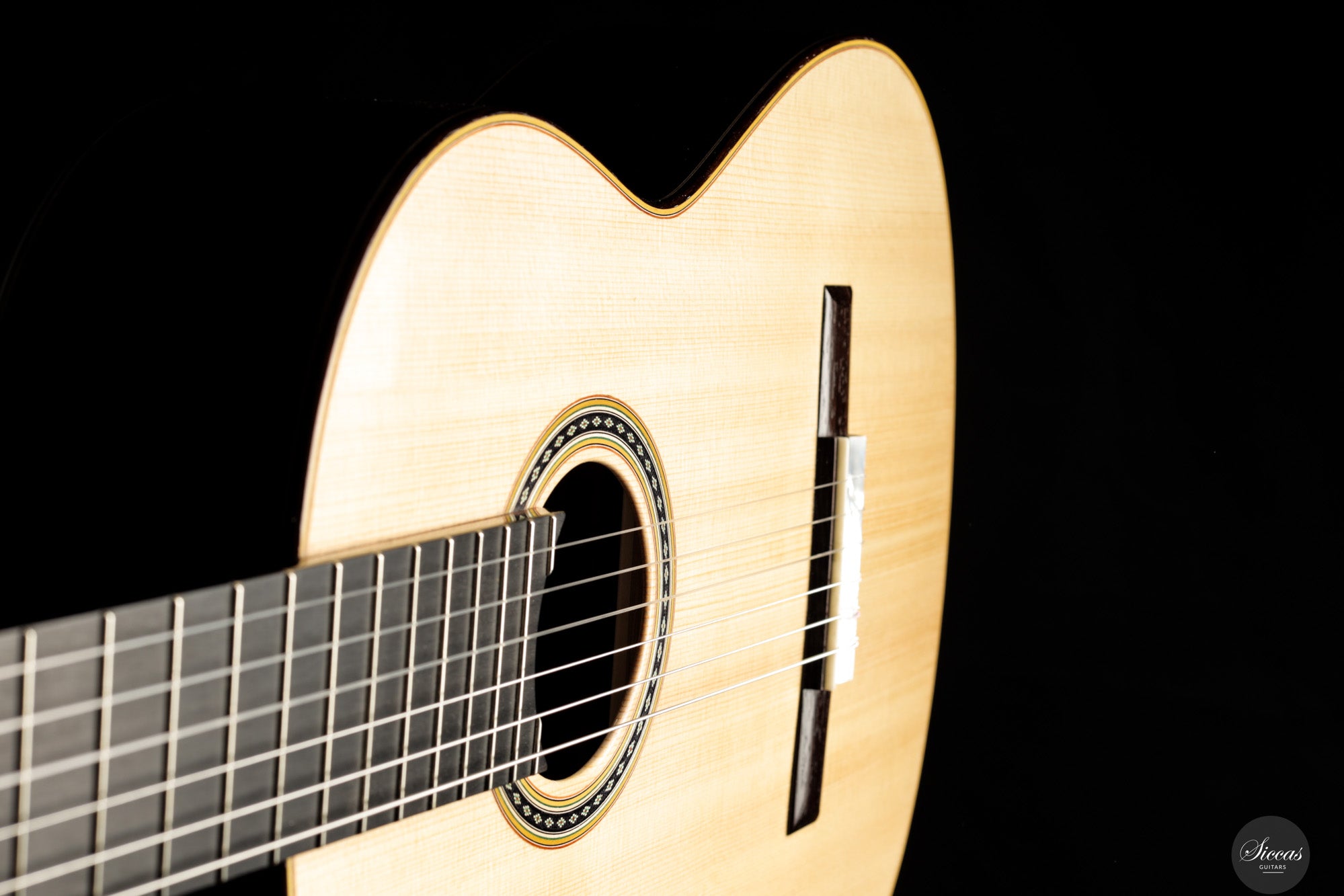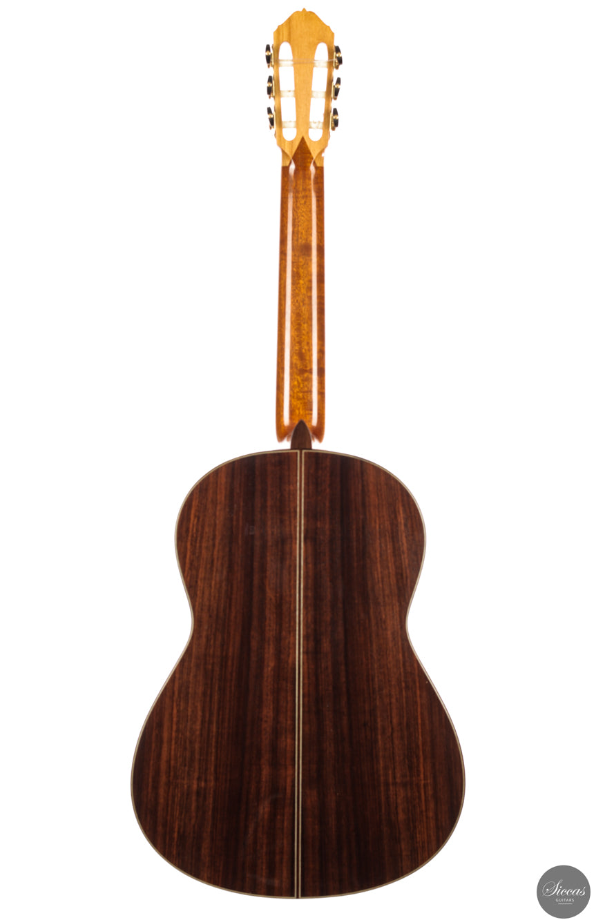 Klanglich vereint die Gitarre die Kraft und Direktheit einer modernen Double Top Konstruktion mit einer Farbpalette, wie man sie von traditionellen Konzertinstrumenten erwartet. Der Grundcharakter ist überwiegend dunkel und rund, zugleich zeigt der Ton im Ansatz eine klare und spruchartige Kontur. Die Ansprache ist schnell und kontrolliert, wodurch schnelle Läufe und Akkordwechsel leicht von der Hand gehen. Die Register sind sehr ausgewogen und jede Note besitzt eine vergleichbare Intensität, was eine klare Stimmführung und transparente Polyphonie unterstützt. Die Projektion ist lebhaft und zielgerichtet, sodass das Instrument den Raum mühelos füllt, während Wärme und Tiefe dem Klang eine deutlich gesangliche und ausdrucksstarke Qualität verleihen.
