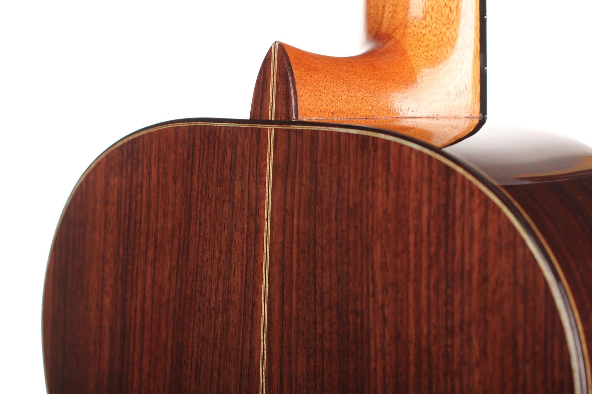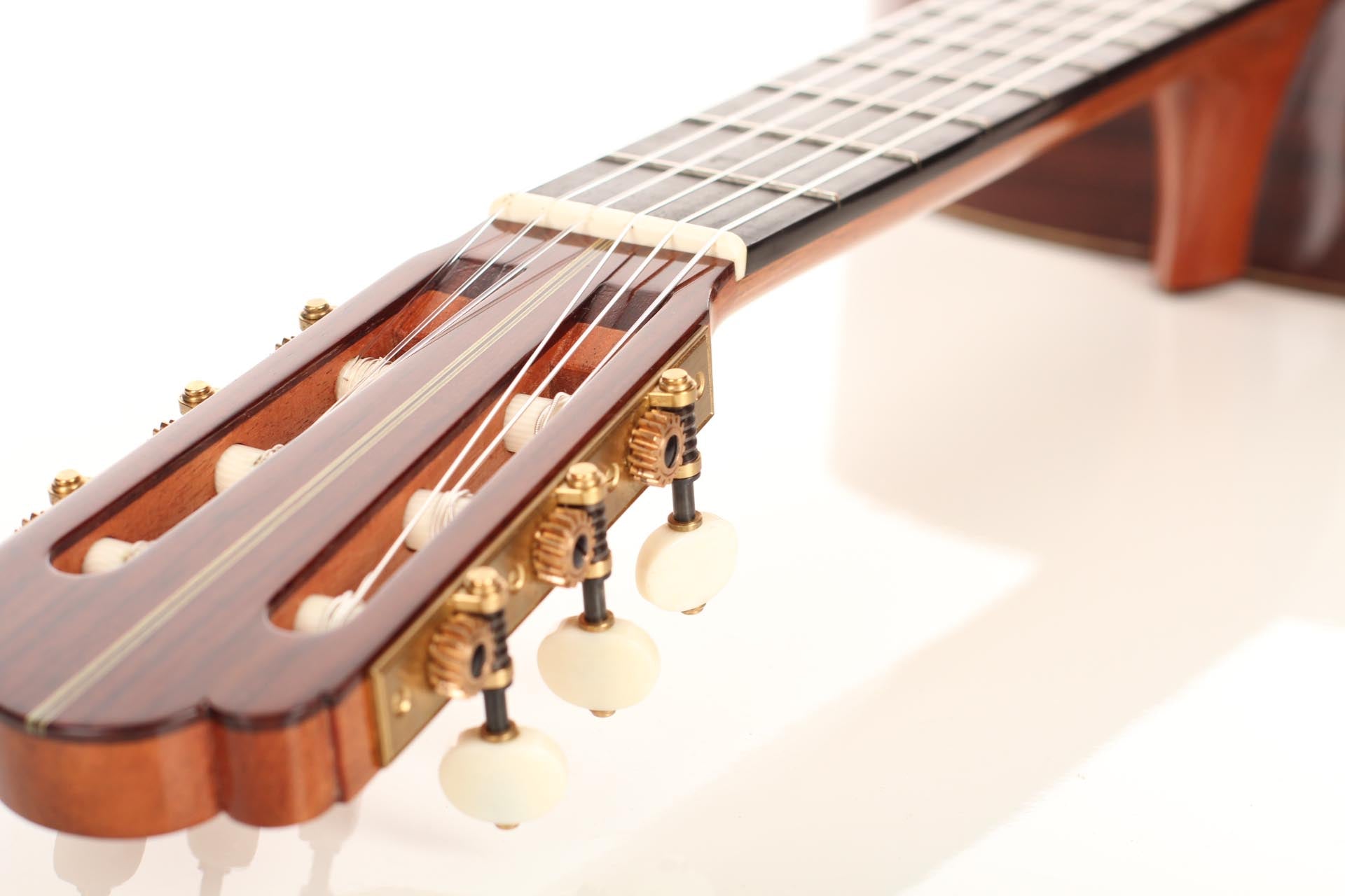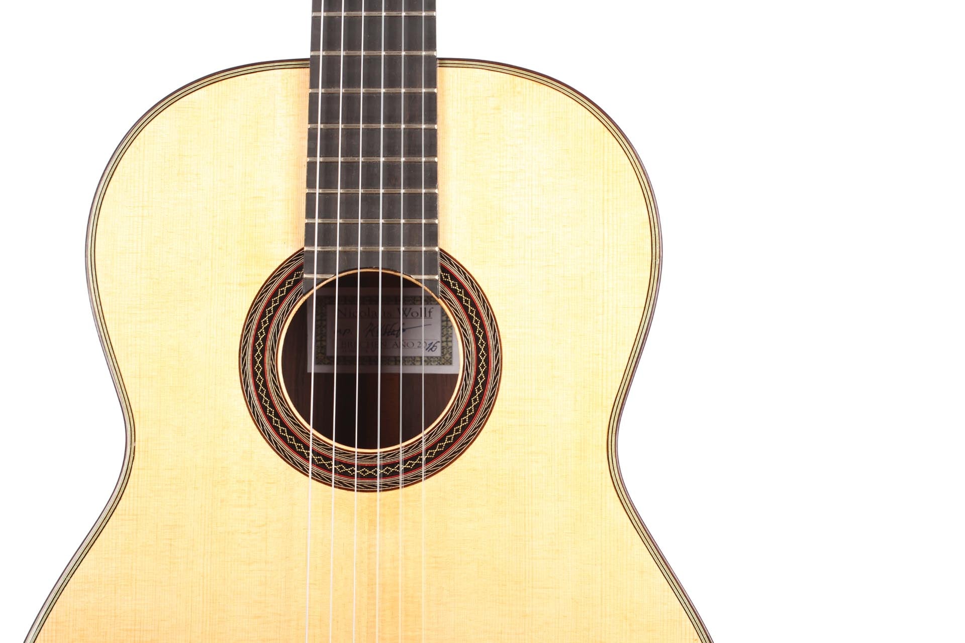 Nicolaus Wollf started making guitars in 1966. He made his apprenticeship under the master guitar maker Ernest Köröskeny and after that he studied under the master guitar maker Dieter Hopf where he worked also from 1991 to 1994. In the same year when he left the Hopf workshop he opened his own in Oberneisen and afther five years he moved to Niederbrechen, Germany. The bass is deep and resonant (air resonance around F#) and the treble is open and singing. About the playability we can say that is is very comfortable to play. It is a lovely guitar with spruce top and Indian rosewood back and sides. The tuning machines are made by Klaus Scheller. A hardshell case is included.