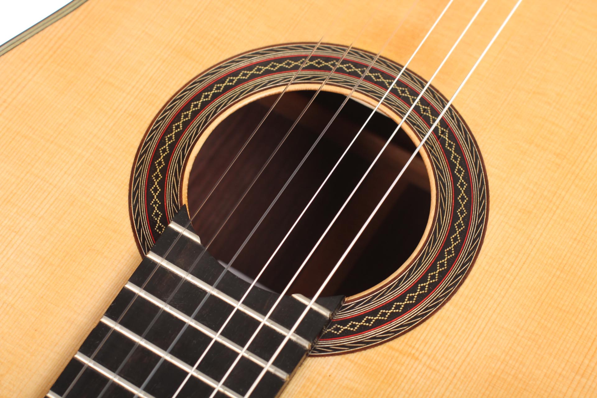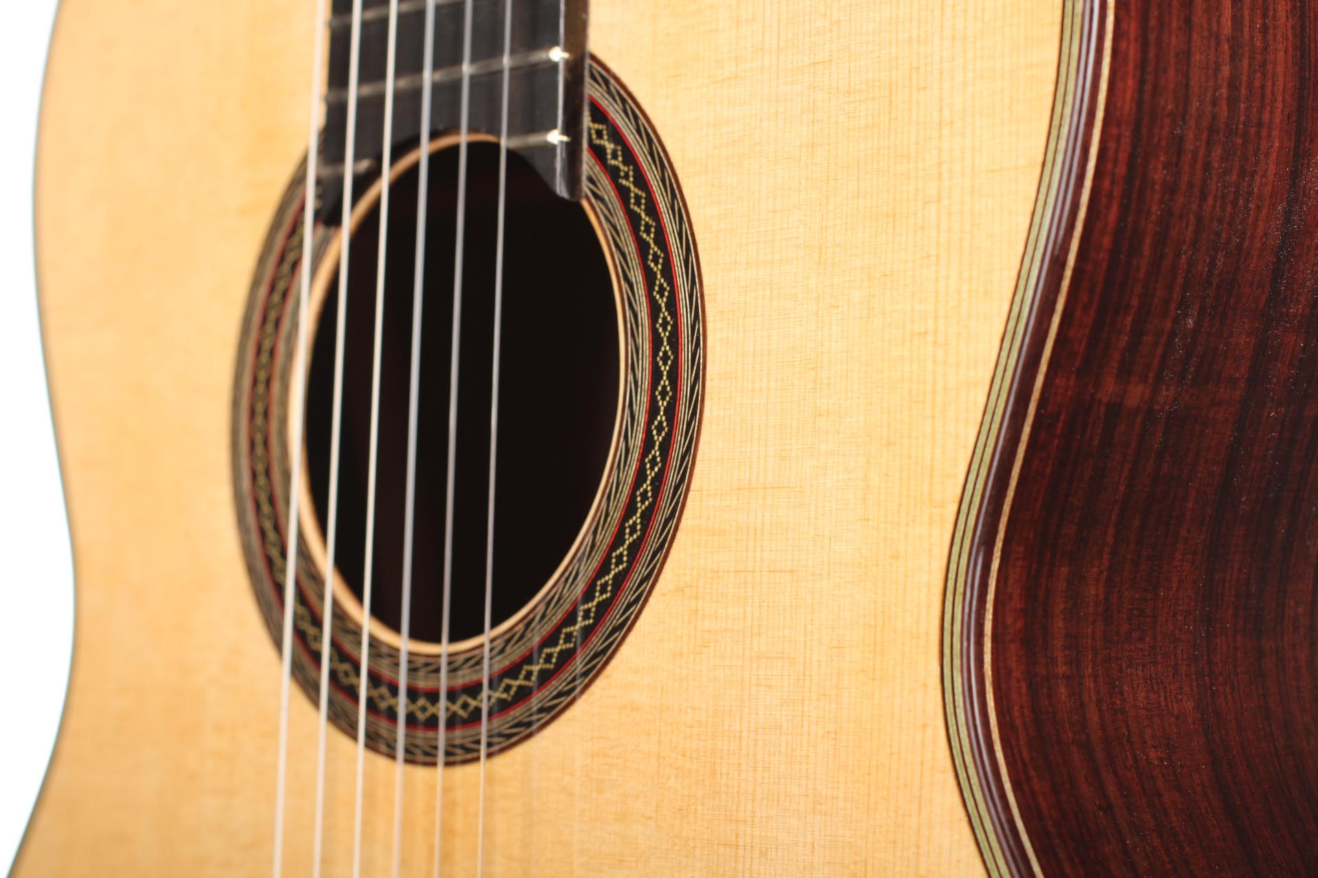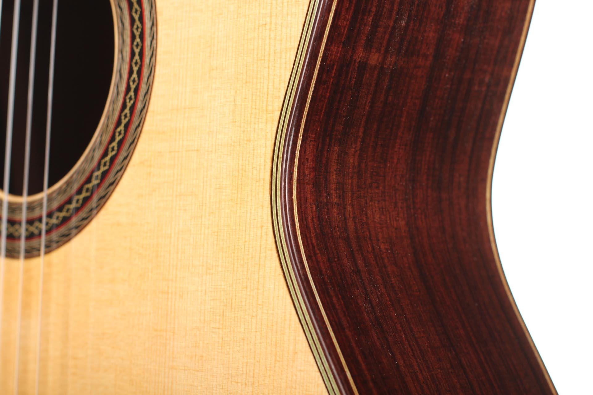 Nicolaus Wollf started making guitars in 1966. He made his apprenticeship under the master guitar maker Ernest Köröskeny and after that he studied under the master guitar maker Dieter Hopf where he worked also from 1991 to 1994. In the same year when he left the Hopf workshop he opened his own in Oberneisen and afther five years he moved to Niederbrechen, Germany. The bass is deep and resonant (air resonance around F#) and the treble is open and singing. About the playability we can say that is is very comfortable to play. It is a lovely guitar with spruce top and Indian rosewood back and sides. The tuning machines are made by Klaus Scheller. A hardshell case is included.