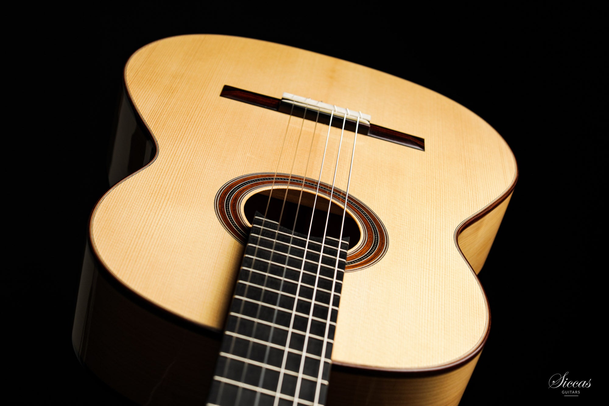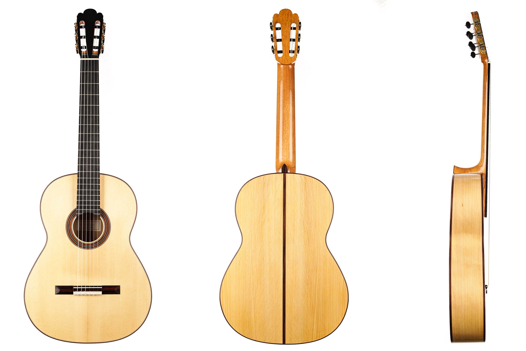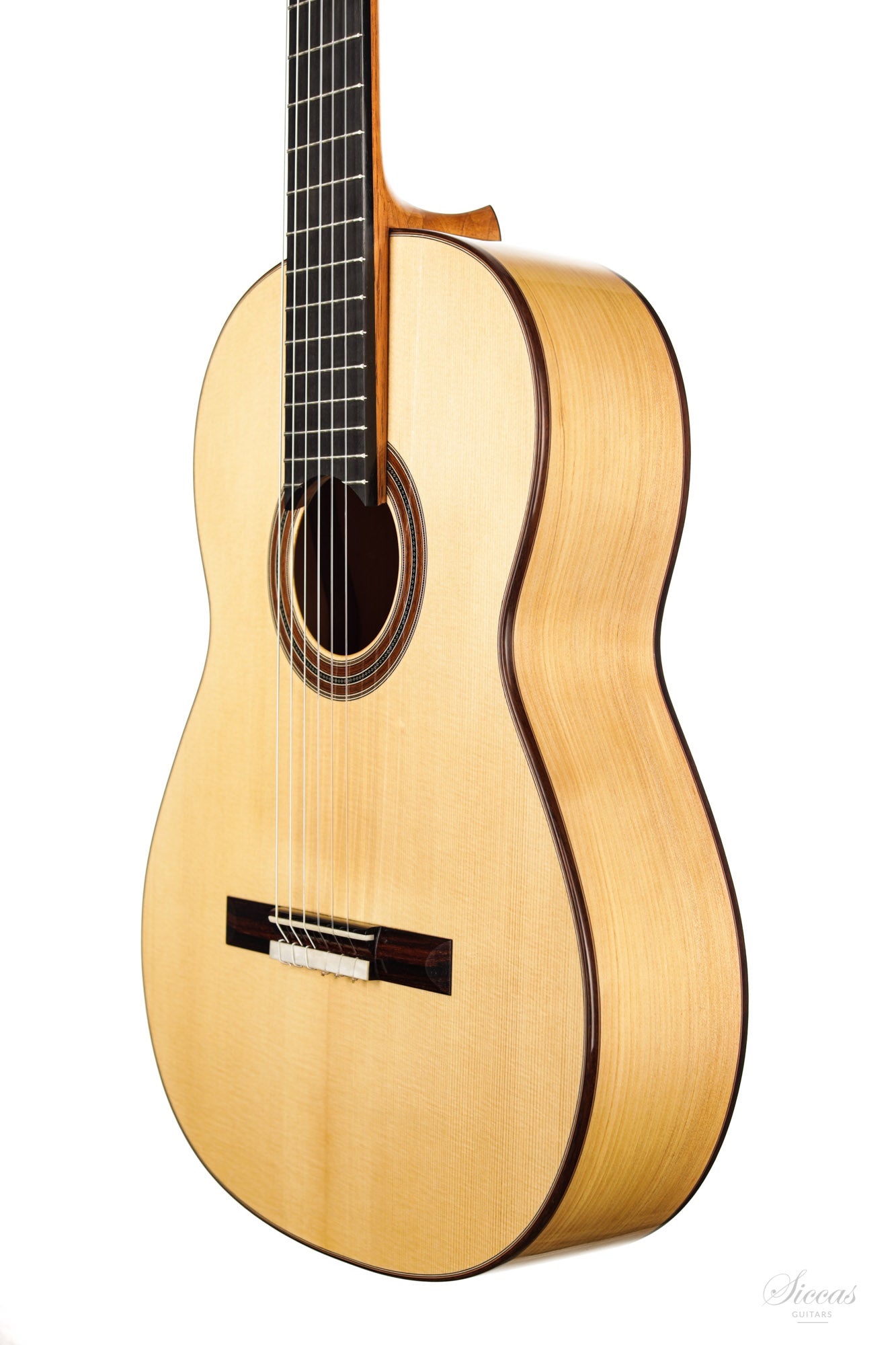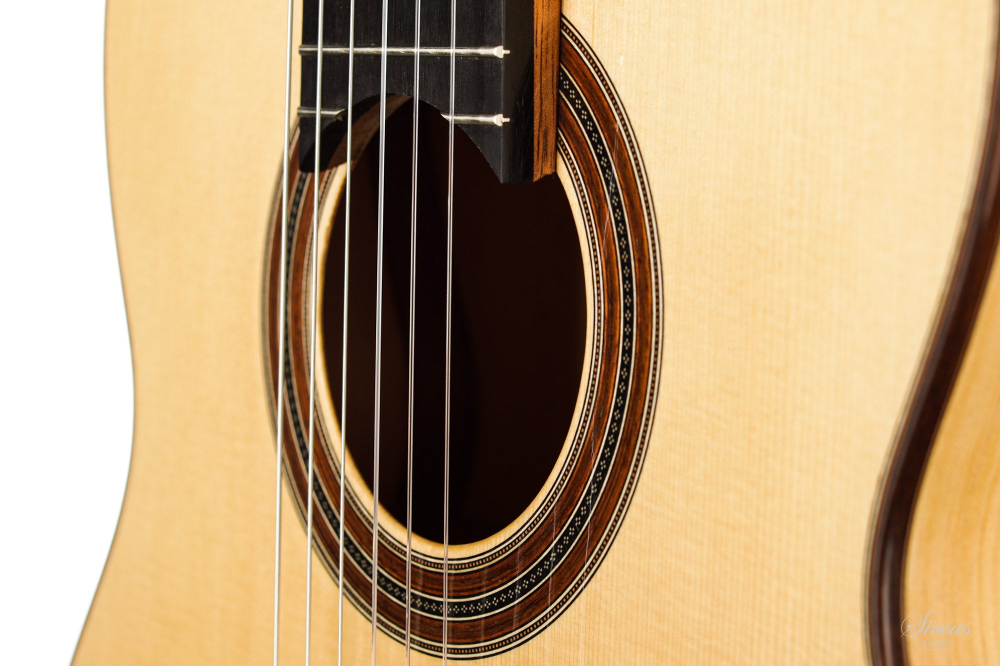 This instrument is a joy to play and of course to smell, due to the aromatic aroma from the cypress. It is quite uncommon with classical concert guitars build with cypress, but bear no mistake, this guitar is very potent with an inspiring quick responsiveness and a full bodied sound. The basses are crisp and snappy with a dazzling rich texture, paired with sweet trebles that have an airy quality to them, makes the guitar a real joy to play. When inspecting the nooks and crannies of the guitar, it is put together with an experts eyes and hands. A clean and charming design is what meets the eye. Easy to play with a great access to the upper registers. We are sure that this instrument will suit anyone who looks for a great sounding guitar within a very reasonable price range.