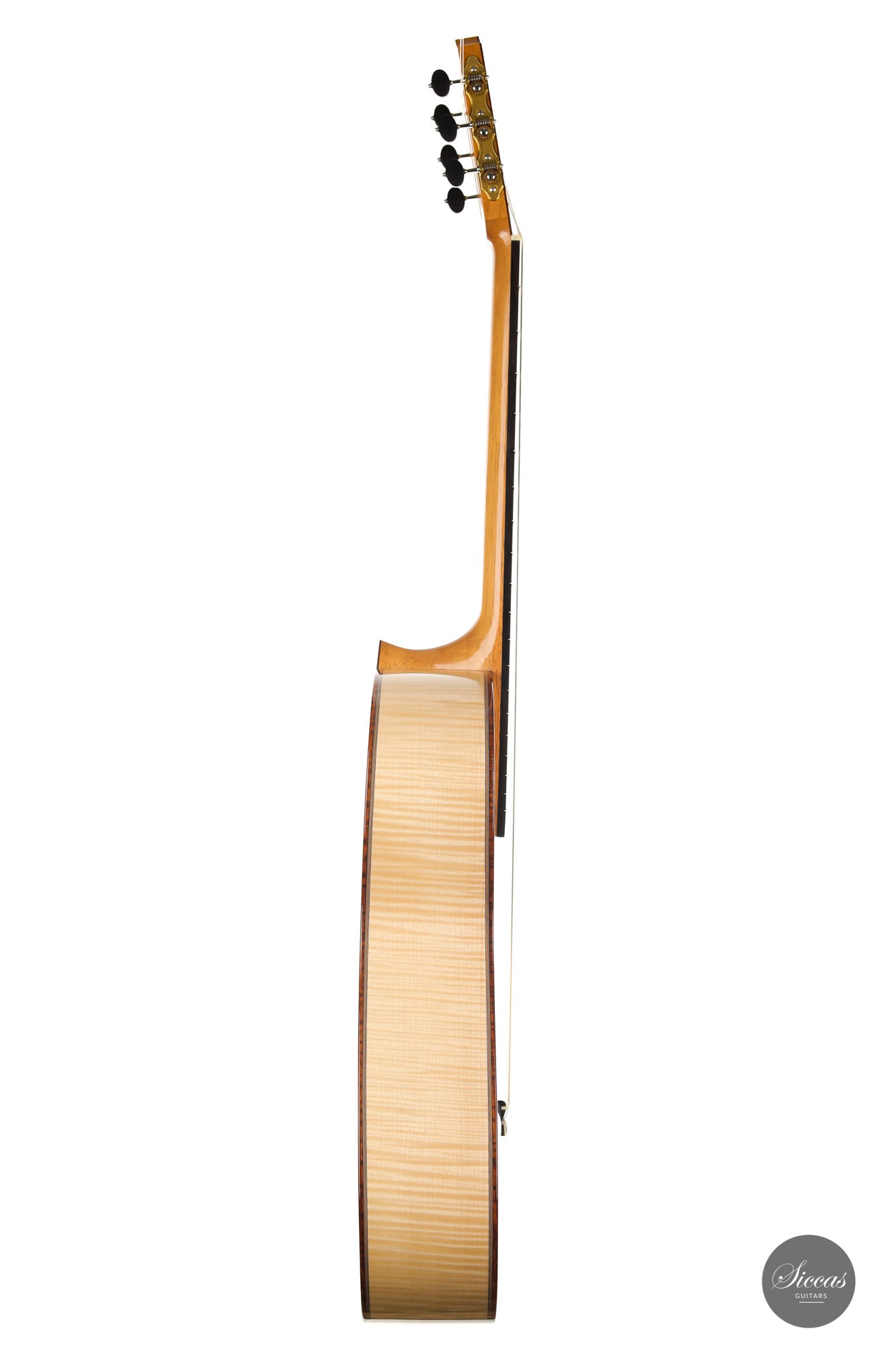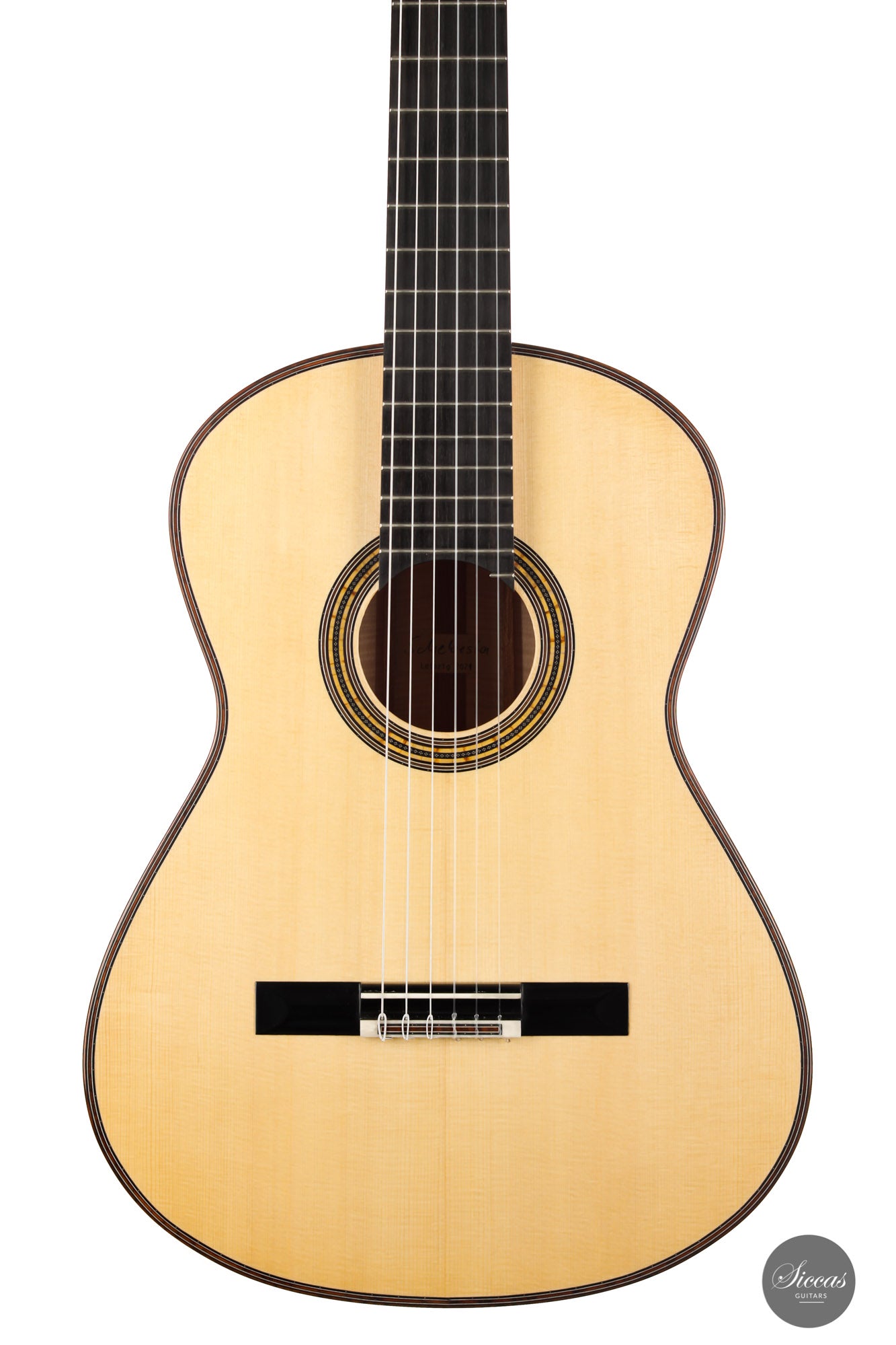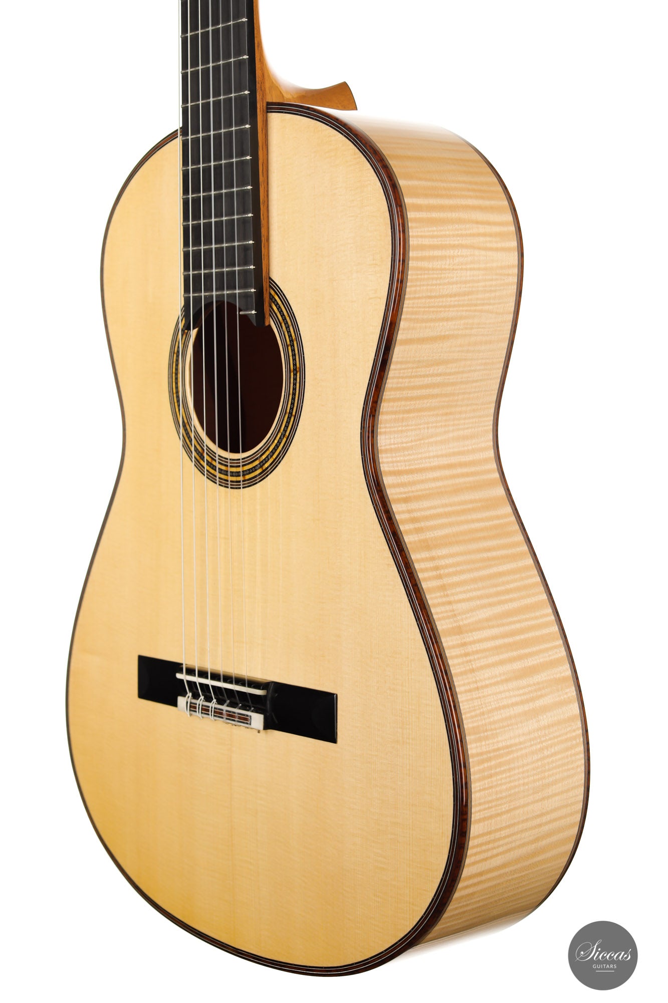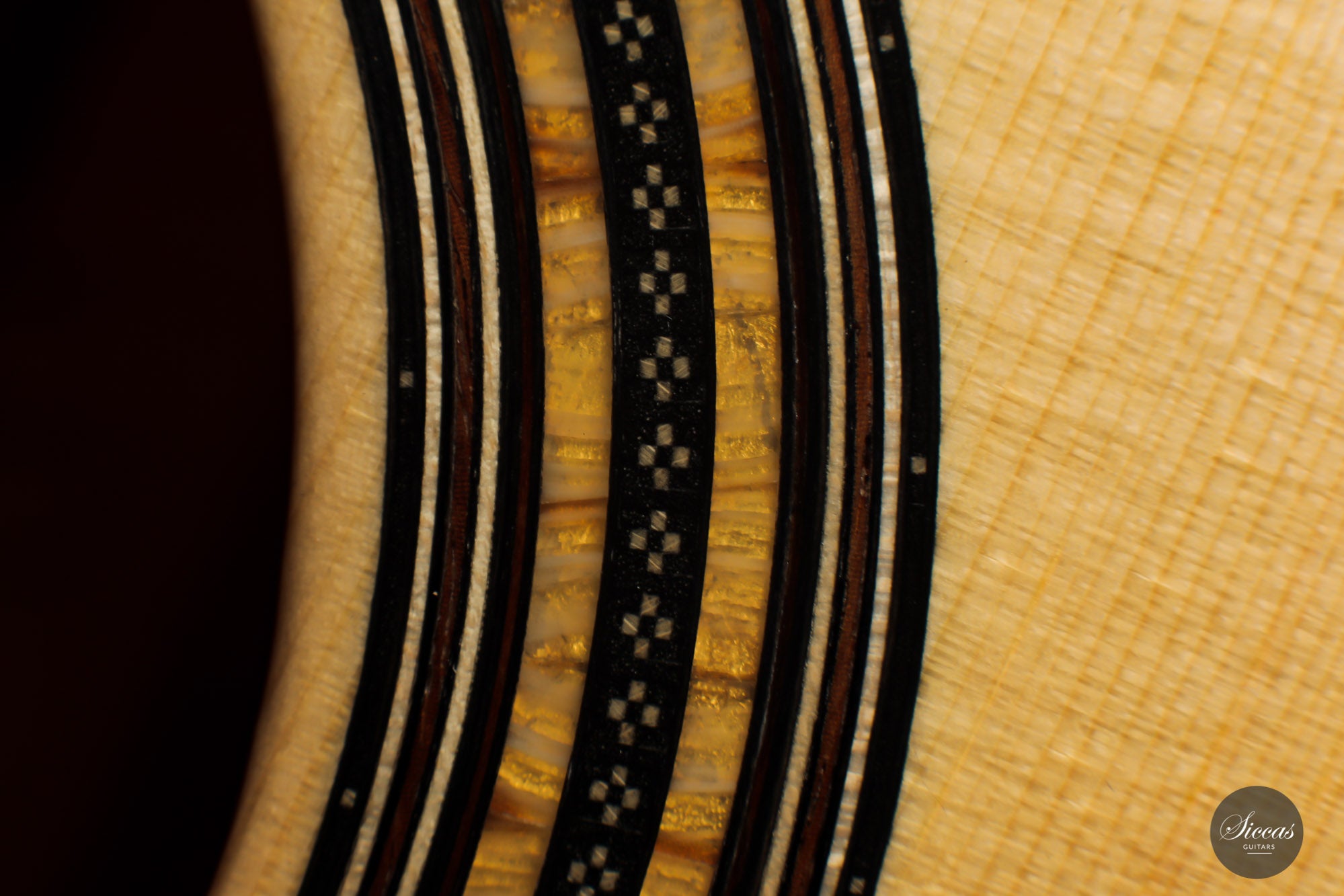This superb guitar has an exciting story. As Nils brought us his last guitar and visited our shop, a beautiful 2010 Fritz Ober guitar caught his attention. It had a beautiful three-piece back with flamed maple and a snakewood middle part. With this picture in mind, Nils built the instrument we present today, using the same wood combination. The result is phenomenal, and what an eyecatcher! Nils remained faithful to his concept, and this traditional guitar features an elevated fingerboard. One fascinating detail is the rosette displaying by transparency the sublime colour of a 24-carat gold leaf. This precious material shines through an extremely thin layer of bone and gives this guitar a unique personality.