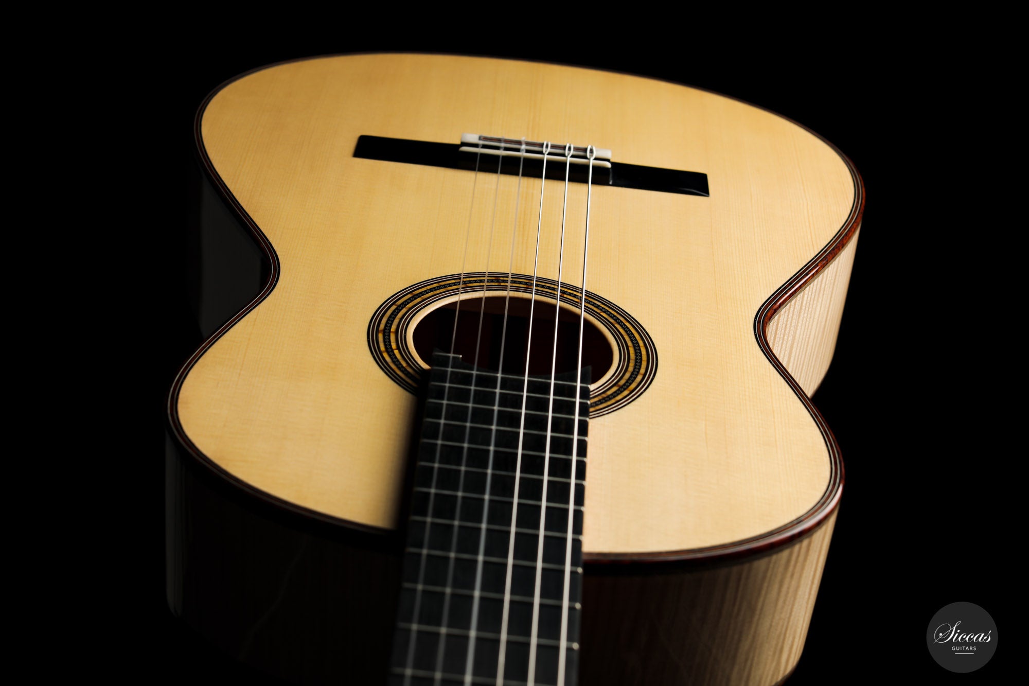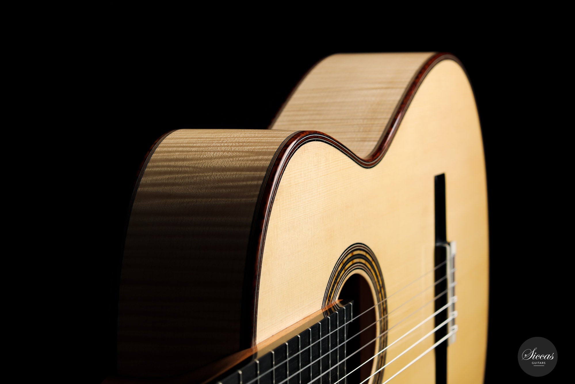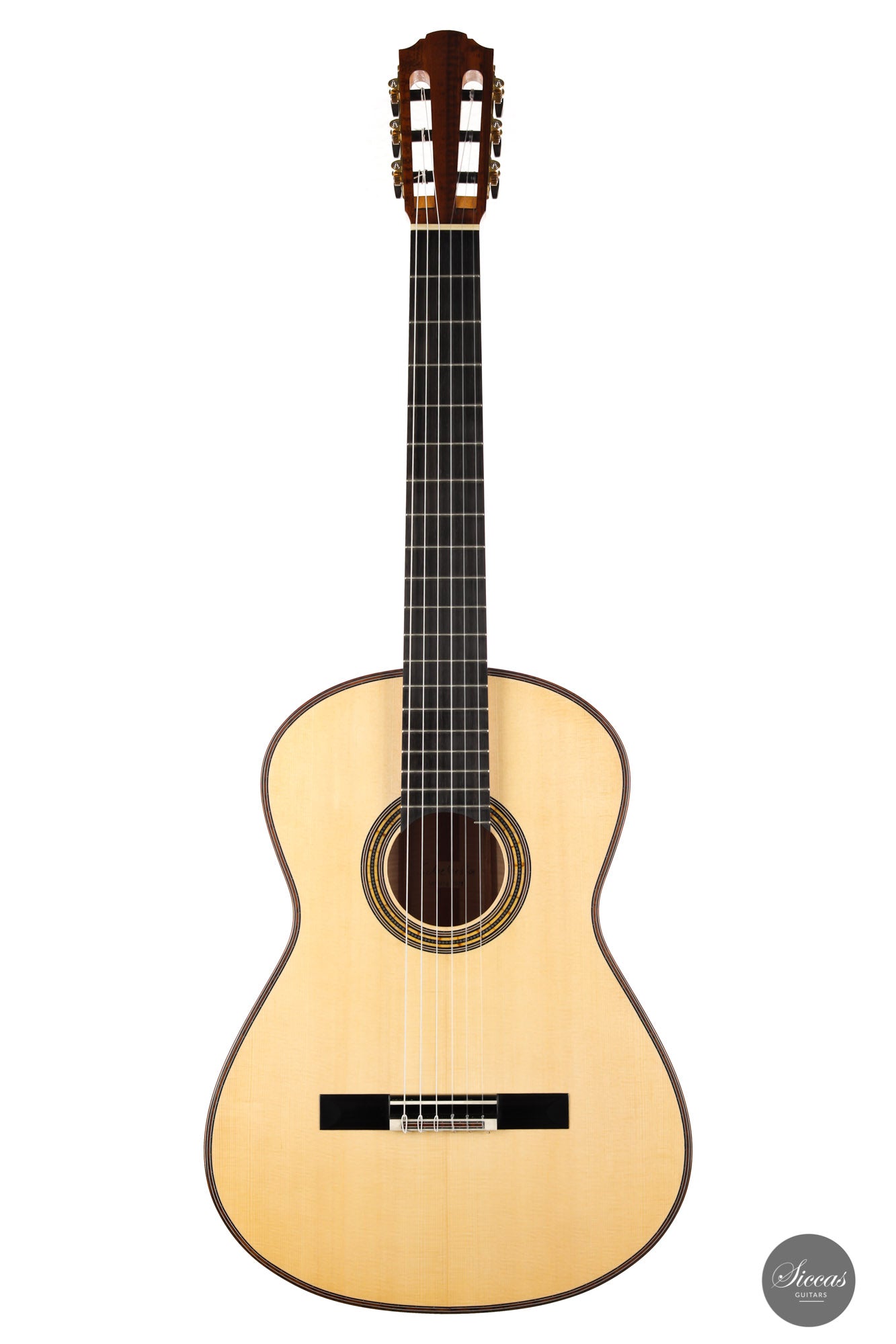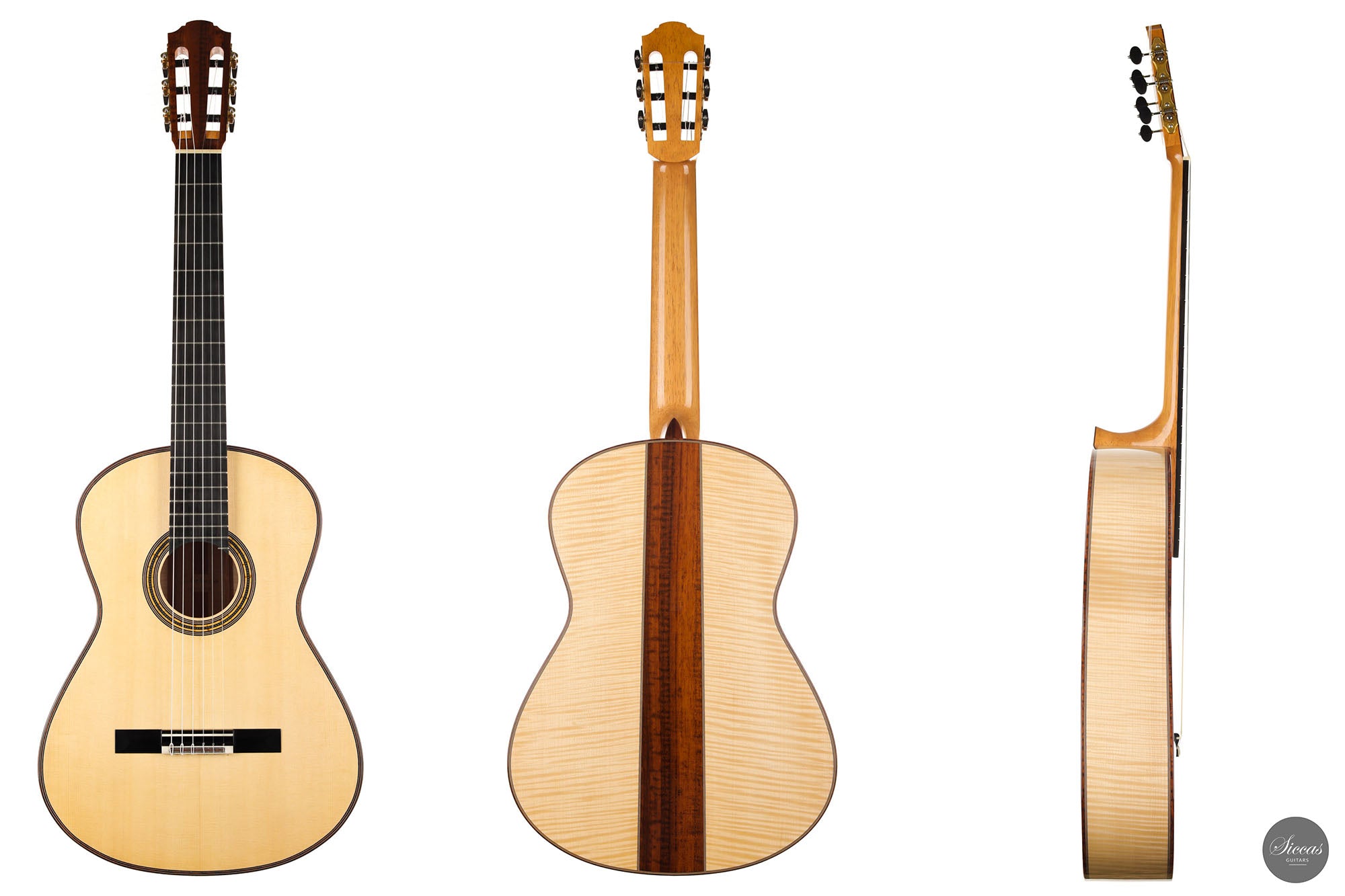 This superb guitar has an exciting story. As Nils brought us his last guitar and visited our shop, a beautiful 2010 Fritz Ober guitar caught his attention. It had a beautiful three-piece back with flamed maple and a snakewood middle part. With this picture in mind, Nils built the instrument we present today, using the same wood combination. The result is phenomenal, and what an eyecatcher! Nils remained faithful to his concept, and this traditional guitar features an elevated fingerboard. One fascinating detail is the rosette displaying by transparency the sublime colour of a 24-carat gold leaf. This precious material shines through an extremely thin layer of bone and gives this guitar a unique personality.