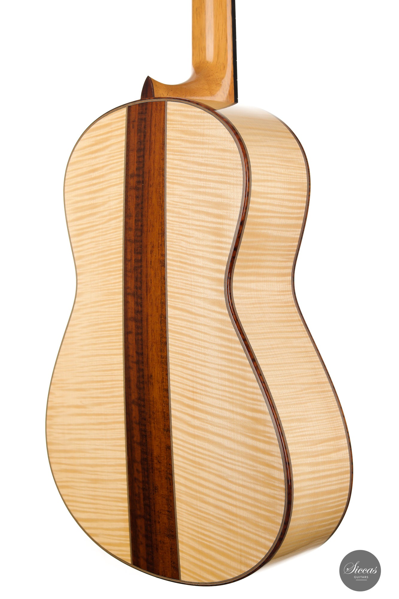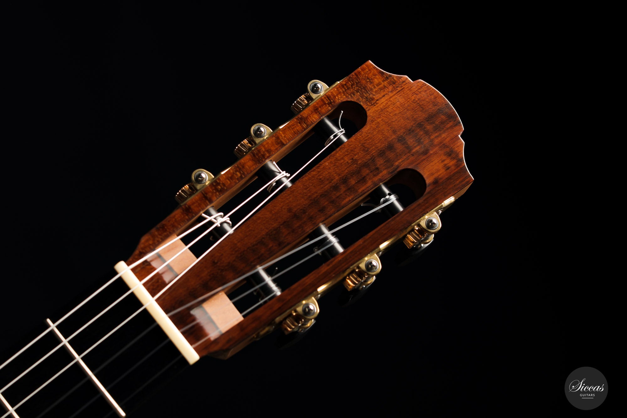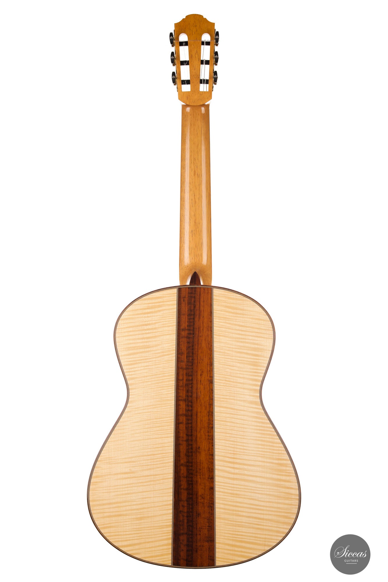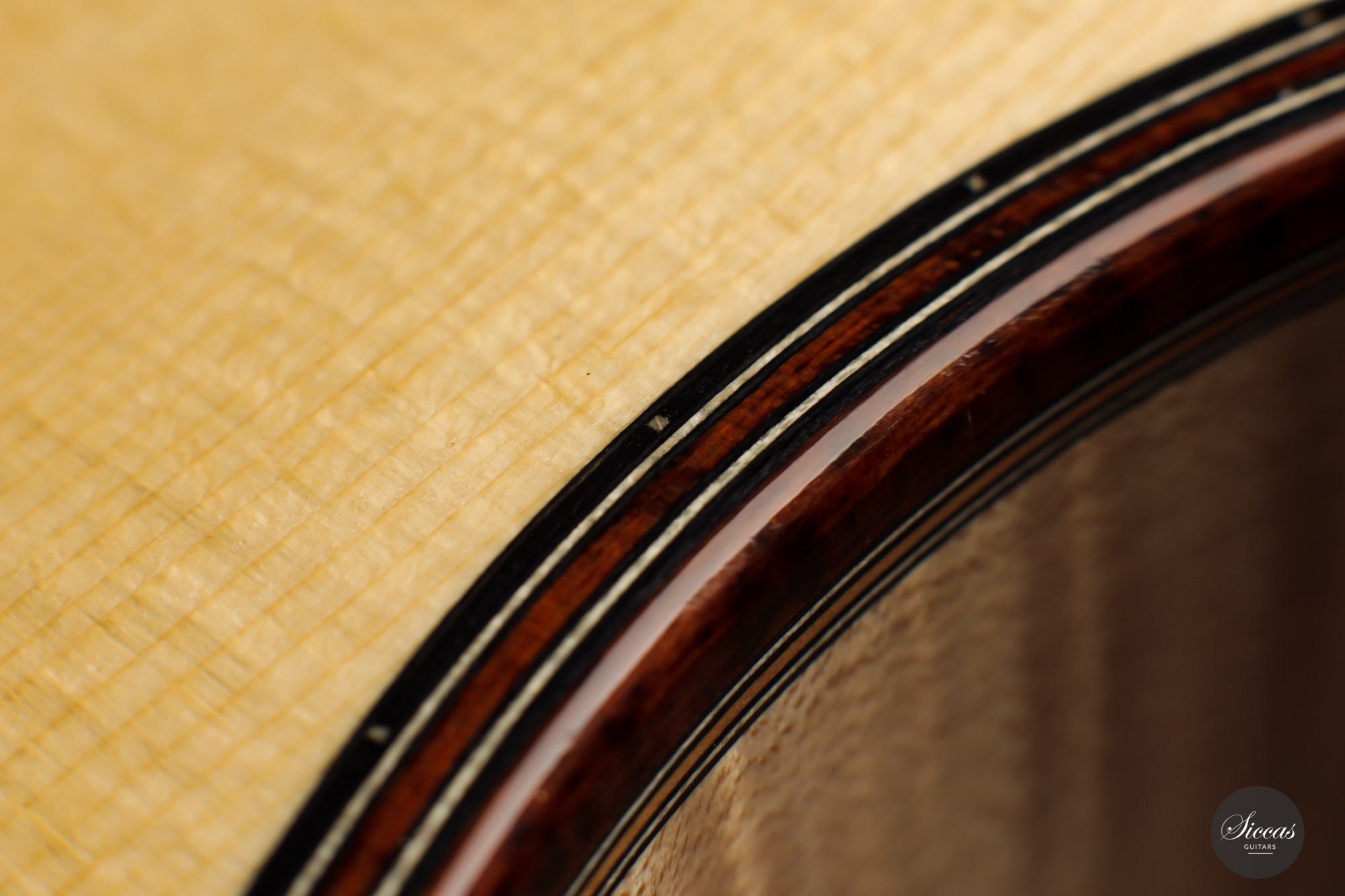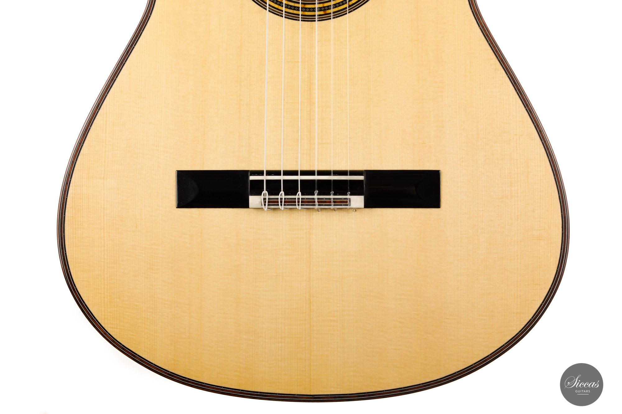 This superb guitar has an exciting story. As Nils brought us his last guitar and visited our shop, a beautiful 2010 Fritz Ober guitar caught his attention. It had a beautiful three-piece back with flamed maple and a snakewood middle part. With this picture in mind, Nils built the instrument we present today, using the same wood combination. The result is phenomenal, and what an eyecatcher! Nils remained faithful to his concept, and this traditional guitar features an elevated fingerboard. One fascinating detail is the rosette displaying by transparency the sublime colour of a 24-carat gold leaf. This precious material shines through an extremely thin layer of bone and gives this guitar a unique personality.