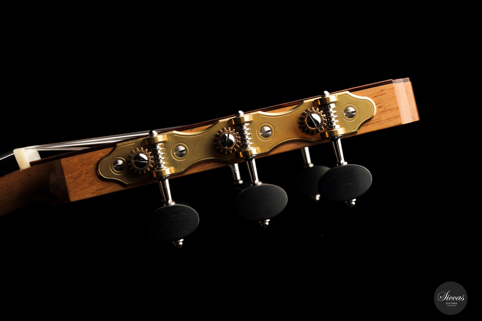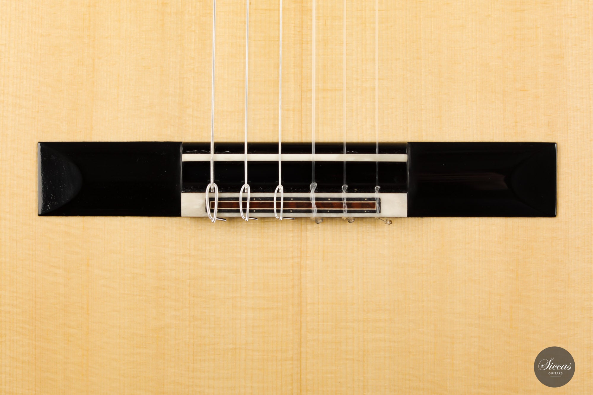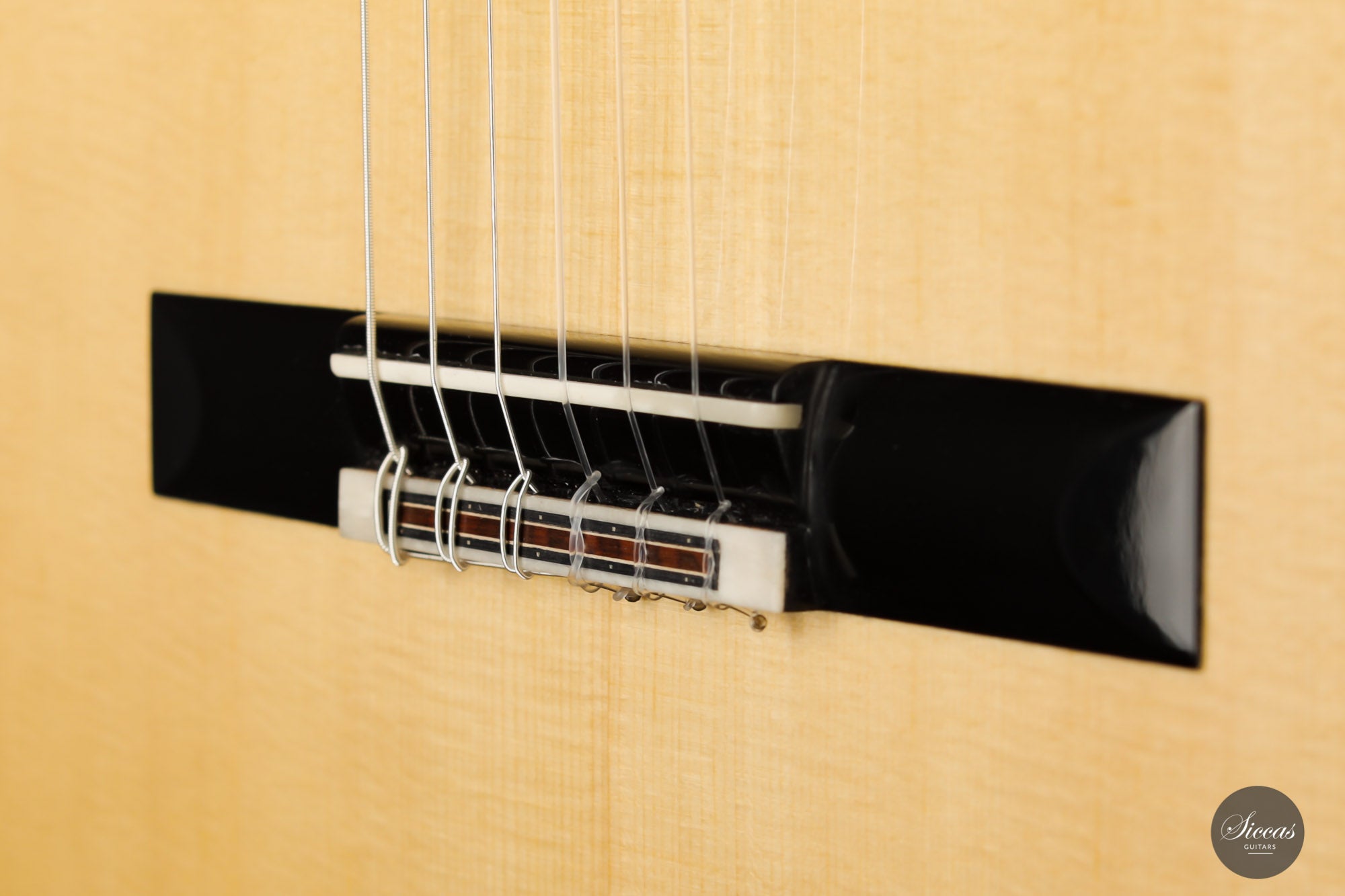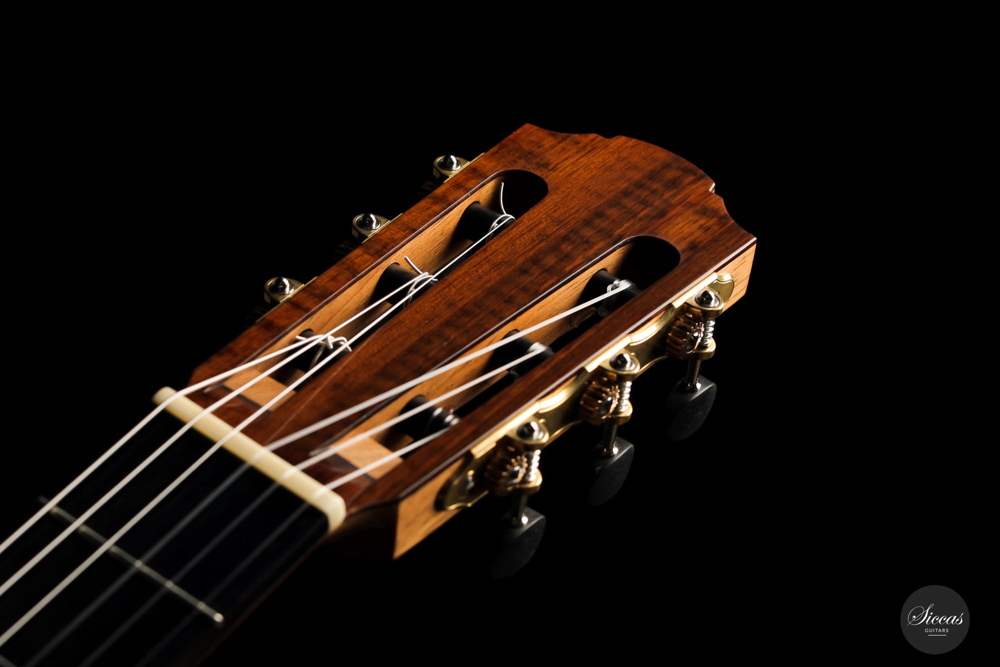 This superb guitar has an exciting story. As Nils brought us his last guitar and visited our shop, a beautiful 2010 Fritz Ober guitar caught his attention. It had a beautiful three-piece back with flamed maple and a snakewood middle part. With this picture in mind, Nils built the instrument we present today, using the same wood combination. The result is phenomenal, and what an eyecatcher! Nils remained faithful to his concept, and this traditional guitar features an elevated fingerboard. One fascinating detail is the rosette displaying by transparency the sublime colour of a 24-carat gold leaf. This precious material shines through an extremely thin layer of bone and gives this guitar a unique personality.