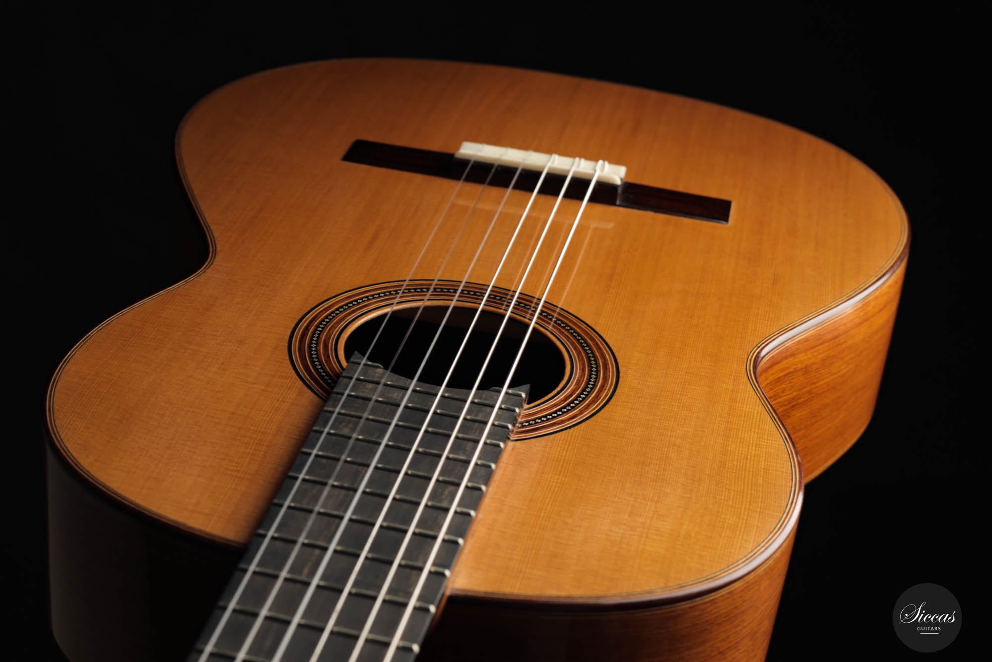 Die Nils Schebesta-Gitarre Nr. 28 verkörpert einen avantgardistischen Ansatz für das Design von Konzertinstrumenten, die für den zeitgenössischen Interpreten gebaut werden, der sich eine einzigartige und unvergessliche musikalische Reise wünscht. Als Ausdruck von Innovation und kompromissloser Qualität stellt diese Gitarre eine Verbindung von traditionellen Materialien und erfinderischer Konstruktion dar. Die No. 28 besteht aus einer Zederndecke und Boden und Zargen aus Honduras-Palisander und kombiniert diese Tonhölzer mit großer Wirkung. Die Zederndecke sorgt für einen weichen, süßen Ton, während das Honduras-Palisanderholz den Klang mit einer reichen, vollmundigen Resonanz bereichert. Diese Tonholzkombination ermöglicht ein harmonisch ausgewogenes und ausdrucksstarkes Klangprofil. Jeder Aspekt dieses Instruments, von der aufwändig gearbeiteten Randeinlage und Rosette bis zum sorgfältig geformten Hals, ist ein Zeugnis der meisterhaften Handwerkskunst von Schebesta. Jedes Designmerkmal wurde akribisch umgesetzt und ergänzt die klangliche Brillanz der Gitarre um eine Schicht visueller Raffinesse. Die klangliche Leistung der No. 28 ist schlichtweg außergewöhnlich. Sie produziert resonante, knackige Basstöne, die einen markanten Kontrapunkt zu den süßen, ätherischen Höhenfrequenzen bilden. Jede Note erklingt mit Klarheit und Wärme und trägt zu einem Hörerlebnis bei, das sowohl erfreulich als auch inspirierend ist. Die Spielbarkeit wird durch die durchdachte Formgebung des Halses verbessert, die auf Komfort und leichte Beweglichkeit ausgelegt ist. Diese Eigenschaft ermöglicht sanftere Übergänge und eine präzisere Artikulation, die den hohen Ansprüchen anspruchsvoller Musiker gerecht wird. Die Decke der Gitarre wird von fünf präzise abgestimmten Fächerstreben getragen, die die Schwingungen der Decke kontrollieren und den Ton und die Ansprache des Instruments beeinflussen. Dieses Strukturelement trägt zur Ausgewogenheit und Spielbarkeit des Instruments bei und bringt die strukturelle Stabilität mit der Tonerzeugung in Einklang. Zusammenfassend lässt sich sagen, dass die Gitarre Nr. 28 von Nils Schebesta mehr als ein Musikinstrument ist; sie ist ein Zeugnis von Schebestas innovativer Vision und Handwerkskunst, die Tradition und Innovation auf spannende und einzigartige Weise miteinander verbindet. Mit ihrer überragenden Spielbarkeit, ihrem wunderbar ausgewogenen Klang und ihrer unvergleichlichen Handwerkskunst bietet die No. 28 ein unvergleichliches Musikerlebnis und verdient zu Recht ihren Platz als modernes Meisterwerk der Gitarrenbaukunst.