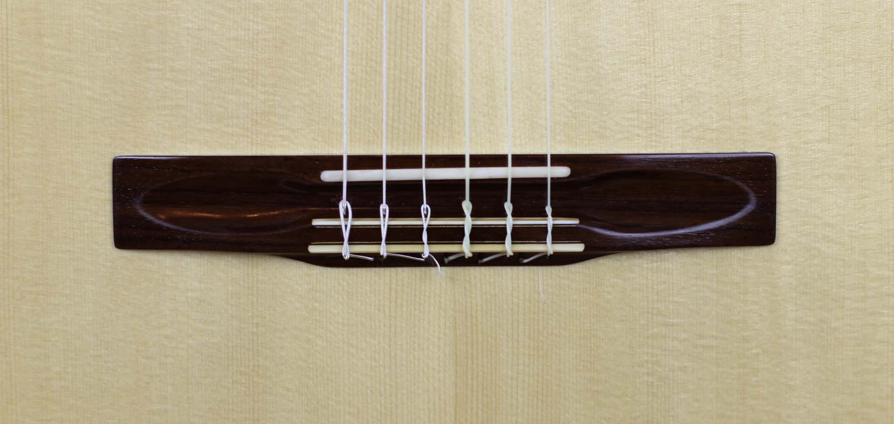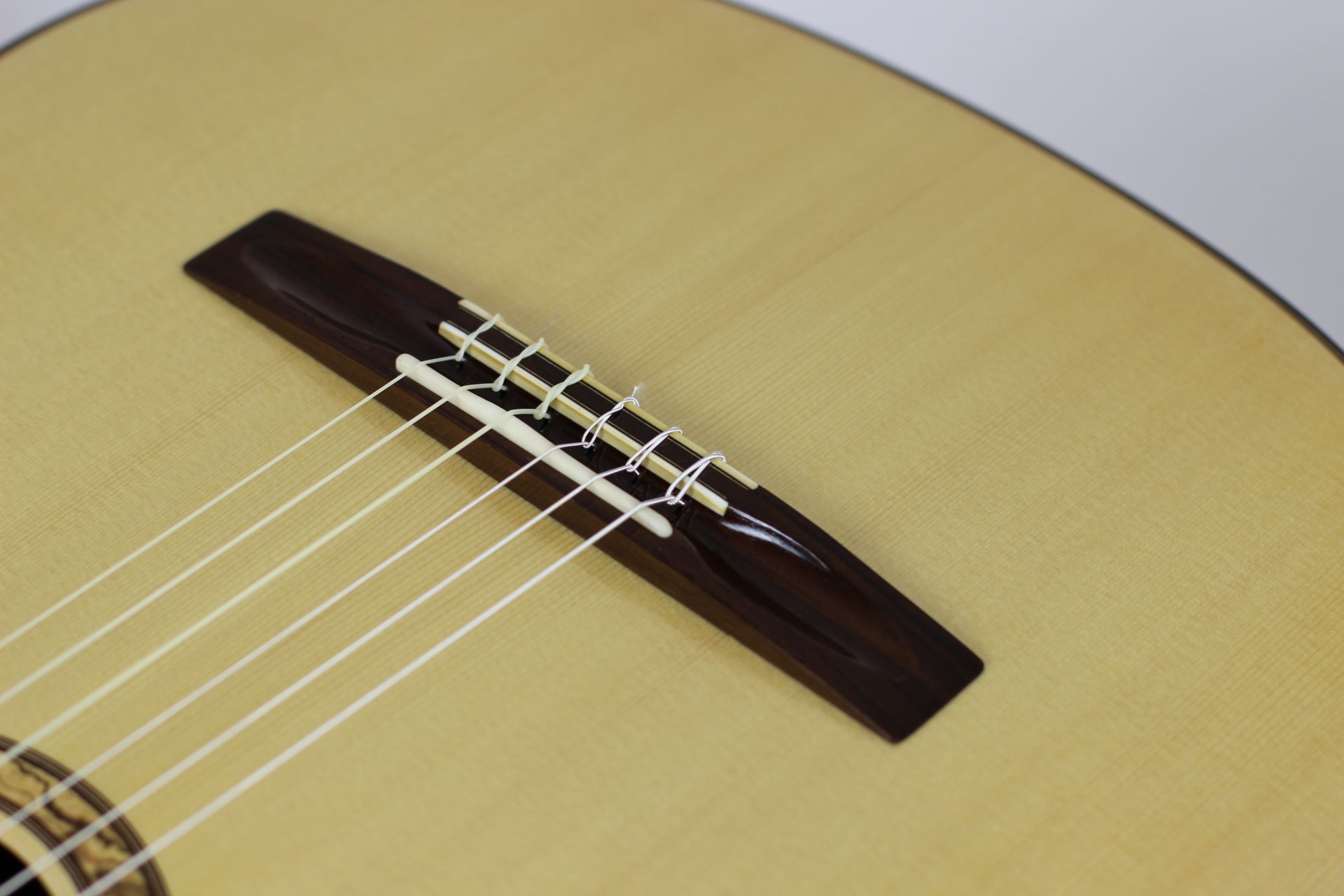 In 2011, Noemi moved to Canada and received instruction by the luthier Sergei De Jonge at his workshop. At the end of 2011 she returned to Italy exhibiting at national and international fairs and building guitars in her own workshop. This guitar has a spruce doublet-top with back and sides made of Indian rosewood. The back is reinforced with crossed wooden bars to give more projection to the guitar. A powerful guitar with not to deep basses like often cedar double top guitars have. The guitar has a hand polished French polish finish.