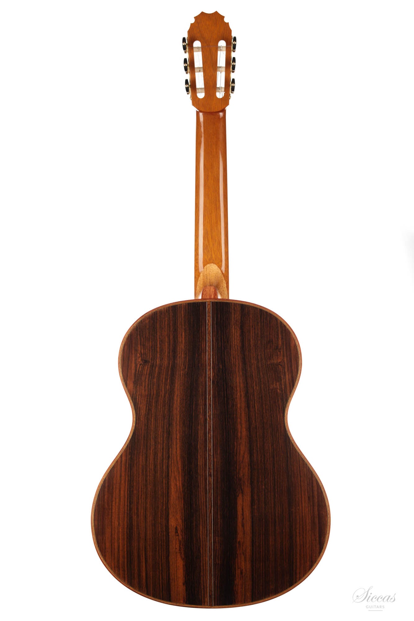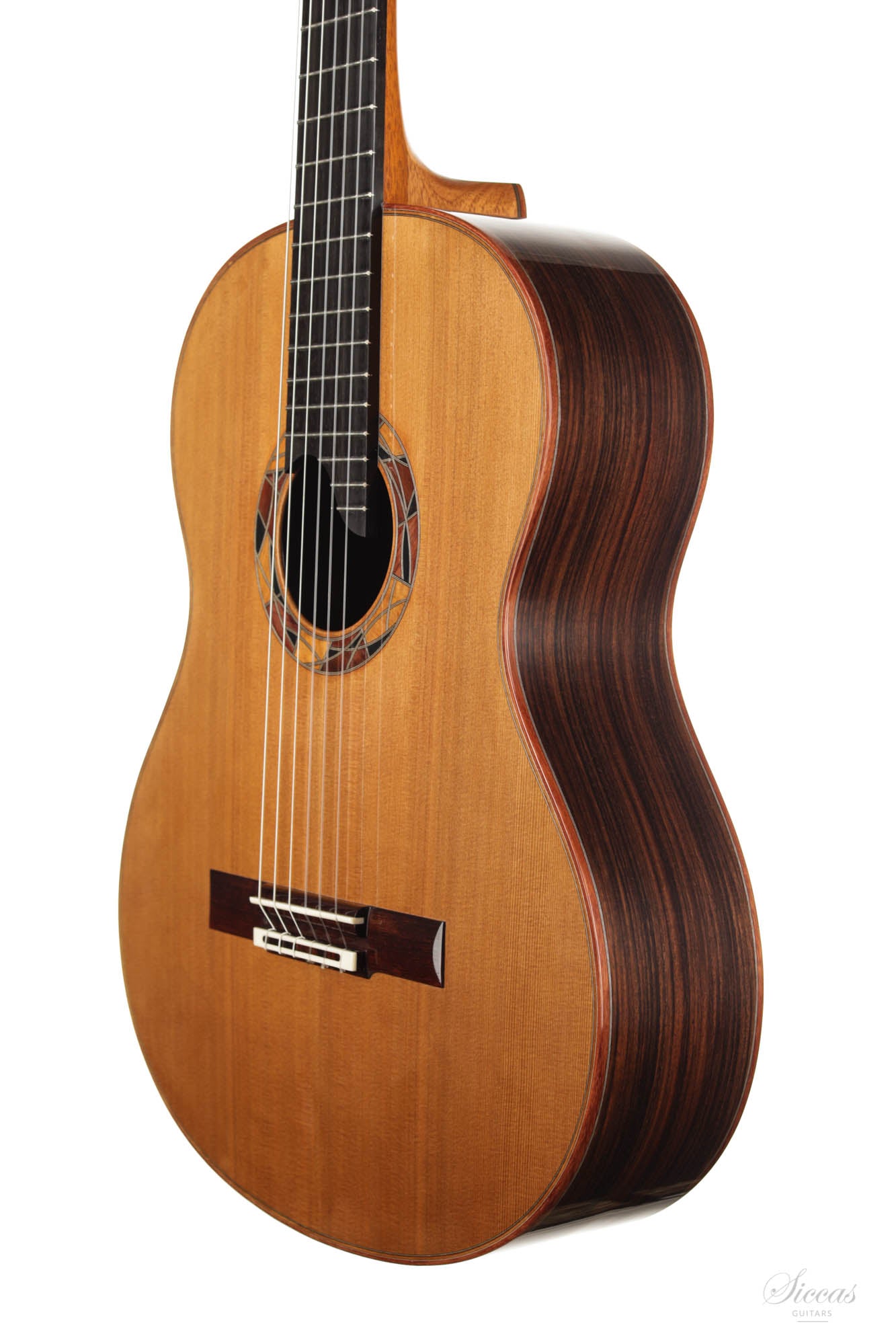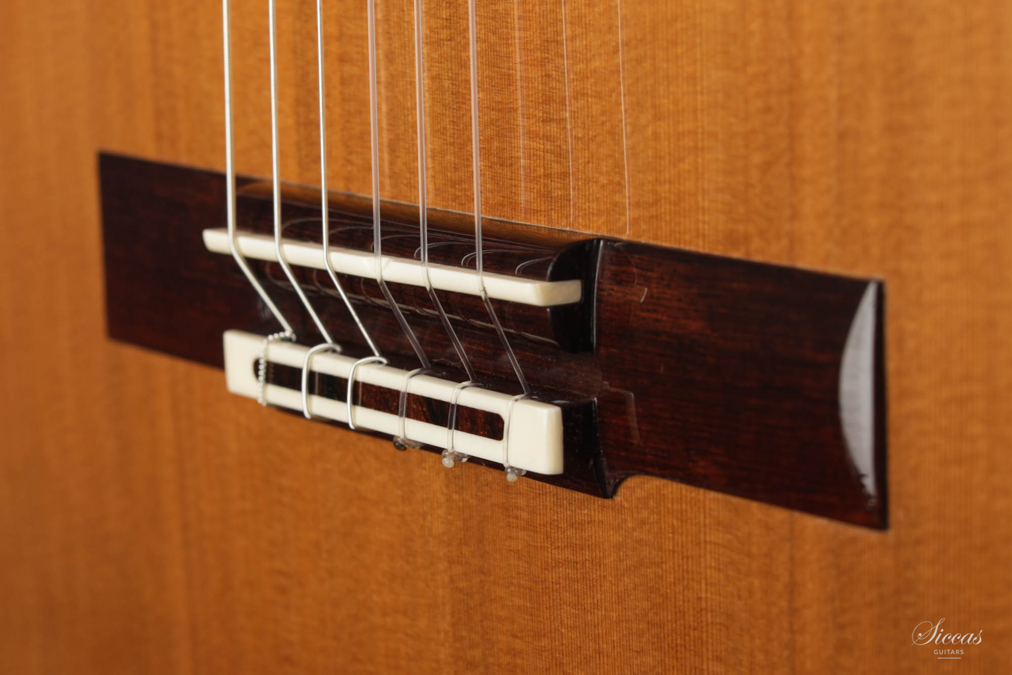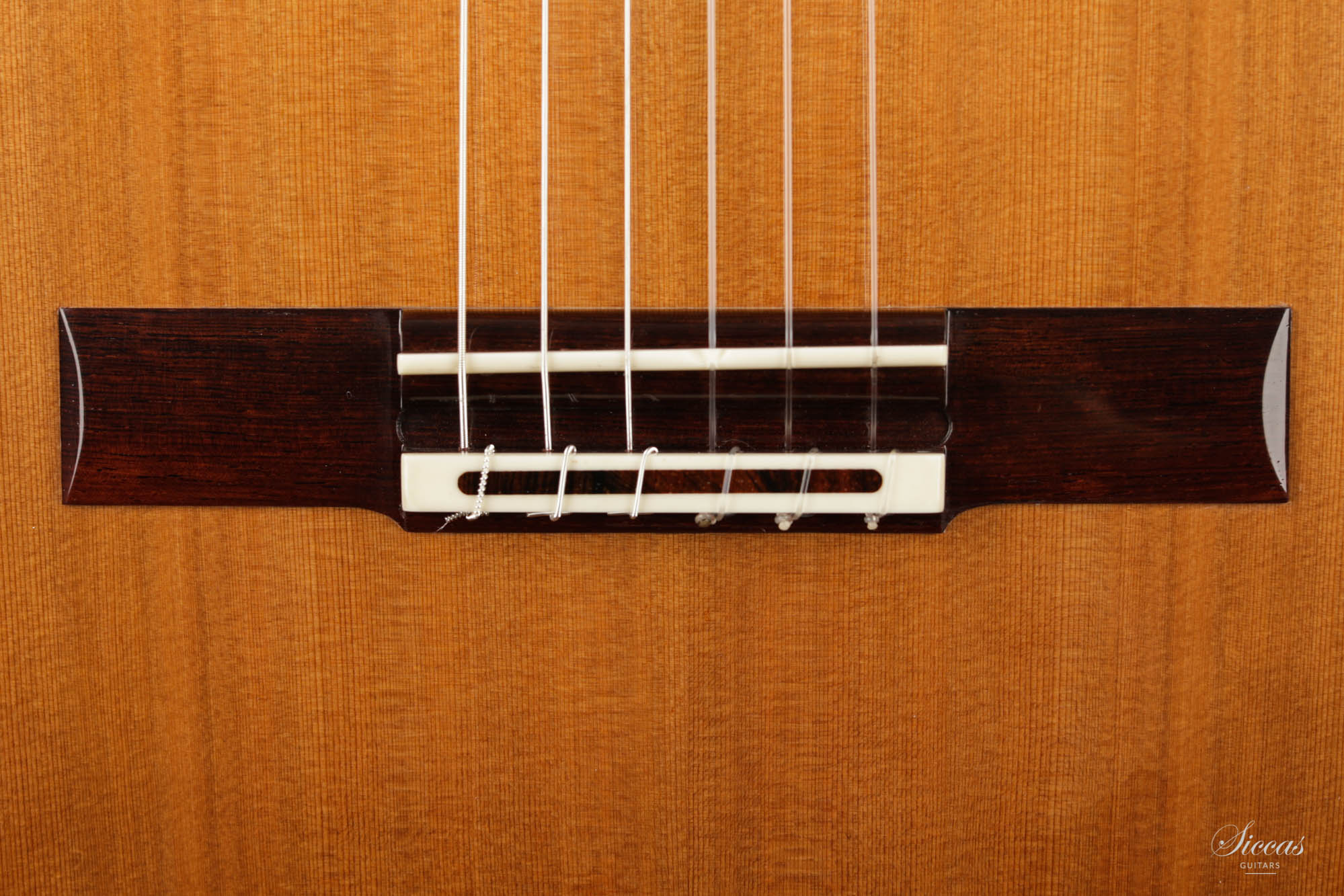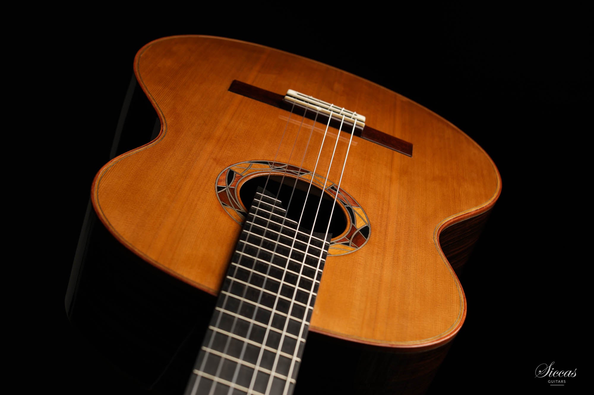 Diese Gitarre ist eine Schönheit mit einem einzigartigen Design. Die eingelegte Rosette wurde von Olivier Planchon zum Zeitpunkt des Baus vollständig improvisiert und ist daher bei jeder Gitarre unterschiedlich. Dies ist Oliviers großes Konzertmodell mit einer einzigartigen traditionellen Verstrebung, die tief in der französischen Tradition verwurzelt ist. Dieses Zederndeckenmodell hat einen vollen und runden Klang mit großem Charakter und beeindruckendem Sustain. Die Bespielbarkeit ist ausgezeichnet, und sie besitzt alle Eigenschaften, die eine große Konzertgitarre ausmachen.