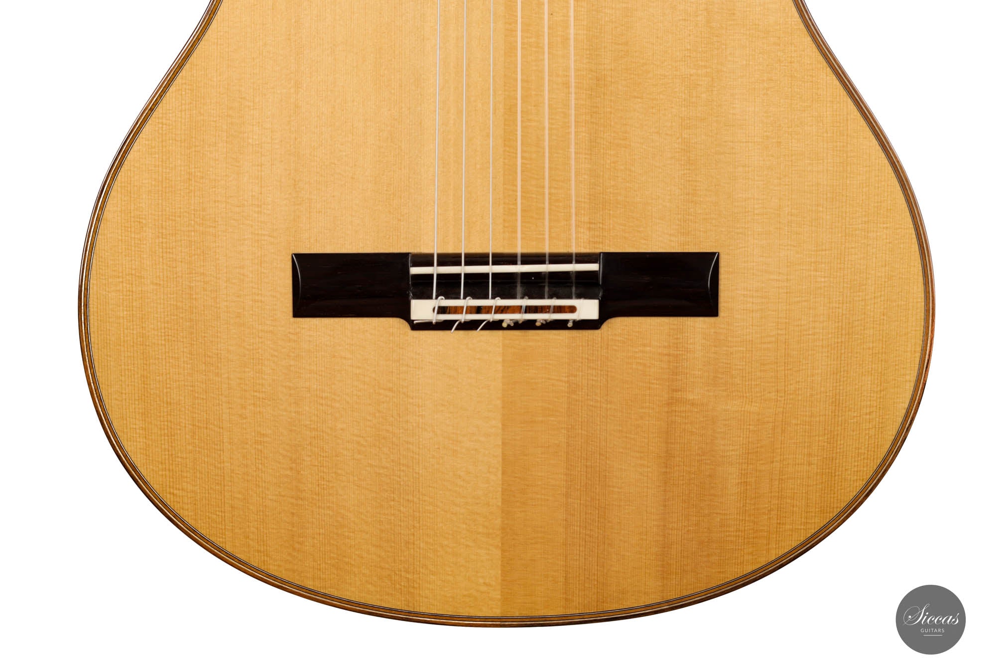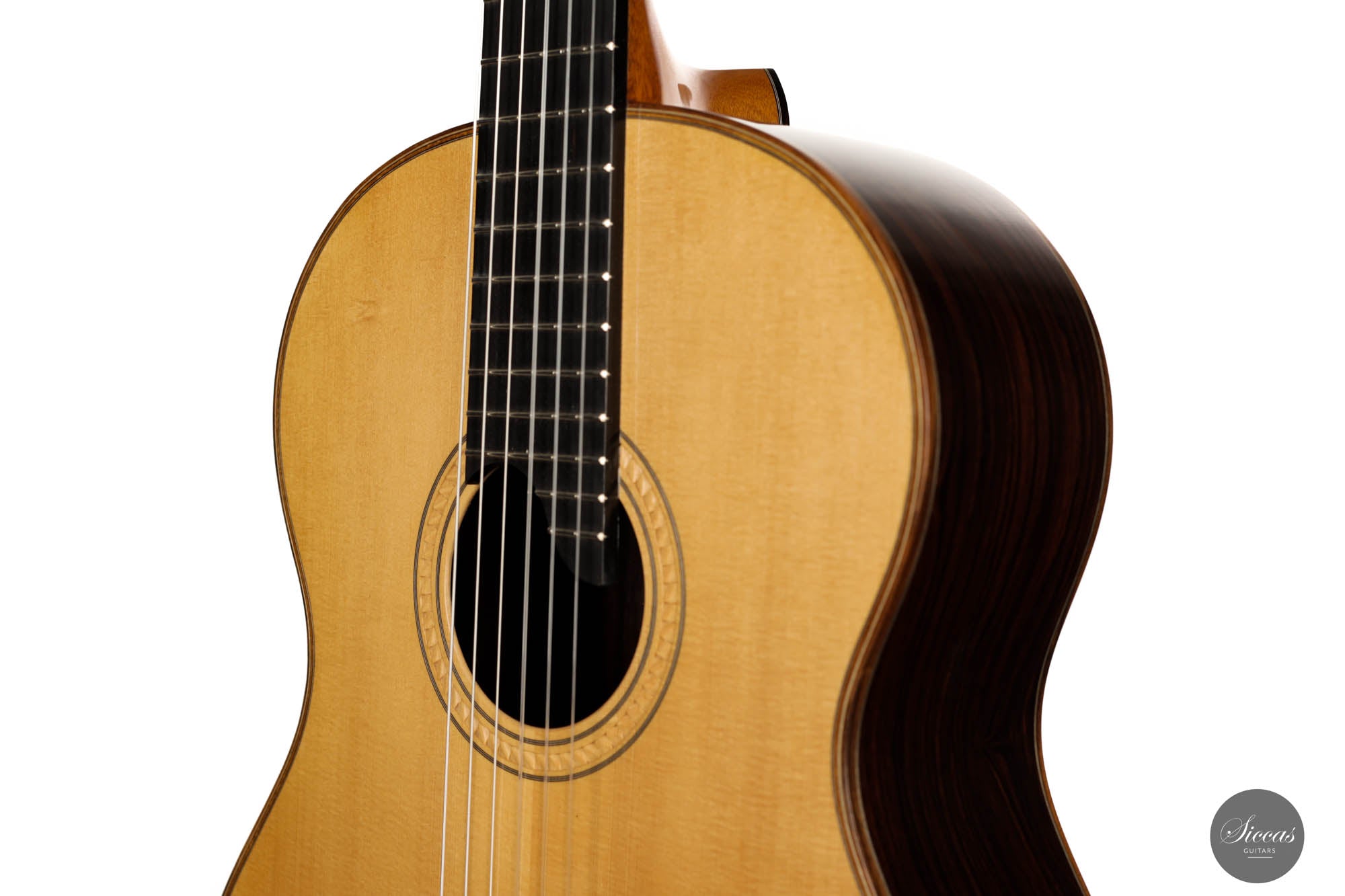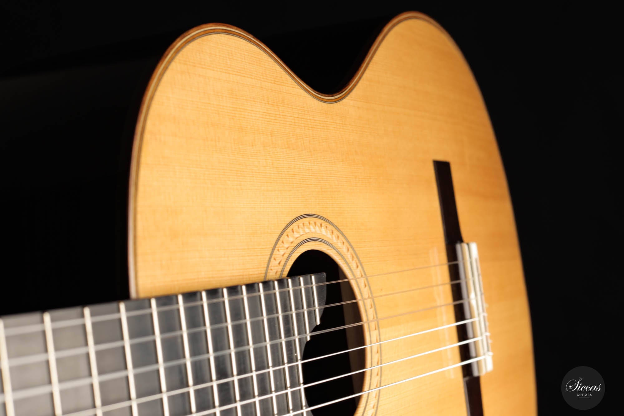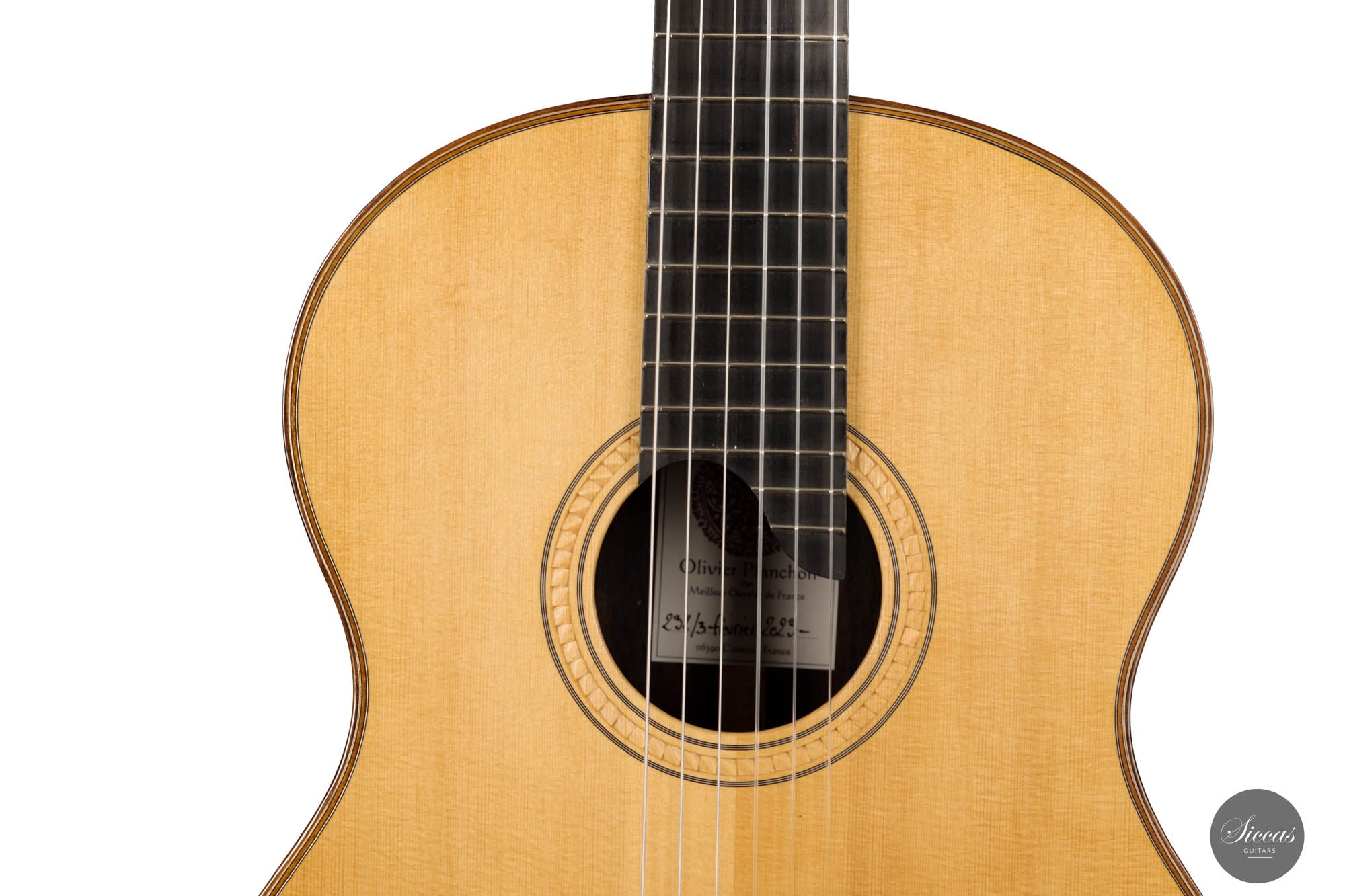Olivier Planchon wurde 1961 geboren und entdeckte mit 13 Jahren die klassische Gitarre und den Flamenco. Nach seinem Studium an der École Supérieure d’Art Graphique de Paris arbeitete er als freiberuflicher künstlerischer Leiter im Bereich Kommunikation und Verlagswesen. 1999 widmete er sich fünf Jahre lang dem Entwurf und Bau von Konzertgitarren und begann eine informelle Ausbildung bei seinem Freund Daniel Lesueur, der ihn mit Daniel Freiderich bekannt machte. Von diesen beiden renommierten Gitarrenbauern ermutigt, richtete Olivier in der Nähe von Paris eine Werkstatt ein, in der er seine ersten Konzertgitarren baute. Im Jahr 2007 wurde er mit dem Titel „Meilleur Ouvrier de France“ ausgezeichnet. Seit 2008 arbeitet er im Hinterland von Nizza und hat dort mit seiner Partnerin, der Keramikbildhauerin Karine Benvenuti, eine große Werkstatt eingerichtet. Ein paar Worte zu seinem Hintergrund und seiner Philosophie:„Daniel Lesueur lehrte mich die Liebe zur Arbeit auf der Suche nach Perfektion. Da er selbst bei Daniel Friedrich in der Lehre war, teilte er seine Geheimnisse und die, die er von seinem „Meister“ gelernt hatte. In die Vorstellung und Herstellung einer klassischen Gitarre einzutauchen, hat etwas von einer mystischen Einweihung. Es erfordert höchste Konzentration, um den langen Weg bis zu einem vielleicht „großen“ Instrument zu gehen. Meine Vorstellung von einem großartigen Instrument entspricht in erster Linie meinem Geschmack, mehr noch als vorübergehende Modeerscheinungen. Während meiner gesamten Forschung habe ich versucht, Antworten auf Probleme zu finden, die meine Mentoren nicht erklären konnten. Wie bei allen künstlerischen Arbeiten sind die Fragen unendlich, und darin liegt die Freude an diesem Handwerk – jeder Tag bringt eine neue Entdeckung. Die Demut vor dem atmenden Material und der absoluten Akustik, die mit diesen vielfältigen Hölzern verbunden ist, ist der Kern des Geigenbauerhandwerks. Ich fühle mich ein wenig wie ein Bildhauer des Klangs“.