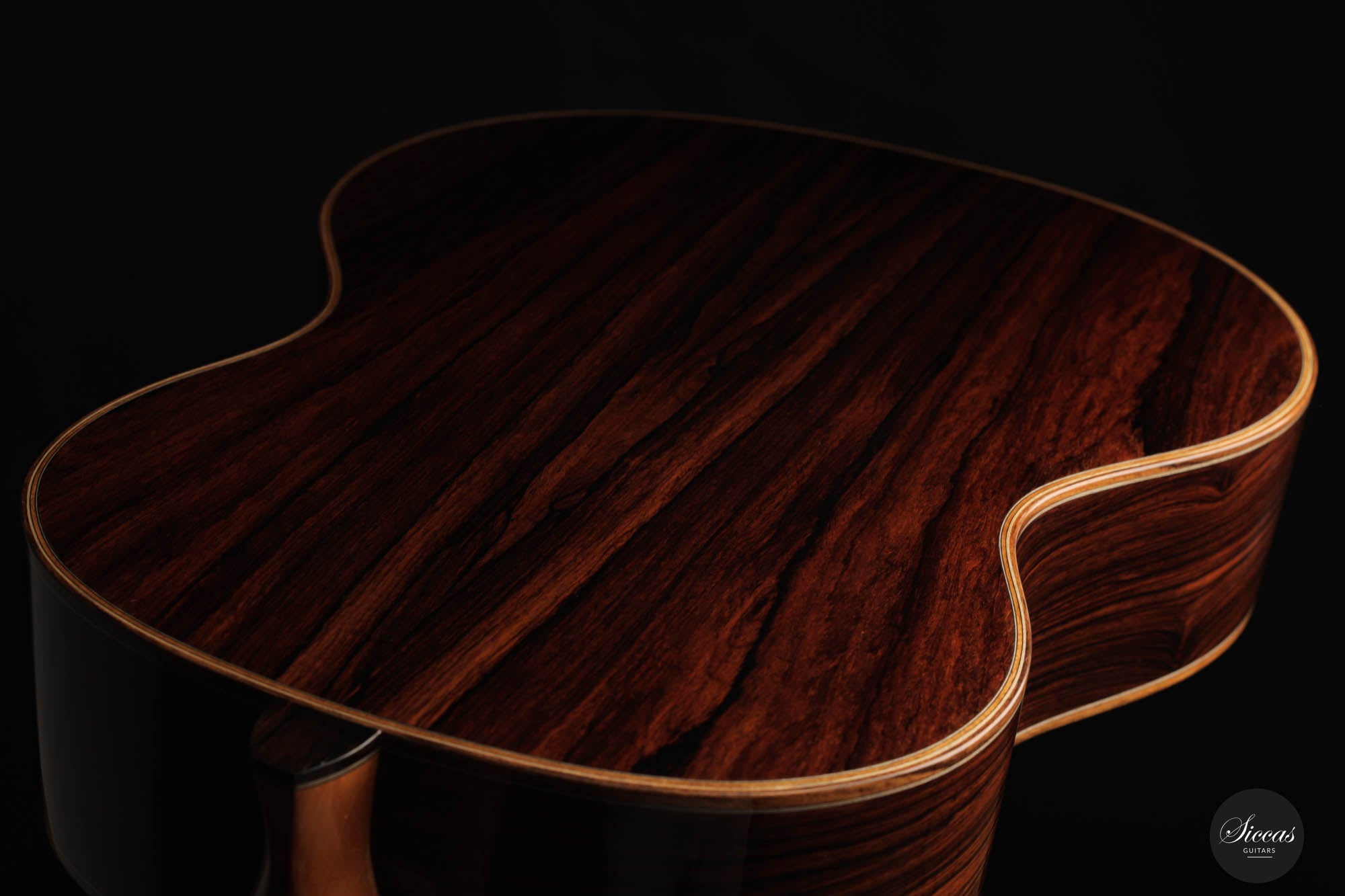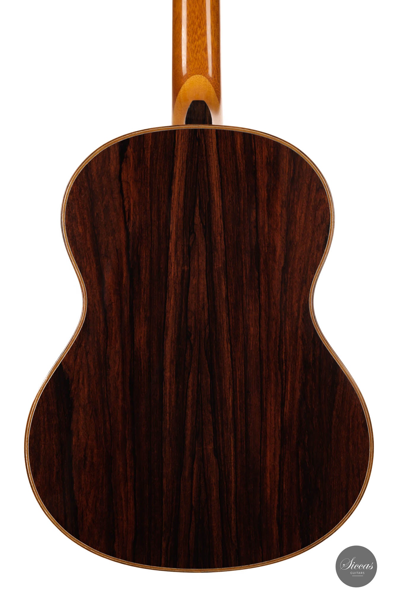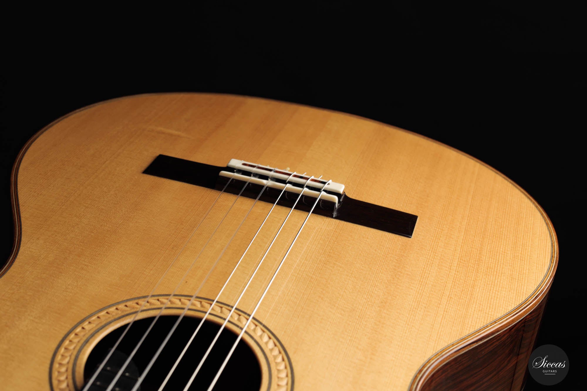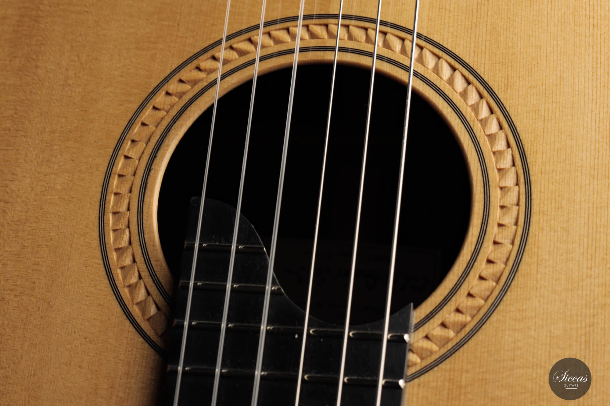 Die Planchon-Gitarre mit der Nummer 226 ist ein Beispiel für die hohe Kunstfertigkeit und die unvergleichliche Handwerkskunst ihres Schöpfers Olivier Planchon. Mit einer Decke aus exquisiter Fichte und einem Boden aus markantem Cocobolo verkörpert dieses Instrument eine verblüffende Mischung aus ästhetischer Raffinesse und akustischer Überlegenheit. Die Rosetten von Planchon, insbesondere die auf dieser Gitarre, zeugen von seiner außergewöhnlichen und unverwechselbaren Handwerkskunst. Ihre Schlichtheit täuscht über den arbeitsintensiven Prozess ihrer Herstellung hinweg. Die Rosette wird in mühevoller Handarbeit geschnitzt, eine zeitaufwändige Arbeit, die Planchons Hingabe für sein Handwerk beweist. Unter den Akustikgitarren ragt diese Gitarre wirklich heraus. Sie zeichnet sich durch ihr starkes Volumen und ihren präzisen, klaren Ton aus. Die Klangessenz kann üppig und dicht sein und macht sie zu einem Instrument, das mit bemerkenswerter Eleganz singt. Diese ausgeprägte Klangqualität ist ein Zeugnis für Planchons akribisches Verständnis und die Anwendung der akustischen Physik und des Designs und zeugt von seiner meisterhaften Beherrschung des Handwerks. Das X-Bracing-System in Kombination mit Fächerverstrebungen ist ein bemerkenswertes strukturelles Merkmal dieser Gitarre. Dieser hybride Ansatz sorgt für einen reichen und vollen Klang, der das Ohr erfreut und gleichzeitig das Instrument unterstützt. Zusammenfassend lässt sich sagen, dass die Planchon-Gitarre Nummer 226 Ästhetik, handwerkliche Finesse und überragende Klangqualität in sich vereint. Jedes Merkmal, von der Wahl der Materialien bis zum einzigartigen Beleistungssystem, macht dieses Instrument zu einer hervorragenden Demonstration von Planchons Engagement für die Herstellung von Gitarren der Spitzenklasse.Regelmäßige Pflege verlängert die Lebensdauer des Instruments