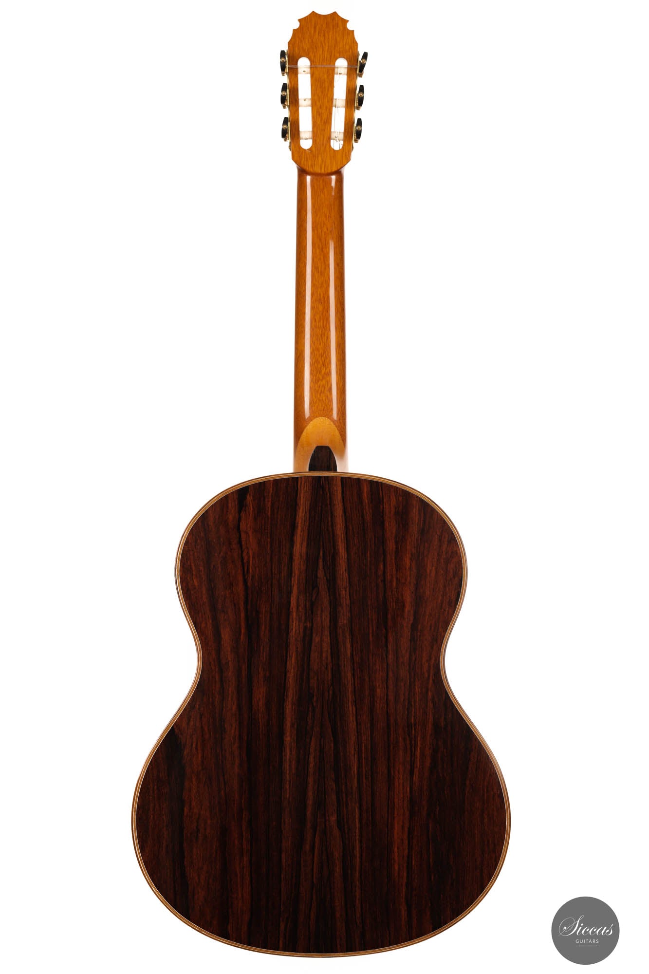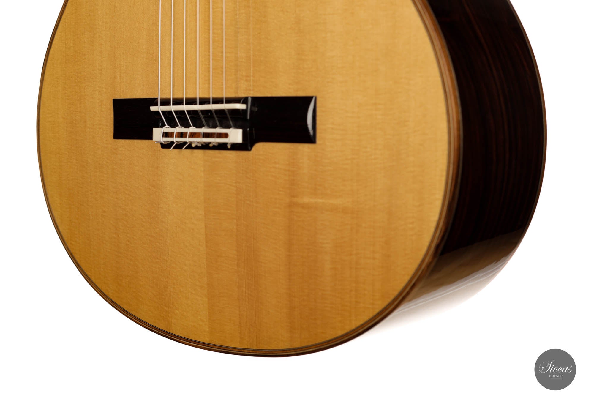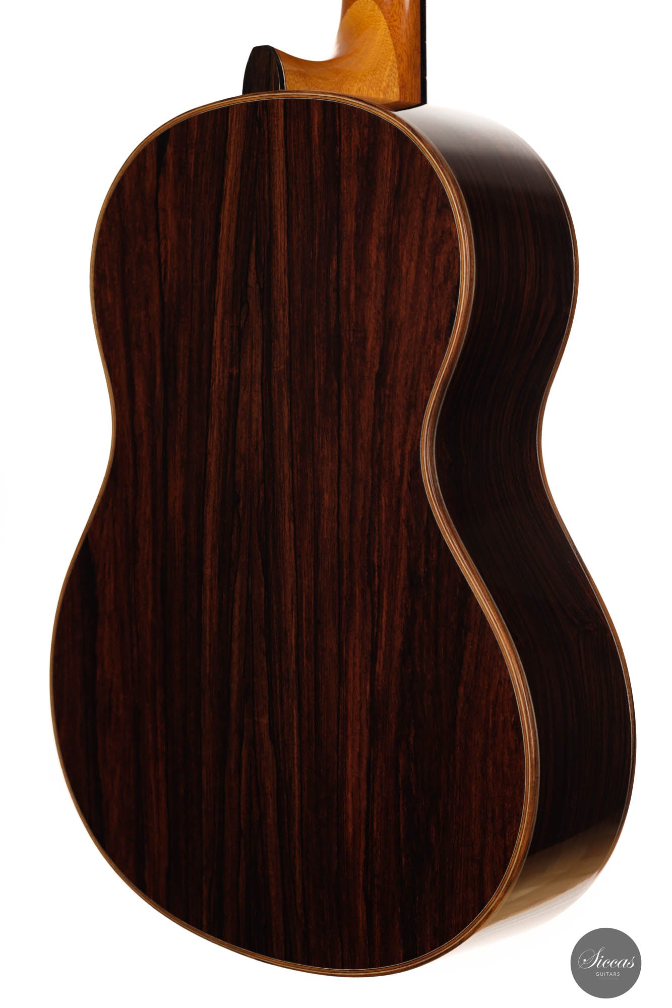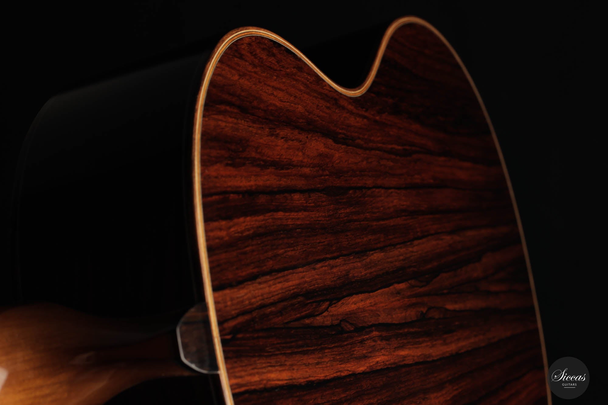 Die Planchon-Gitarre mit der Nummer 226 ist ein Beispiel für die hohe Kunstfertigkeit und die unvergleichliche Handwerkskunst ihres Schöpfers Olivier Planchon. Mit einer Decke aus exquisiter Fichte und einem Boden aus markantem Cocobolo verkörpert dieses Instrument eine verblüffende Mischung aus ästhetischer Raffinesse und akustischer Überlegenheit. Die Rosetten von Planchon, insbesondere die auf dieser Gitarre, zeugen von seiner außergewöhnlichen und unverwechselbaren Handwerkskunst. Ihre Schlichtheit täuscht über den arbeitsintensiven Prozess ihrer Herstellung hinweg. Die Rosette wird in mühevoller Handarbeit geschnitzt, eine zeitaufwändige Arbeit, die Planchons Hingabe für sein Handwerk beweist. Unter den Akustikgitarren ragt diese Gitarre wirklich heraus. Sie zeichnet sich durch ihr starkes Volumen und ihren präzisen, klaren Ton aus. Die Klangessenz kann üppig und dicht sein und macht sie zu einem Instrument, das mit bemerkenswerter Eleganz singt. Diese ausgeprägte Klangqualität ist ein Zeugnis für Planchons akribisches Verständnis und die Anwendung der akustischen Physik und des Designs und zeugt von seiner meisterhaften Beherrschung des Handwerks. Das X-Bracing-System in Kombination mit Fächerverstrebungen ist ein bemerkenswertes strukturelles Merkmal dieser Gitarre. Dieser hybride Ansatz sorgt für einen reichen und vollen Klang, der das Ohr erfreut und gleichzeitig das Instrument unterstützt. Zusammenfassend lässt sich sagen, dass die Planchon-Gitarre Nummer 226 Ästhetik, handwerkliche Finesse und überragende Klangqualität in sich vereint. Jedes Merkmal, von der Wahl der Materialien bis zum einzigartigen Beleistungssystem, macht dieses Instrument zu einer hervorragenden Demonstration von Planchons Engagement für die Herstellung von Gitarren der Spitzenklasse.Regelmäßige Pflege verlängert die Lebensdauer des Instruments
