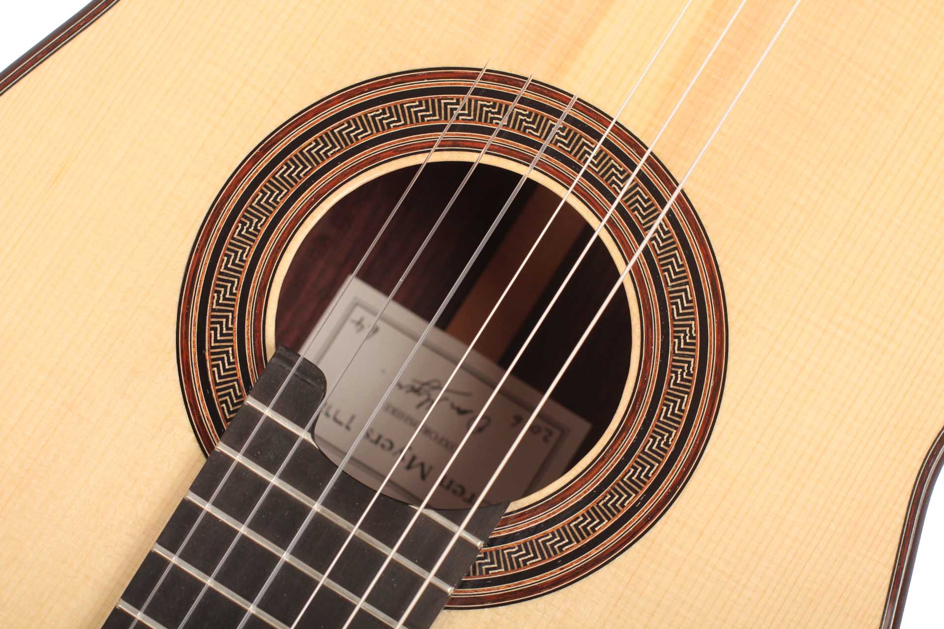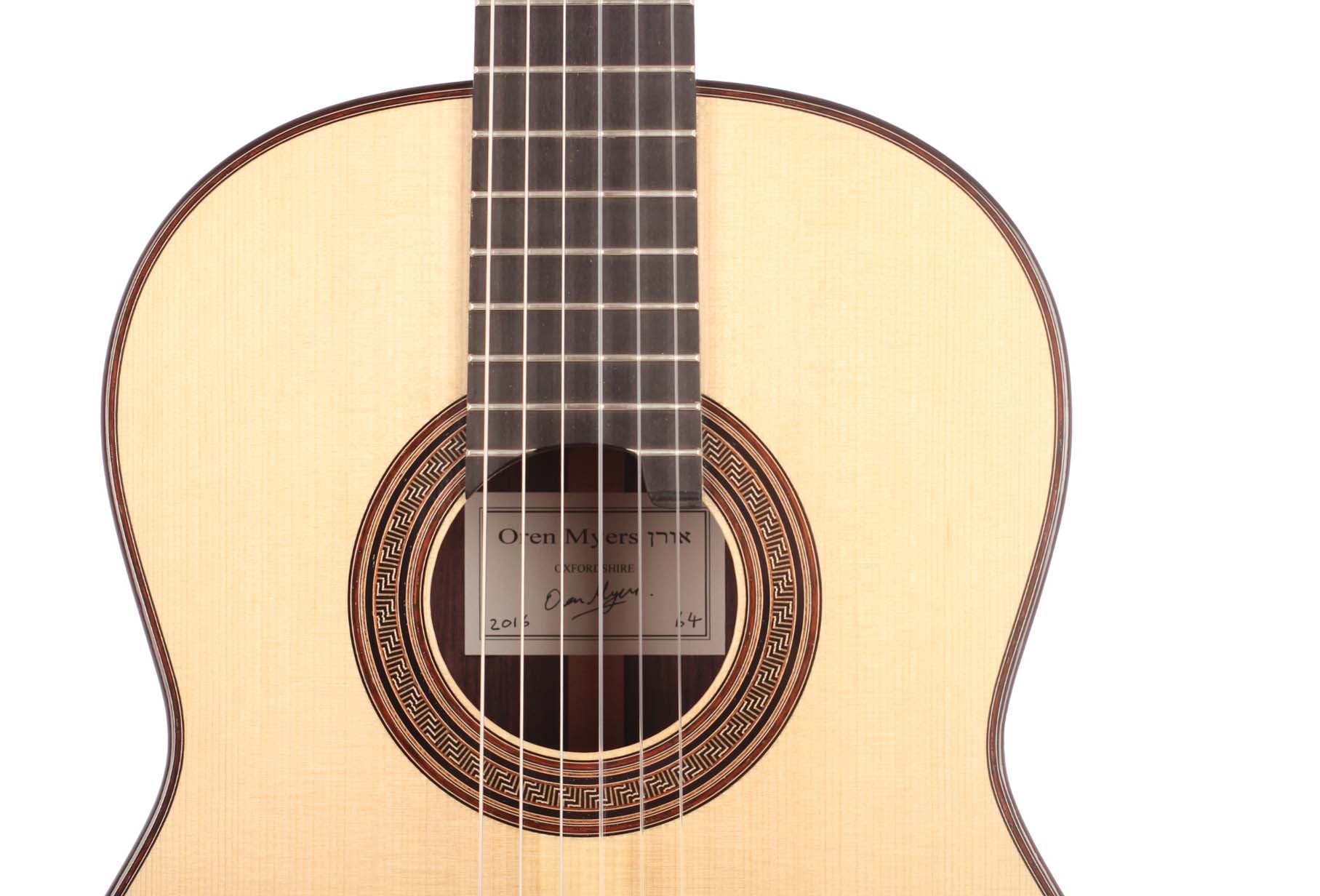 Oren Myers baut seine Gitarren im traditionellen Stil und hat über die Jahre sein eigenes Gitarrrenmodell entwickelt, das er heute hauptsächlich baut. Jede einzelne Gitarre ist ein Unikat, das individuell abgestimmt wurde. Das Design der Gitarre ist inspiriert von unterschiedlichen Kunstwerken. So ist die Kopfform von Picassos Meisterwerk "Frau mit gelbem Haar" inspiriert und die Rosette erinnert an eine antike Vase aus dem "British Museum". Diese Gitarre hat eine feine Fichtendecke und Boden/Zargen sind aus indischem Palisander. Veredelt wurde das Instrument mit einer Schellack Handpolitur. Die Mechaniken sind von Alessi. Inklusive Hiscox Pro II Koffer.
