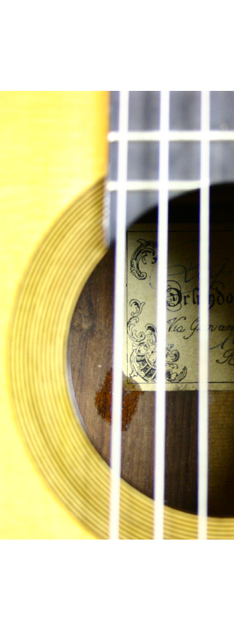 Diese Gitarre wurde von Orlando Raponi im Jahr 1965 gebaut. Es handelt sich um eine sehr seltene Gitarre, da sie eine Fichtedecke besitzt und in der Via Giovanni Volpato (Rom) und nicht in der Via della Magliano Nuova gebaut wurde. Meistens besitzen Raponi Gitarren eine Zedernholz oder Redwood Decke. Die Mechaniken dieser Gitarre sind original. Der Klang ist typisch für Raponi Gitarren: Klar und definiert und kräftig. Alirio Diaz gehört wohl zu einem der prominentesten Gitarristen, der Raponi Gitarren viele Jahre lang spielte. Die Gitarre befindet sich in sehr gutem Zustand.