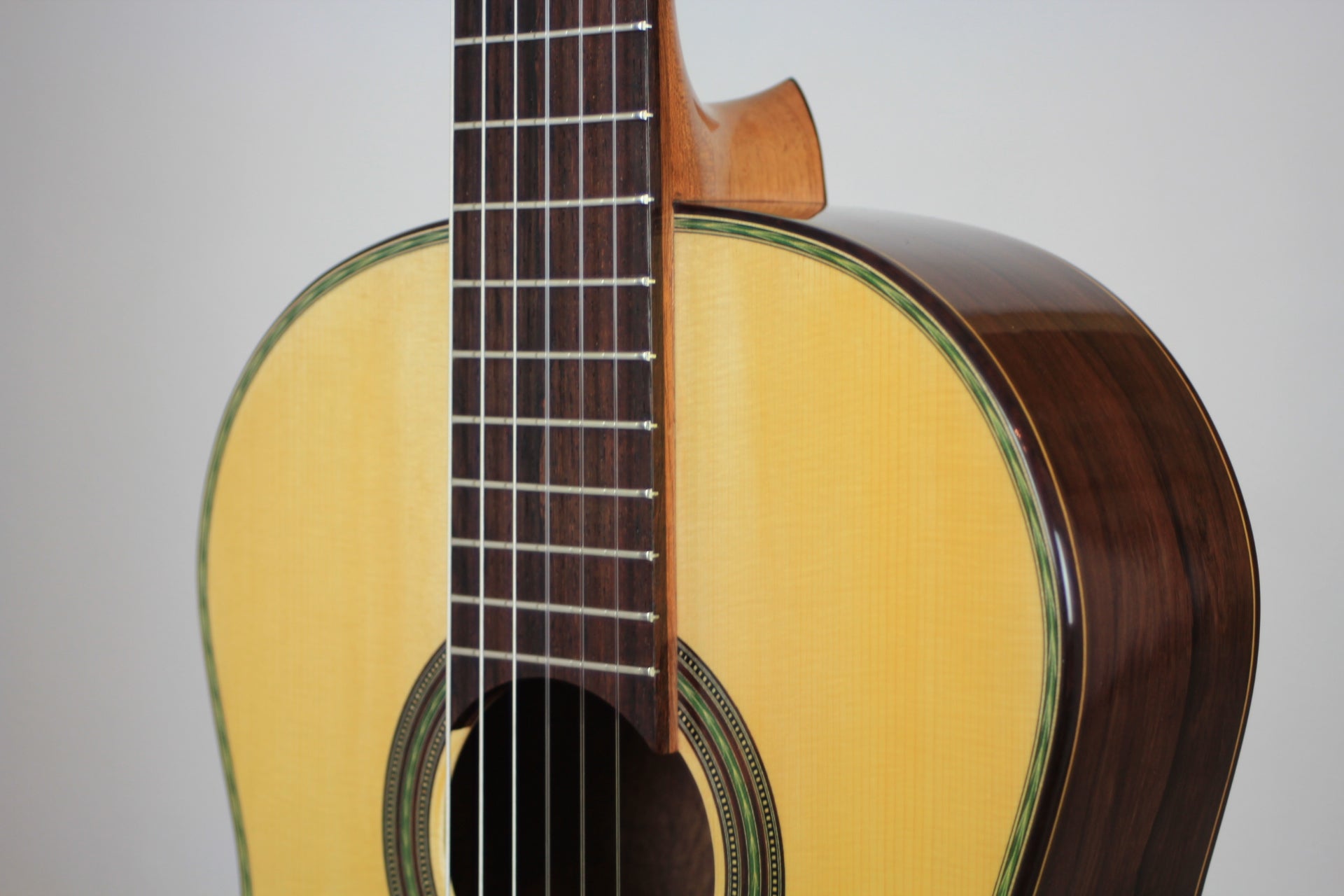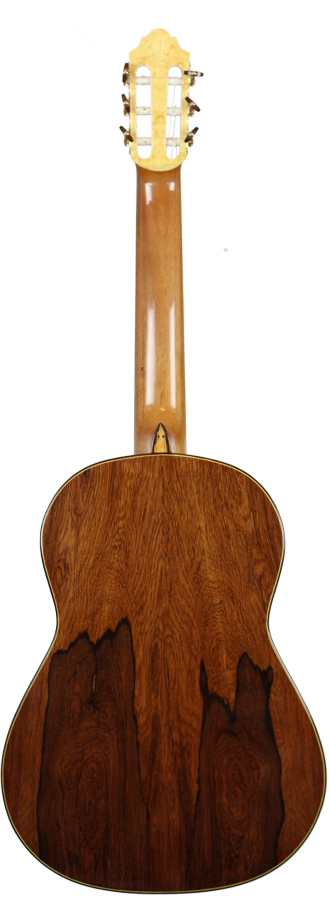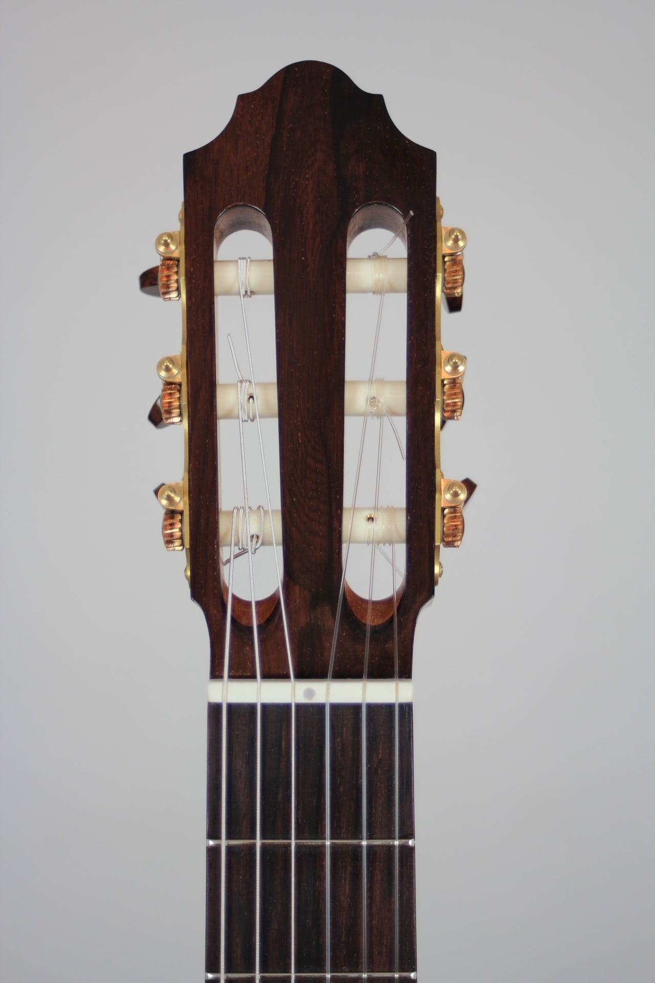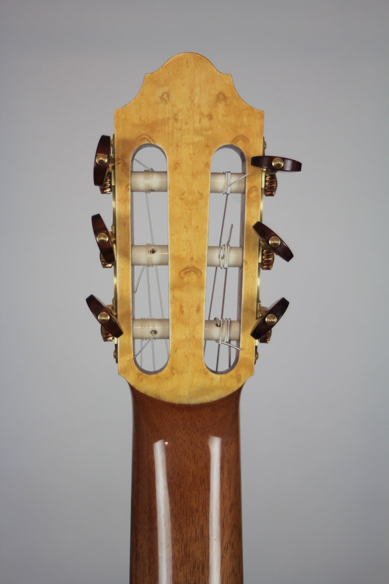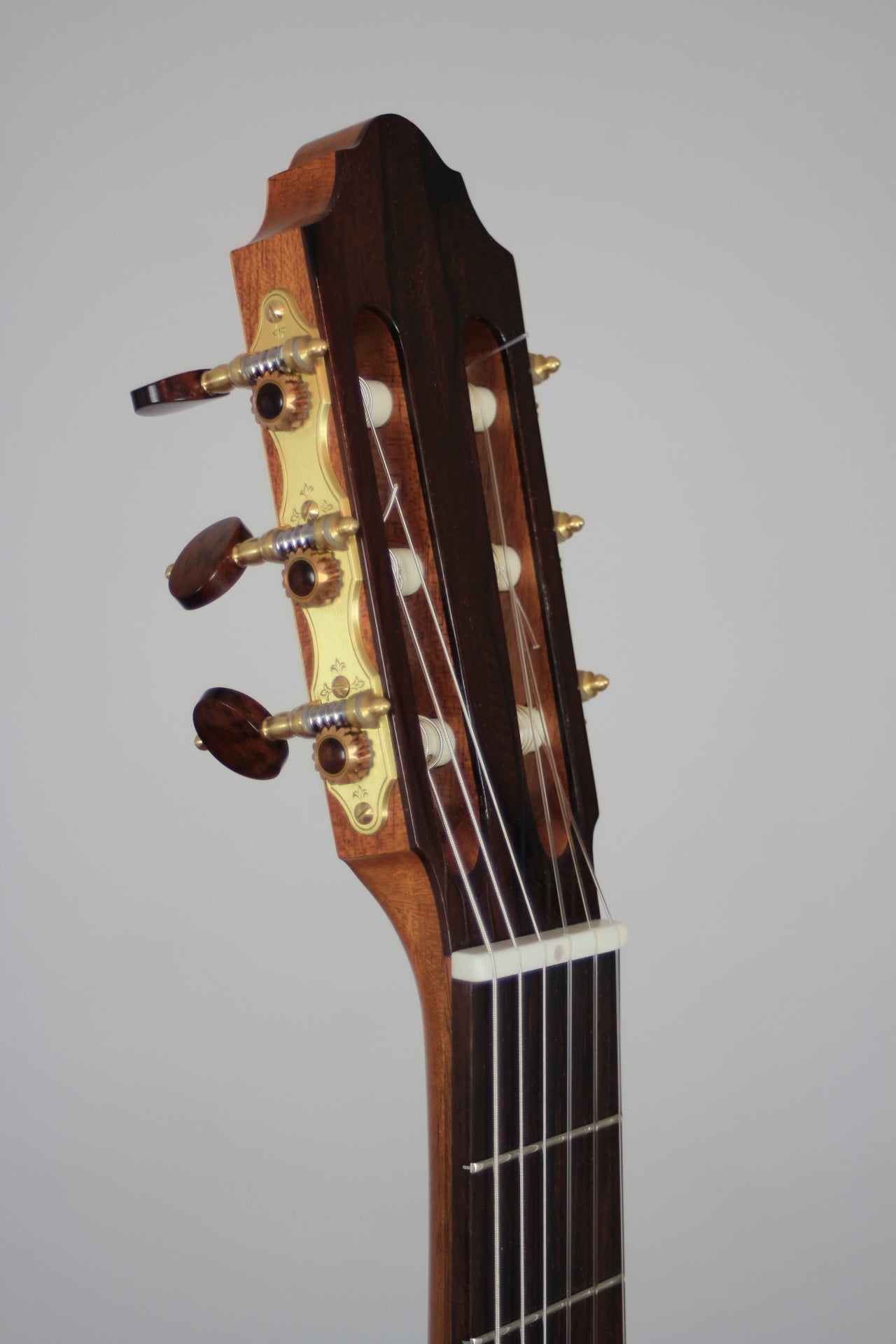This guitar was build by Otto Rauch in 2014 based on the model "Torres 1885 Especial". The sides and the back are made of selected Madagascar rosewood. The top is Italian spruce wood from the "Rosengarten" (Dolomites) which is scalloped (thinner on the outside than in the middle of the soundboard). An outstanding feature is the fretboard made of african rosewood. A contrast to the dark front of the head, is the veneered back - manufactured from Birdseye Maple. The guitar has a beautiful french-polish finish. Impressive volume and rich, deep basses as well as sparkling trebles characterizes the balanced sound of this fine guitar.
