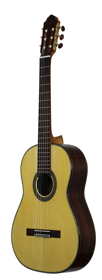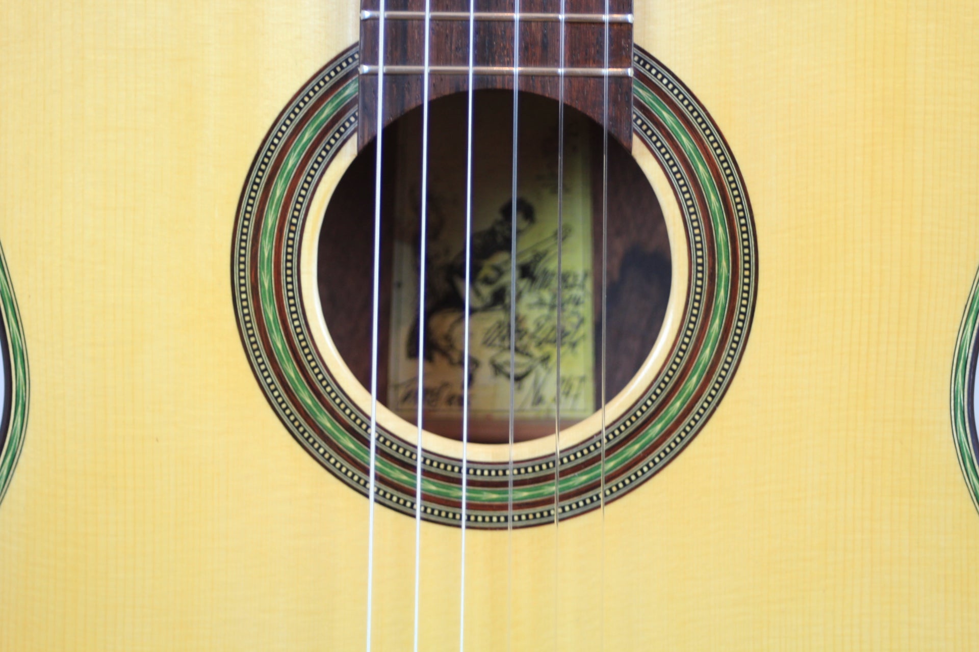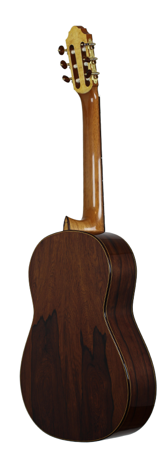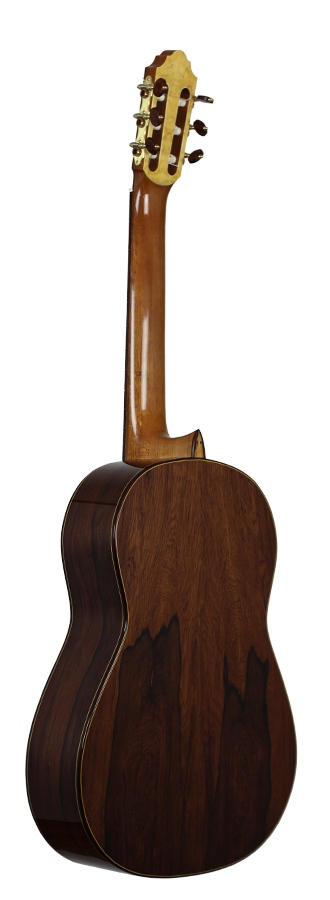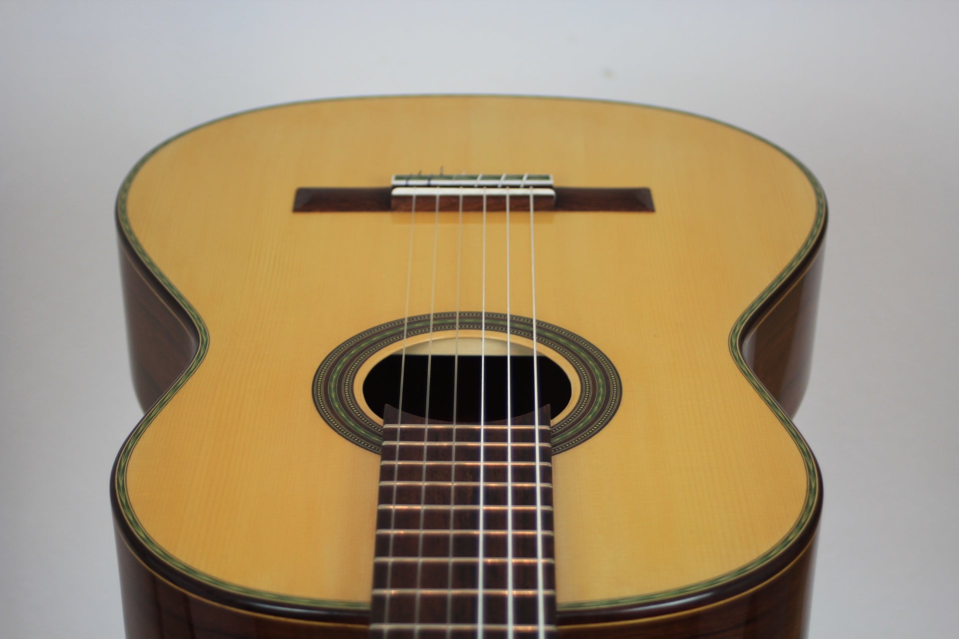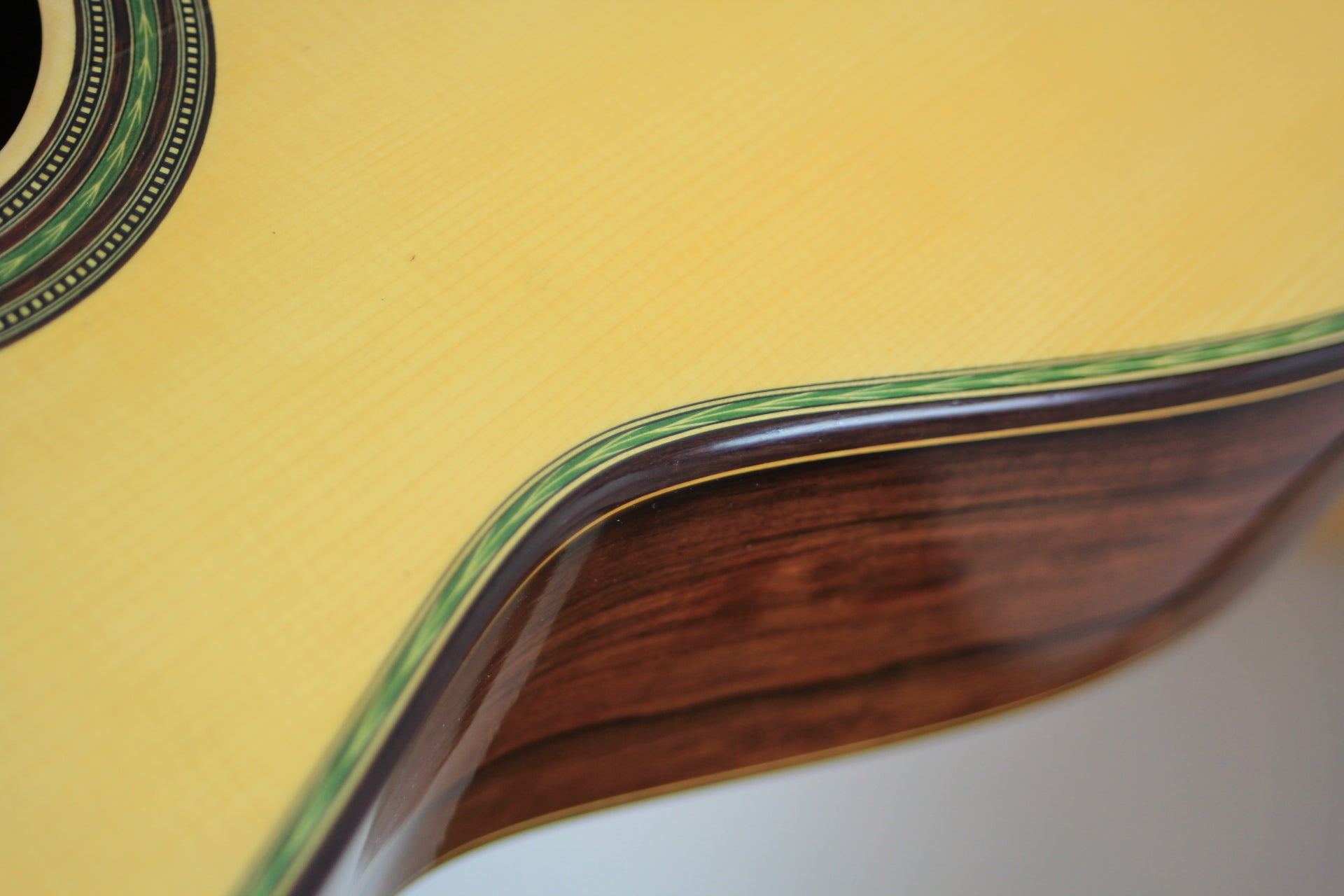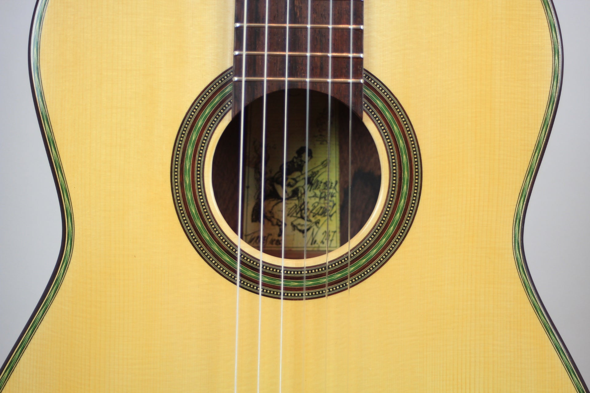 This guitar was build by Otto Rauch in 2014 based on the model "Torres 1885 Especial". The sides and the back are made of selected Madagascar rosewood. The top is Italian spruce wood from the "Rosengarten" (Dolomites) which is scalloped (thinner on the outside than in the middle of the soundboard). An outstanding feature is the fretboard made of african rosewood. A contrast to the dark front of the head, is the veneered back - manufactured from Birdseye Maple. The guitar has a beautiful french-polish finish. Impressive volume and rich, deep basses as well as sparkling trebles characterizes the balanced sound of this fine guitar.