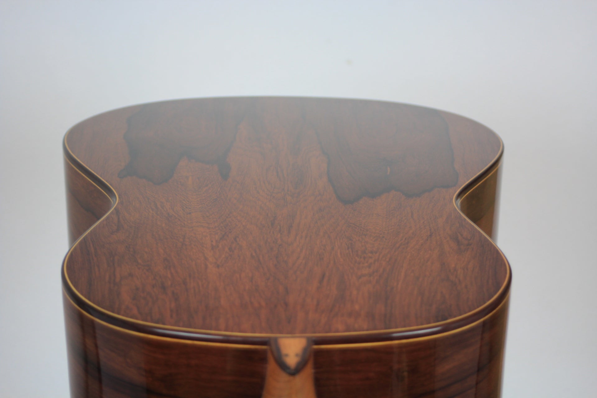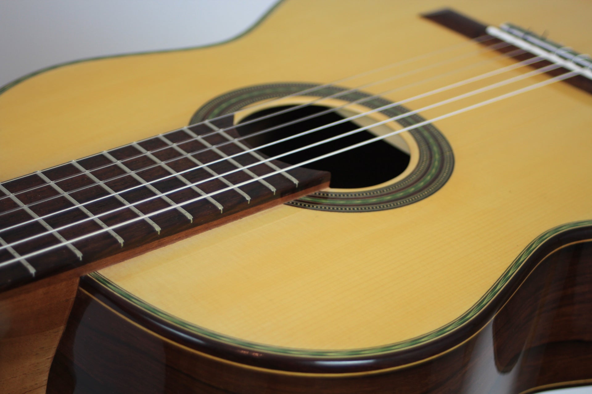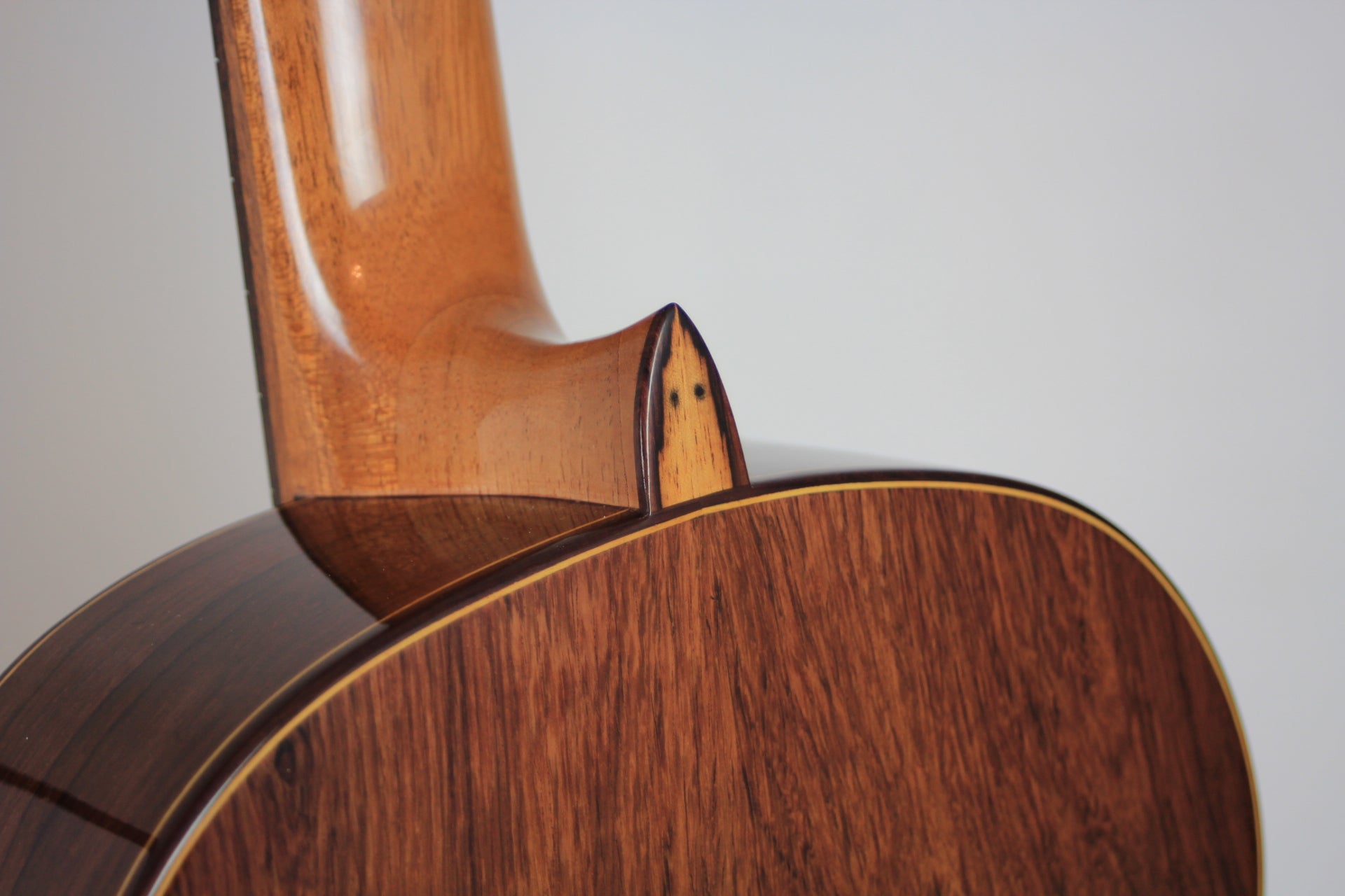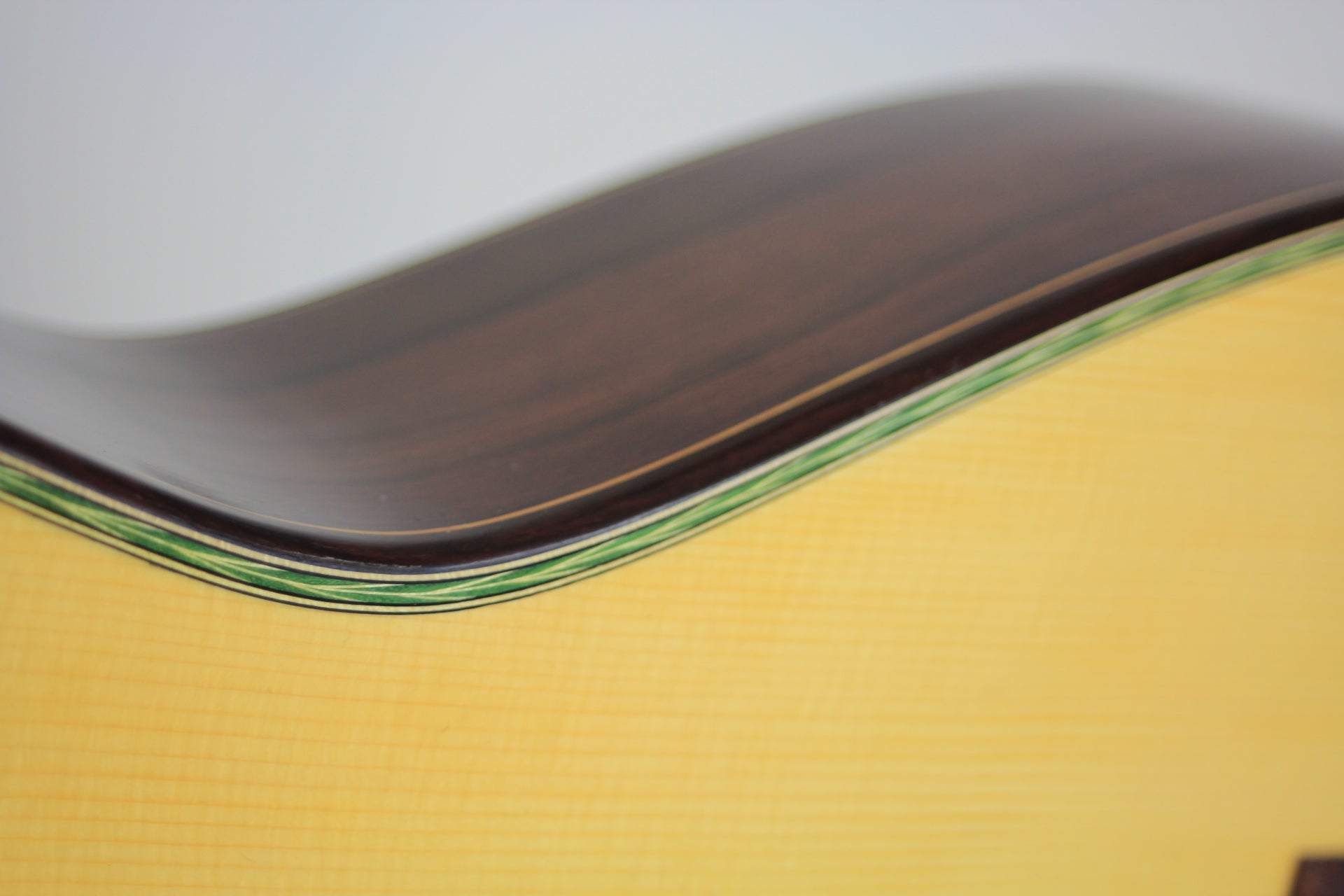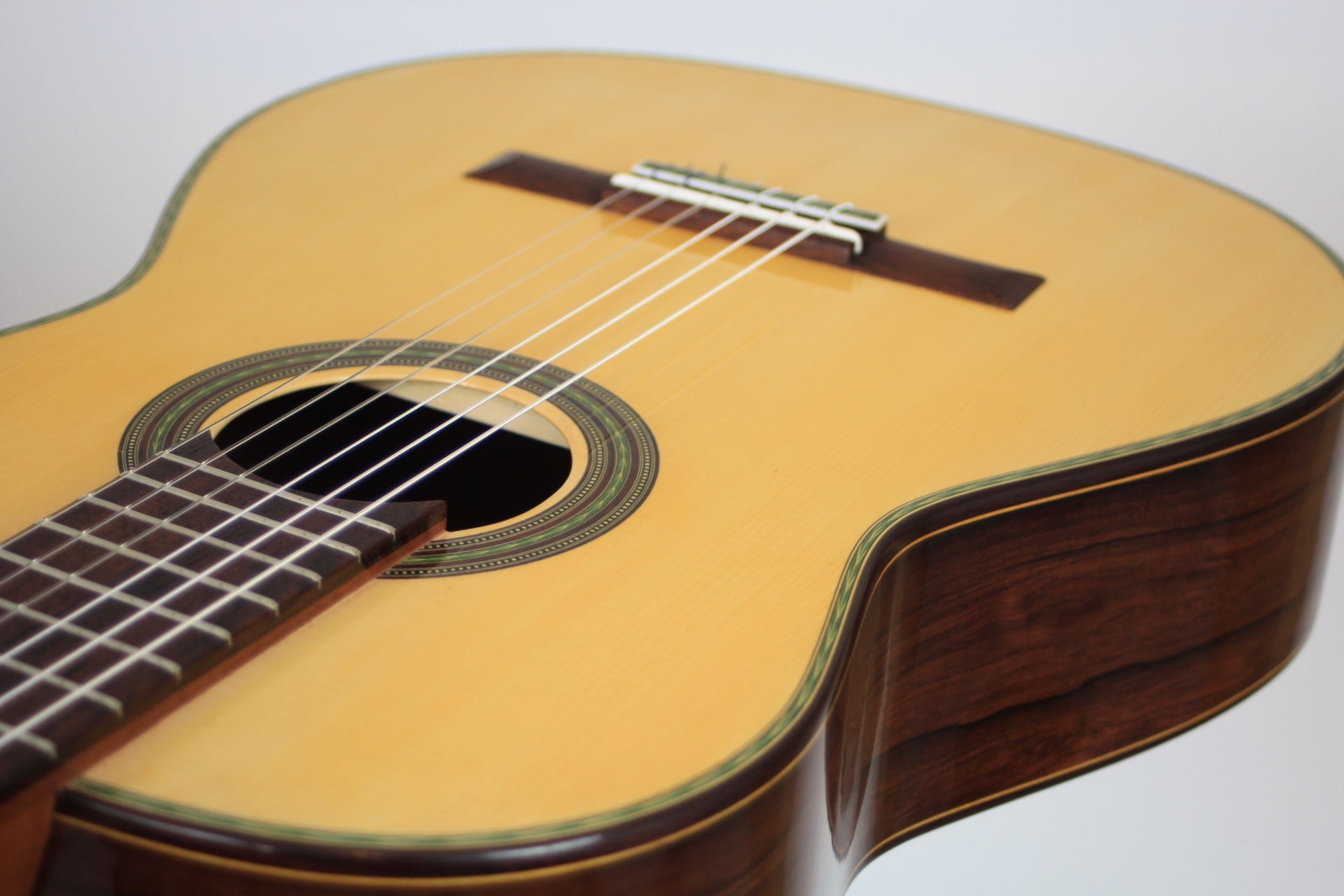 This guitar was build by Otto Rauch in 2014 based on the model "Torres 1885 Especial". The sides and the back are made of selected Madagascar rosewood. The top is Italian spruce wood from the "Rosengarten" (Dolomites) which is scalloped (thinner on the outside than in the middle of the soundboard). An outstanding feature is the fretboard made of african rosewood. A contrast to the dark front of the head, is the veneered back - manufactured from Birdseye Maple. The guitar has a beautiful french-polish finish. Impressive volume and rich, deep basses as well as sparkling trebles characterizes the balanced sound of this fine guitar.