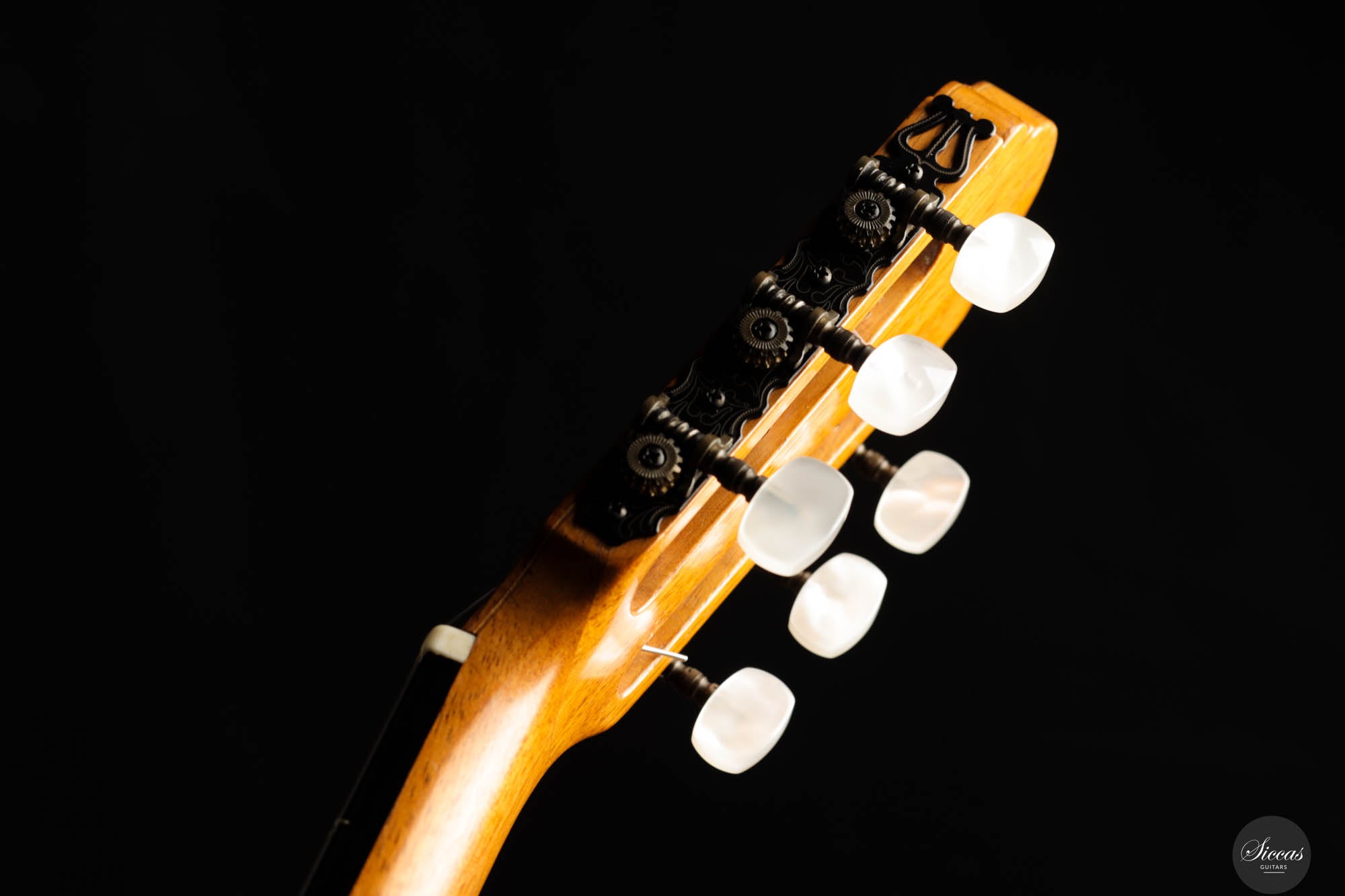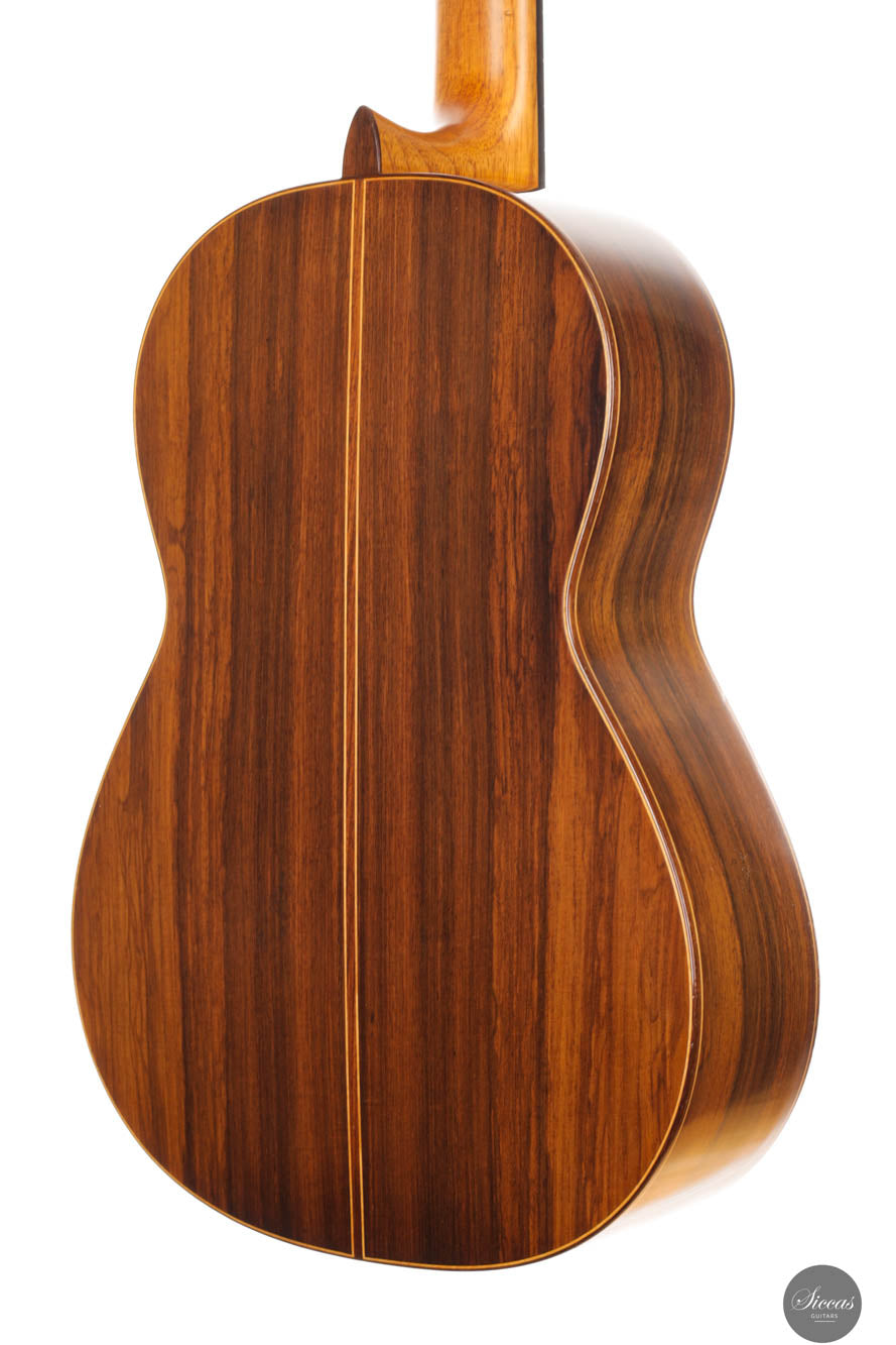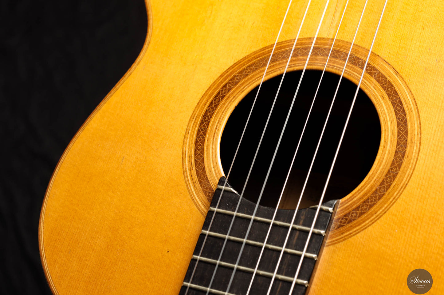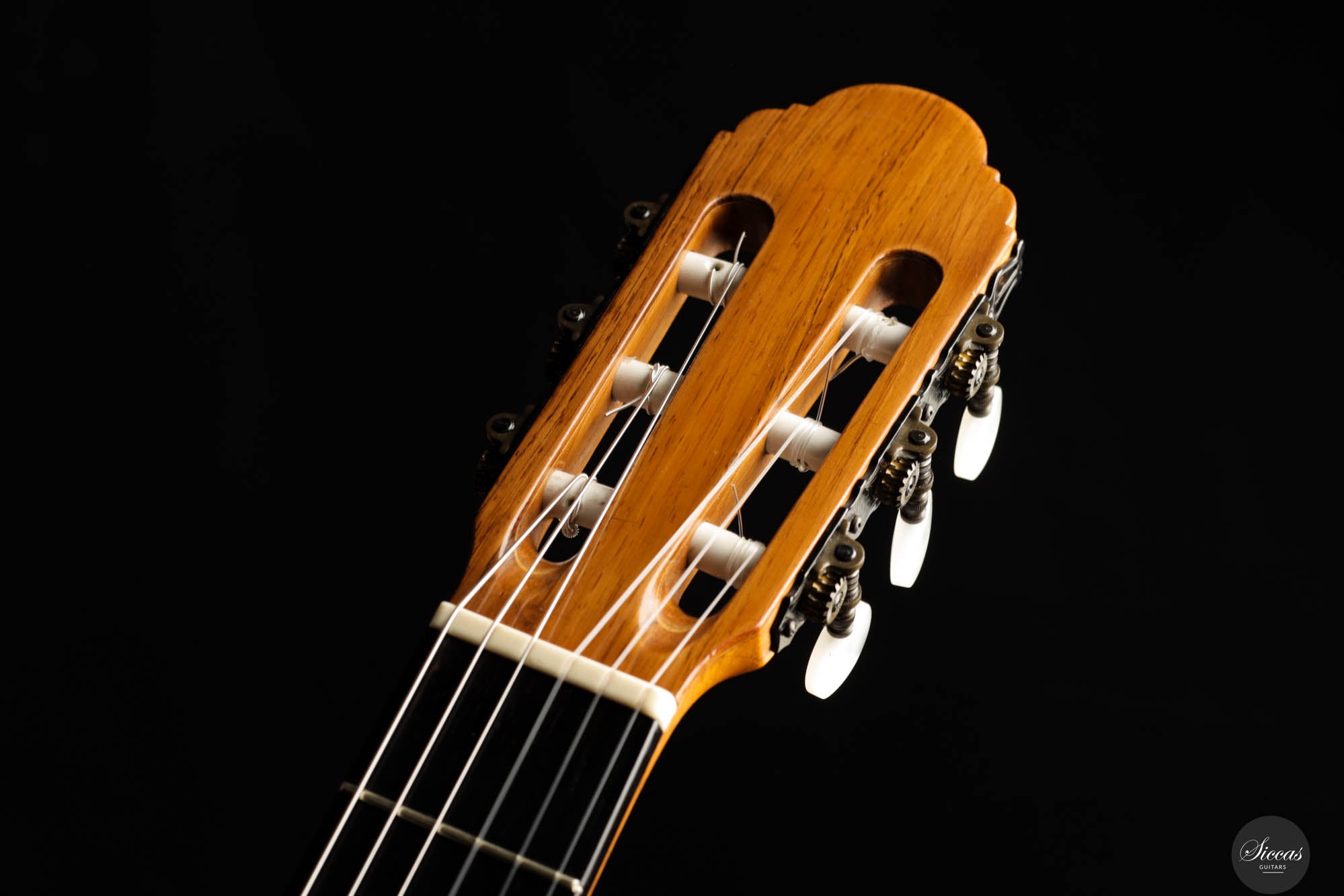Diese 40 Jahre alte Gitarre von Paco Santiago Marín ist ein eindrucksvolles Zeugnis der renommierten Granadiner Schule und spiegelt die Reife und Tiefe wider, die nur die Zeit verleihen kann. Ihre Höhen klingen lebendig und farbenreich, während die Bässe Klarheit und Resonanz entfalten und so ein ausgewogenes, ausdrucksstarkes Klangbild formen. Trotz ihres Alters präsentiert sich das Instrument in gutem Zustand, lediglich ein reparierter Riss zwischen Steg und Schallloch ist vorhanden. Als traditionell gestaltete Konzertgitarre bietet sie vielseitige Einsatzmöglichkeiten und vereint kulturelle Bedeutung mit zuverlässiger musikalischer Qualität.