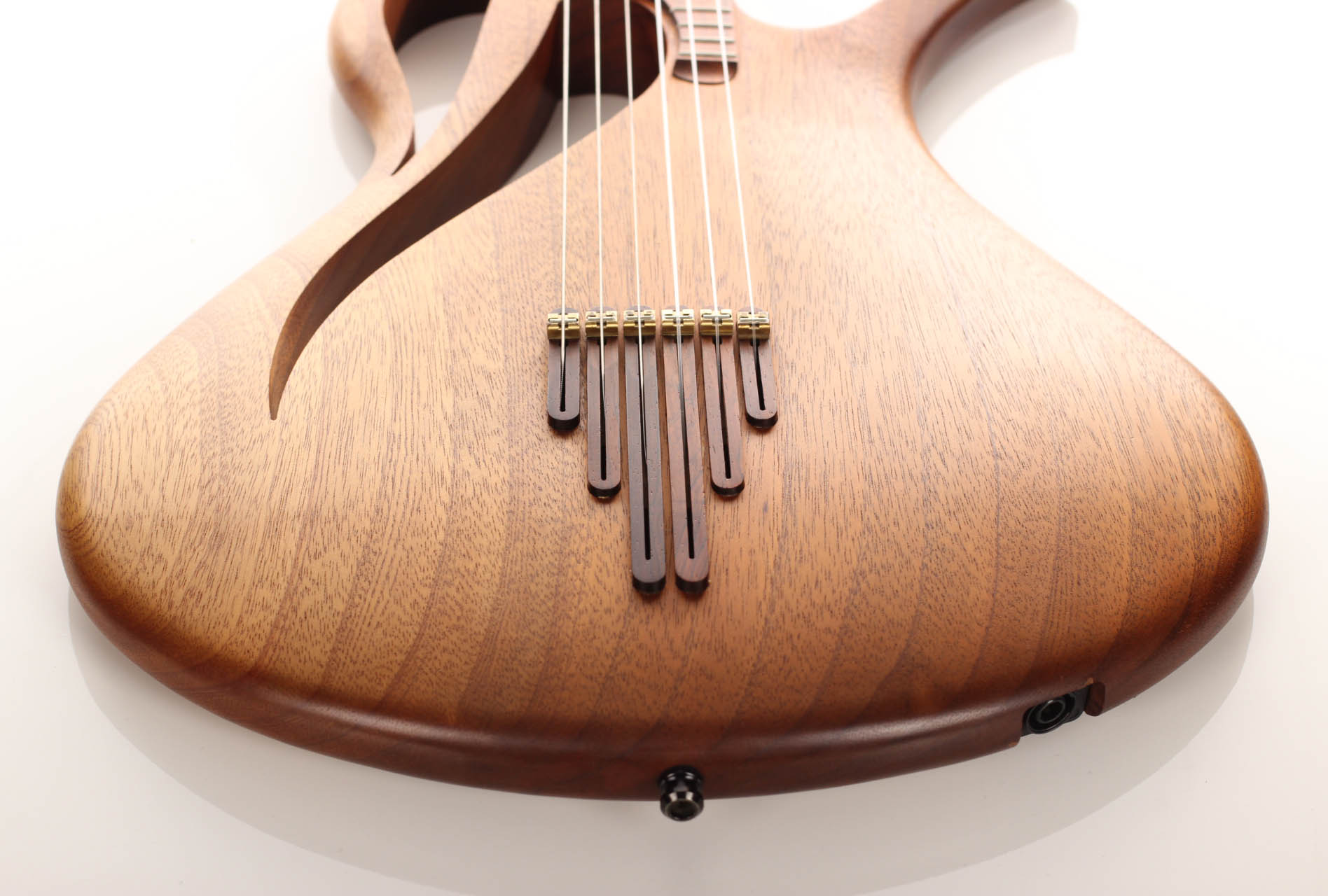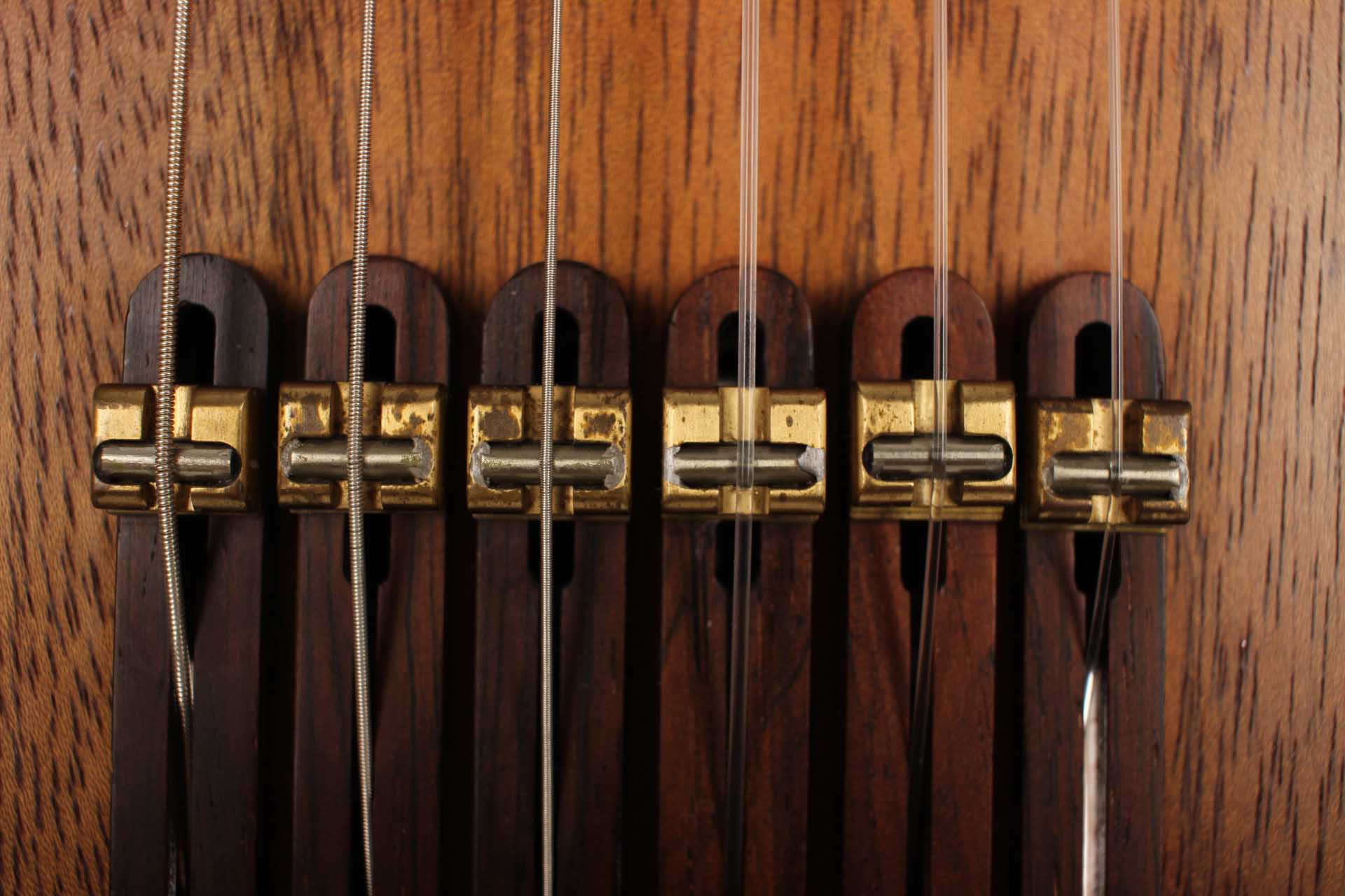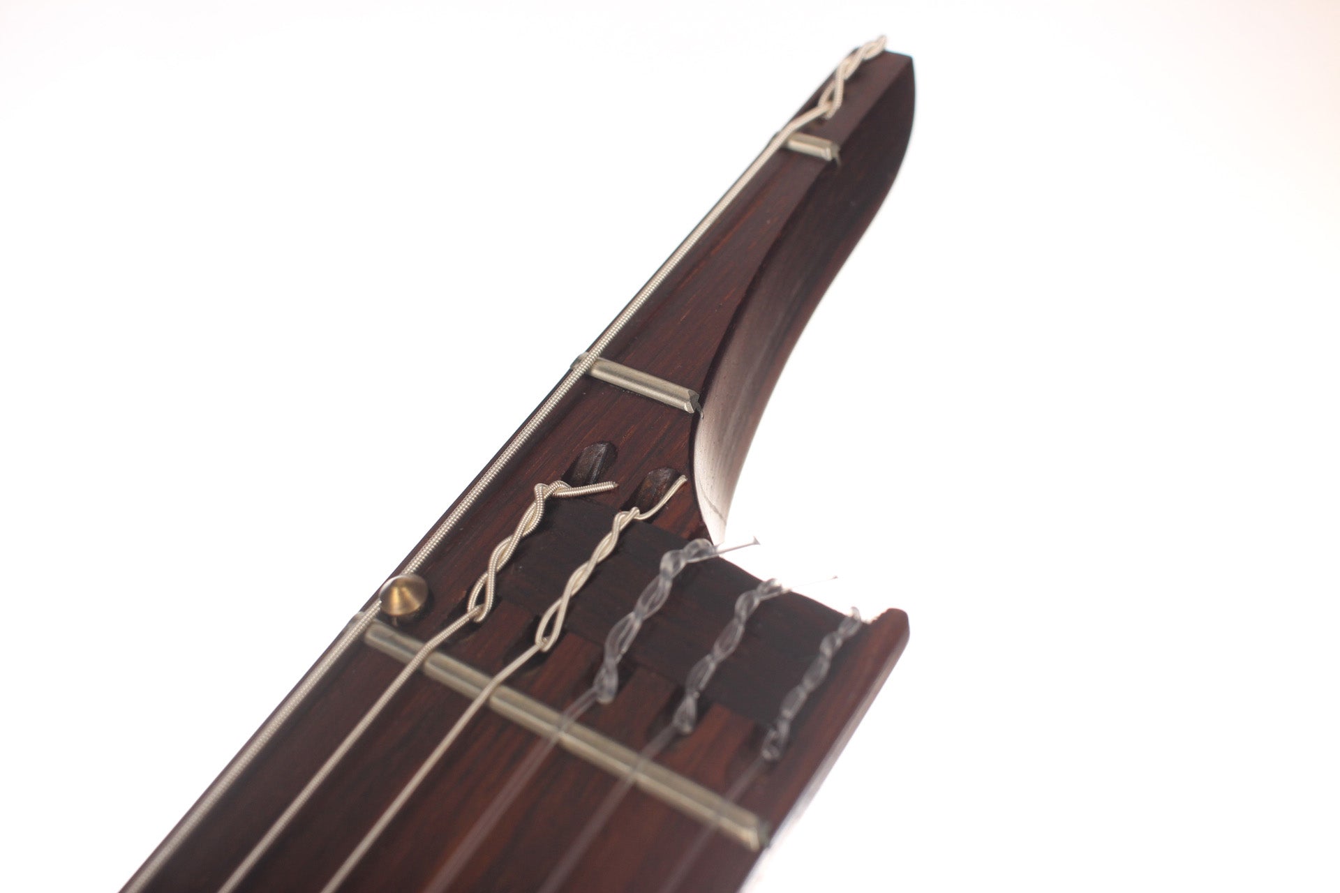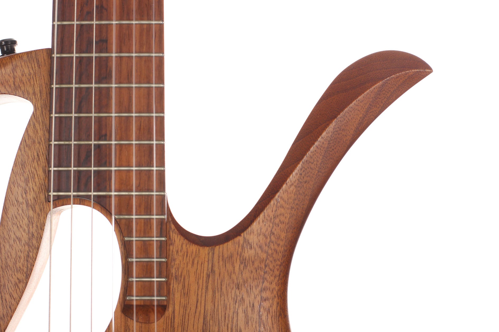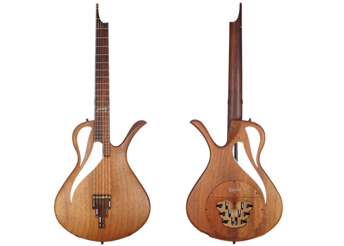 The company Paradis Guitars was founded in Switzerland in 1984 by Rolf Spuler, Matthias Grob, Jury Roten und Iris Dressler. They had the vision of a new generation of electrical guitars without heavy technical limitations thwarting clarity. At the same time, they dreamt of acoustic guitars that would be easier to amplify. They came up with a unique system to build guitars which are not just a mixture of acoustic and electric guitars but a revolutionary new approach to guitar building. Rolf Spuler made this gorgeous nylon-stringed instrument in 1995. The design is rather futuristic. The semi-solid body is made of beautifully grained mahogany and is elegantly curved with petal-like holes. The strings are knotted where you would normally expect the head and the tuners to be. There are two additional frets for low D as well as an E clamp for standard tuning. The tuners are on the back of the guitar behind the saddle which consists of Individually adjustable string saddles to improve intonation, sitting on long slots elegantly surrounded by Rosewood. The instrument can be connected to the Paradis polysubbass, a multiple octaver incomparable to other interfaces or effects. The guitar is very light and easy to play. The basses sound very full when the guitar is plugged in. The semi-solid body avoids feedback and allows natural wooden resonance at the same time. It is also compatible to all conventional synthesizers and electronic control gear. The guitar is in mint condition. A robust flight case, the polysubbass, a spare pickup, an original stereo volume pedal and an appropriate cable system are included.