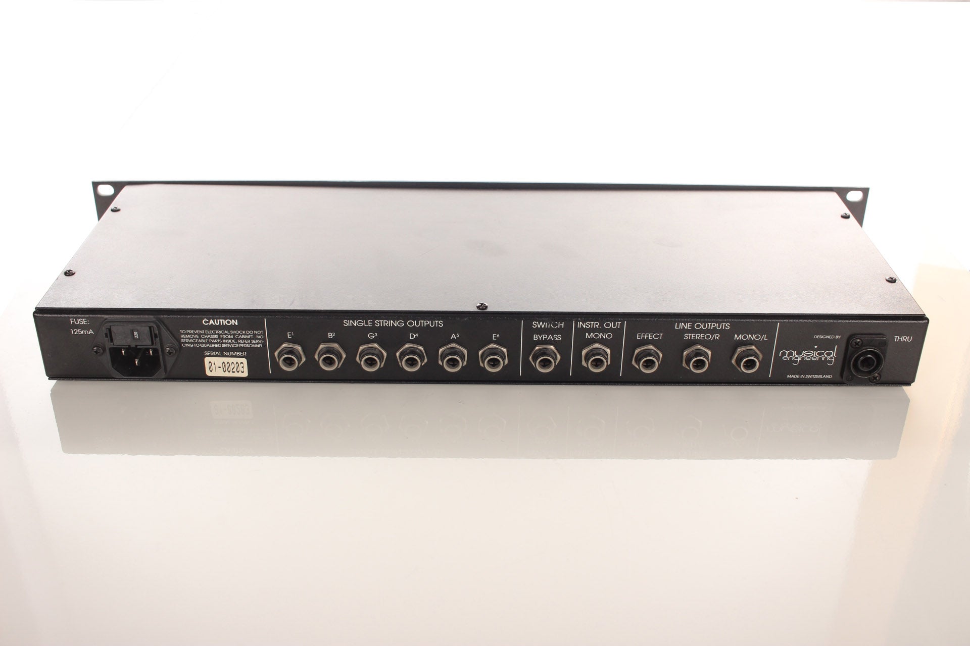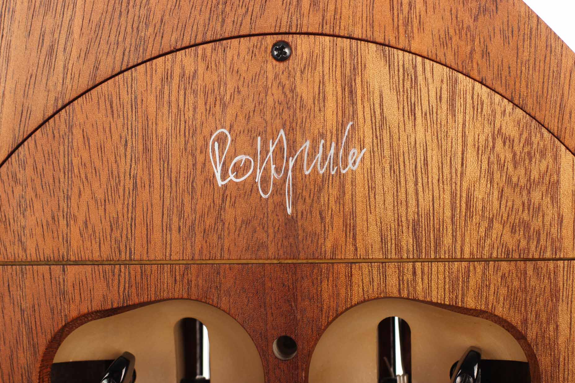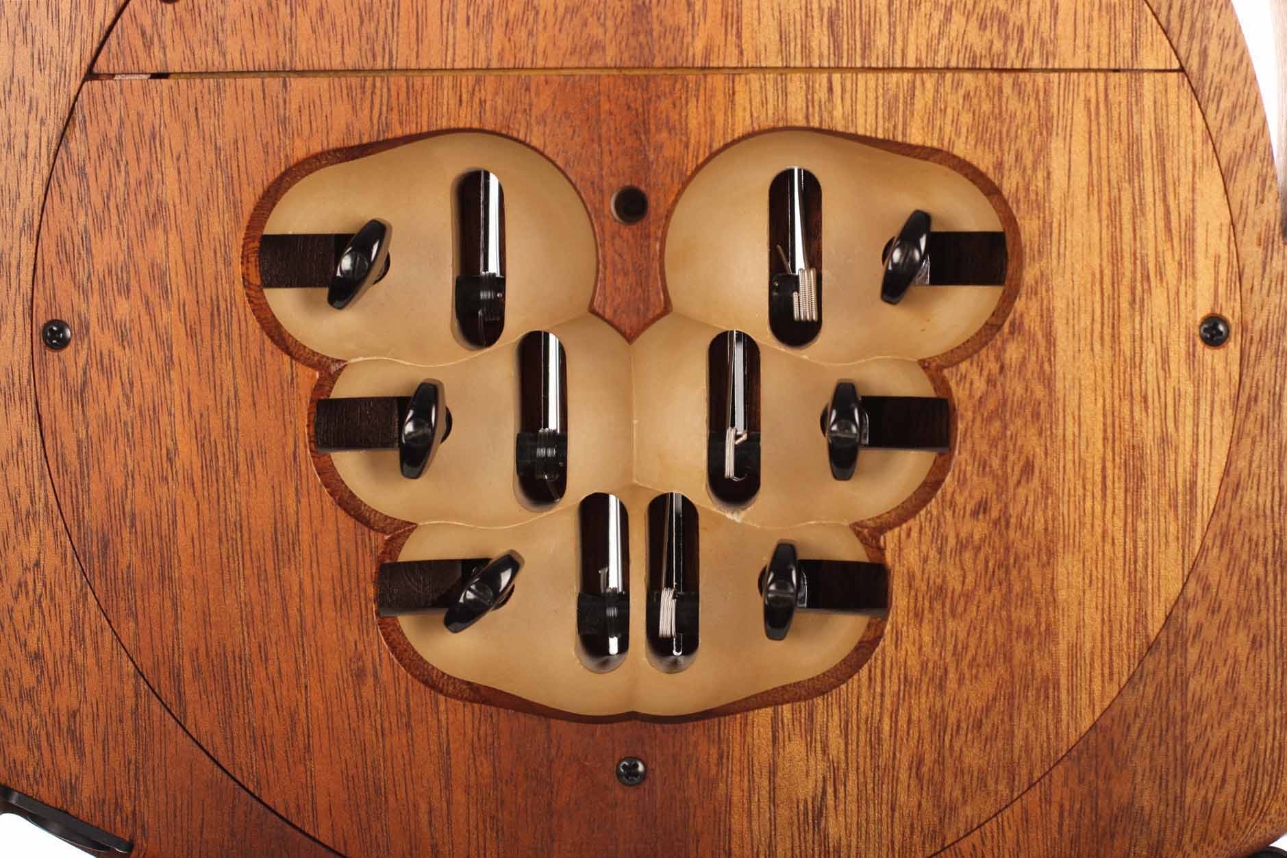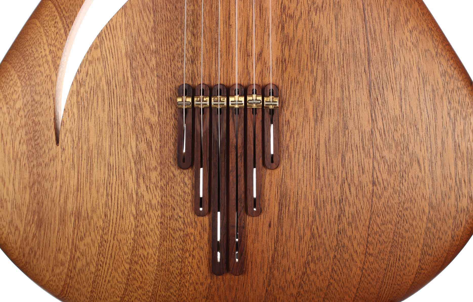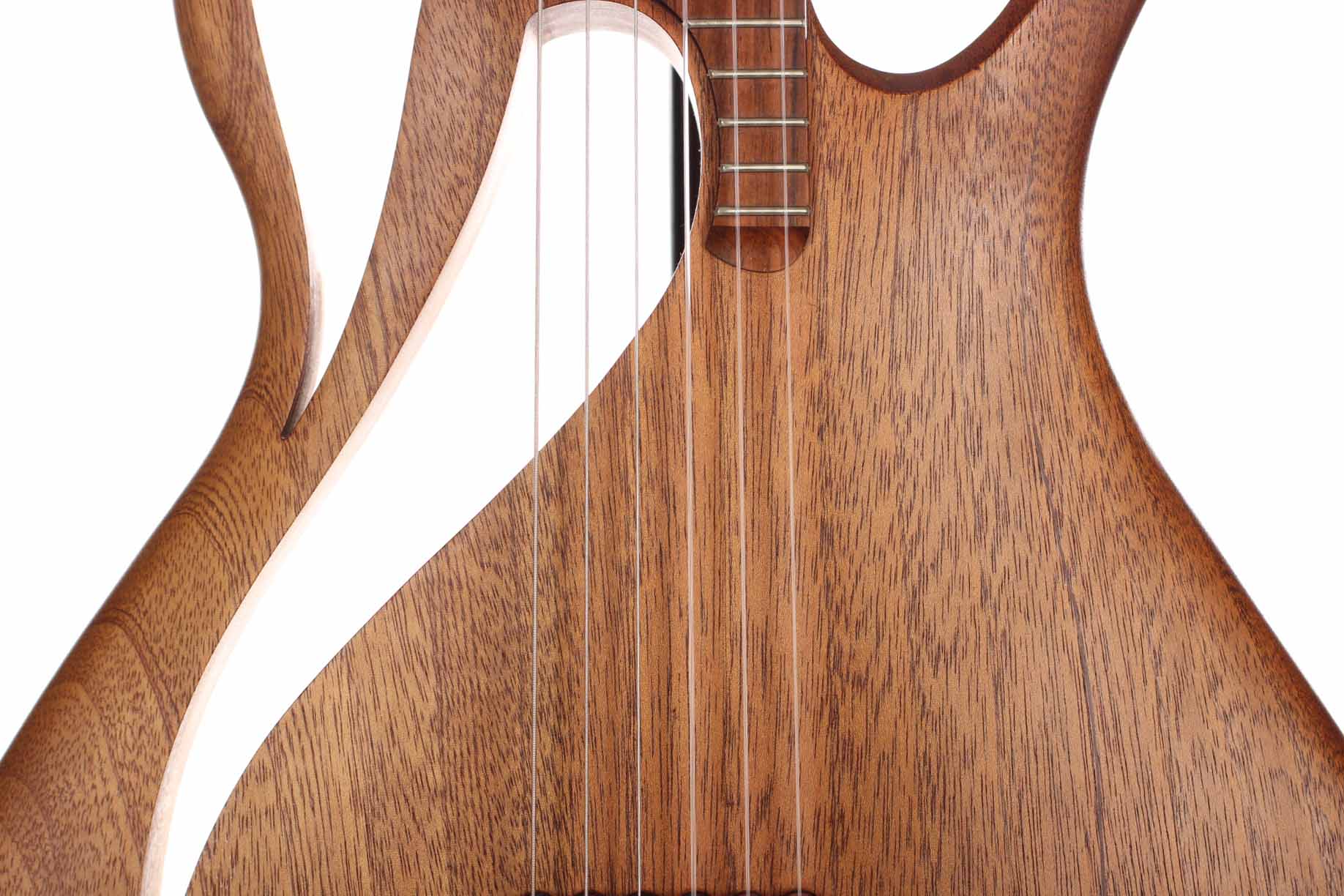 The company Paradis Guitars was founded in Switzerland in 1984 by Rolf Spuler, Matthias Grob, Jury Roten und Iris Dressler. They had the vision of a new generation of electrical guitars without heavy technical limitations thwarting clarity. At the same time, they dreamt of acoustic guitars that would be easier to amplify. They came up with a unique system to build guitars which are not just a mixture of acoustic and electric guitars but a revolutionary new approach to guitar building. Rolf Spuler made this gorgeous nylon-stringed instrument in 1995. The design is rather futuristic. The semi-solid body is made of beautifully grained mahogany and is elegantly curved with petal-like holes. The strings are knotted where you would normally expect the head and the tuners to be. There are two additional frets for low D as well as an E clamp for standard tuning. The tuners are on the back of the guitar behind the saddle which consists of Individually adjustable string saddles to improve intonation, sitting on long slots elegantly surrounded by Rosewood. The instrument can be connected to the Paradis polysubbass, a multiple octaver incomparable to other interfaces or effects. The guitar is very light and easy to play. The basses sound very full when the guitar is plugged in. The semi-solid body avoids feedback and allows natural wooden resonance at the same time. It is also compatible to all conventional synthesizers and electronic control gear. The guitar is in mint condition. A robust flight case, the polysubbass, a spare pickup, an original stereo volume pedal and an appropriate cable system are included.