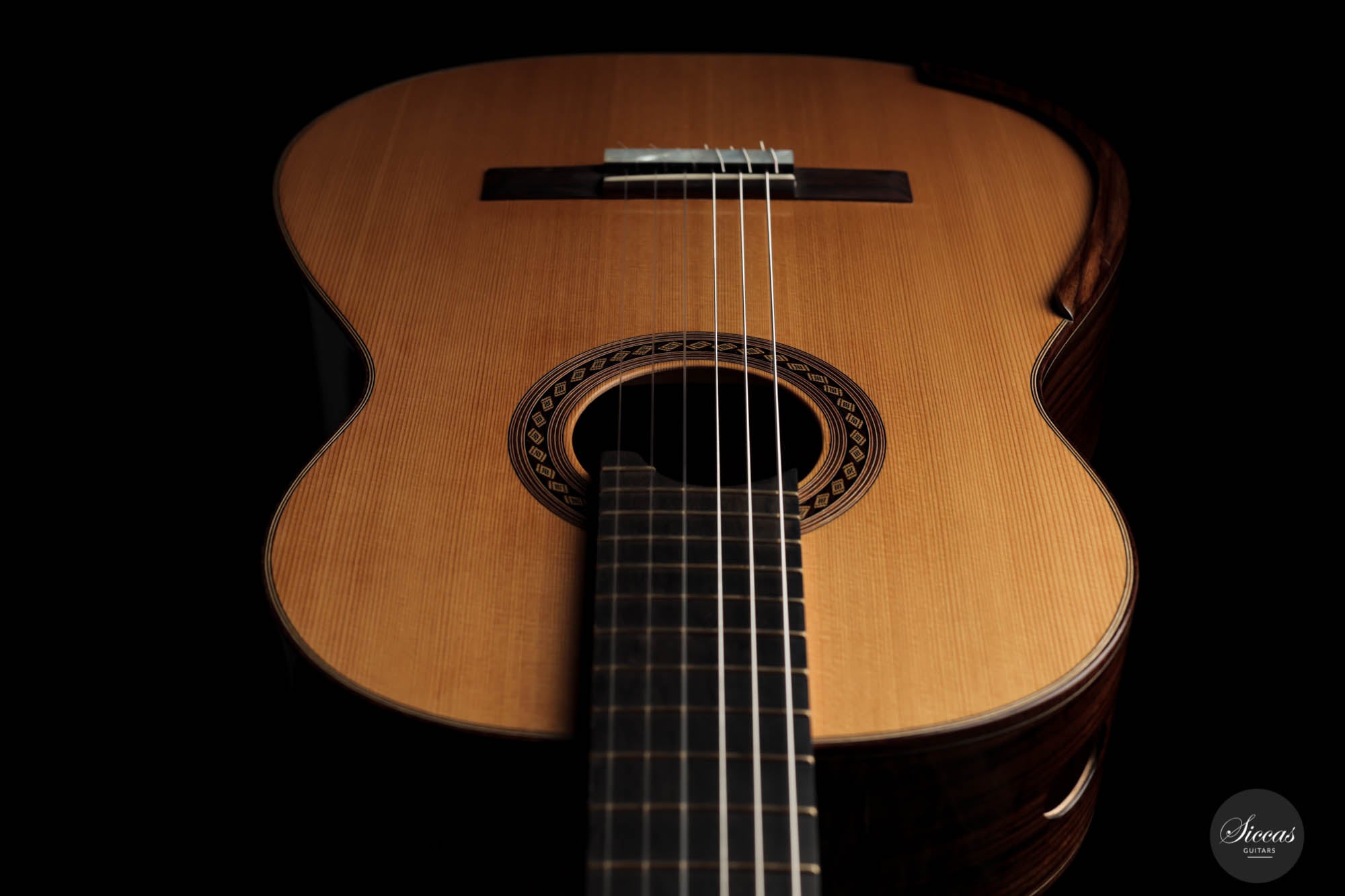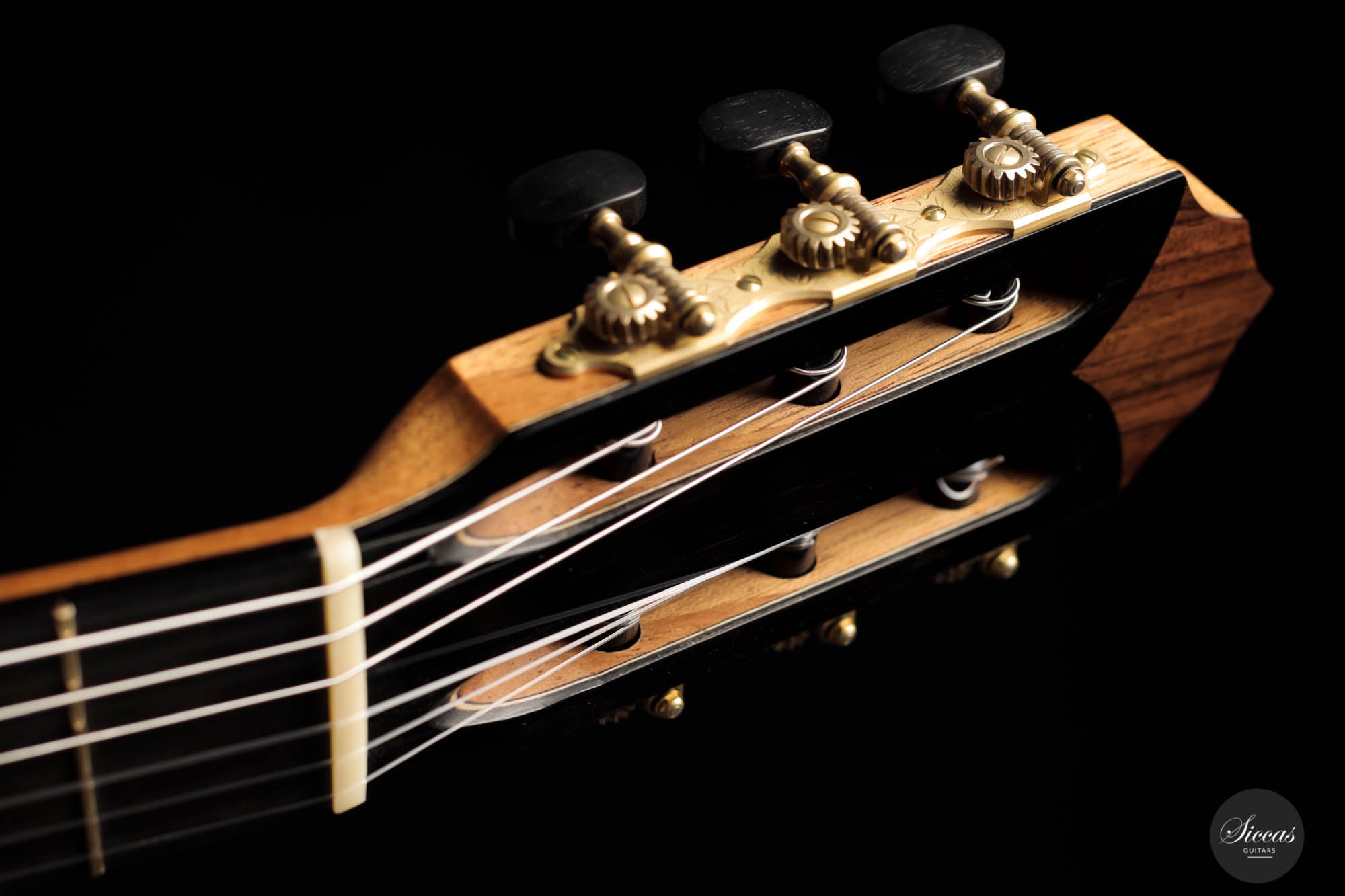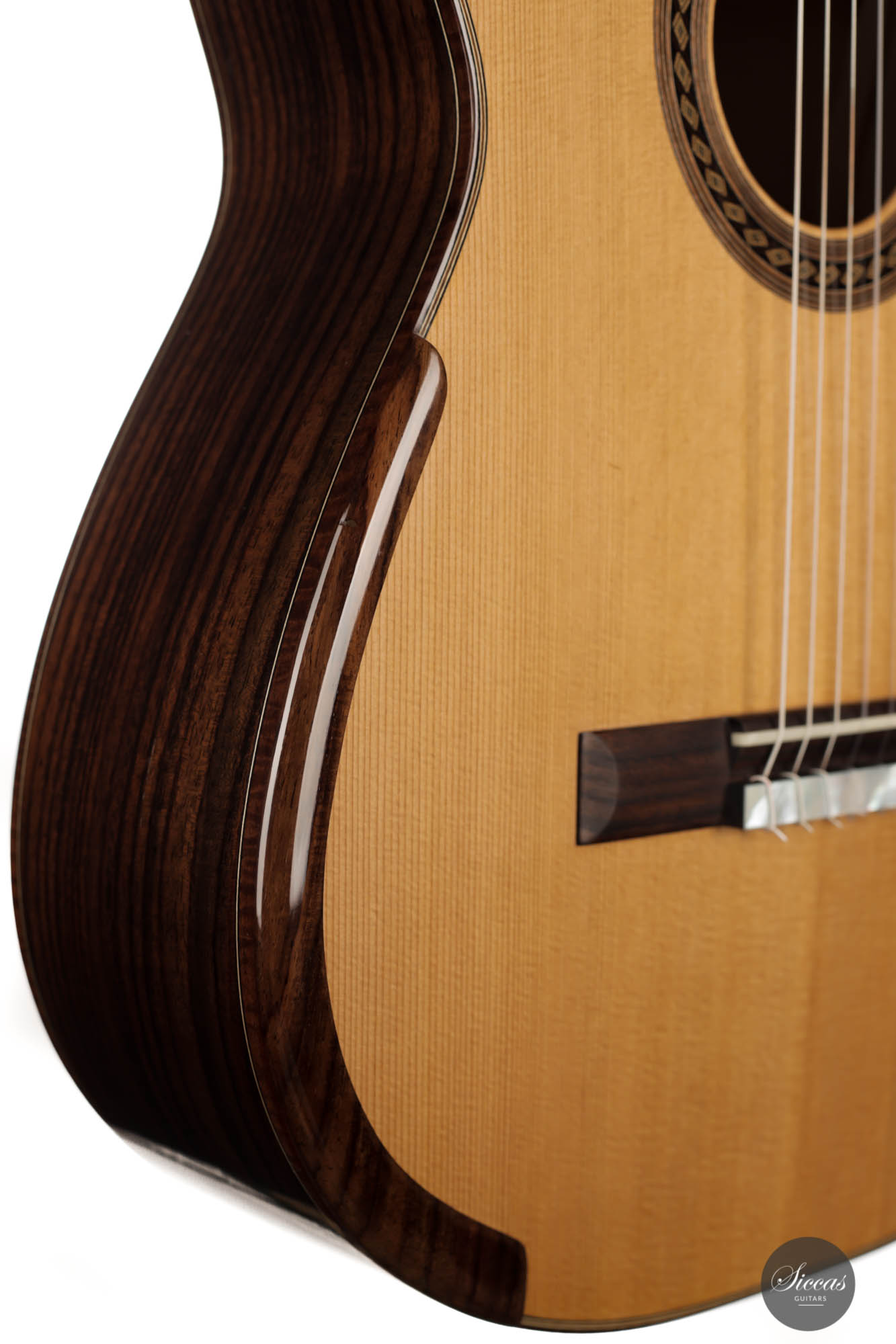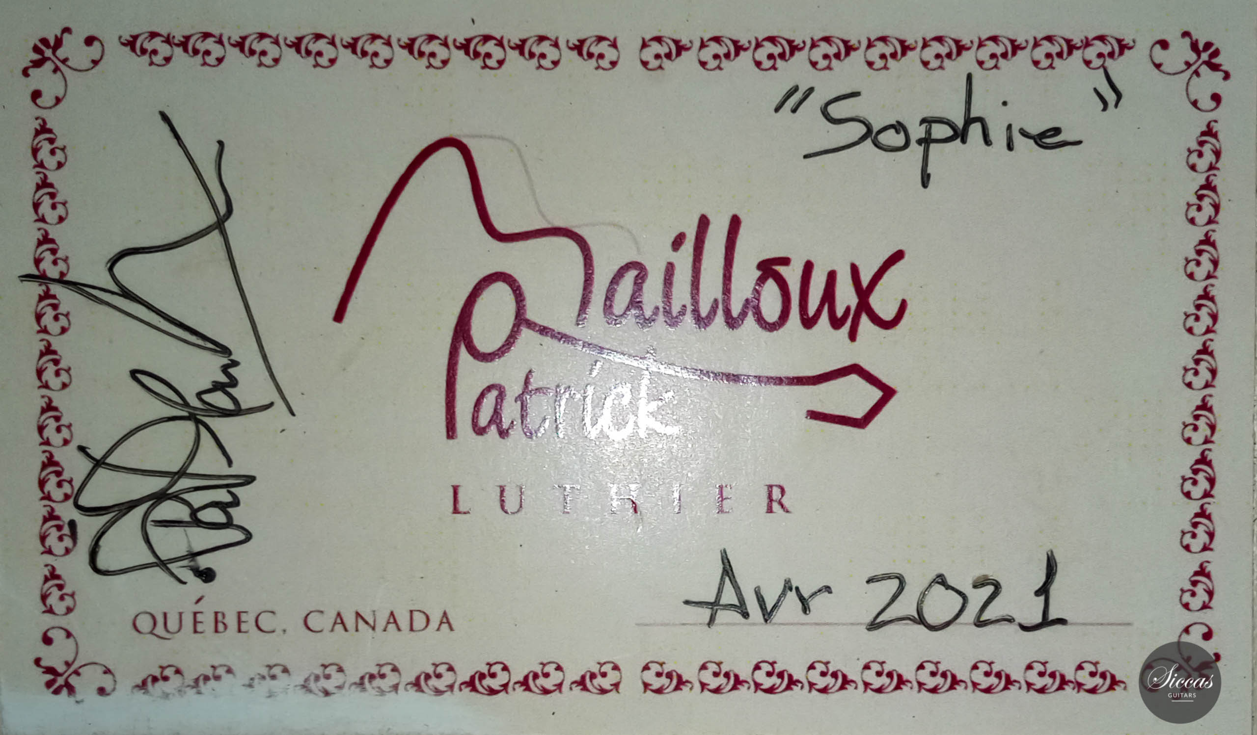 This guitar, named "Sophie", has a Canadian Western Red Cedar double top, with East Indian back and sides. The back and sides are doubled with Canadian Maple, increasing stability and producing more clarity in the sound. The bindings are made of Flamed Katalox, which is enhanced by the French Polished shellac finish. The sound is mighty, with great separation, clarity, and balance. Thanks to the fantastic playability offered by the comfortable neck, this guitar plays by itself and makes left-hand gymnastics effortless. Sophie has a 650 mm scale length, a 53mm nut, and Gotoh Premium Tuners