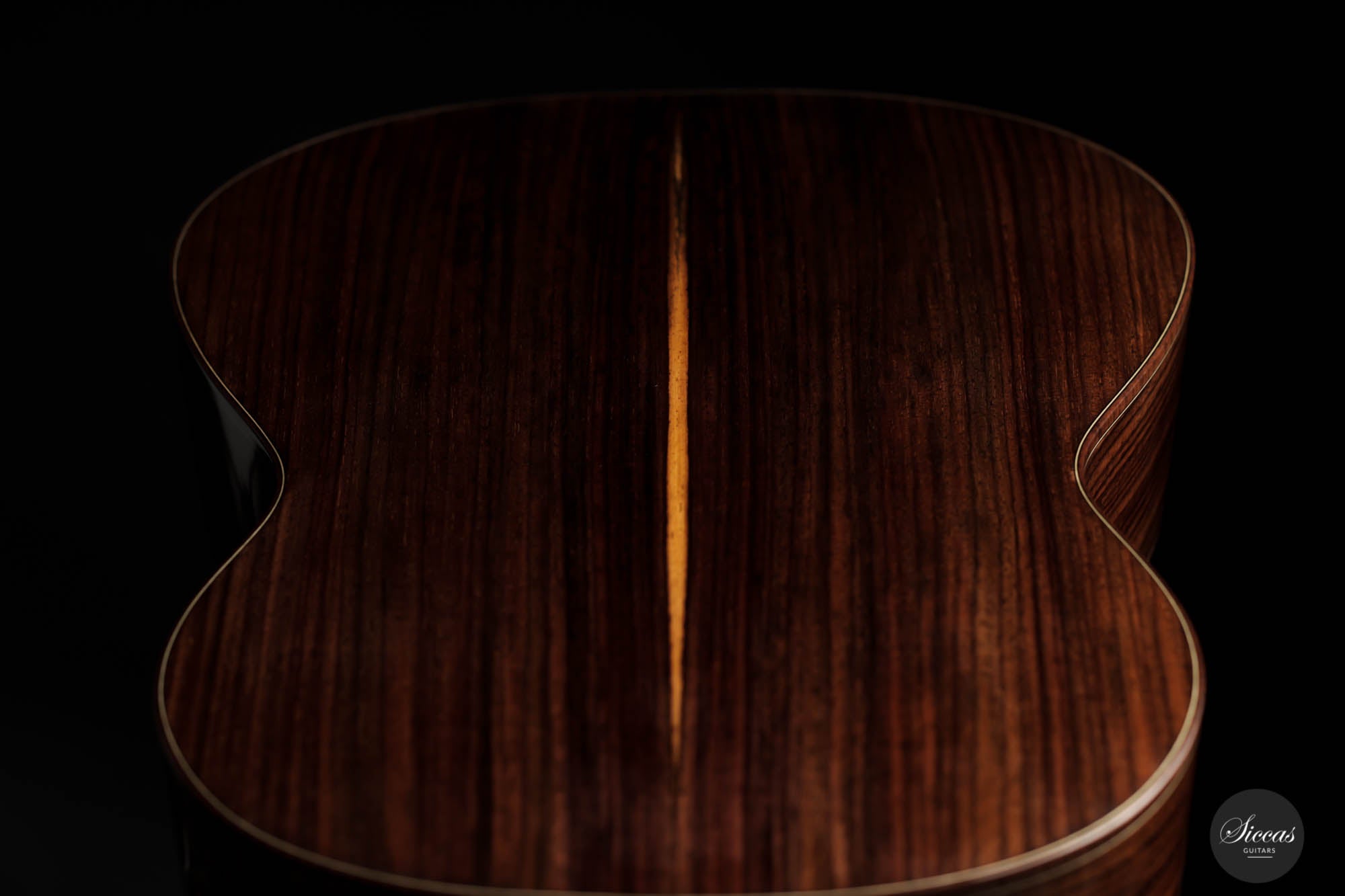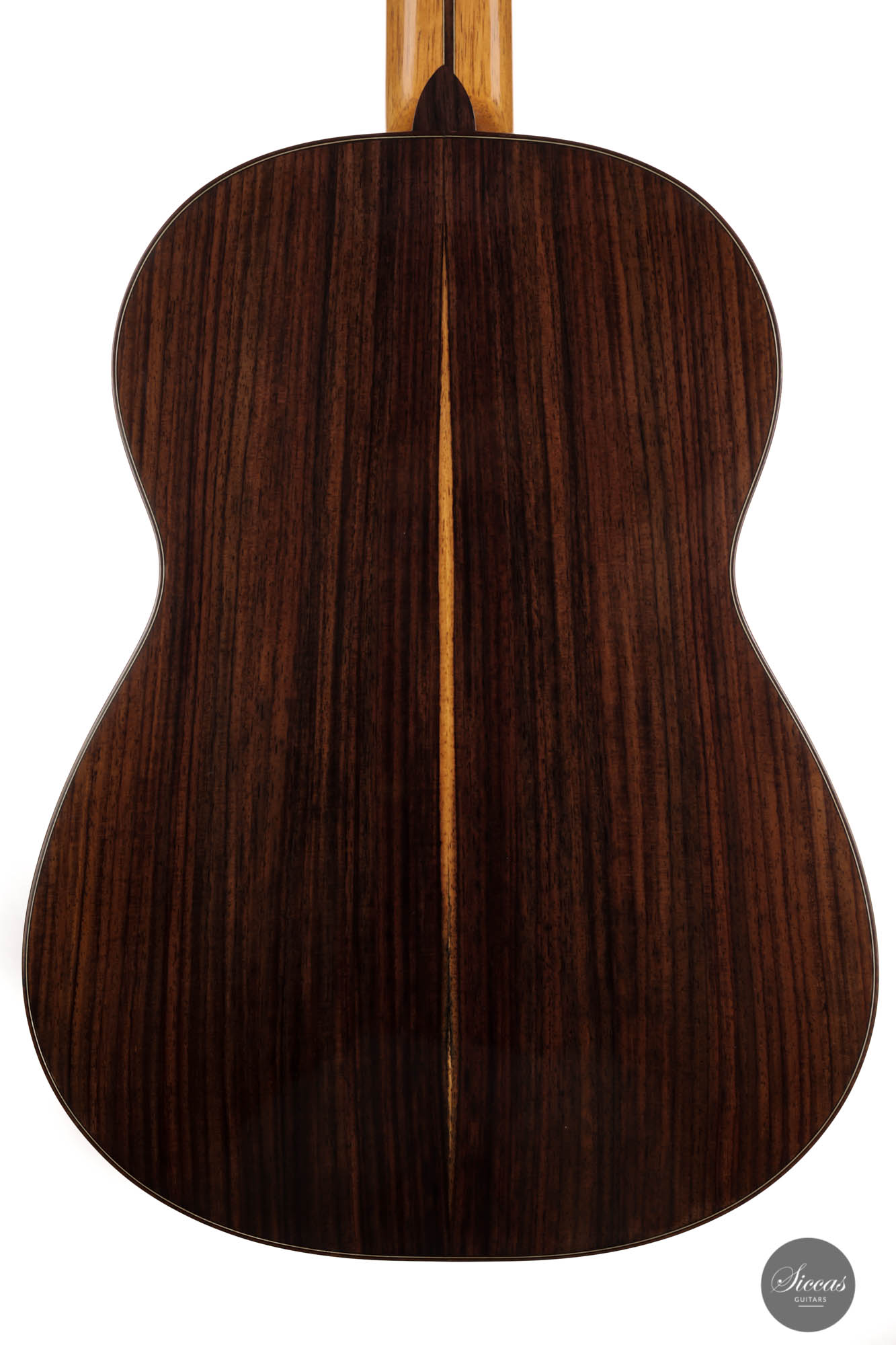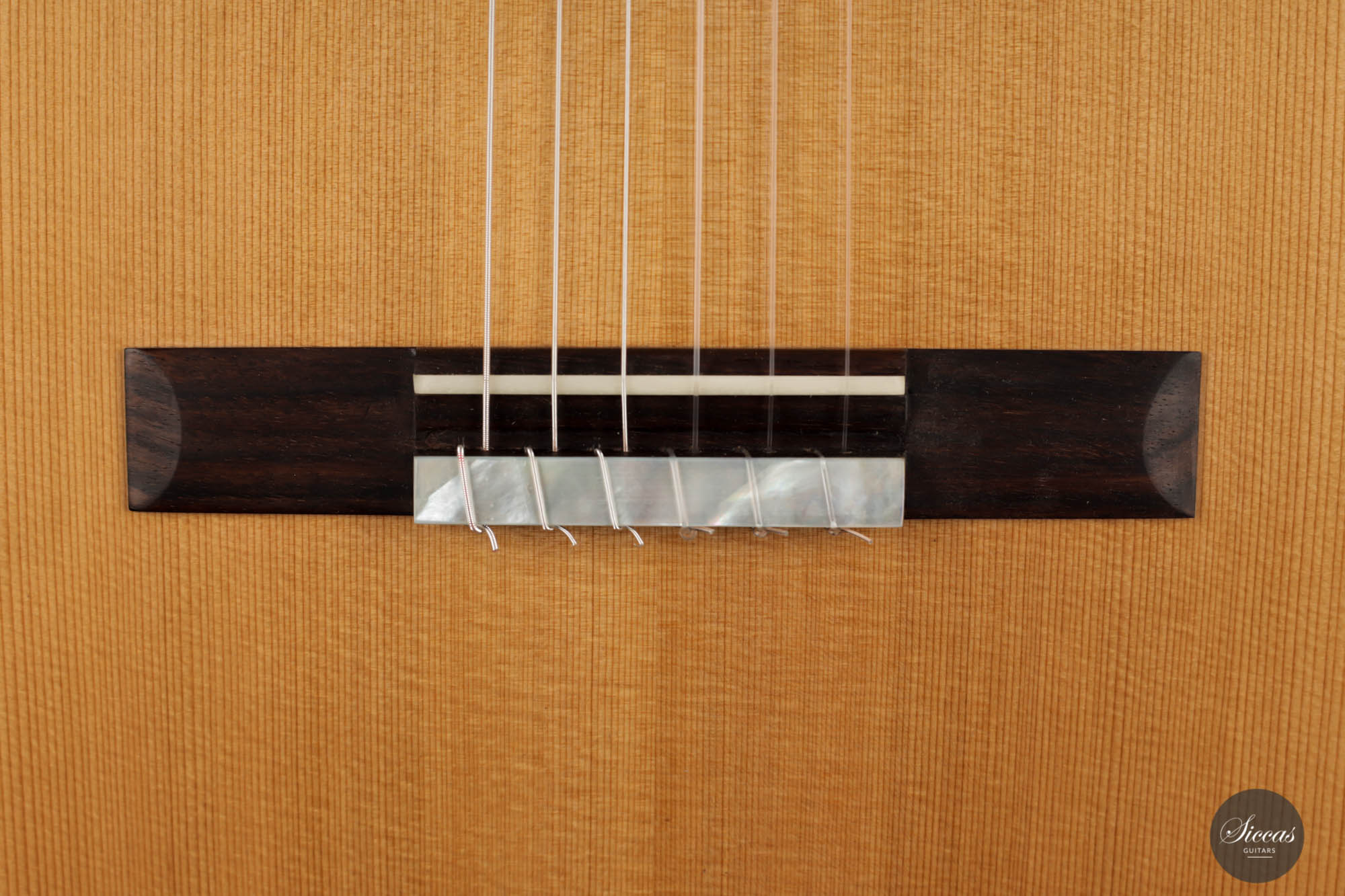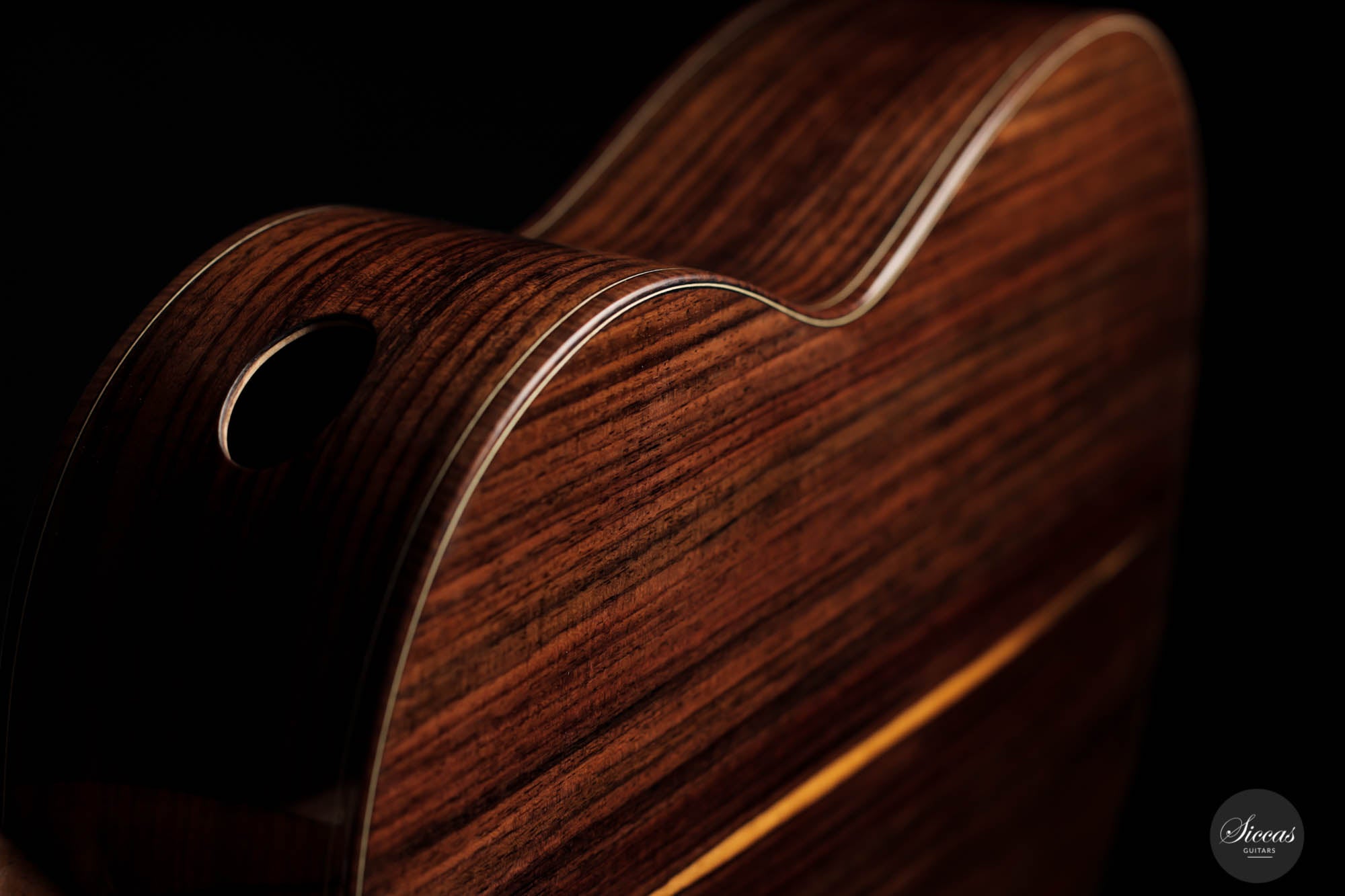 This guitar, named "Sophie", has a Canadian Western Red Cedar double top, with East Indian back and sides. The back and sides are doubled with Canadian Maple, increasing stability and producing more clarity in the sound. The bindings are made of Flamed Katalox, which is enhanced by the French Polished shellac finish. The sound is mighty, with great separation, clarity, and balance. Thanks to the fantastic playability offered by the comfortable neck, this guitar plays by itself and makes left-hand gymnastics effortless. Sophie has a 650 mm scale length, a 53mm nut, and Gotoh Premium Tuners