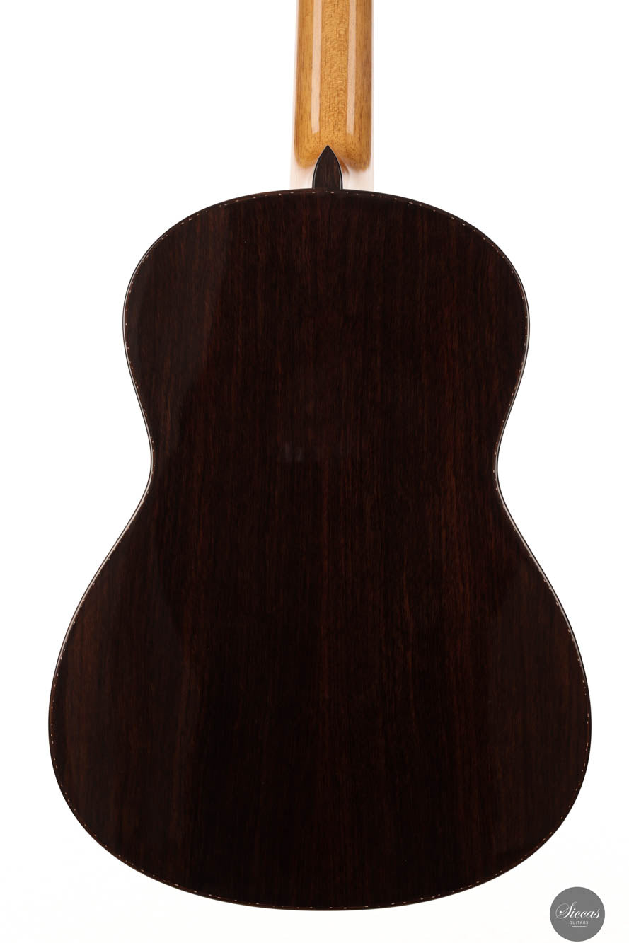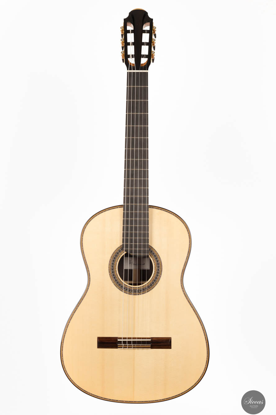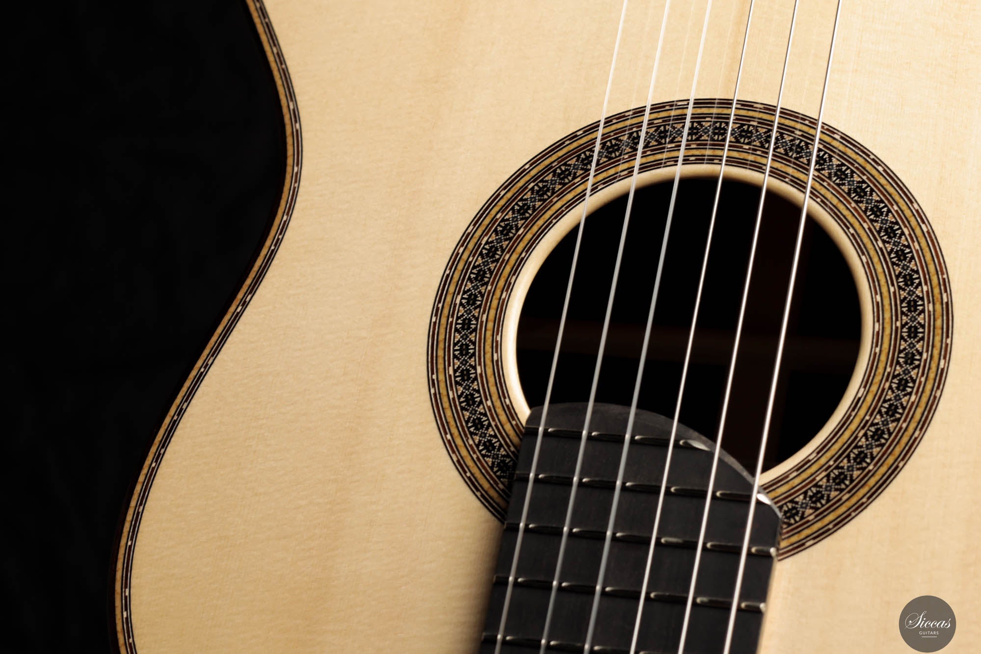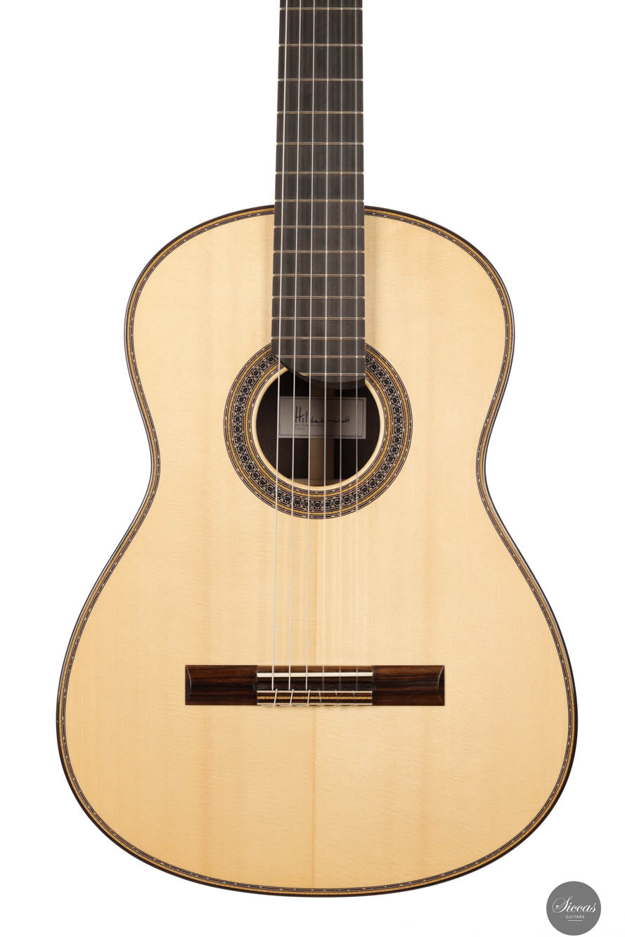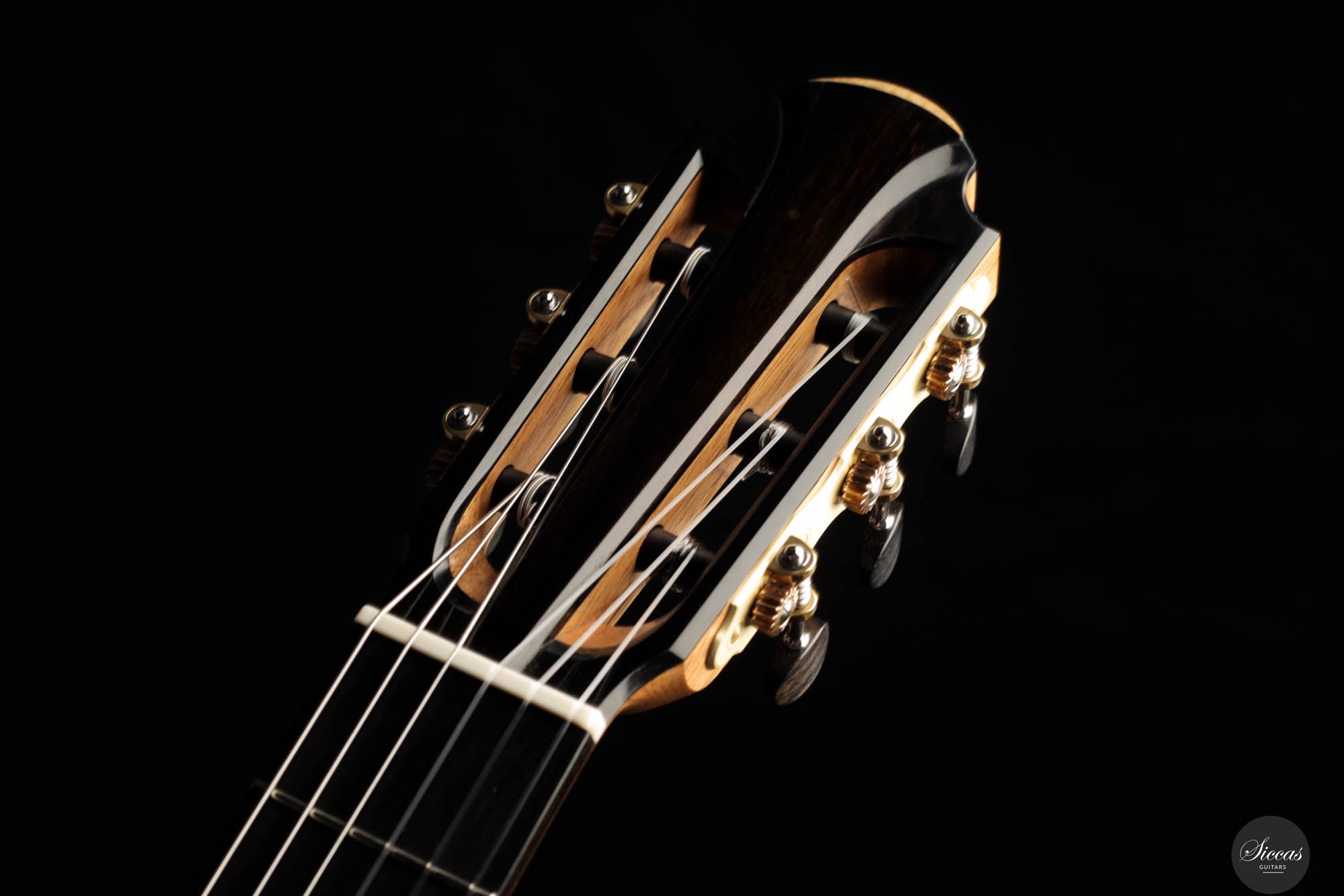 Die Gitarre Nr. 13, das Schwesterinstrument zur Nr. 14, teilt fast identische ästhetische Merkmale mit ihrem Gegenstück, wunderschön gefertigt, um sich in jedem sichtbaren Aspekt zu spiegeln. Der wahre Unterschied liegt unter der Oberfläche, wo der Gitarrenbauer Paul die Dicke der Decke variiert hat, eine experimentelle Berührung, die darauf abzielt, die akustischen Eigenschaften jeder Gitarre subtil zu beeinflussen. Diese akribische Aufmerksamkeit für Details ist Teil eines breiteren Engagements, das höchste Niveau an Handwerkskunst zu erreichen, wobei jedes Element fein auf Perfektion abgestimmt ist. Für diejenigen, die an den Einzelheiten dieser Variationen interessiert sind, bietet ein Interview mit Paul tiefere Einblicke in seinen innovativen Ansatz und hebt die subtilen, aber wirkungsvollen Unterschiede zwischen diesen beiden außergewöhnlichen Instrumenten hervor.Beide Gitarren gelten als Meisterwerke der Gitarrenbaukunst und bieten saubere und präzise akustische Qualitäten, die sie für eine breite Palette von Musikstilen geeignet machen. Die Klarheit des von diesen Instrumenten erzeugten Klangs ist besonders bemerkenswert und erleichtert die Aufführung komplexer polyphoner Werke. Diese Klarheit stellt sicher, dass jeder Ton deutlich artikuliert wird, was Musiker bei der Darstellung komplizierter musikalischer Passagen unterstützt. Ob in einer Soloaufführung oder innerhalb eines Ensembles, die Gitarren Nr. 13 und Nr. 14 bieten Musikern die Möglichkeit, ihre musikalische Vision mit Präzision zu vermitteln, und machen sie nicht nur zu Werkzeugen, sondern zu wahren Partnern im künstlerischen Prozess.