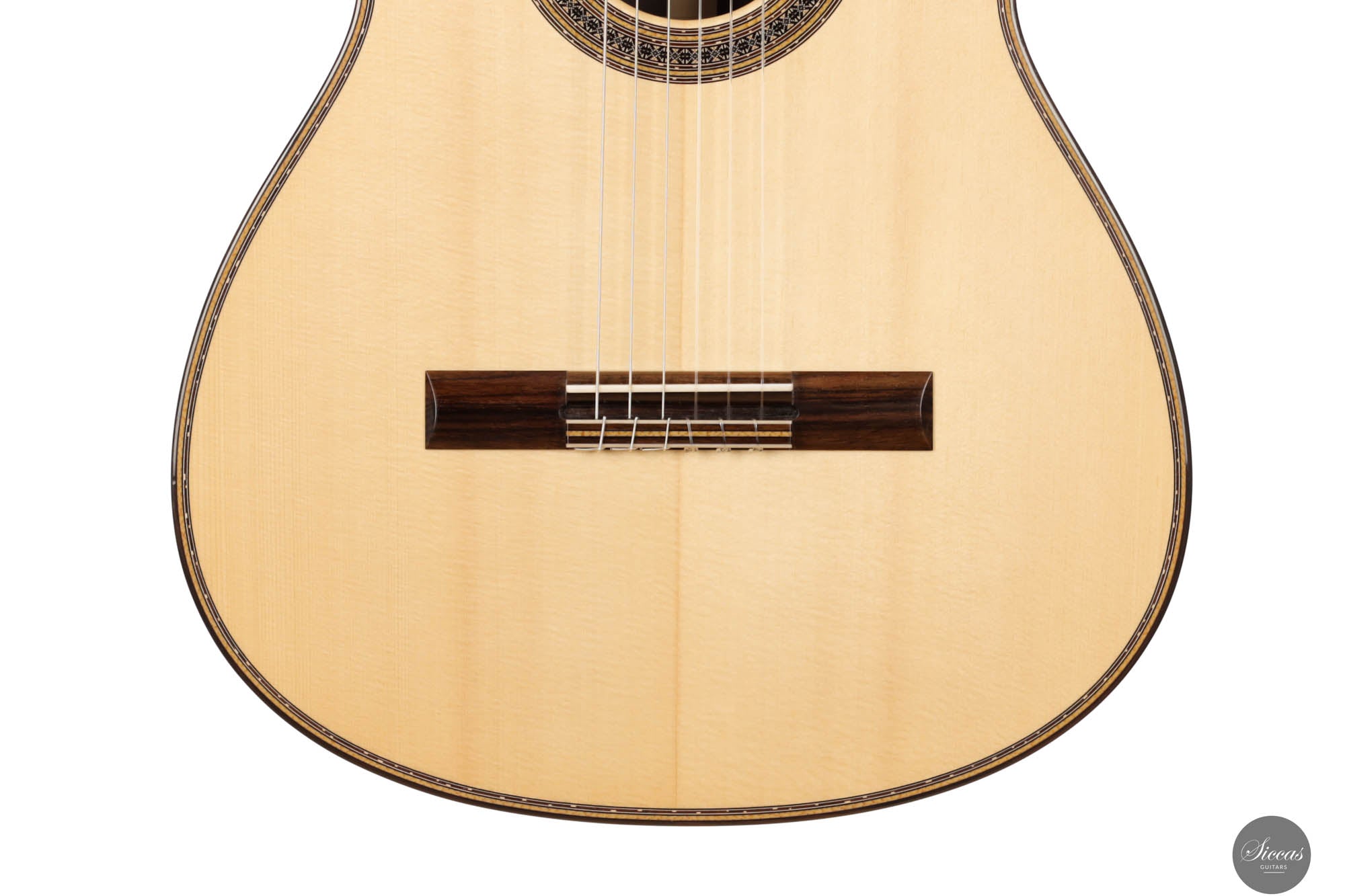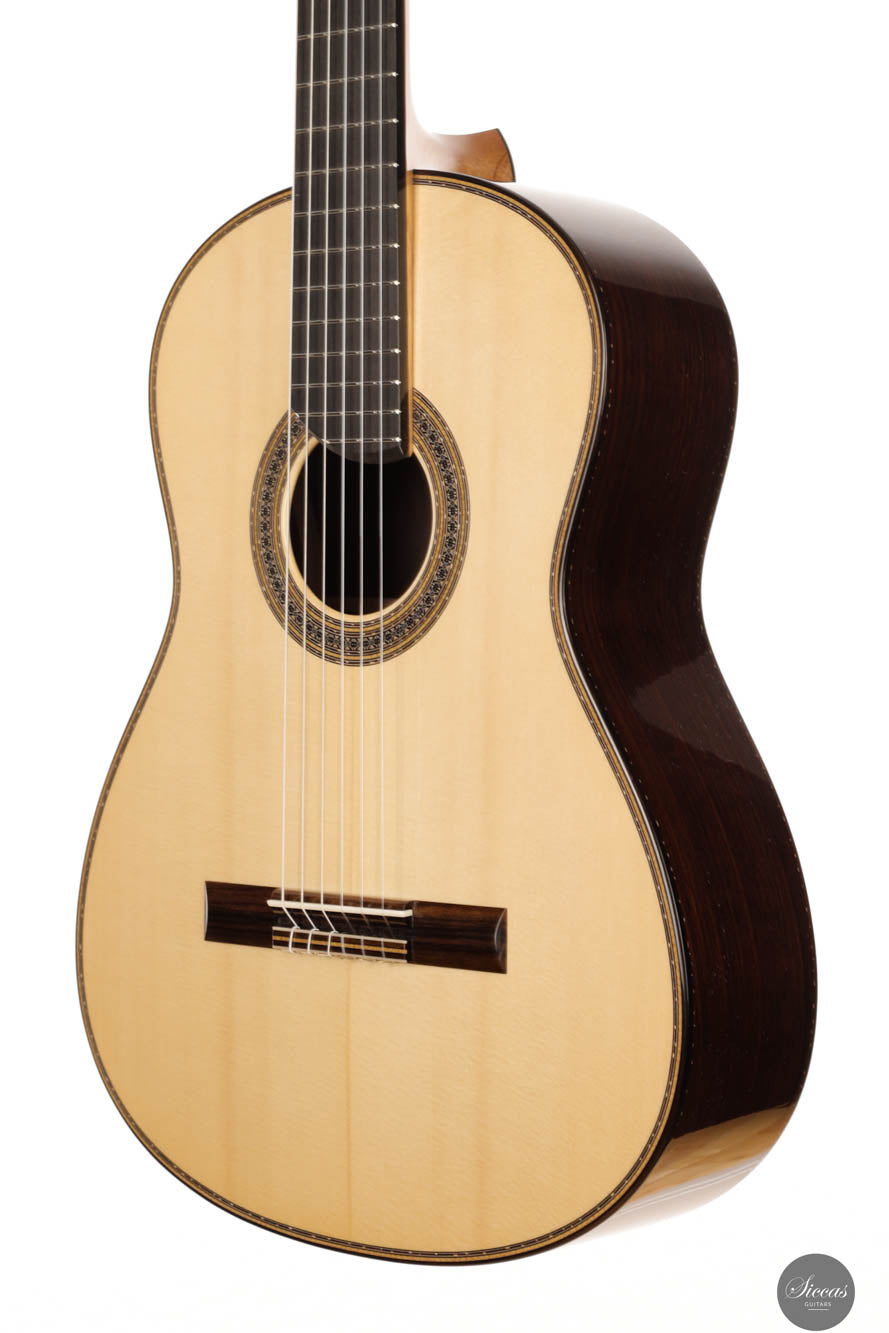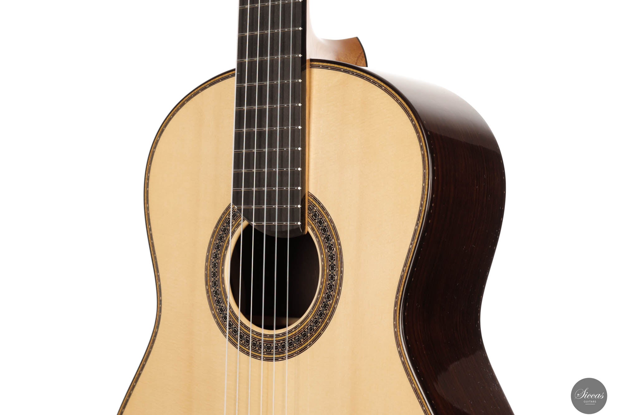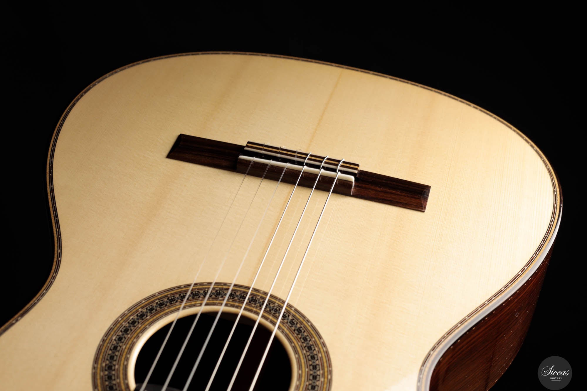 Die Gitarre Nr. 13, das Schwesterinstrument zur Nr. 14, teilt fast identische ästhetische Merkmale mit ihrem Gegenstück, wunderschön gefertigt, um sich in jedem sichtbaren Aspekt zu spiegeln. Der wahre Unterschied liegt unter der Oberfläche, wo der Gitarrenbauer Paul die Dicke der Decke variiert hat, eine experimentelle Berührung, die darauf abzielt, die akustischen Eigenschaften jeder Gitarre subtil zu beeinflussen. Diese akribische Aufmerksamkeit für Details ist Teil eines breiteren Engagements, das höchste Niveau an Handwerkskunst zu erreichen, wobei jedes Element fein auf Perfektion abgestimmt ist. Für diejenigen, die an den Einzelheiten dieser Variationen interessiert sind, bietet ein Interview mit Paul tiefere Einblicke in seinen innovativen Ansatz und hebt die subtilen, aber wirkungsvollen Unterschiede zwischen diesen beiden außergewöhnlichen Instrumenten hervor.Beide Gitarren gelten als Meisterwerke der Gitarrenbaukunst und bieten saubere und präzise akustische Qualitäten, die sie für eine breite Palette von Musikstilen geeignet machen. Die Klarheit des von diesen Instrumenten erzeugten Klangs ist besonders bemerkenswert und erleichtert die Aufführung komplexer polyphoner Werke. Diese Klarheit stellt sicher, dass jeder Ton deutlich artikuliert wird, was Musiker bei der Darstellung komplizierter musikalischer Passagen unterstützt. Ob in einer Soloaufführung oder innerhalb eines Ensembles, die Gitarren Nr. 13 und Nr. 14 bieten Musikern die Möglichkeit, ihre musikalische Vision mit Präzision zu vermitteln, und machen sie nicht nur zu Werkzeugen, sondern zu wahren Partnern im künstlerischen Prozess.