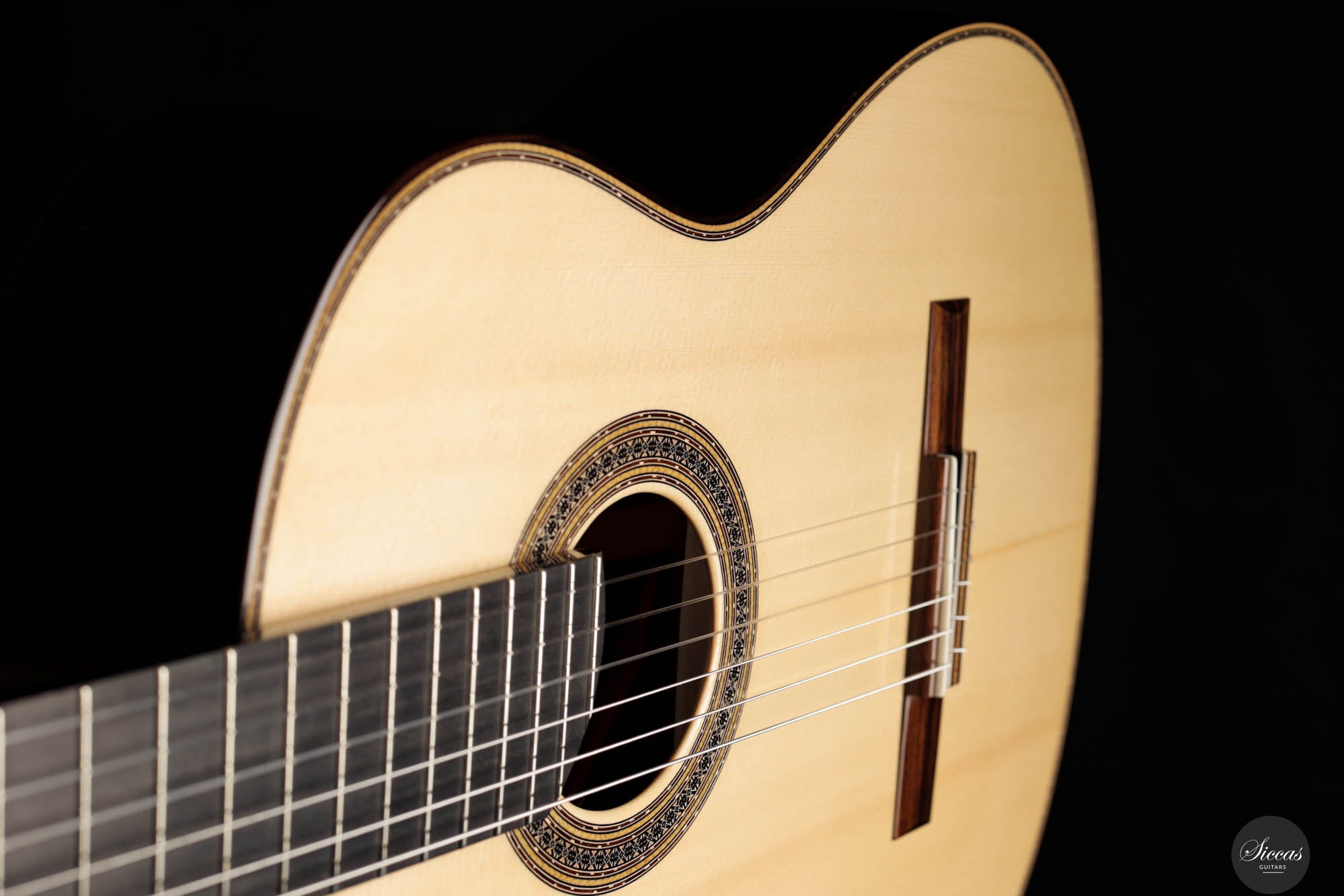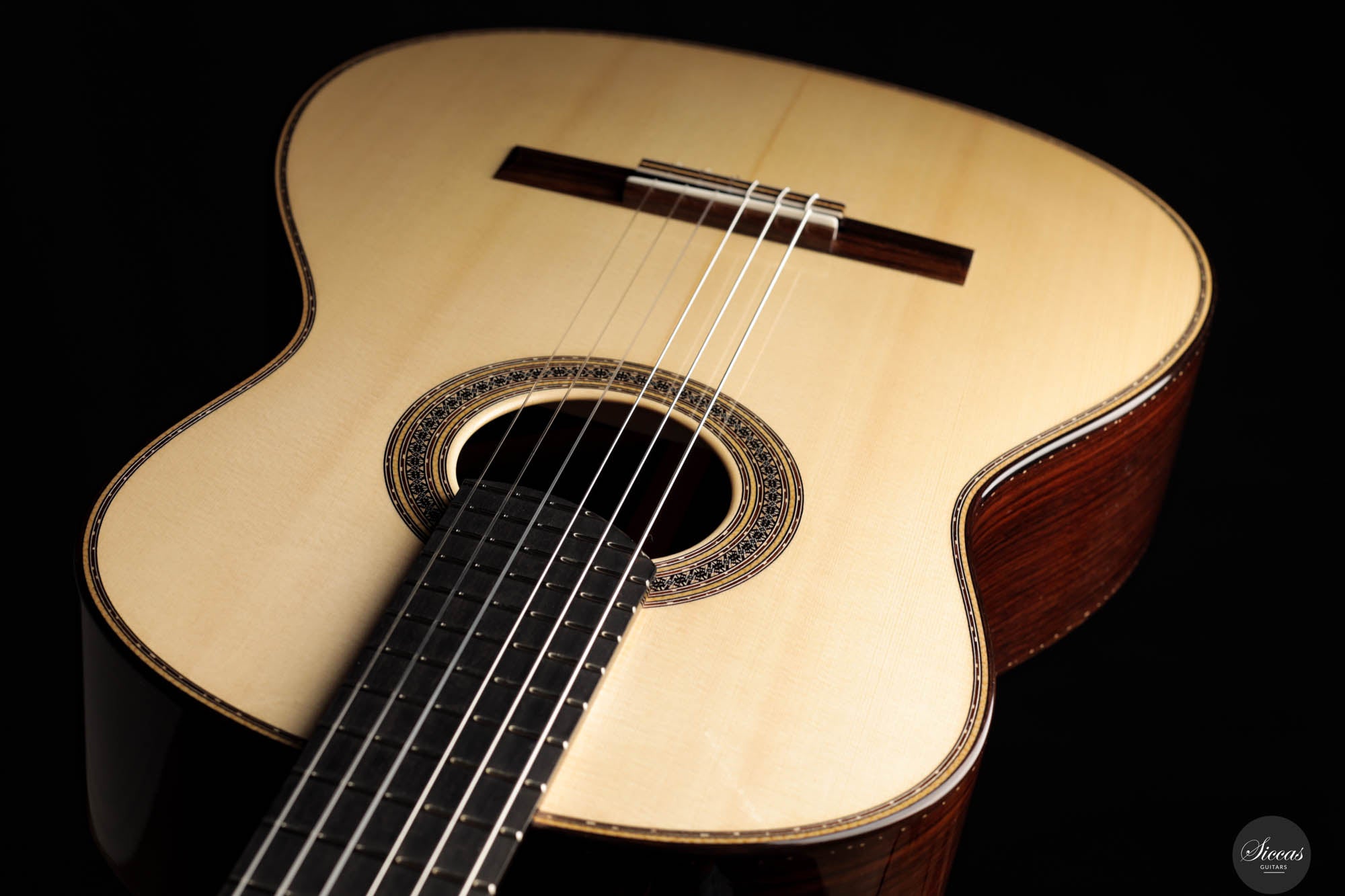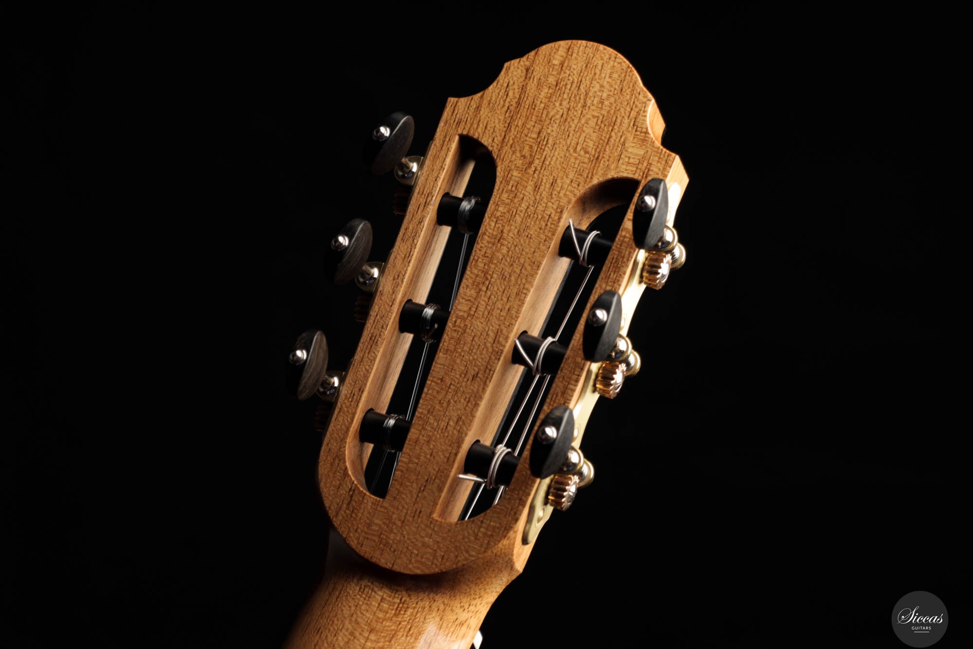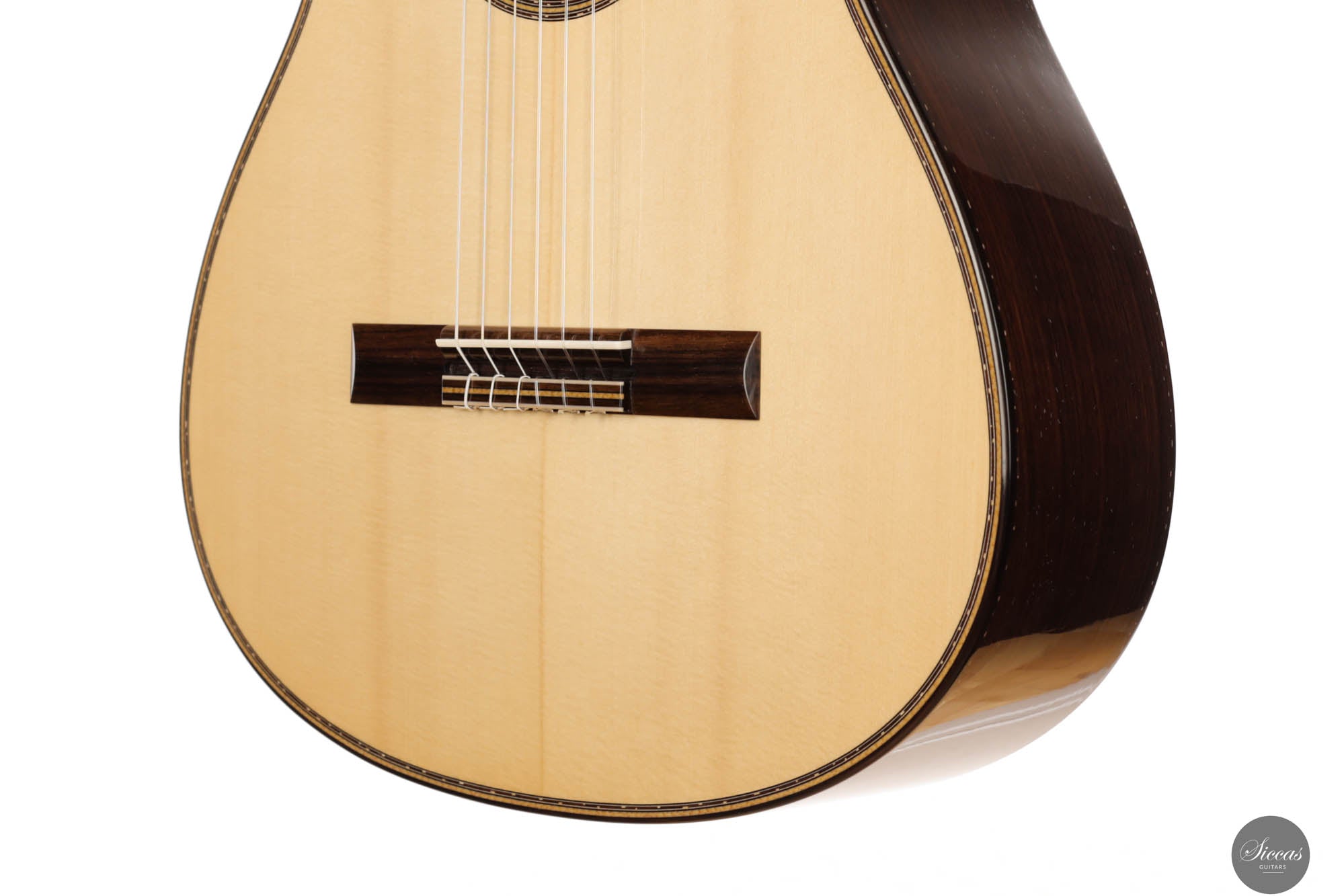 Die Gitarre Nr. 13, das Schwesterinstrument zur Nr. 14, teilt fast identische ästhetische Merkmale mit ihrem Gegenstück, wunderschön gefertigt, um sich in jedem sichtbaren Aspekt zu spiegeln. Der wahre Unterschied liegt unter der Oberfläche, wo der Gitarrenbauer Paul die Dicke der Decke variiert hat, eine experimentelle Berührung, die darauf abzielt, die akustischen Eigenschaften jeder Gitarre subtil zu beeinflussen. Diese akribische Aufmerksamkeit für Details ist Teil eines breiteren Engagements, das höchste Niveau an Handwerkskunst zu erreichen, wobei jedes Element fein auf Perfektion abgestimmt ist. Für diejenigen, die an den Einzelheiten dieser Variationen interessiert sind, bietet ein Interview mit Paul tiefere Einblicke in seinen innovativen Ansatz und hebt die subtilen, aber wirkungsvollen Unterschiede zwischen diesen beiden außergewöhnlichen Instrumenten hervor.Beide Gitarren gelten als Meisterwerke der Gitarrenbaukunst und bieten saubere und präzise akustische Qualitäten, die sie für eine breite Palette von Musikstilen geeignet machen. Die Klarheit des von diesen Instrumenten erzeugten Klangs ist besonders bemerkenswert und erleichtert die Aufführung komplexer polyphoner Werke. Diese Klarheit stellt sicher, dass jeder Ton deutlich artikuliert wird, was Musiker bei der Darstellung komplizierter musikalischer Passagen unterstützt. Ob in einer Soloaufführung oder innerhalb eines Ensembles, die Gitarren Nr. 13 und Nr. 14 bieten Musikern die Möglichkeit, ihre musikalische Vision mit Präzision zu vermitteln, und machen sie nicht nur zu Werkzeugen, sondern zu wahren Partnern im künstlerischen Prozess.
