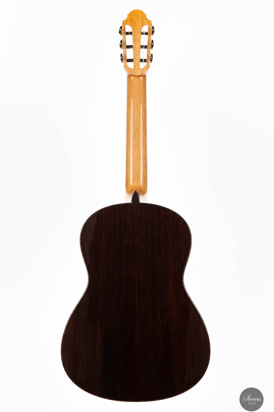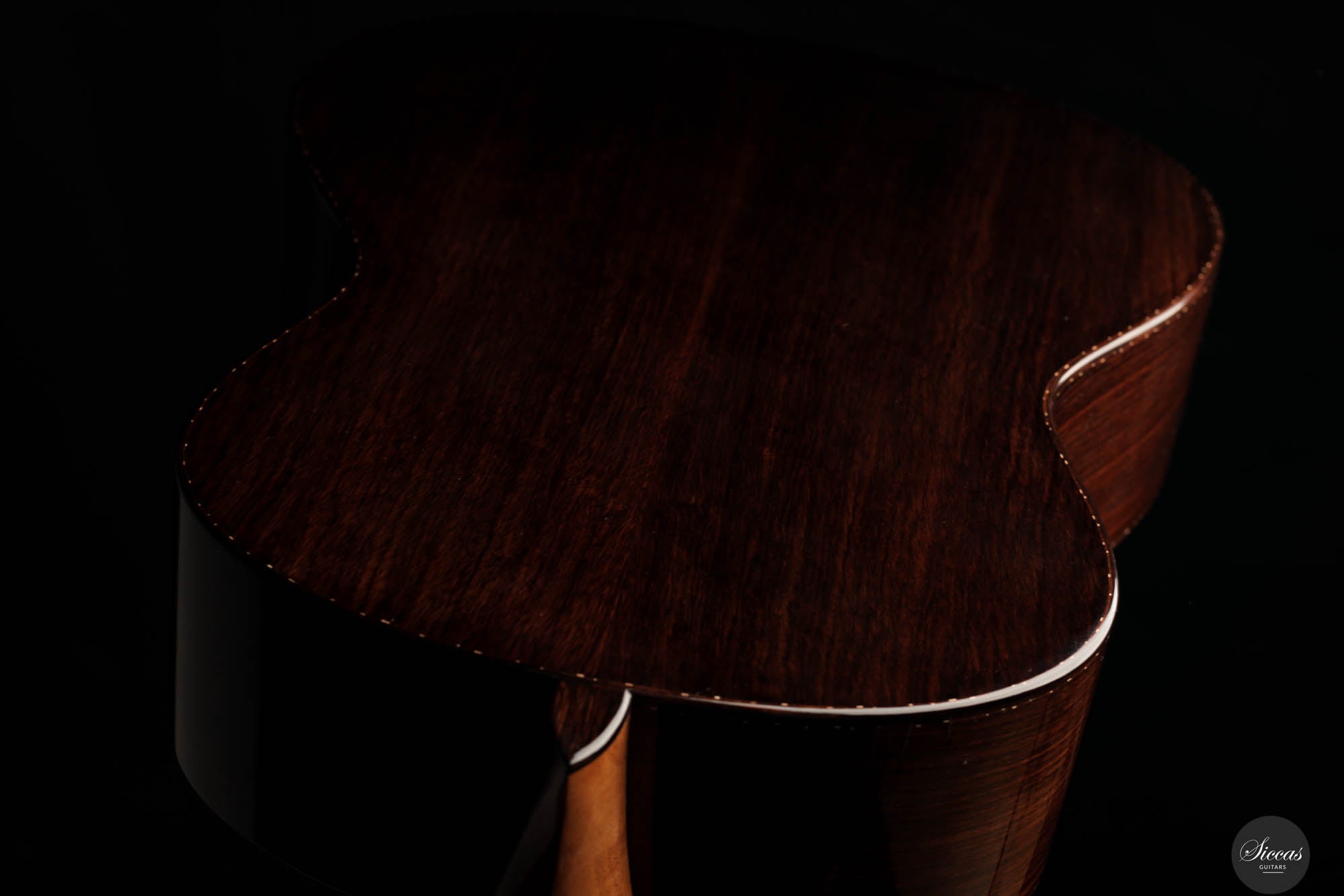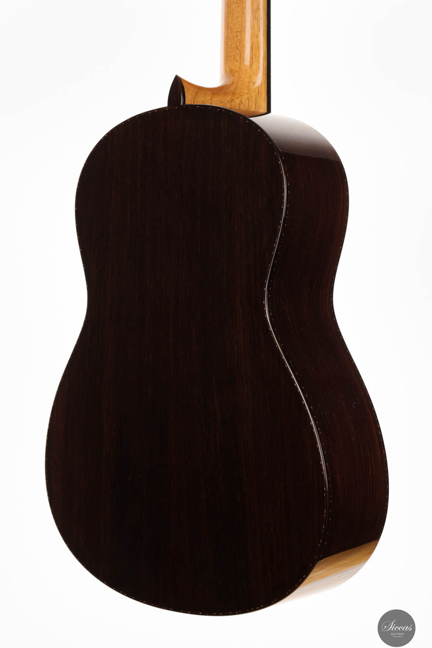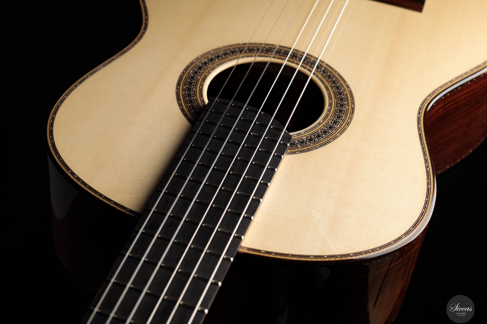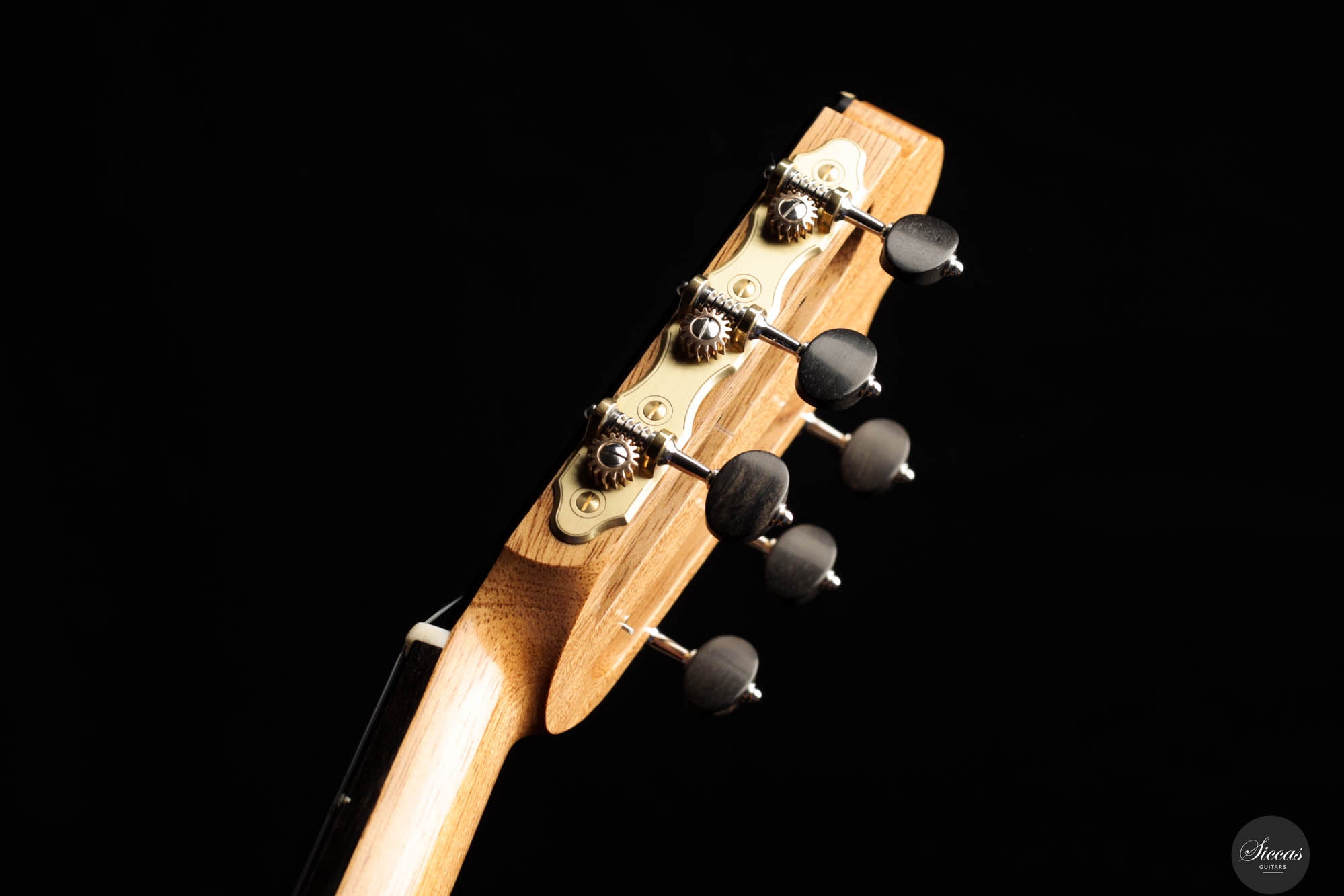 Die Gitarre Nr. 13, das Schwesterinstrument zur Nr. 14, teilt fast identische ästhetische Merkmale mit ihrem Gegenstück, wunderschön gefertigt, um sich in jedem sichtbaren Aspekt zu spiegeln. Der wahre Unterschied liegt unter der Oberfläche, wo der Gitarrenbauer Paul die Dicke der Decke variiert hat, eine experimentelle Berührung, die darauf abzielt, die akustischen Eigenschaften jeder Gitarre subtil zu beeinflussen. Diese akribische Aufmerksamkeit für Details ist Teil eines breiteren Engagements, das höchste Niveau an Handwerkskunst zu erreichen, wobei jedes Element fein auf Perfektion abgestimmt ist. Für diejenigen, die an den Einzelheiten dieser Variationen interessiert sind, bietet ein Interview mit Paul tiefere Einblicke in seinen innovativen Ansatz und hebt die subtilen, aber wirkungsvollen Unterschiede zwischen diesen beiden außergewöhnlichen Instrumenten hervor.Beide Gitarren gelten als Meisterwerke der Gitarrenbaukunst und bieten saubere und präzise akustische Qualitäten, die sie für eine breite Palette von Musikstilen geeignet machen. Die Klarheit des von diesen Instrumenten erzeugten Klangs ist besonders bemerkenswert und erleichtert die Aufführung komplexer polyphoner Werke. Diese Klarheit stellt sicher, dass jeder Ton deutlich artikuliert wird, was Musiker bei der Darstellung komplizierter musikalischer Passagen unterstützt. Ob in einer Soloaufführung oder innerhalb eines Ensembles, die Gitarren Nr. 13 und Nr. 14 bieten Musikern die Möglichkeit, ihre musikalische Vision mit Präzision zu vermitteln, und machen sie nicht nur zu Werkzeugen, sondern zu wahren Partnern im künstlerischen Prozess.