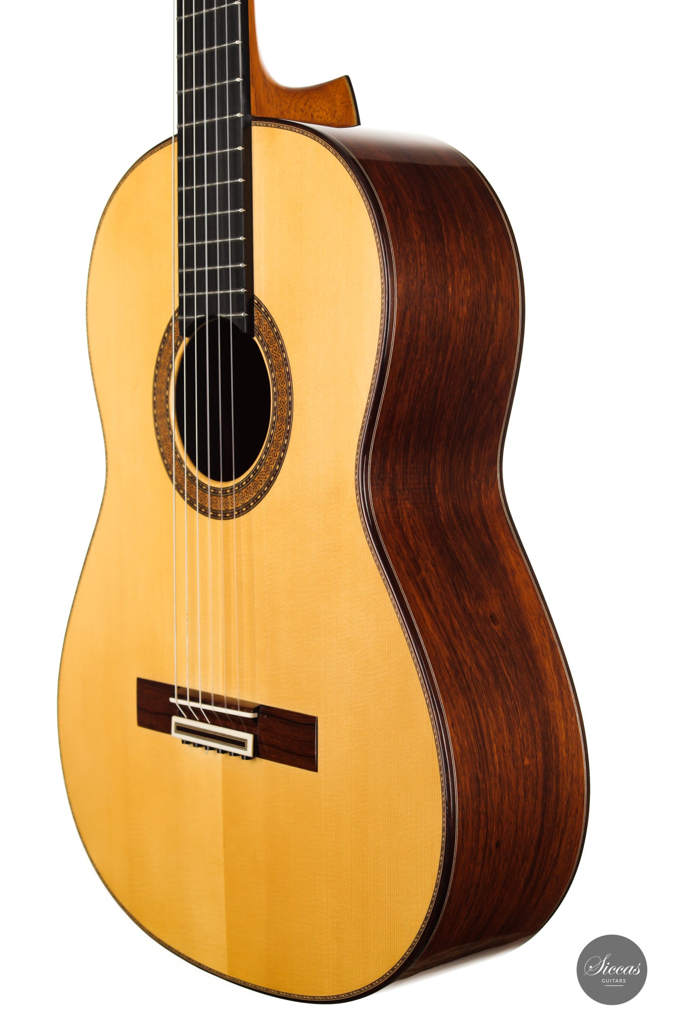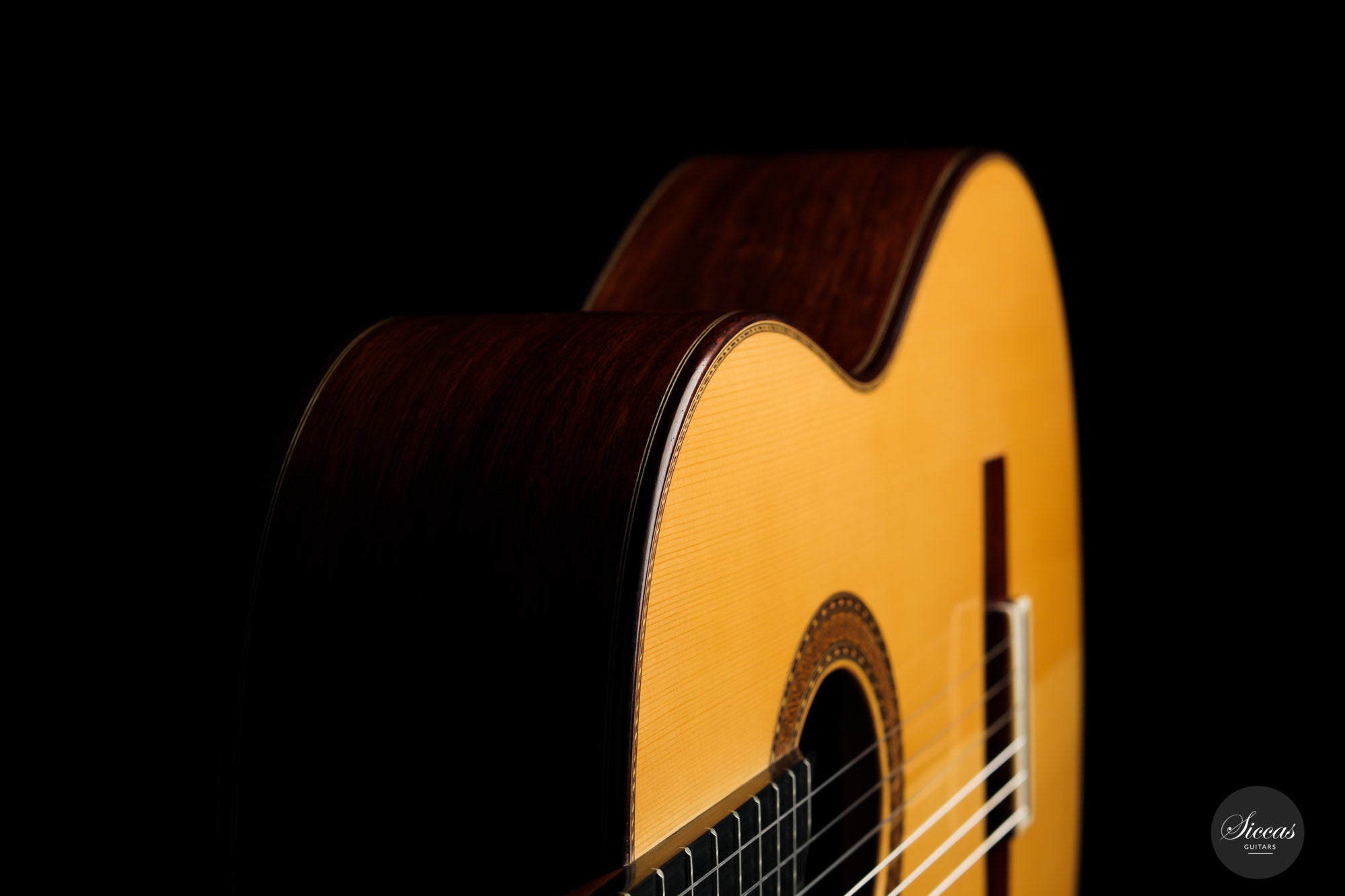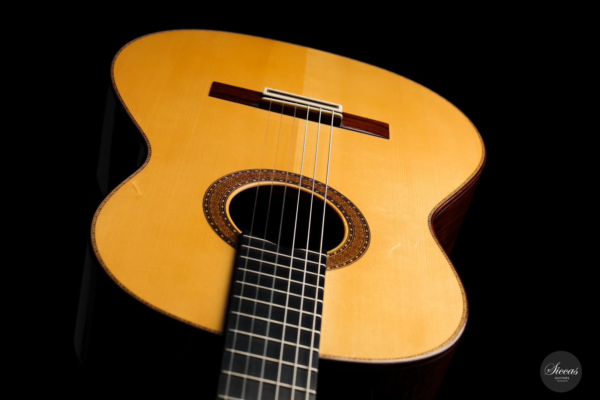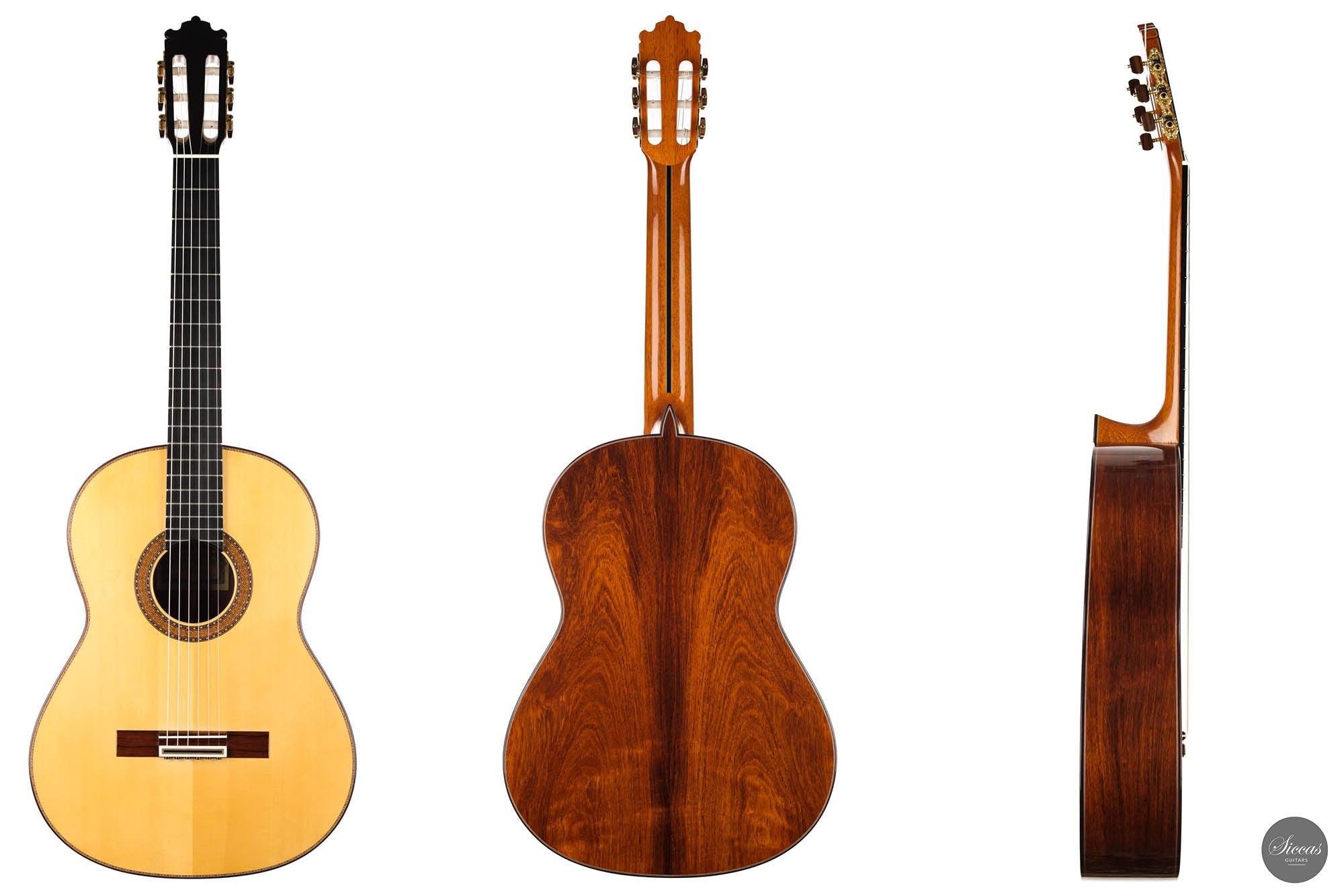 The ”Concierto” model is one of the most representative models of Paulino Bernabé. It is part of the “P.B.” models, the most prestigious line built by the master, and stands out thanks to its single sides made of 15 years old Granadillo. This 2017 guitar is a great opportunity to acquire a high-quality concert guitar at an attractive price. With a perfectly repaired crack on the back, and a few playing marks on the top, this guitar’s price was sensibly chosen to make it accessible to a guitarist seeking for an authentic Spanish sound at a reasonable budget. It already has a fully open sound with endless sustain and rich overtones.