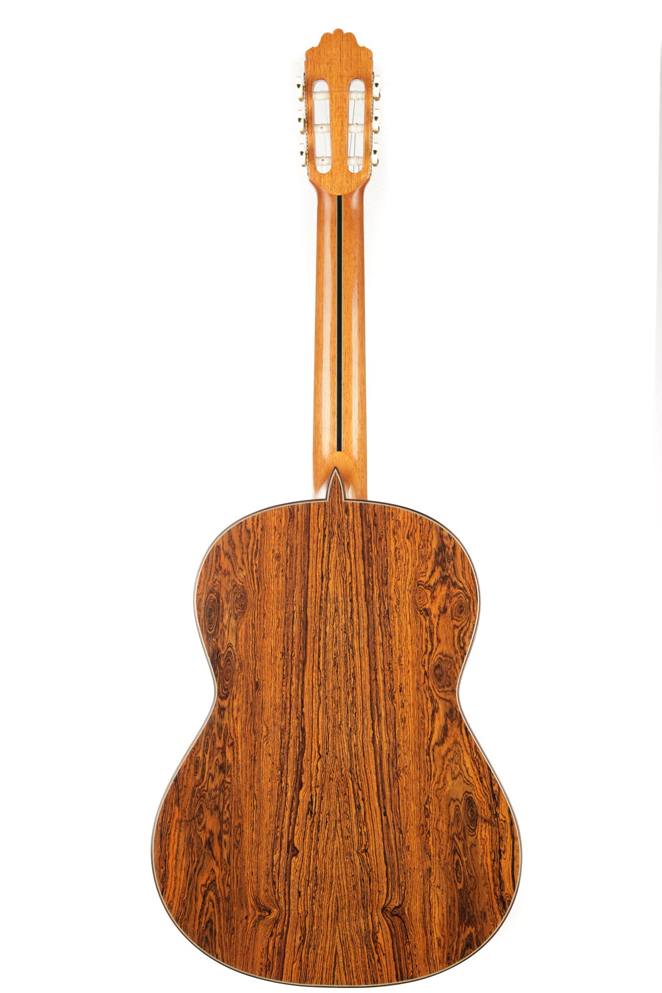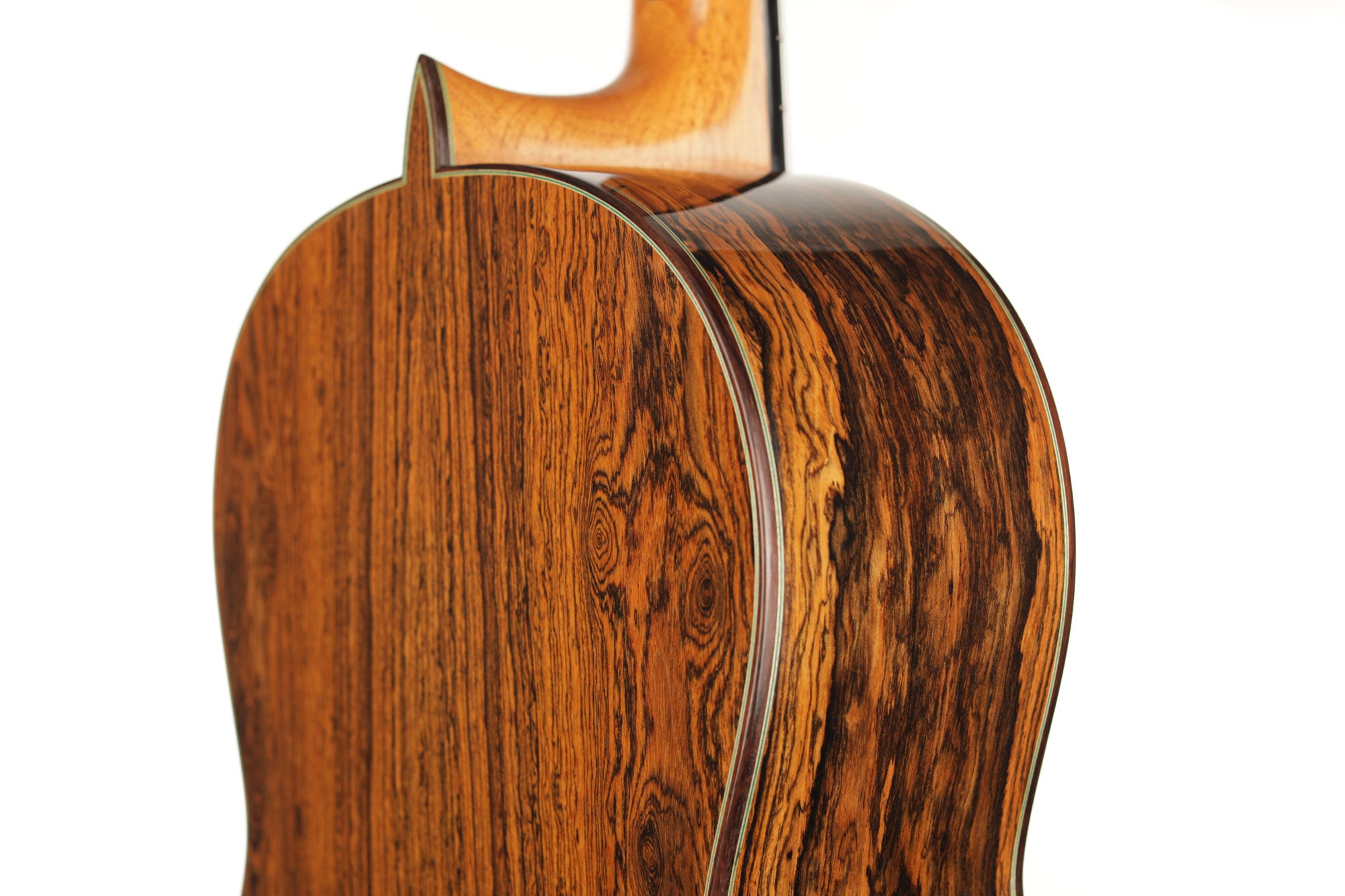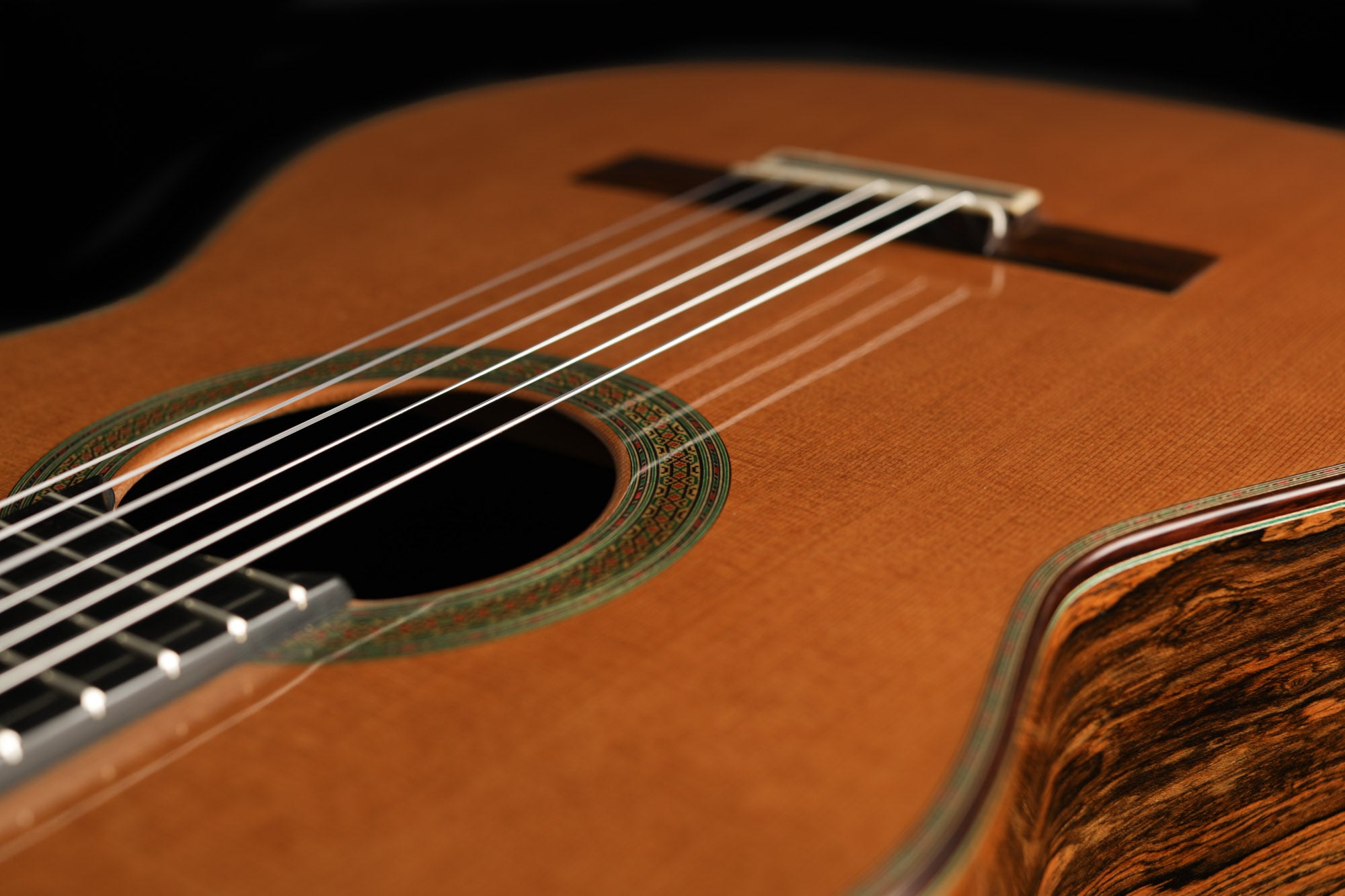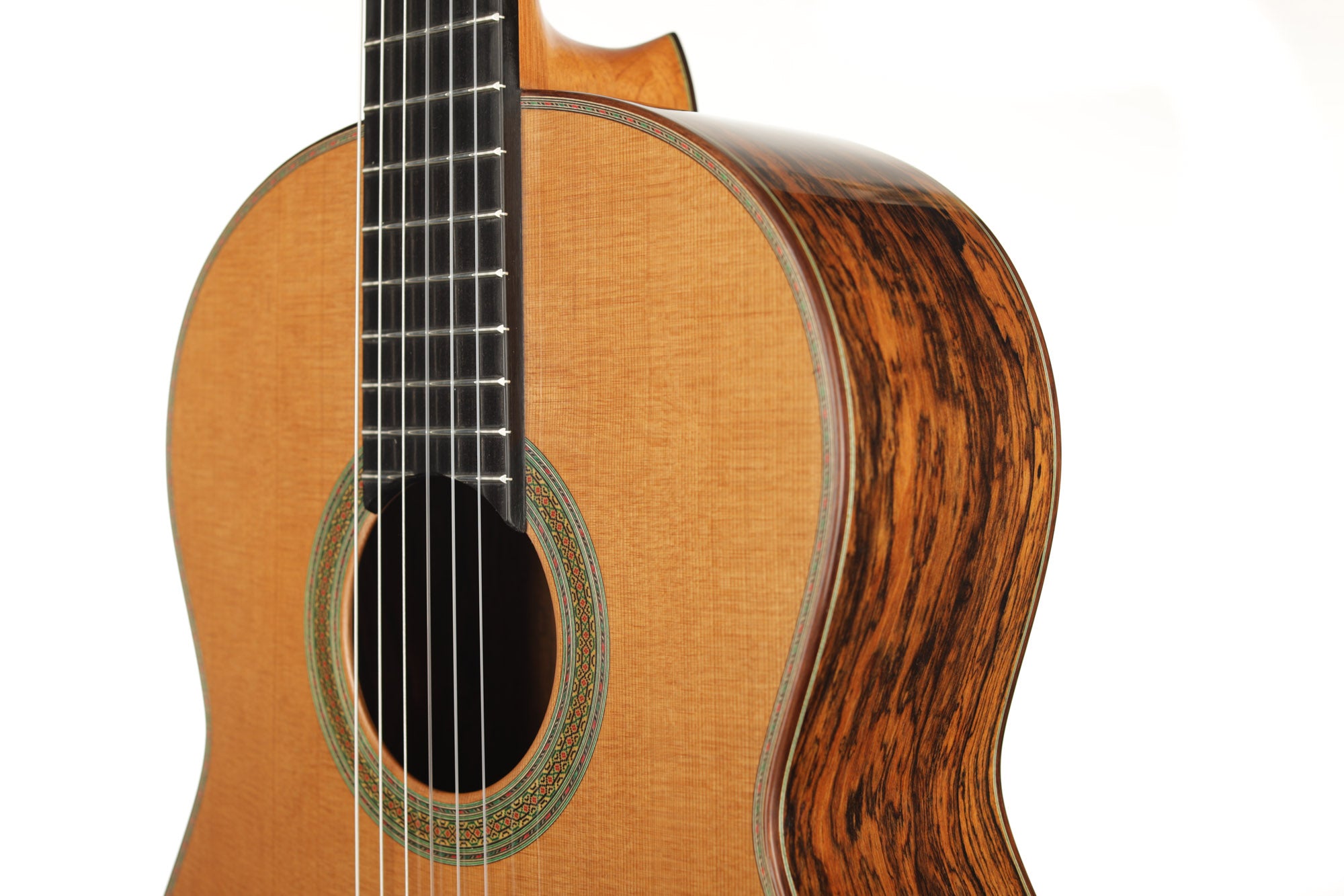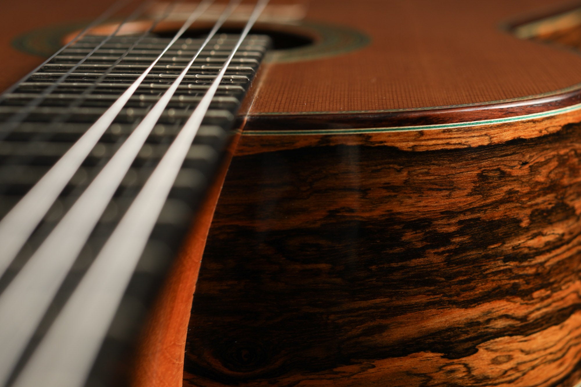 The Model 50 from Bernabe offers a variety of intriguing qualities. Stunning woods combined with an excellent craftsmanship result in an overall inspiring guitar. The curly grain of the Bocote rosewood is an absolute eye-catcher. Creamy smooth trebles with a lyrical Spanish sense mixed with the strong fundamental basses capture the perfect mix between a modern guitar and a traditional tone. The volume is pleasant and plenty for any required situation, Bernabe’s guitars are always easy to play and have a smooth setup. When playing on this guitar you immediately notice how responsive it is, the cedar top creates angelic overtones that fill a room with a beautiful shimmer.