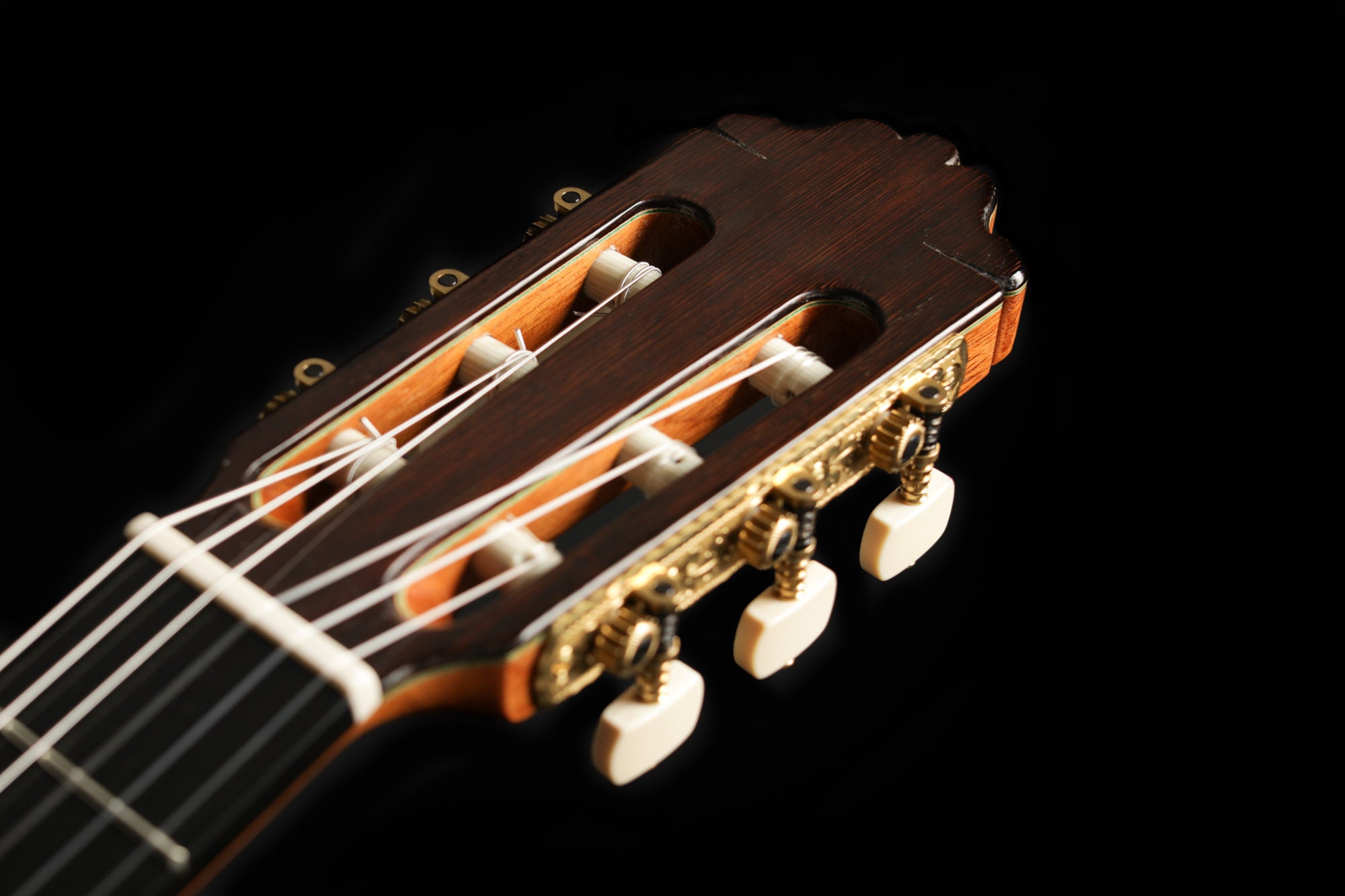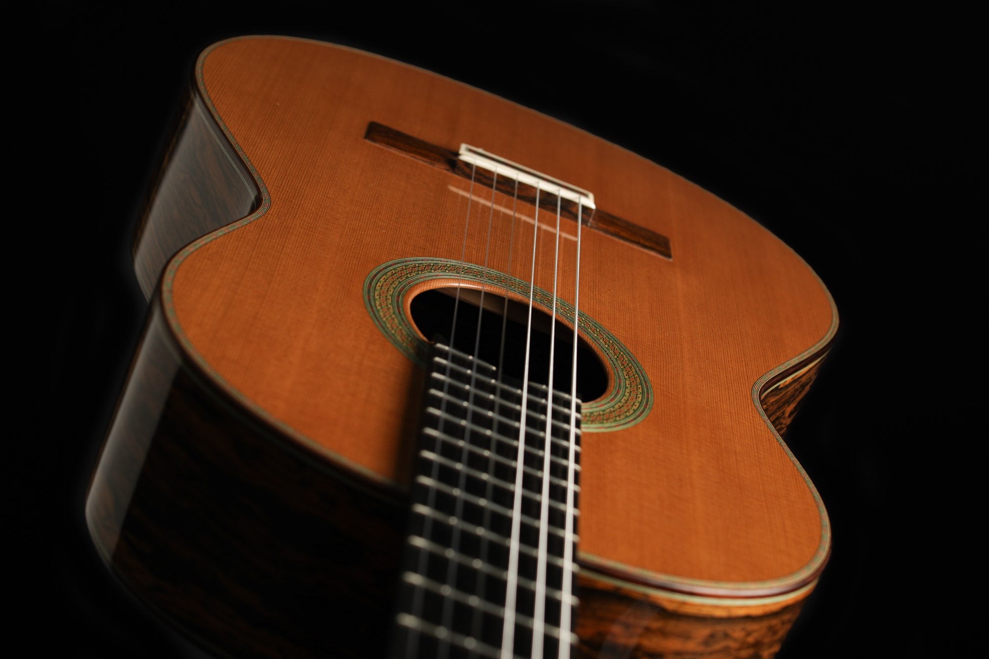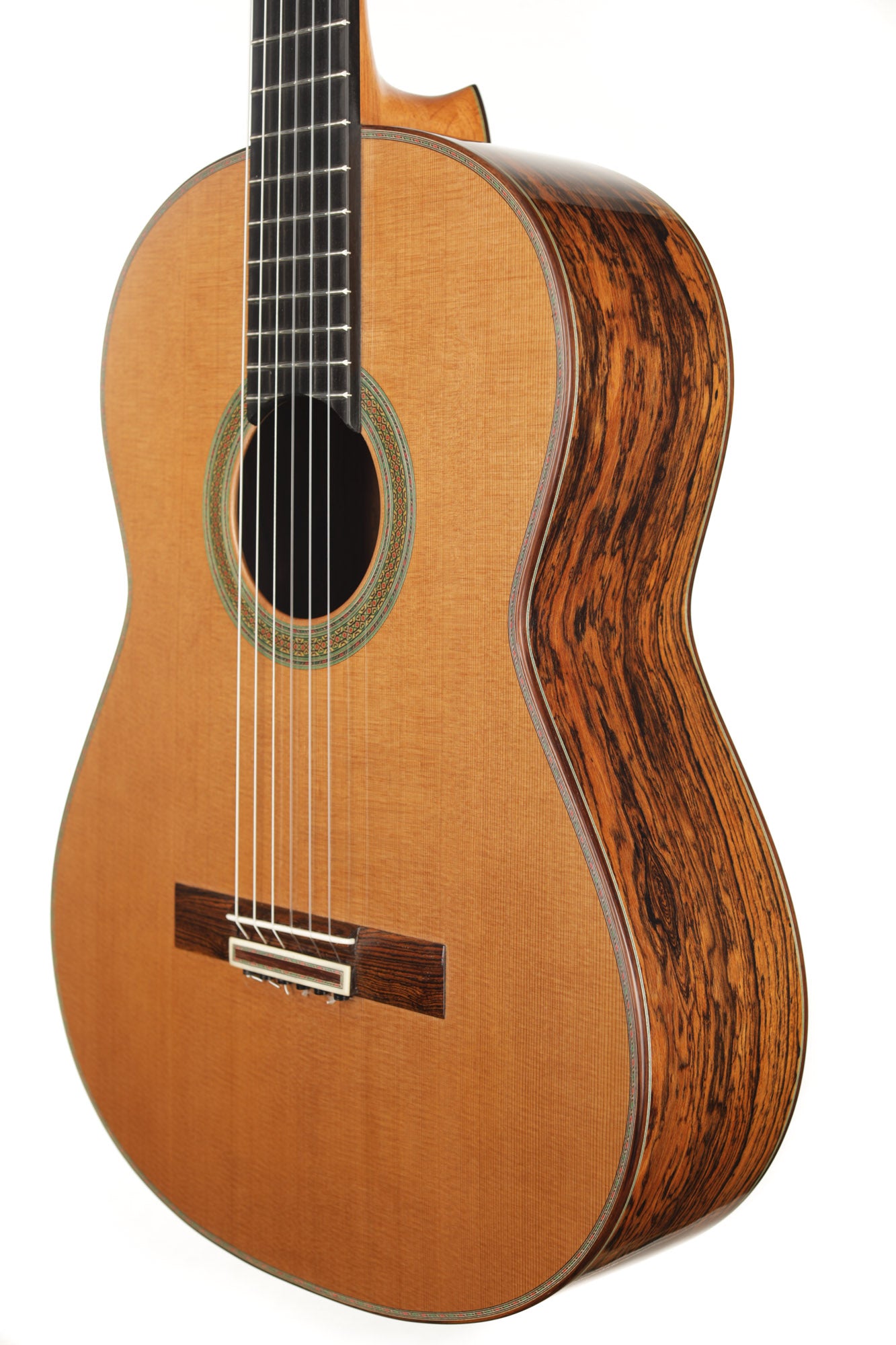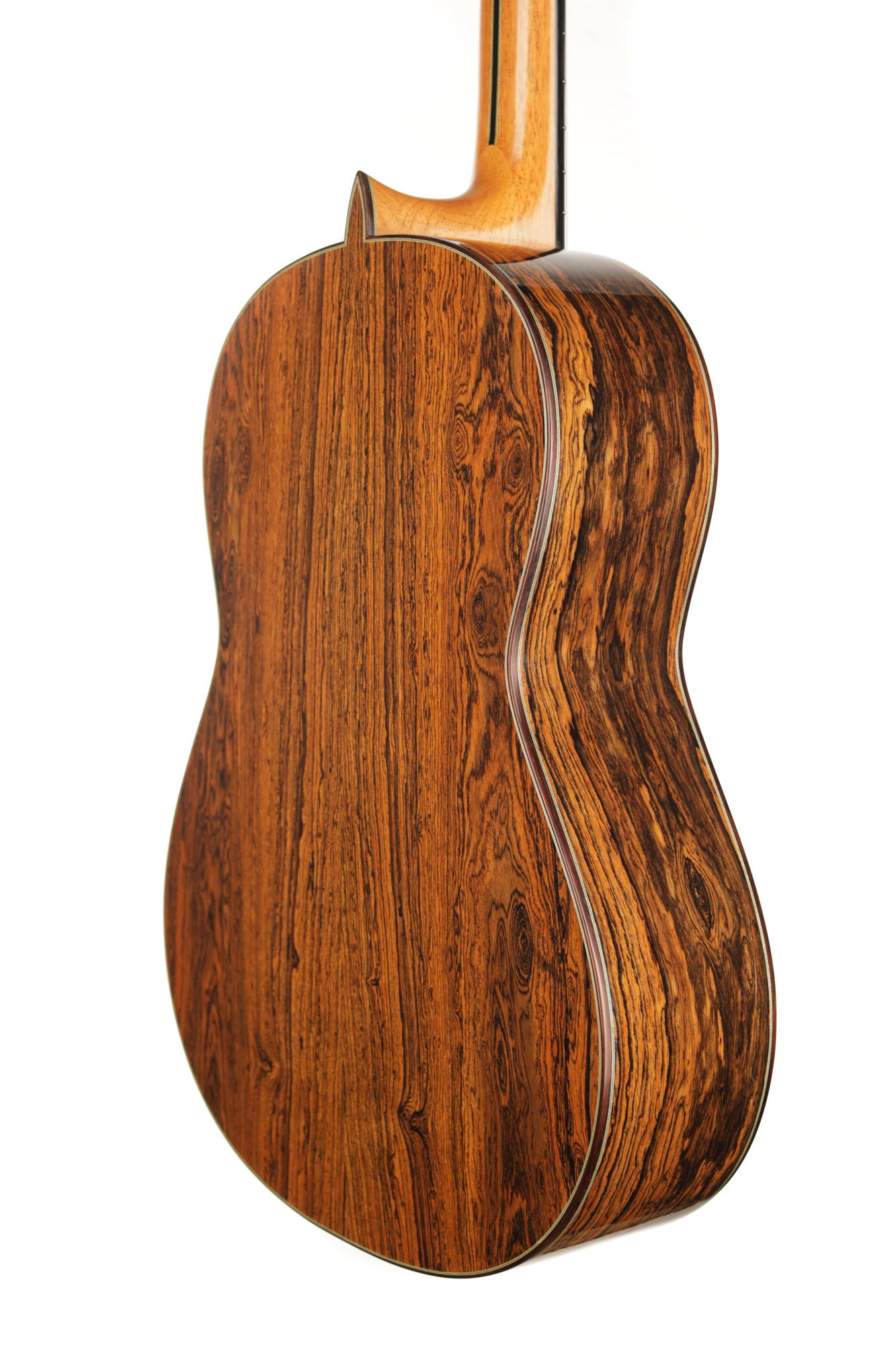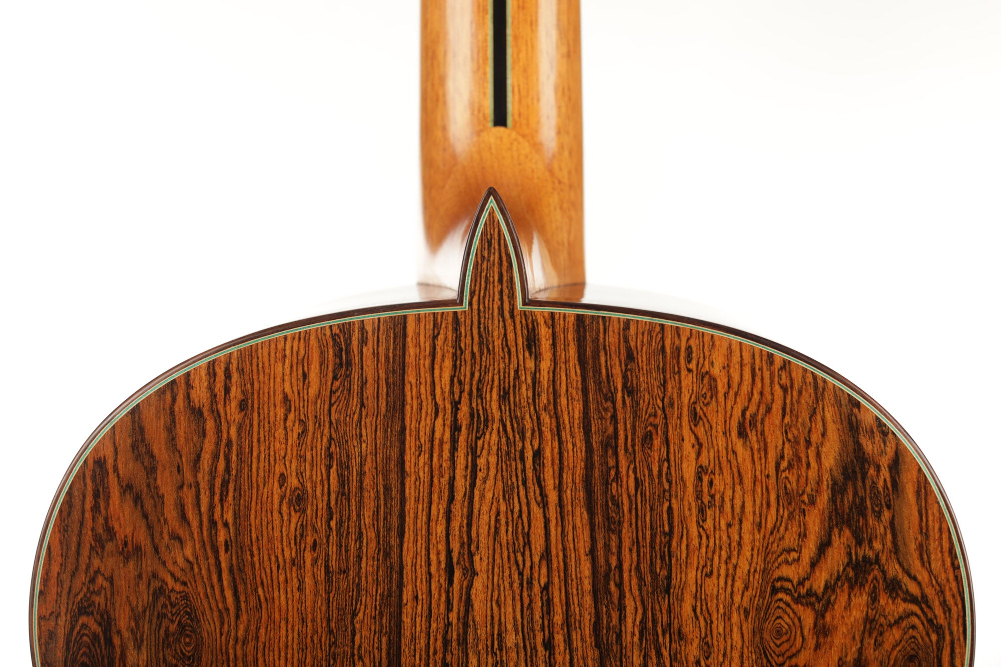 The Model 50 from Bernabe offers a variety of intriguing qualities. Stunning woods combined with an excellent craftsmanship result in an overall inspiring guitar. The curly grain of the Bocote rosewood is an absolute eye-catcher. Creamy smooth trebles with a lyrical Spanish sense mixed with the strong fundamental basses capture the perfect mix between a modern guitar and a traditional tone. The volume is pleasant and plenty for any required situation, Bernabe’s guitars are always easy to play and have a smooth setup. When playing on this guitar you immediately notice how responsive it is, the cedar top creates angelic overtones that fill a room with a beautiful shimmer.