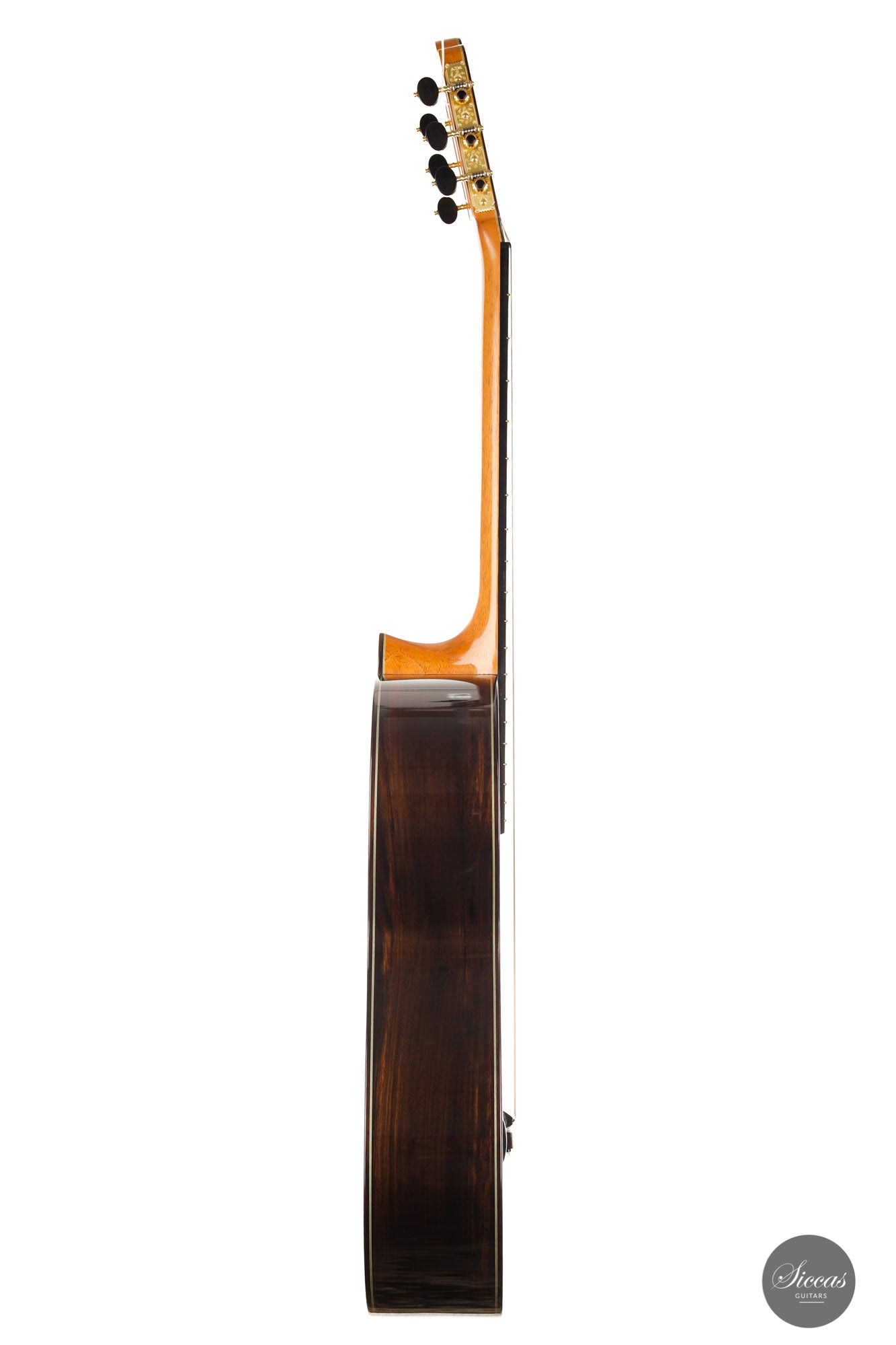 The sound of this guitar is spontaneous and playful, very warm, and singing. There is a strong personality in the treble, displaying a very round and Spanish sound. Basses are deep and make a great room for powerful and velvety midrange tones. It is a very easy guitar to play thanks to its slightly shorter scale, and a real delight to the ear for both the guitarist and the audience.