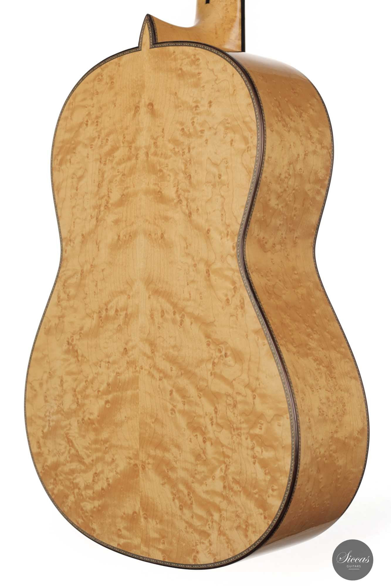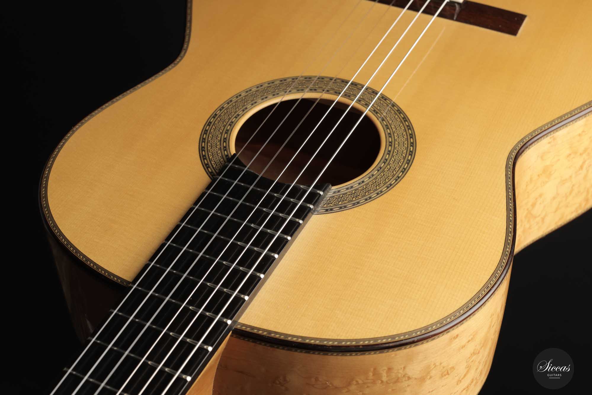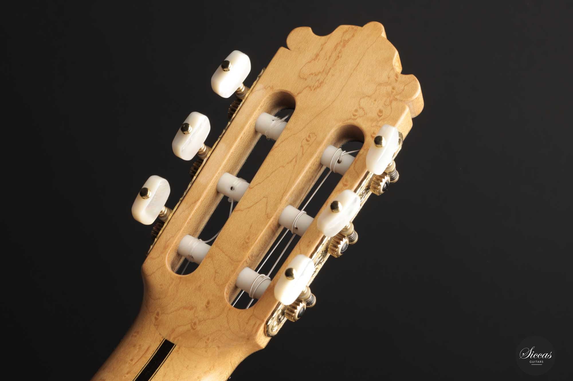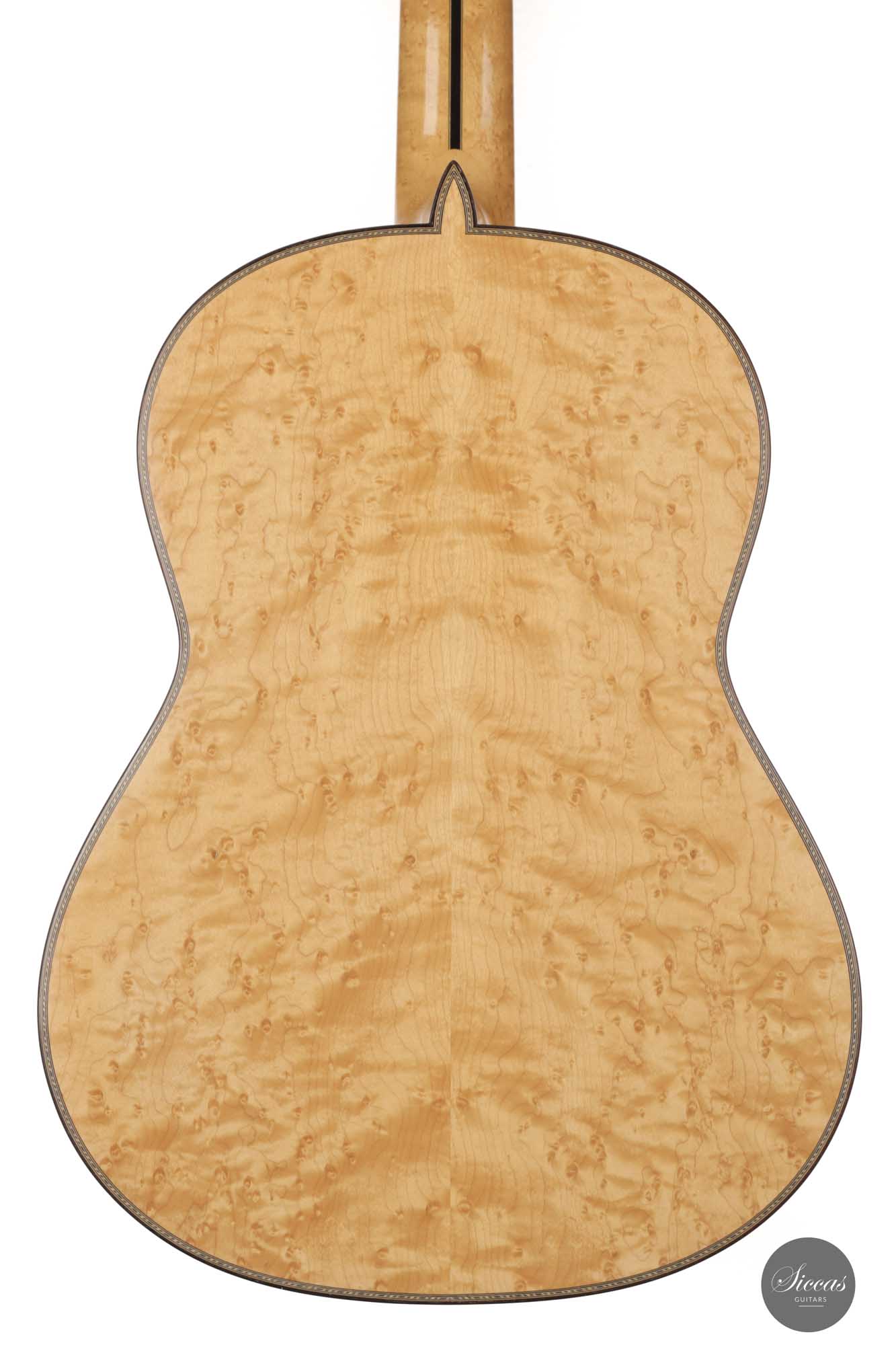 This fourth guitar of the Colección series features a stunning Bird’s Eye Maple back and sides, and, most surprisingly, neck. It is a real dream to look at! It recalls the distinguished violin-making school that utilizes maple as a neck, a sign of elegance and refinement. This very fine guitar features the maple wood's acoustic properties, giving airiness to the tonal character, and it plays very smoothly with an expressive and excellent volume. This guitar is considered as a rare and collectible item that will fulfill the demands of any musical ideas.