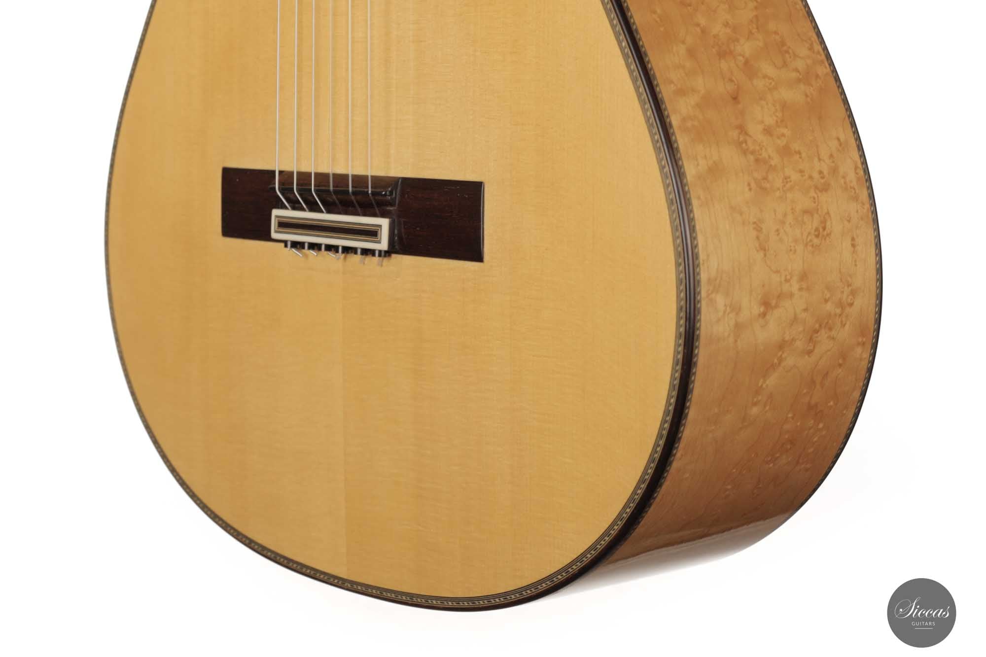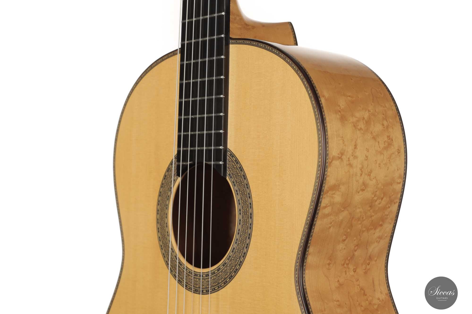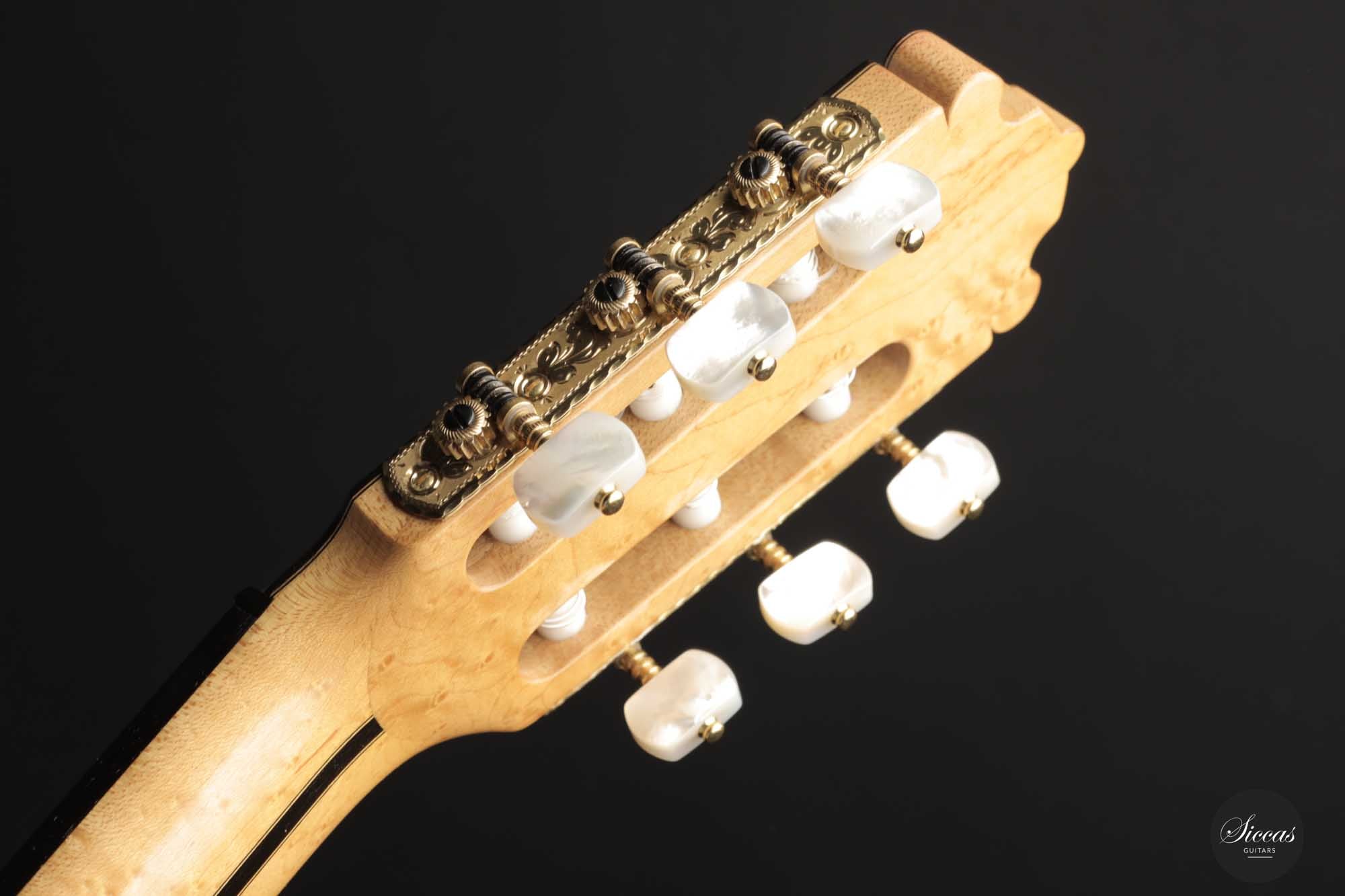 This fourth guitar of the Colección series features a stunning Bird’s Eye Maple back and sides, and, most surprisingly, neck. It is a real dream to look at! It recalls the distinguished violin-making school that utilizes maple as a neck, a sign of elegance and refinement. This very fine guitar features the maple wood's acoustic properties, giving airiness to the tonal character, and it plays very smoothly with an expressive and excellent volume. This guitar is considered as a rare and collectible item that will fulfill the demands of any musical ideas.