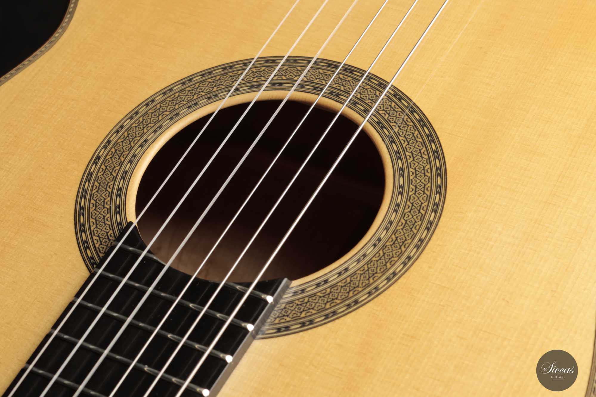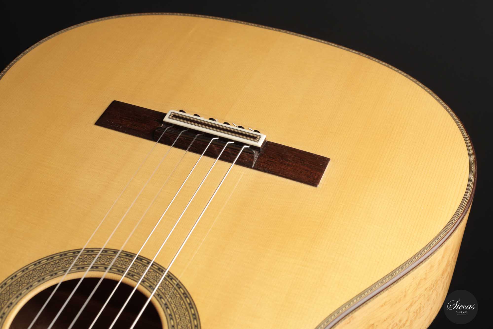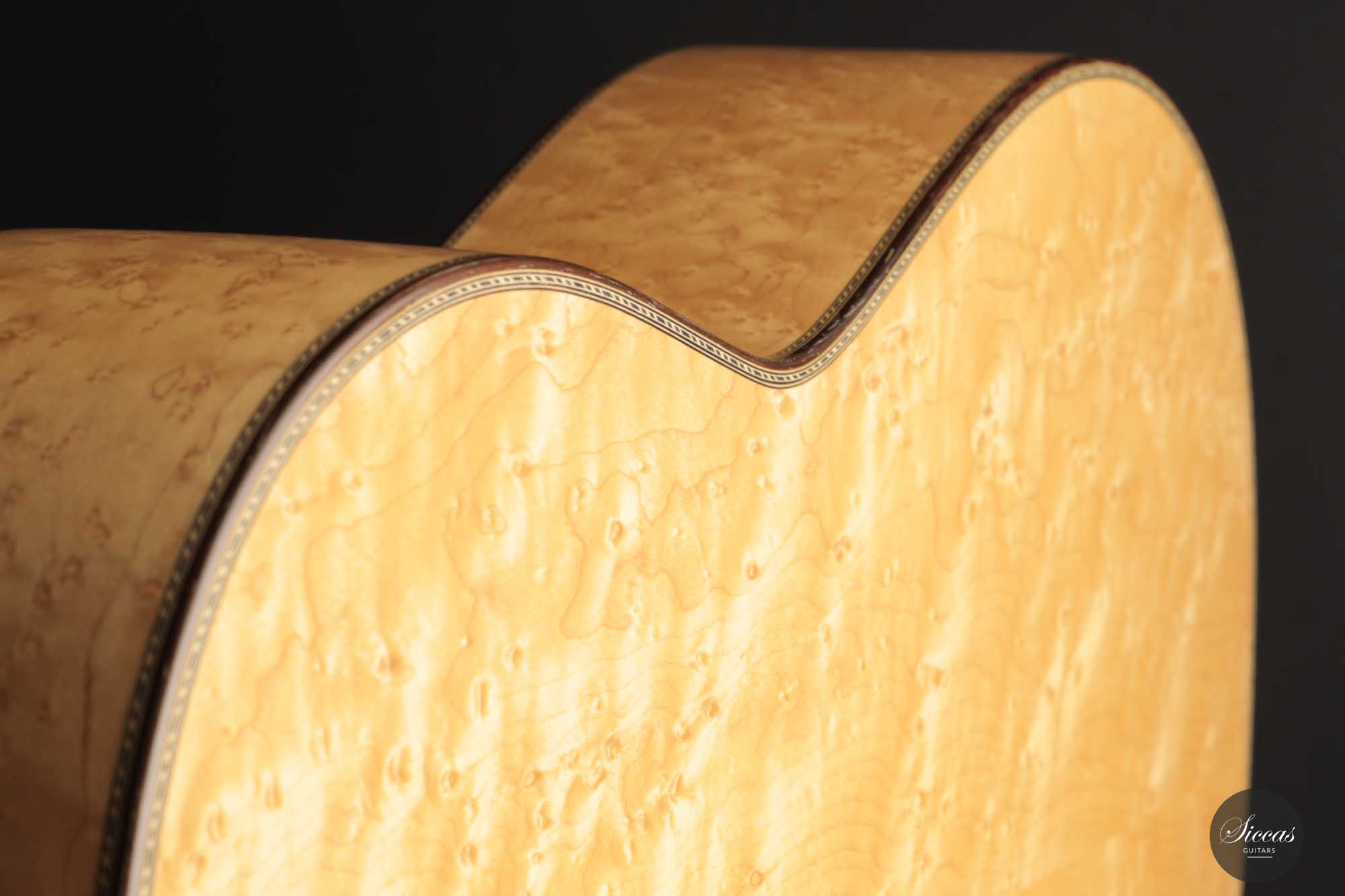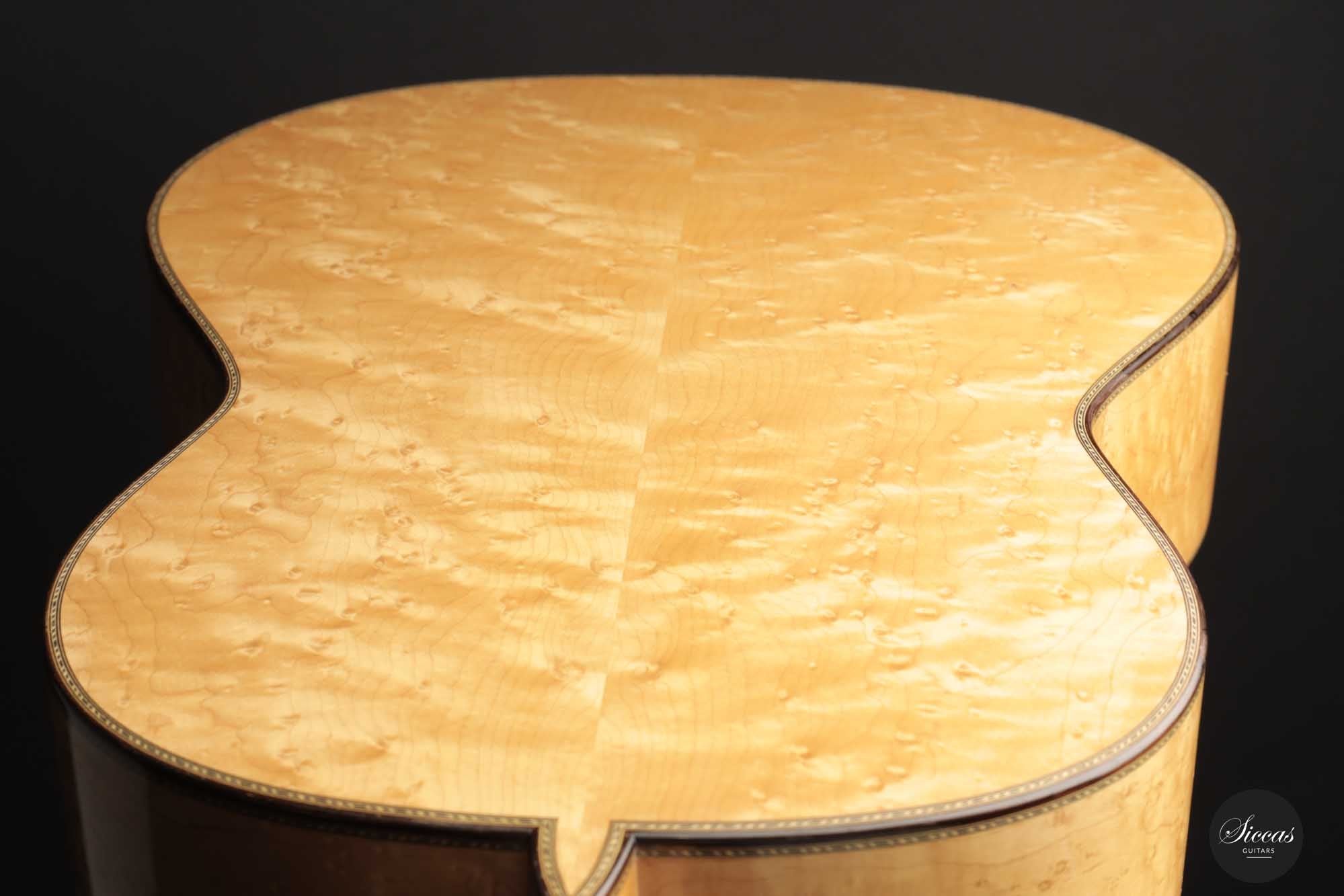 This fourth guitar of the Colección series features a stunning Bird’s Eye Maple back and sides, and, most surprisingly, neck. It is a real dream to look at! It recalls the distinguished violin-making school that utilizes maple as a neck, a sign of elegance and refinement. This very fine guitar features the maple wood's acoustic properties, giving airiness to the tonal character, and it plays very smoothly with an expressive and excellent volume. This guitar is considered as a rare and collectible item that will fulfill the demands of any musical ideas.