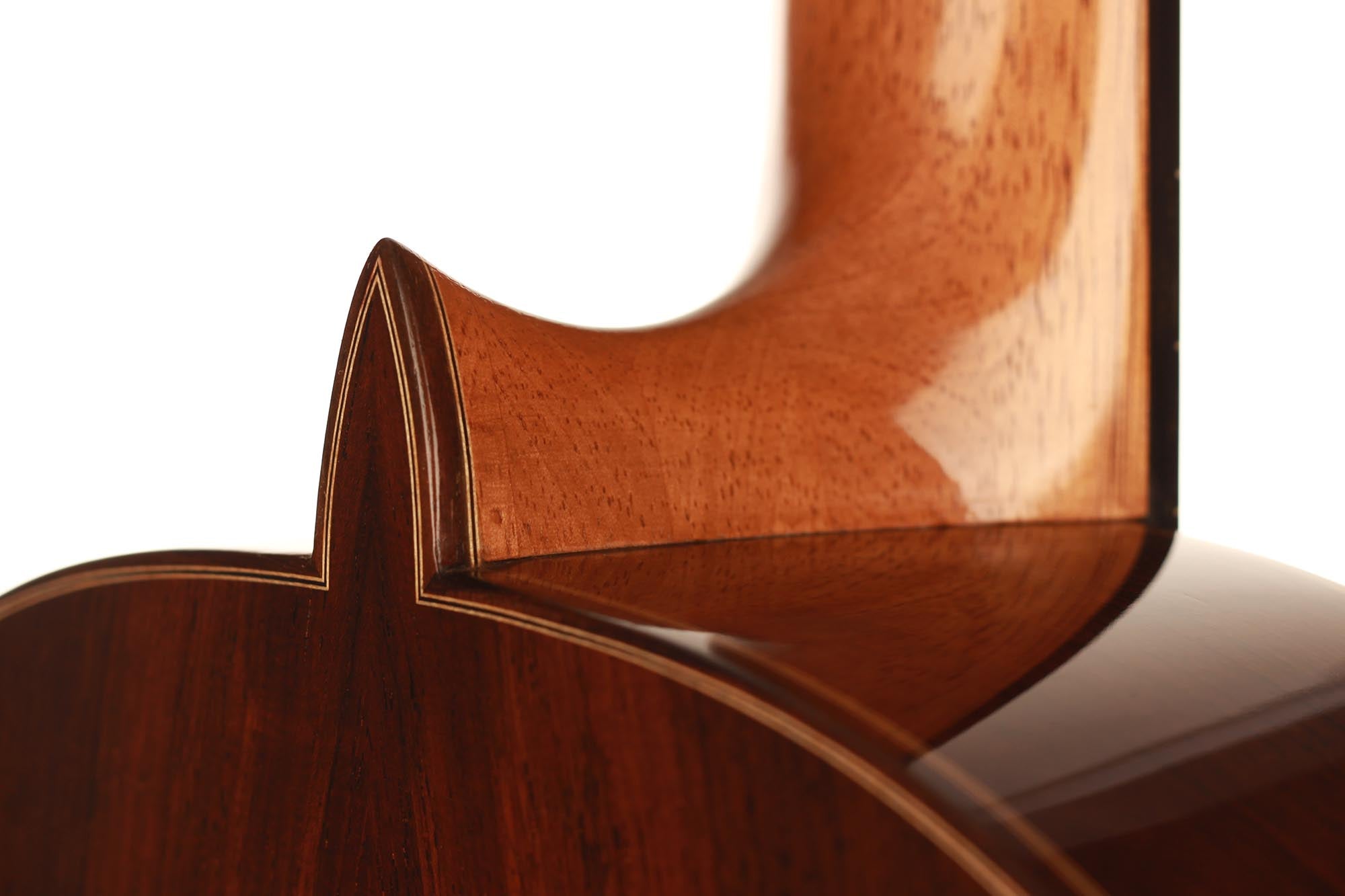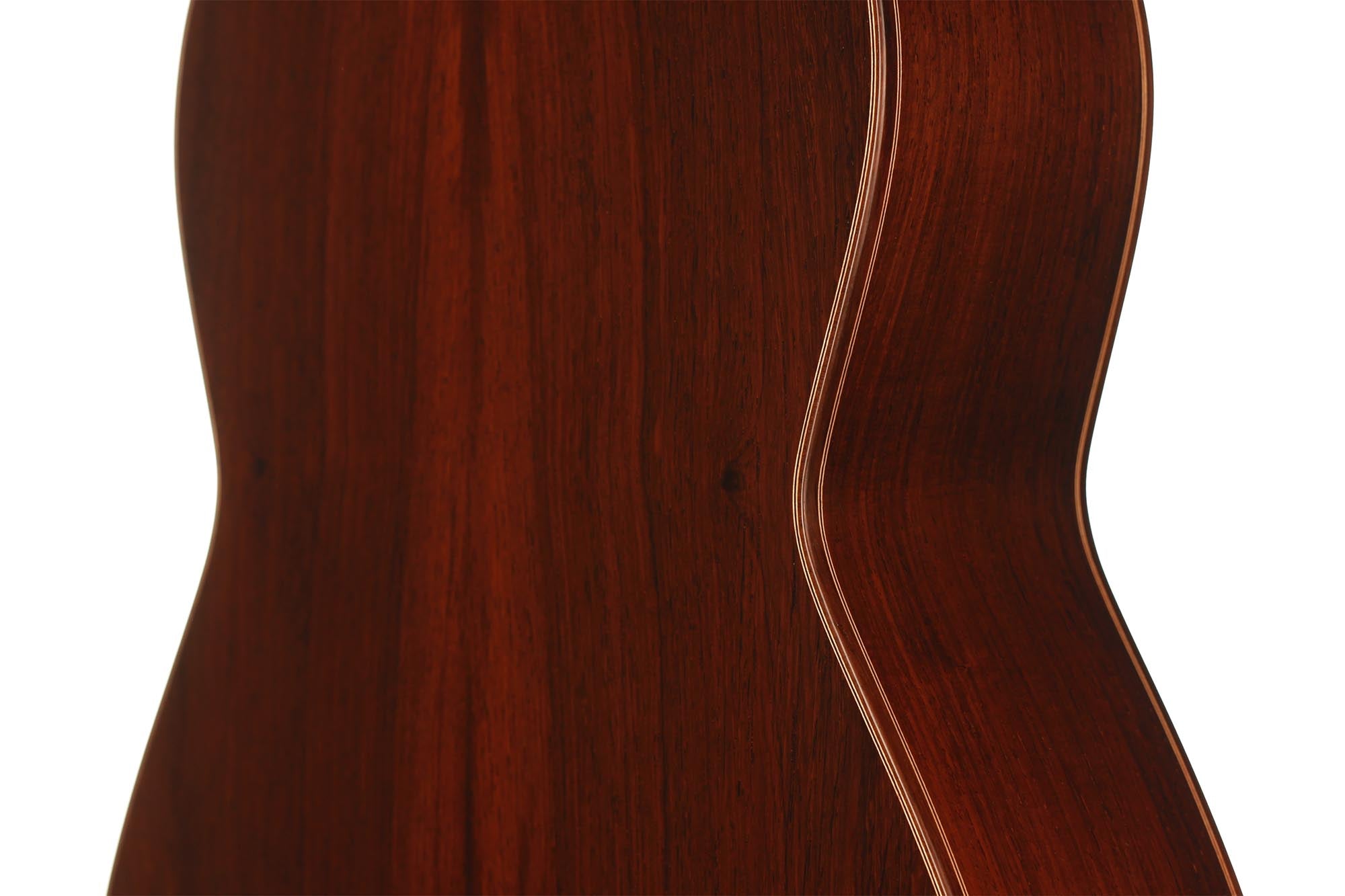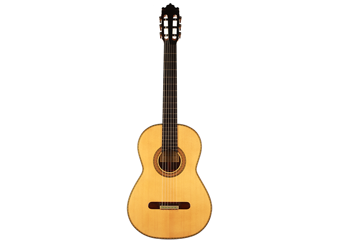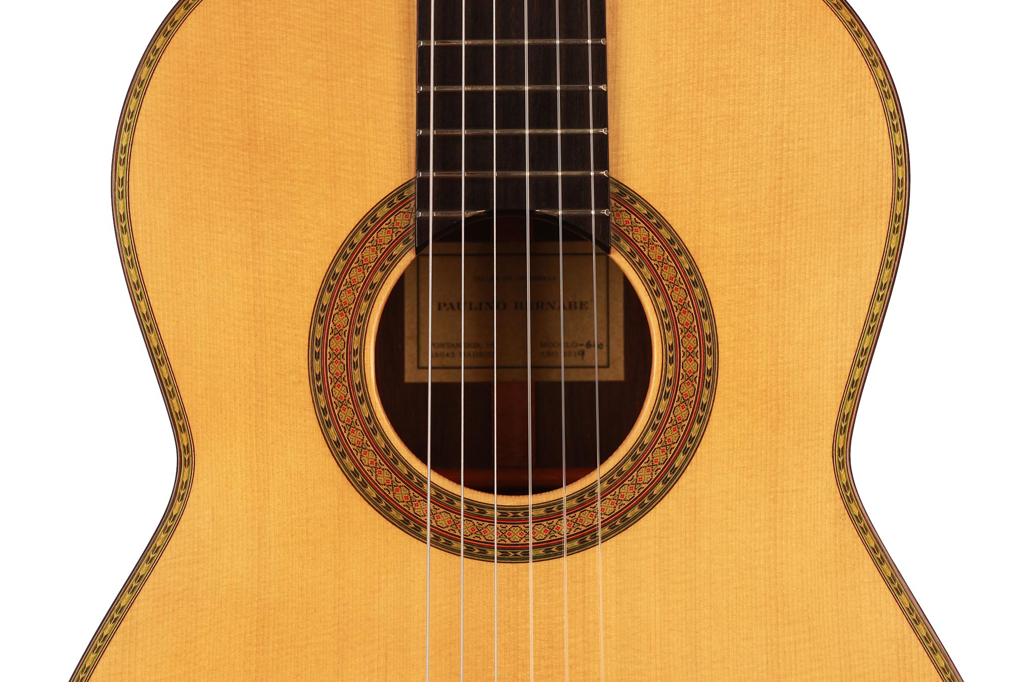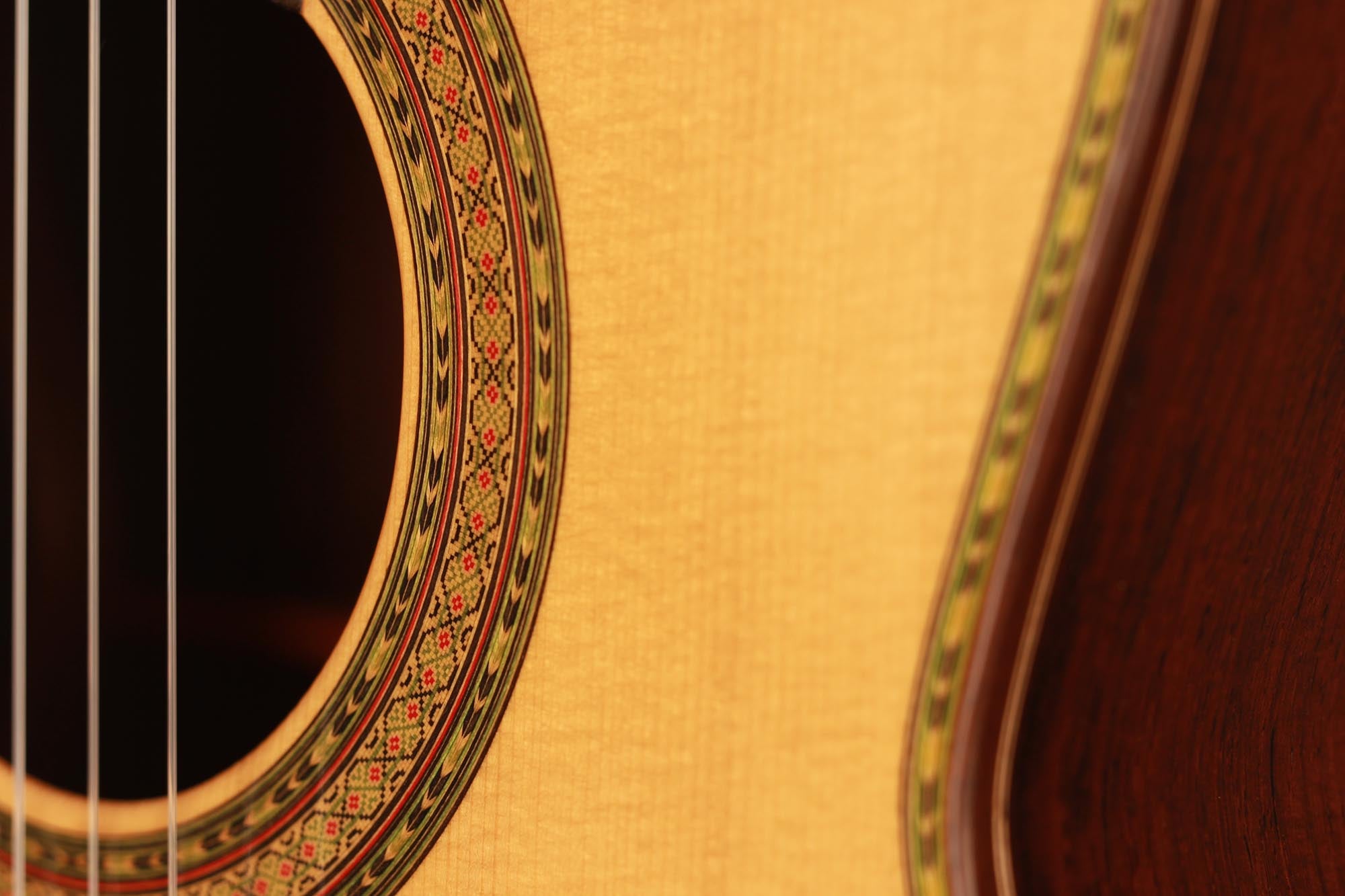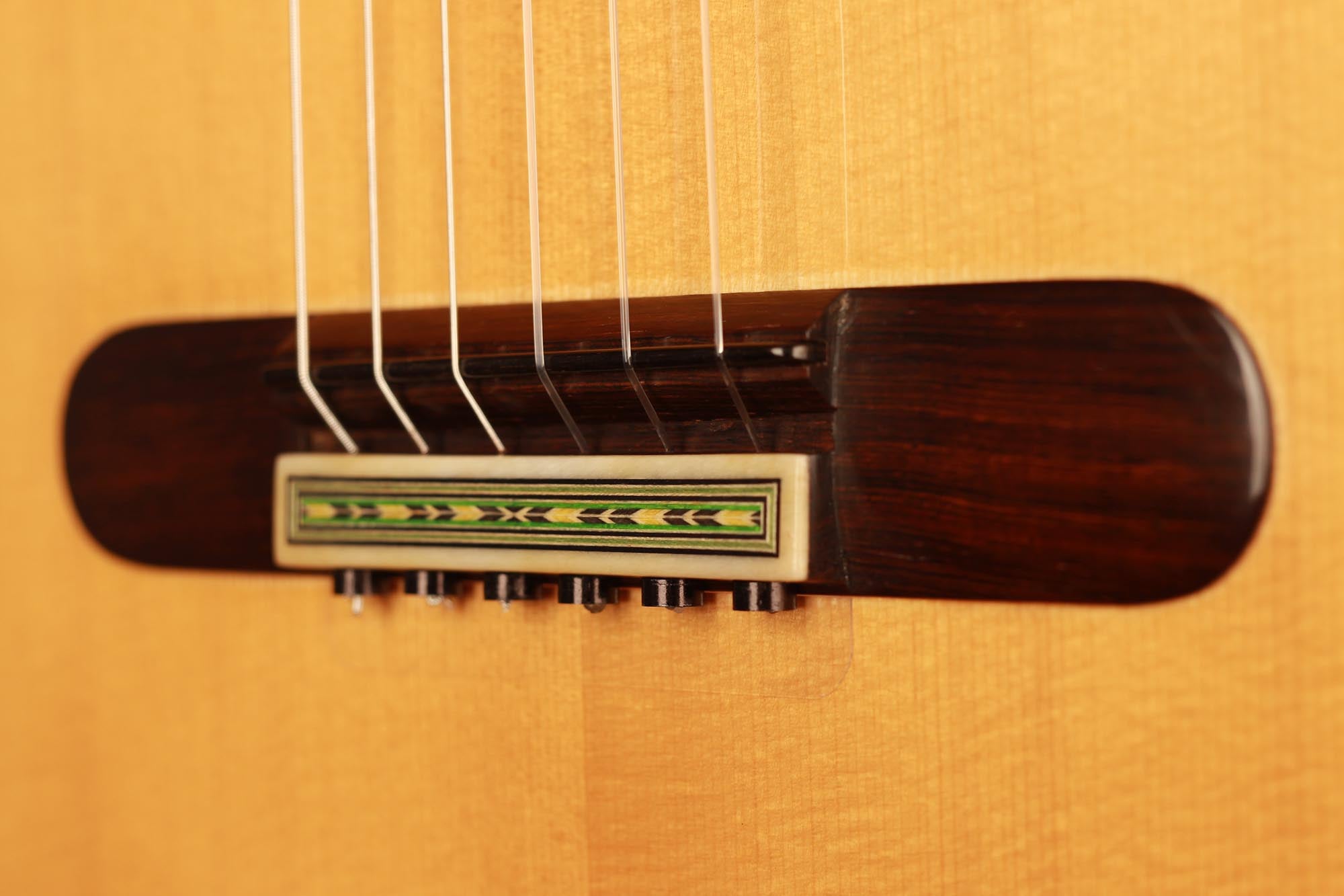 Dieses wunderschön verzierte Modell von Paulino Bernabe ist etwas kleiner gebaut als seine anderen Modelle. Das Ergebnis ist eine Gitarre von schöner Form im Stil der 1920er Jahre, die an die originalen José Ramirez I Gitarren erinnert. Der abgerundete Steg und der schwarze Knochensattel bestätigen auch diesen antiken Stil, der sich perfekt mit dem unglaublich geschmeidigen Ton und der leichten Spielbarkeit dieses feinen Instruments verbindet. Die Differenzierung der Stimmen ist besonders angenehm und verleiht ein Gefühl von Klarheit und Reinheit. Sie ist die perfekte Gitarre für einen Spieler, der ein Instrument mit 640 mm Mensur sucht, das nicht nur hohe Ansprüche erfüllt, sondern auch großen Komfort und einen echten spanischen Klang bietet.