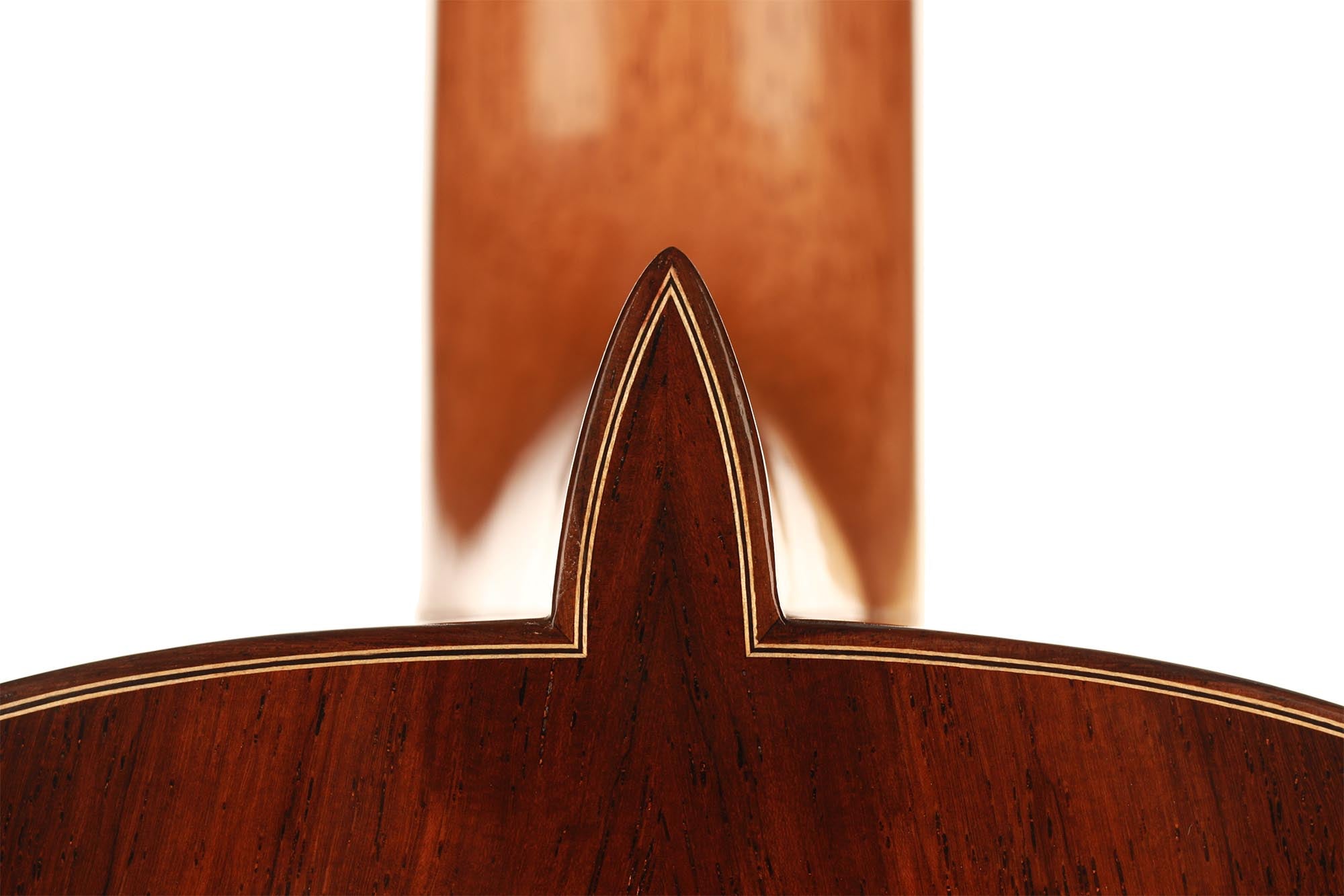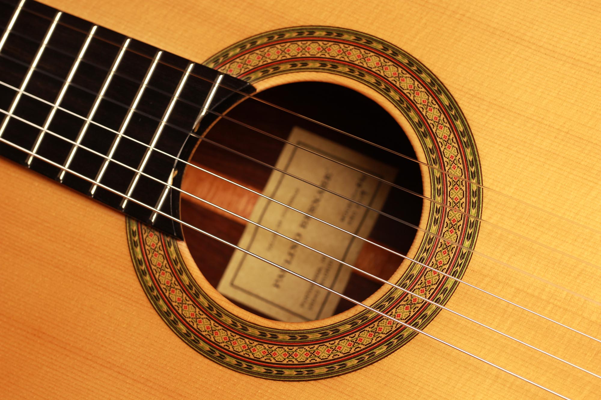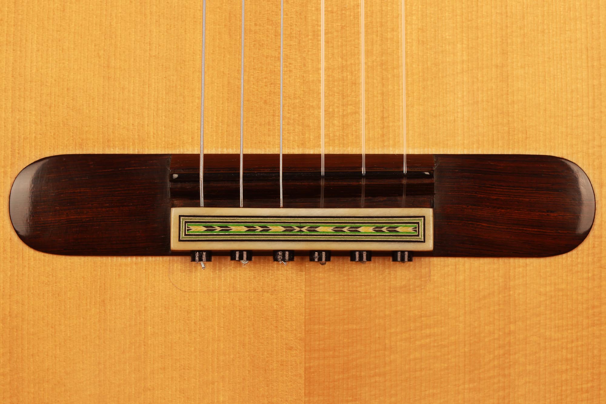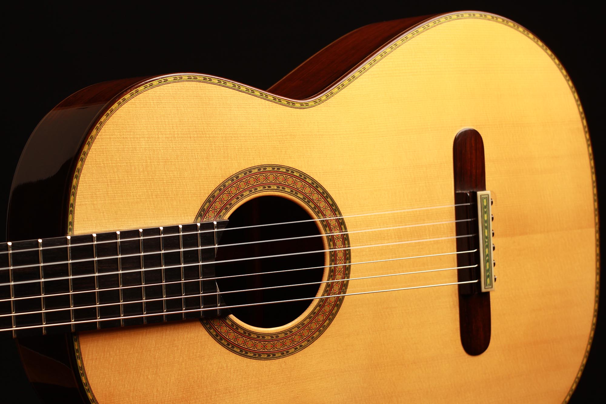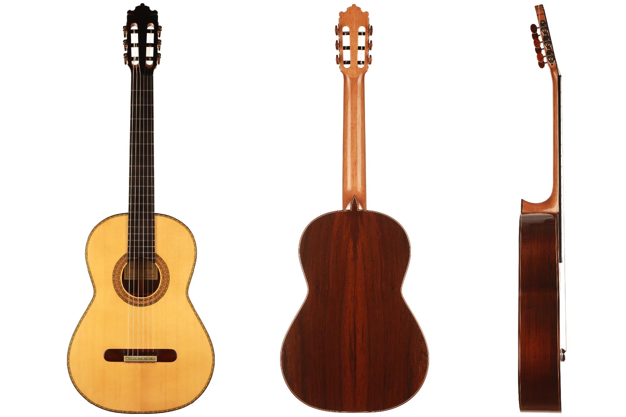 Dieses wunderschön verzierte Modell von Paulino Bernabe ist etwas kleiner gebaut als seine anderen Modelle. Das Ergebnis ist eine Gitarre von schöner Form im Stil der 1920er Jahre, die an die originalen José Ramirez I Gitarren erinnert. Der abgerundete Steg und der schwarze Knochensattel bestätigen auch diesen antiken Stil, der sich perfekt mit dem unglaublich geschmeidigen Ton und der leichten Spielbarkeit dieses feinen Instruments verbindet. Die Differenzierung der Stimmen ist besonders angenehm und verleiht ein Gefühl von Klarheit und Reinheit. Sie ist die perfekte Gitarre für einen Spieler, der ein Instrument mit 640 mm Mensur sucht, das nicht nur hohe Ansprüche erfüllt, sondern auch großen Komfort und einen echten spanischen Klang bietet.