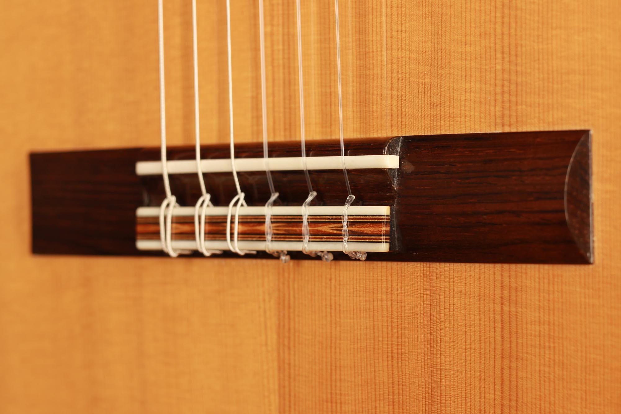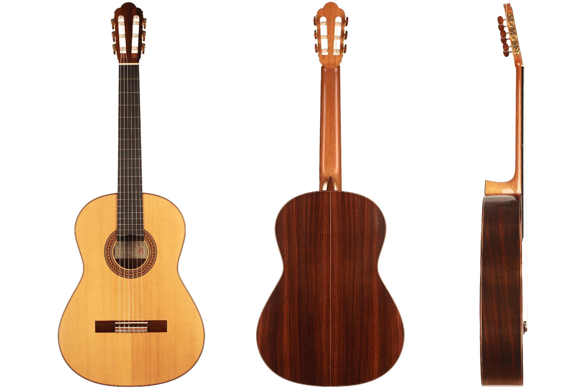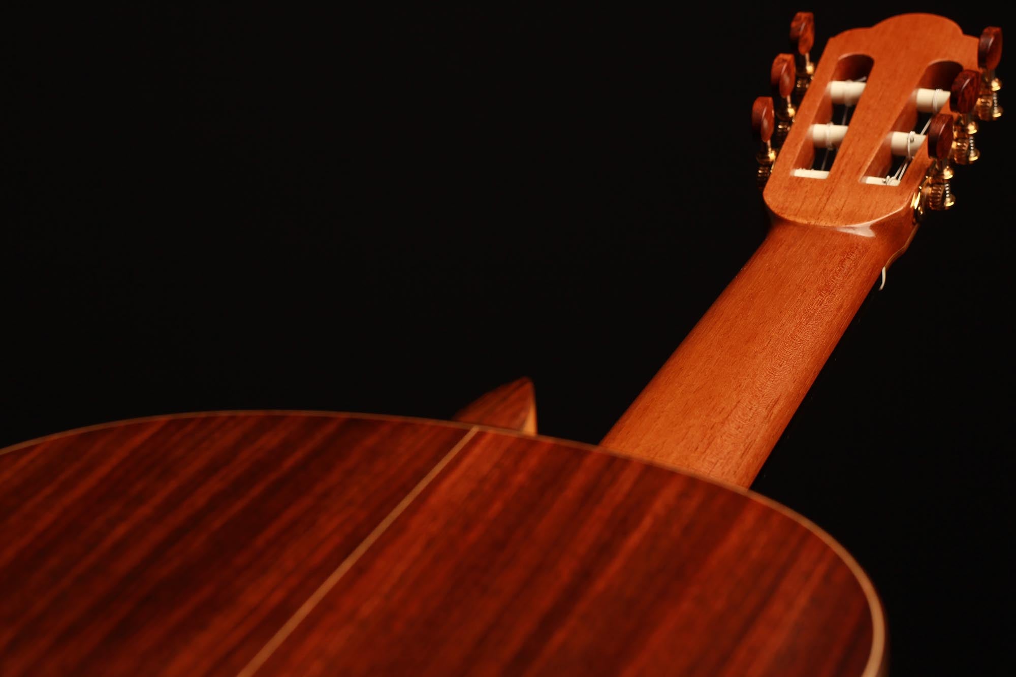 Dieses Instrument wurde 2002 gebaut und hat lediglich zwei reparierte Risse, einen auf der Decke und einen auf der Zarge, die beide fachmännisch repariert und fast nicht sichtbar sind. Es handelt sich um eine traditionelle Gitarre mit einer dünnen Fichtendecke und einem "Bouchet Balken" unter dem Steg. Die Decke hat in den letzten Jahren eine fantastische Farbe bekommen und auch der Klang hatte Zeit zu reifen. Tiefe, kräftige Bässe unterstützen den brillanten Diskant und unterstreichen die Magie einer vollkommen offenen und ausgereiften Gitarre.