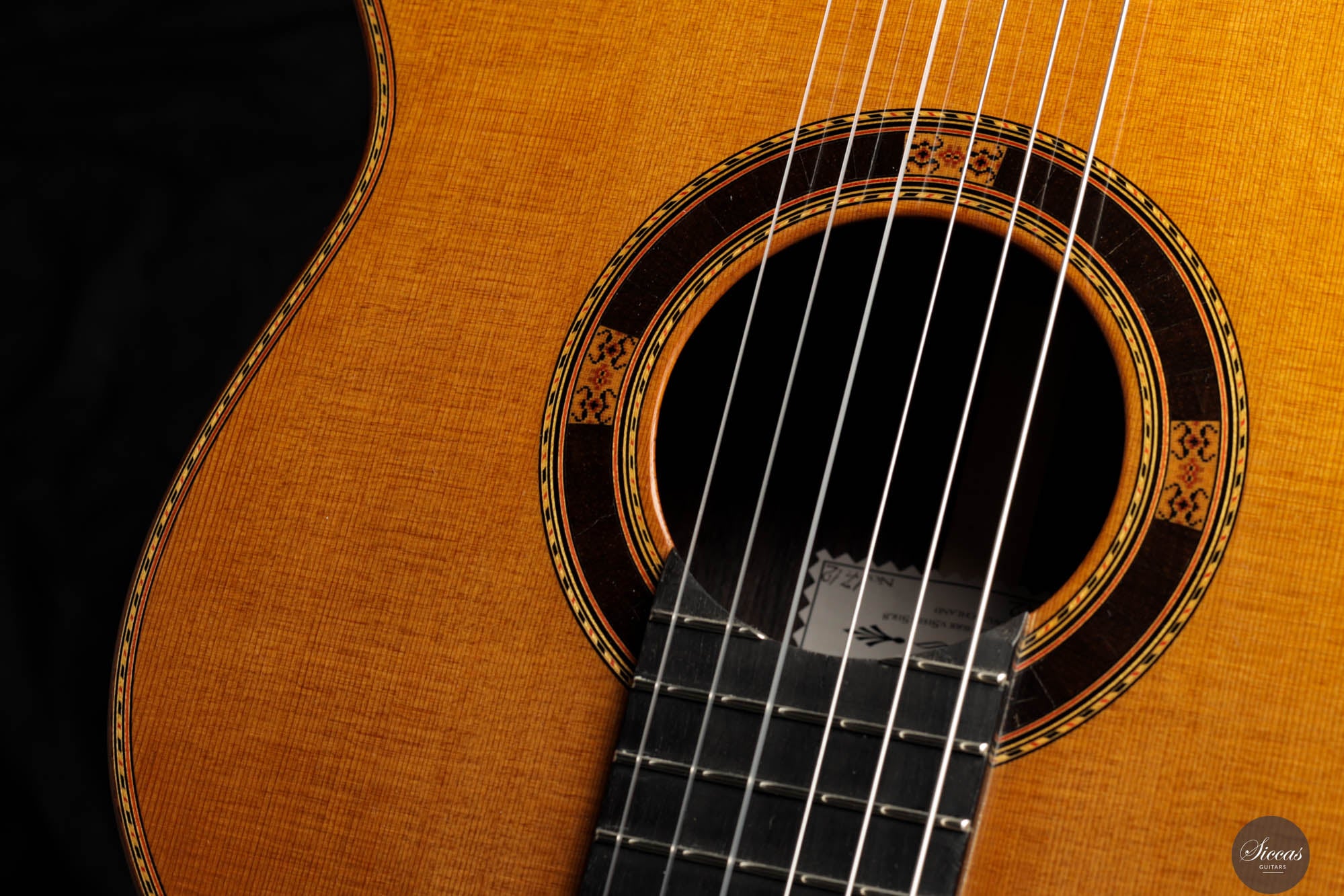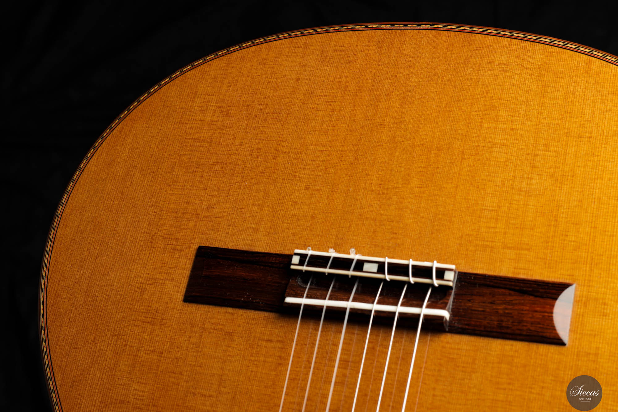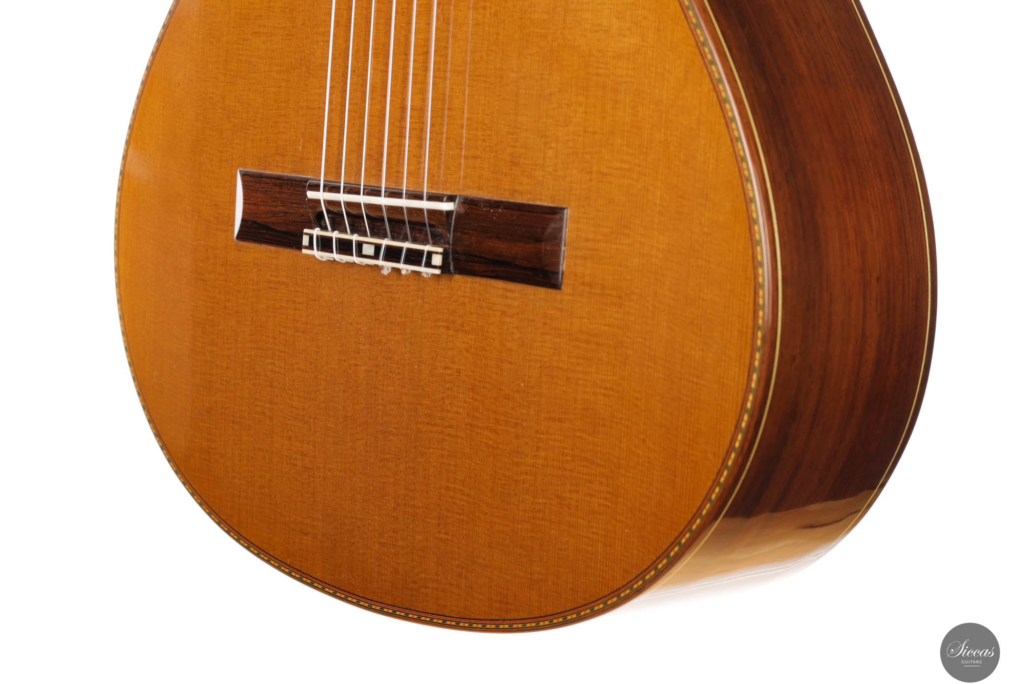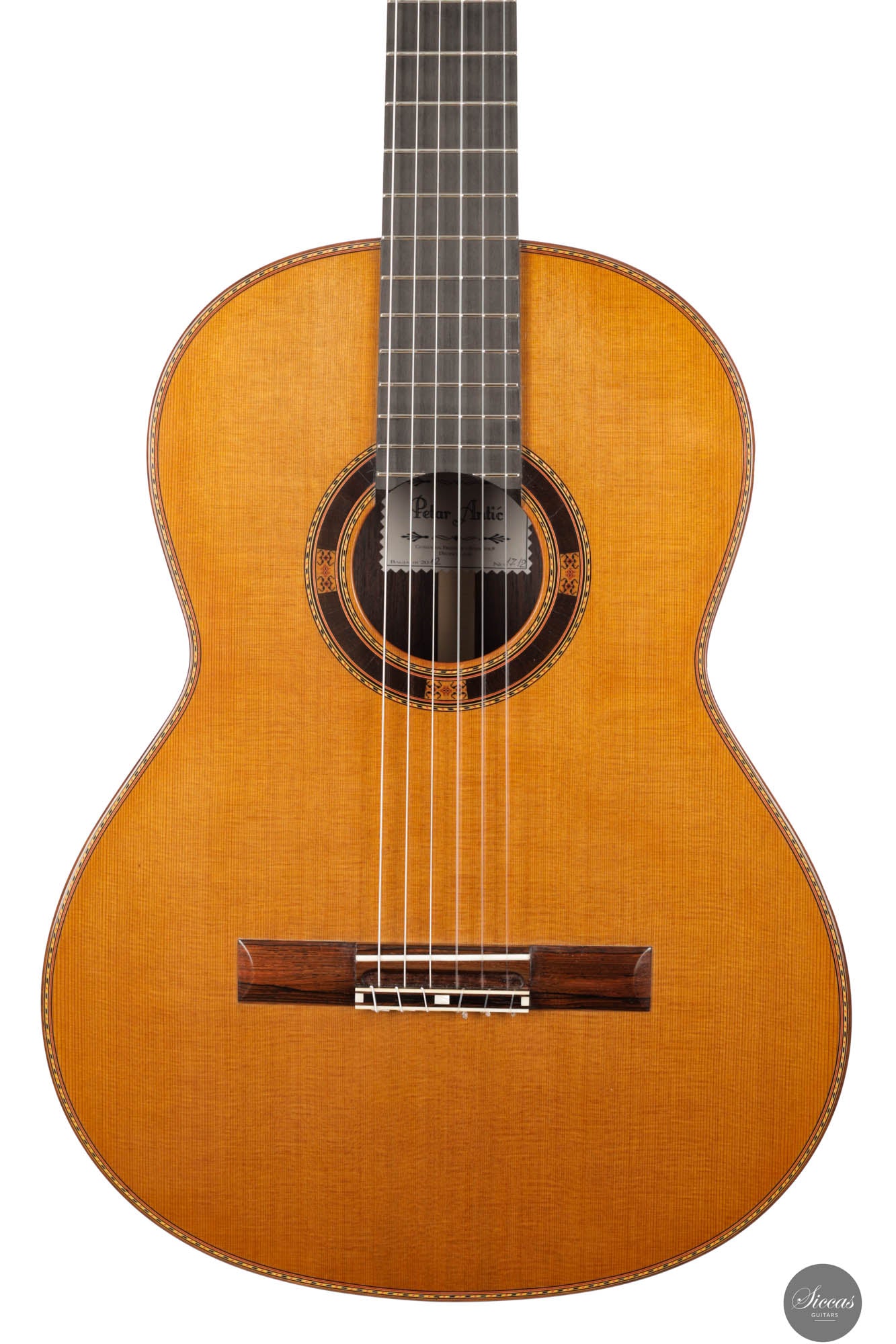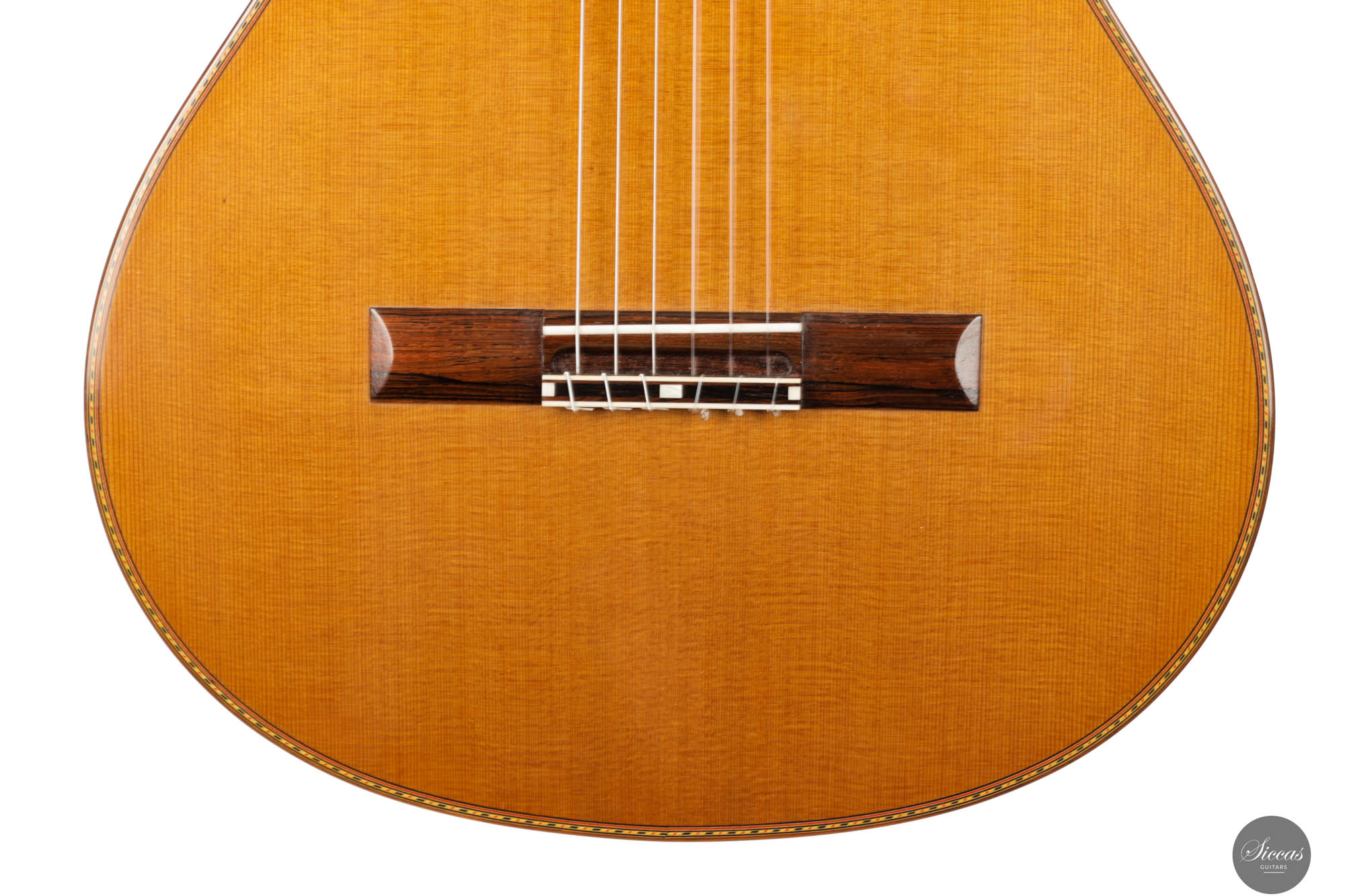 The No. 17.12 guitar by the late Petar Antic is not only a musical instrument but a cherished embodiment of his exceptional craftsmanship and legacy. Featuring a cedar top and indian rosewood back and sides, the guitar resonates with warm and rounded tonal qualities. The guitar's construction, from the beautifully crafted ornaments to its expertly executed setup, showcases Antic’s meticulous attention to detail, ensuring ease of play and comfort. This instrument excels in both volume and response, making it incredibly versatile across various musical styles and settings. The condition of the guitar is very good. There are some shallow playing marks on the top.