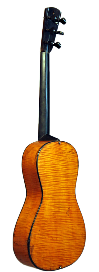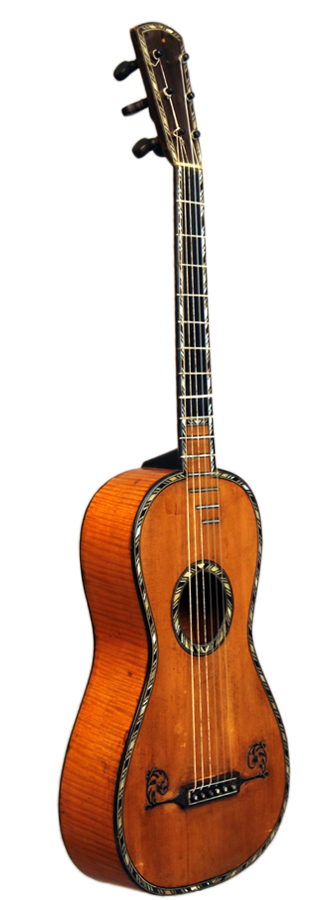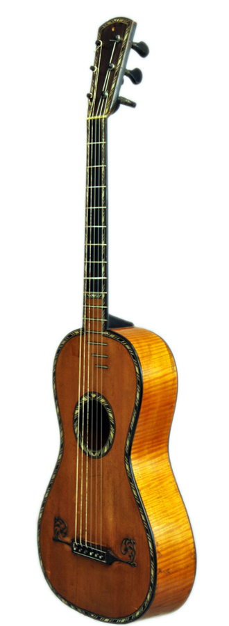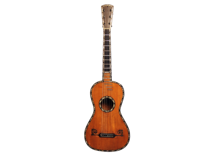 Diese wunderschöne Gitarre wurde von 'Petitjean' hergestellt, einer der bekanntesten und besten Gitarrenwerkstätten zu jener Zeit in Mirecourt. Schon um 1800 arbeitete die Familie im Bereich des Musikinstrumentenbaus. Die Werkstätte wurde höchst wahrscheinlich von vielen Mitgliedern der Familie betrieben. Die Gitarren wurden mit verschiedenen Herstellernamen versehen, wie etwa: 'Petitjean L'ainé à Paris' (wie in diesem vorliegenden Falle), 'Petitjean à Mirecourt' und 'Petitjean'. Die Neuerungen der 'Petitjean' Werkstätte war, dass die Gitarren nicht mehr einen zweiteiligen Boden, sondern einteilig aus Massivholz oder aus Furnier gebaut wurden. Zudem wurden auch wertvolle Edelhölzer verarbeitet wie z.B. brasilianisches Rosenholz. Die hier vorgestellte Gitarre ist sehr fein verabeitet und besitzt eine Decke aus fein gemaserter Fichte. Der Deckenrand sowie das Schallloch sind mit Perlmutt verziert, die auf dem Griffbrett und dem Kopf weitergeführt wird. Der rechteckige Ebenholzsteg ist verziert mit einer Einlage aus Knochen und Rankenverzierungen, die vom Steg wegführen: Zu sehen sind Blätter, die von einem Zweig abgehen und an dessen Ende sich eine Blumenblüte befindet. Bei später gebauten Gitarren wurde das 'Blumenmotiv' durch ein 'Weinrebenmotiv' ersetzt. Der Boden und die Zargen der Gitarre sind aus massivem Ahorn.