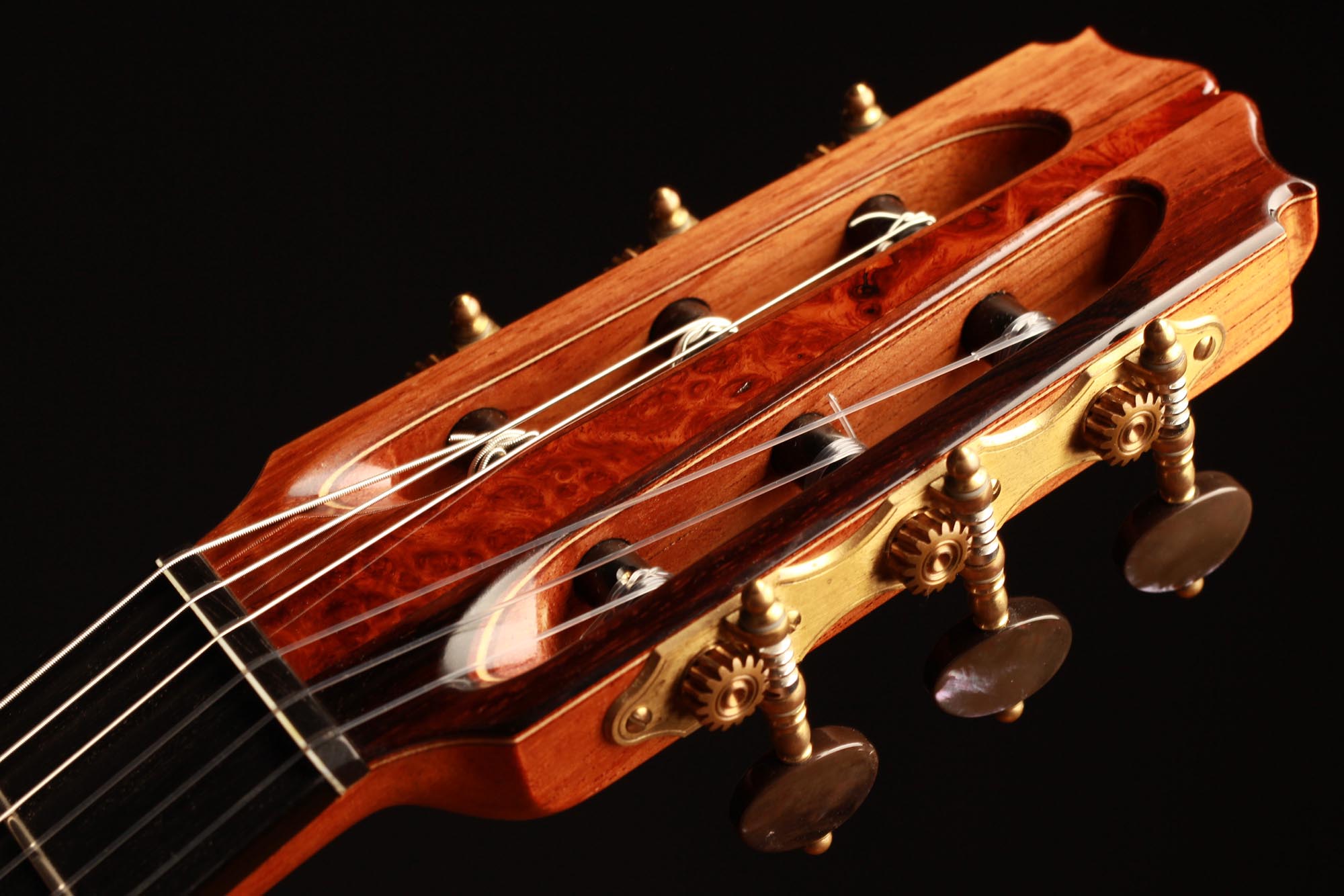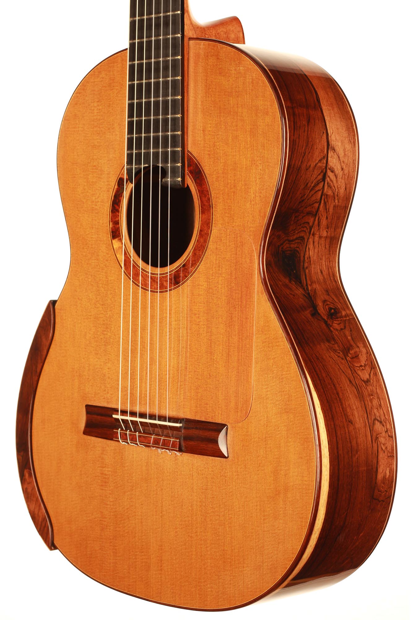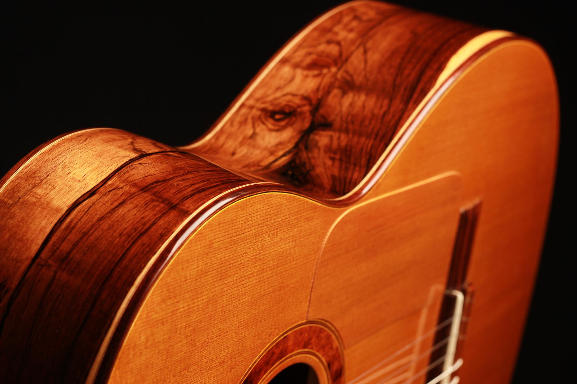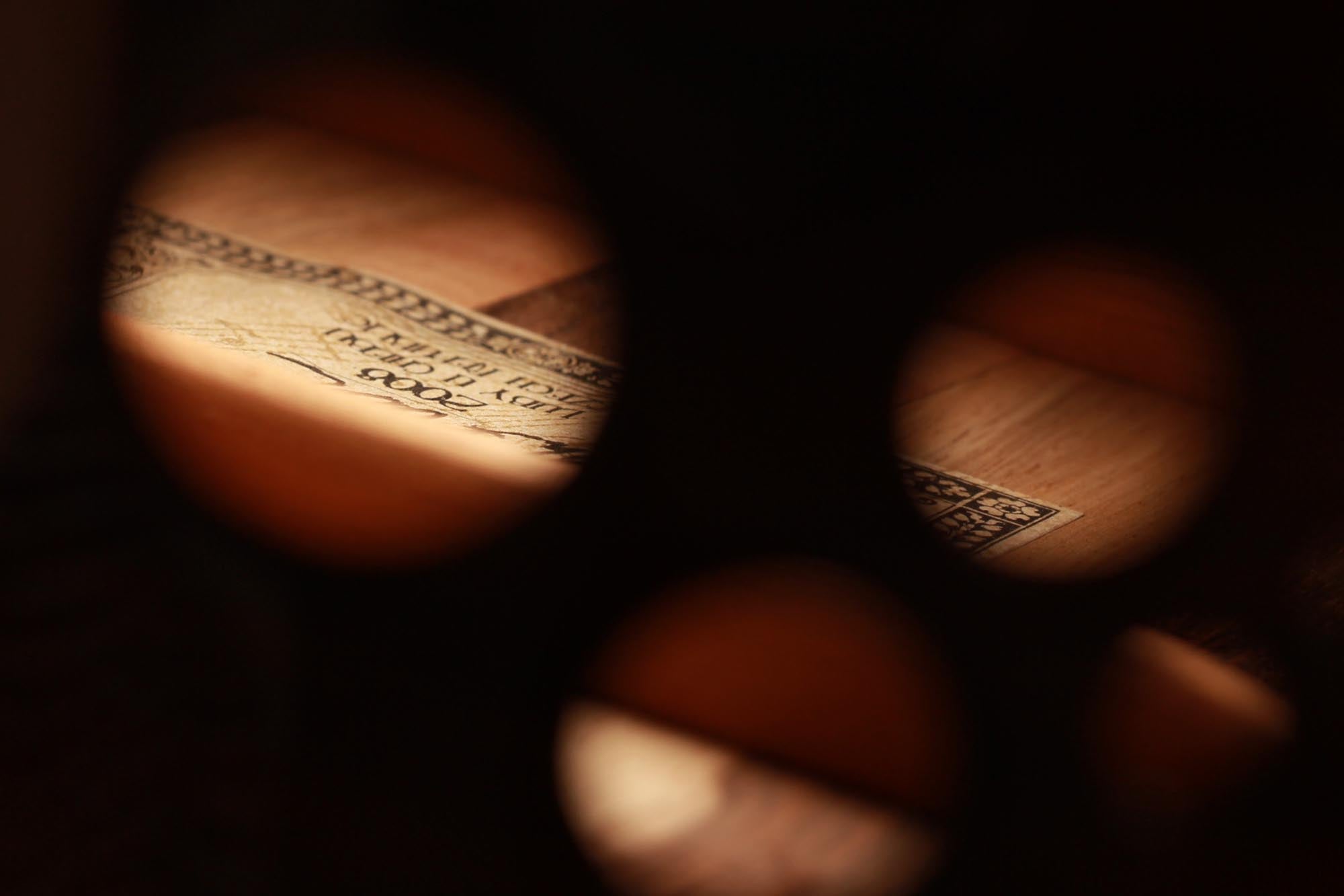 Petr Matoušek is one of the best-known luthiers from Czech Republic. His guitars are known to be of great workmanship and sound. Especially the double-top models have gained very good reputation for being best value for money. The same goes for this 2008 model. The guitar has a very fast response with great volume and projection. The playability for both left and right hand is very good and makes it a very comfortable instrument. This instrument has been played a lot in the past 10 years and since it also was used for modern music, the first thin double-top layer next to the sound hole got worn out.