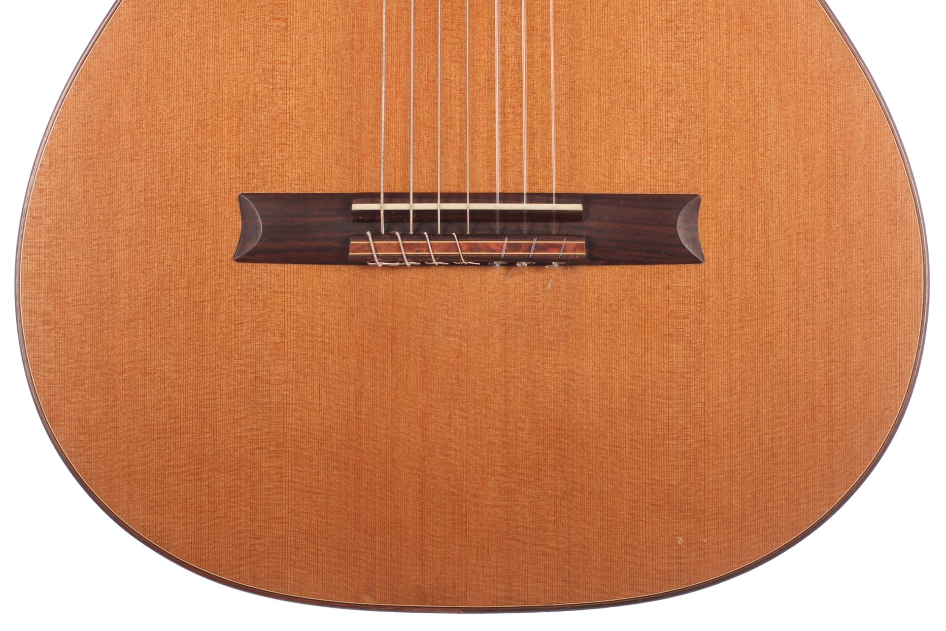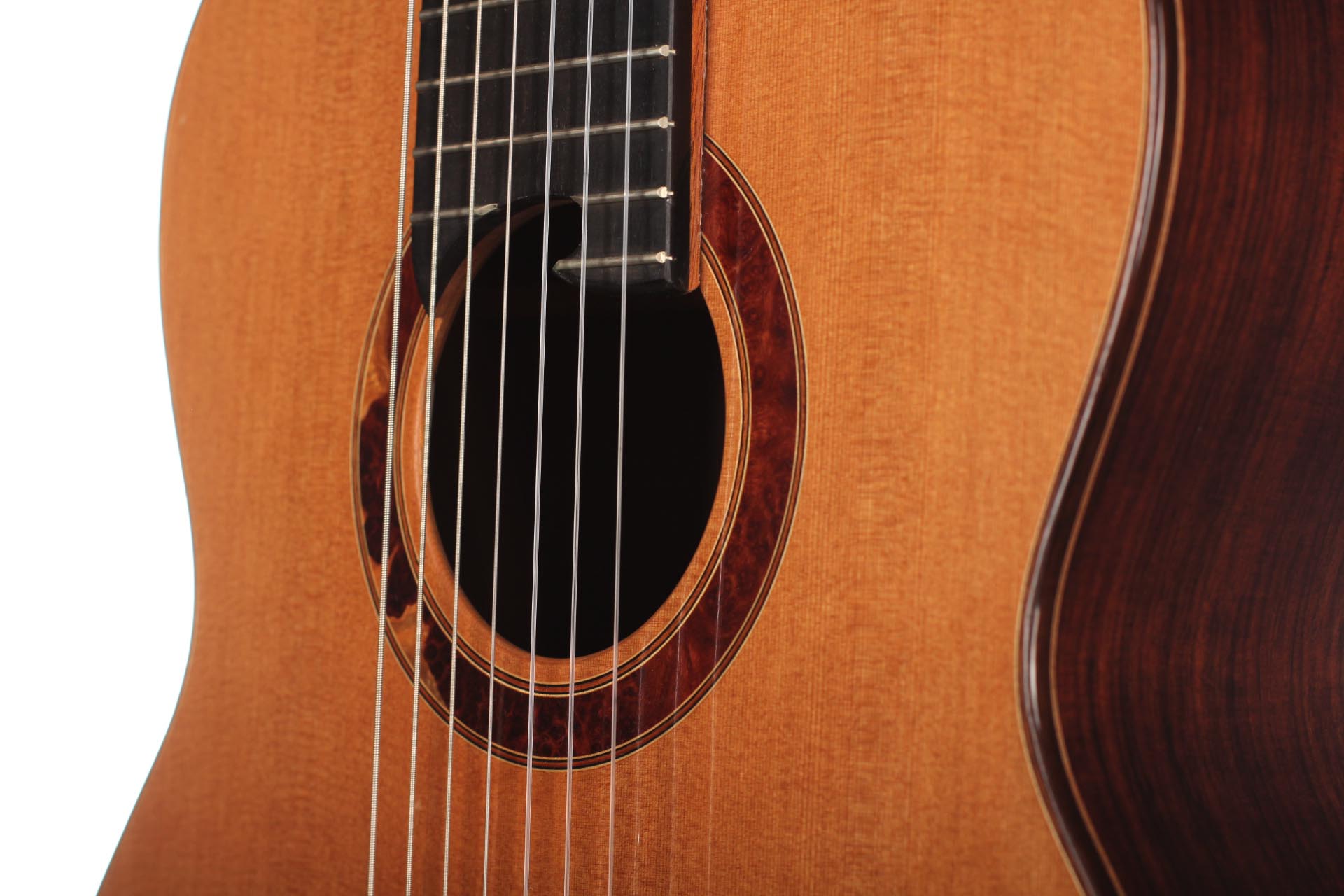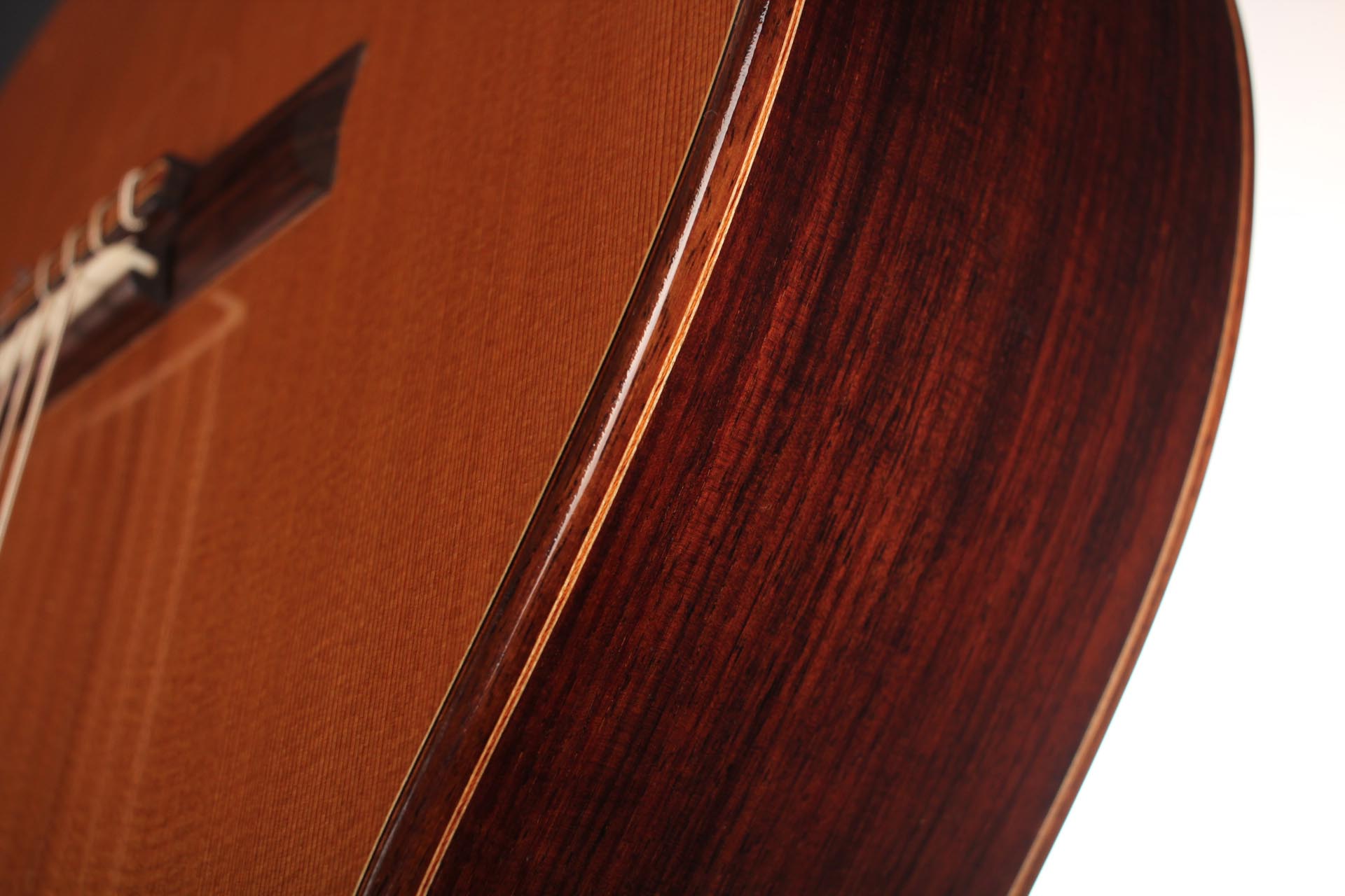 Dieses 7-saitige Master Concert Modell wurde 2010 von Petr Mtoušek gefertigt. Die Gitarre hat ein Doubletop (Zeder/Nomex) und Boden und Zargen sind aus indischem Palisander. Das erhöhte Griffbrett erleichtert das Spiel in hohen Lagen. Die Rosette und die Kopfplatte sind aus Ambonia Burl Holz, das großartig aussieht und ein spezielles Merkmal von Petrs Gitarren darstellt. Des Weiteren verfügt dieses Instrument über eine Armablage, die die Dämpfung der Deckenschwingung verhindert und den Schellack schützt. Die Gitarre hat einen 14-löchigen Steg, der den Seiten einen gleichmäßigeren Winkel verleiht. Die gesamte Gitarre ist mit Schellack handpoliert. Die Mechaniken sind von Alessi. Die Gitarre weißt ein paar Gerbrauchsspuren auf Decke und Boden auf.