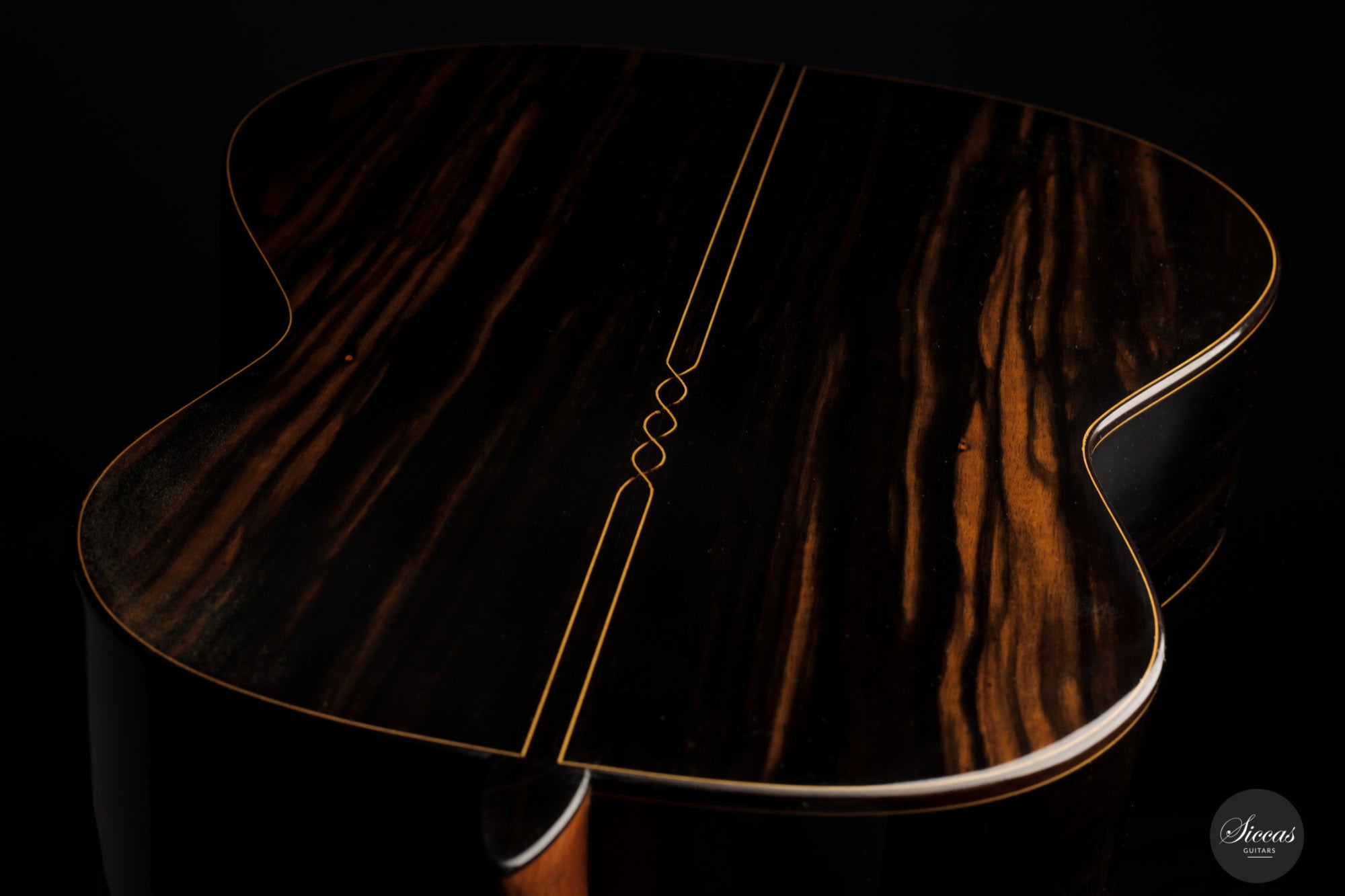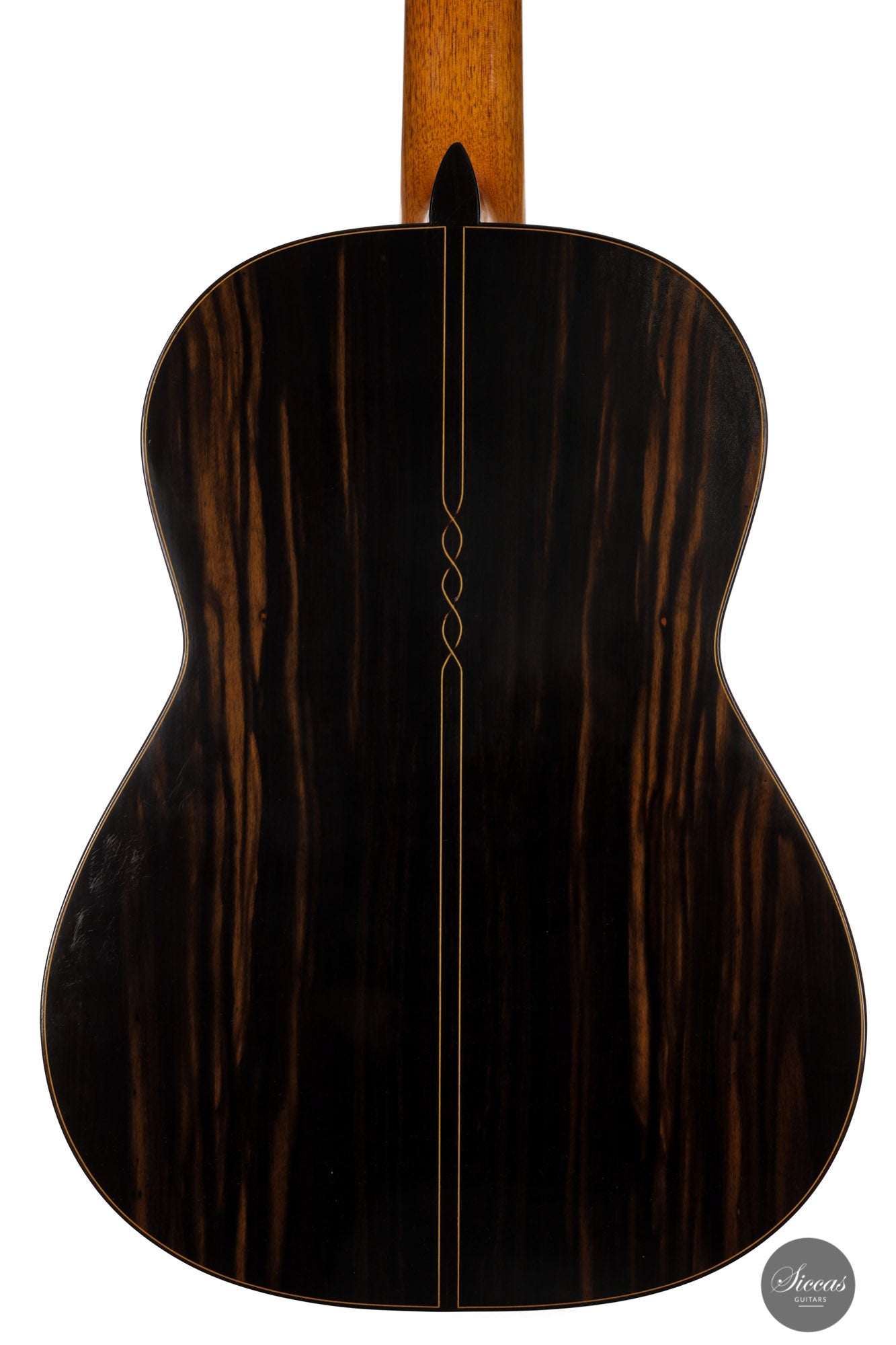Diese wunderbare Gitarre aus dem Jahr 2013 namens "Morgaine" ist ein Grand-Concert-Modell von Philipp Woodfield. Die optisch sehr ansprechende Fichtendecke ist mit einer Lattice Bebalkung versehen. Der Boden und die Zargen sind aus Makassar-Ebenholz. Dieses farbenprächtige Holz ist besonders dicht und reflektiert die Schallwellen bemerkenswert effizient zum Publikum hin, einer ausladenden und kraftvollen Gitarre führt. Der Gesamtzustand dieses Instruments ist großartig. Die Gitarre wurde intensiv gespielt, und nur einige oberflächliche Spielspuren sind auf der Oberfläche zu sehen, zusammen mit leichten Veränderungen des Lacks. Diese Gitarre mit erstklassigen Baljak-Mechaniken ausgestattet.