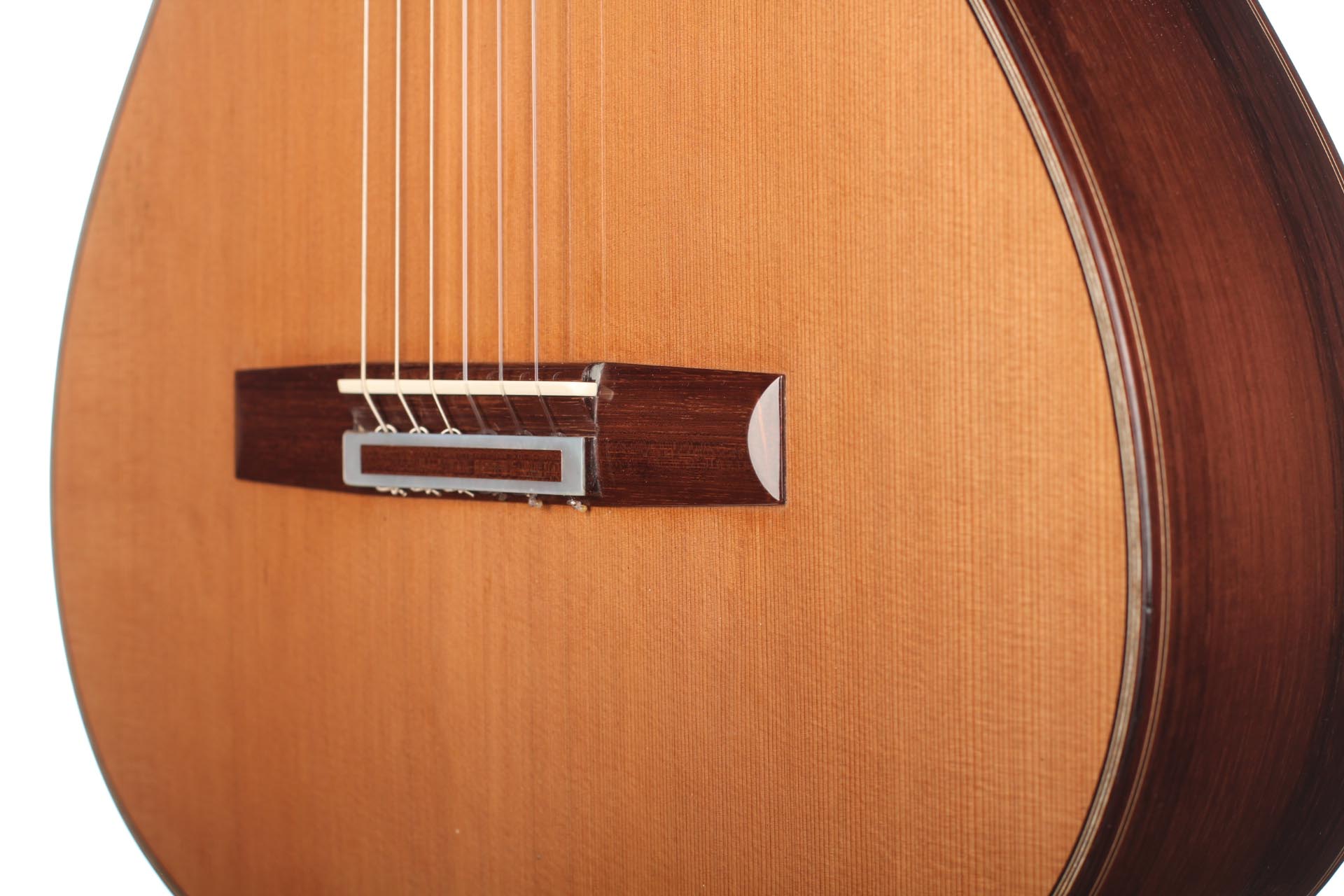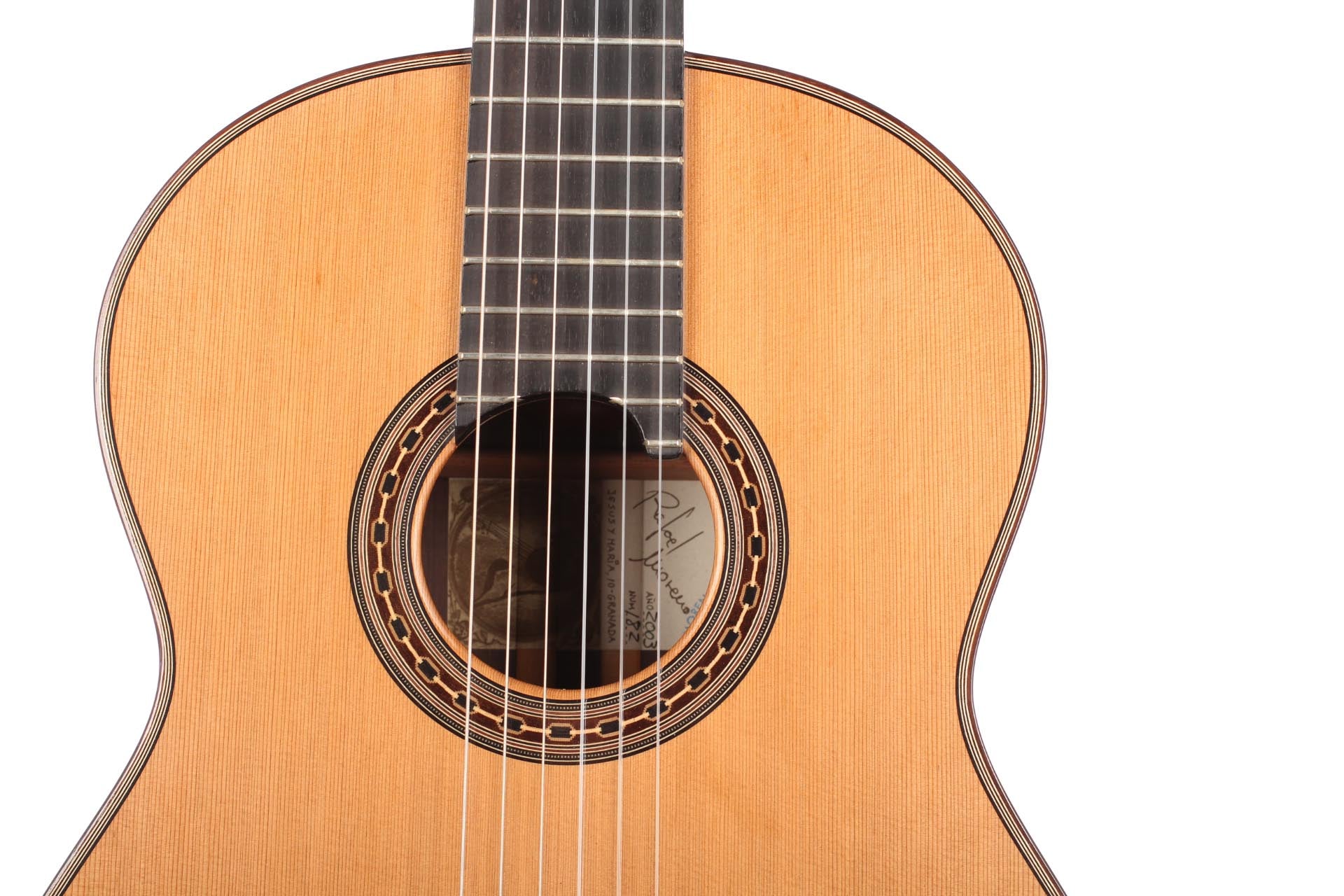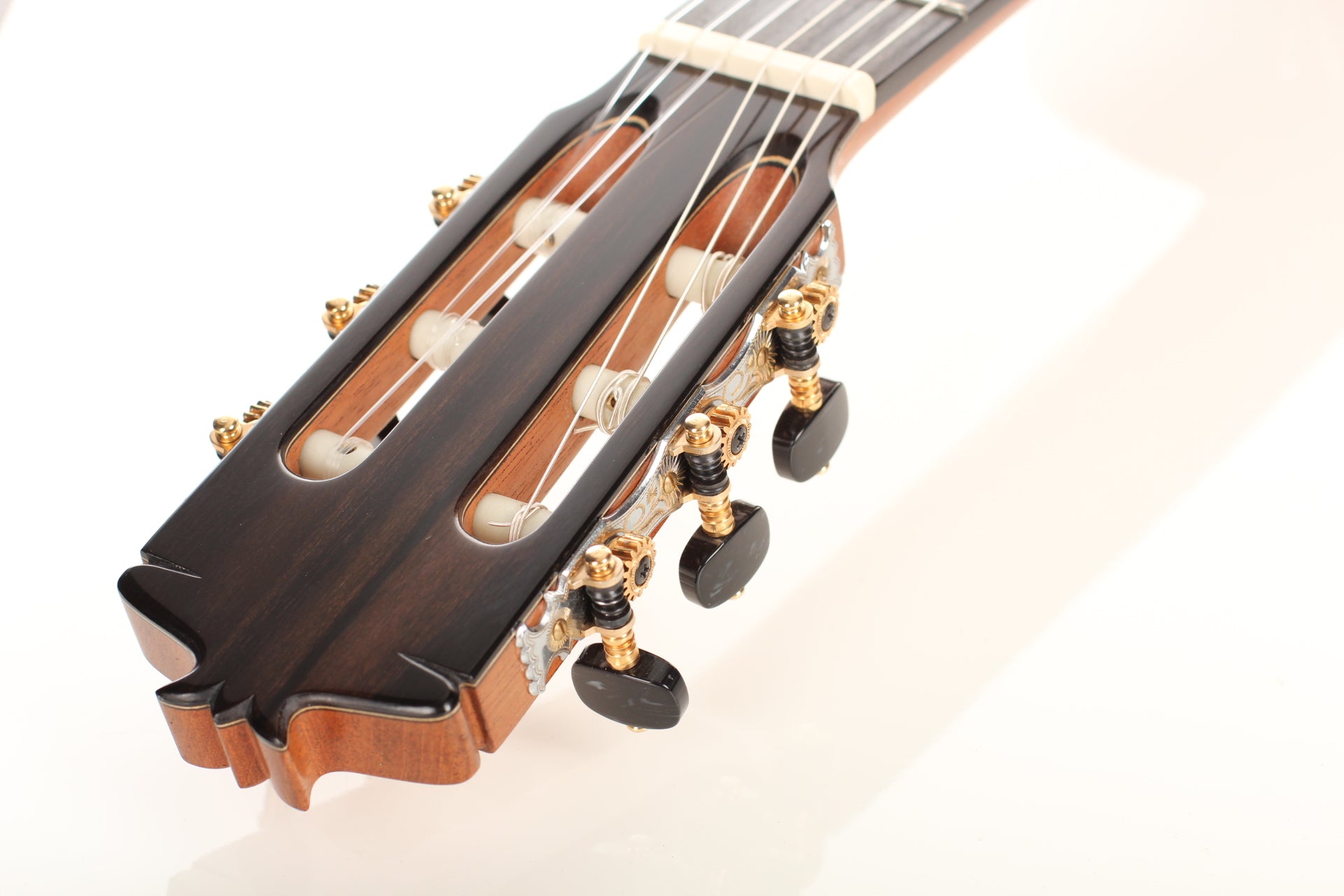 This instrument has a warm and full sound, allowing tragic dynamics and incredibly rich pianos. The guitar is very well balanced and the quality on the tone is constant all along the neck. From bass to treble, it is a generous guitar with plentiful of possibilities and a strong personality. All French-polished. A hard-shell case is included.