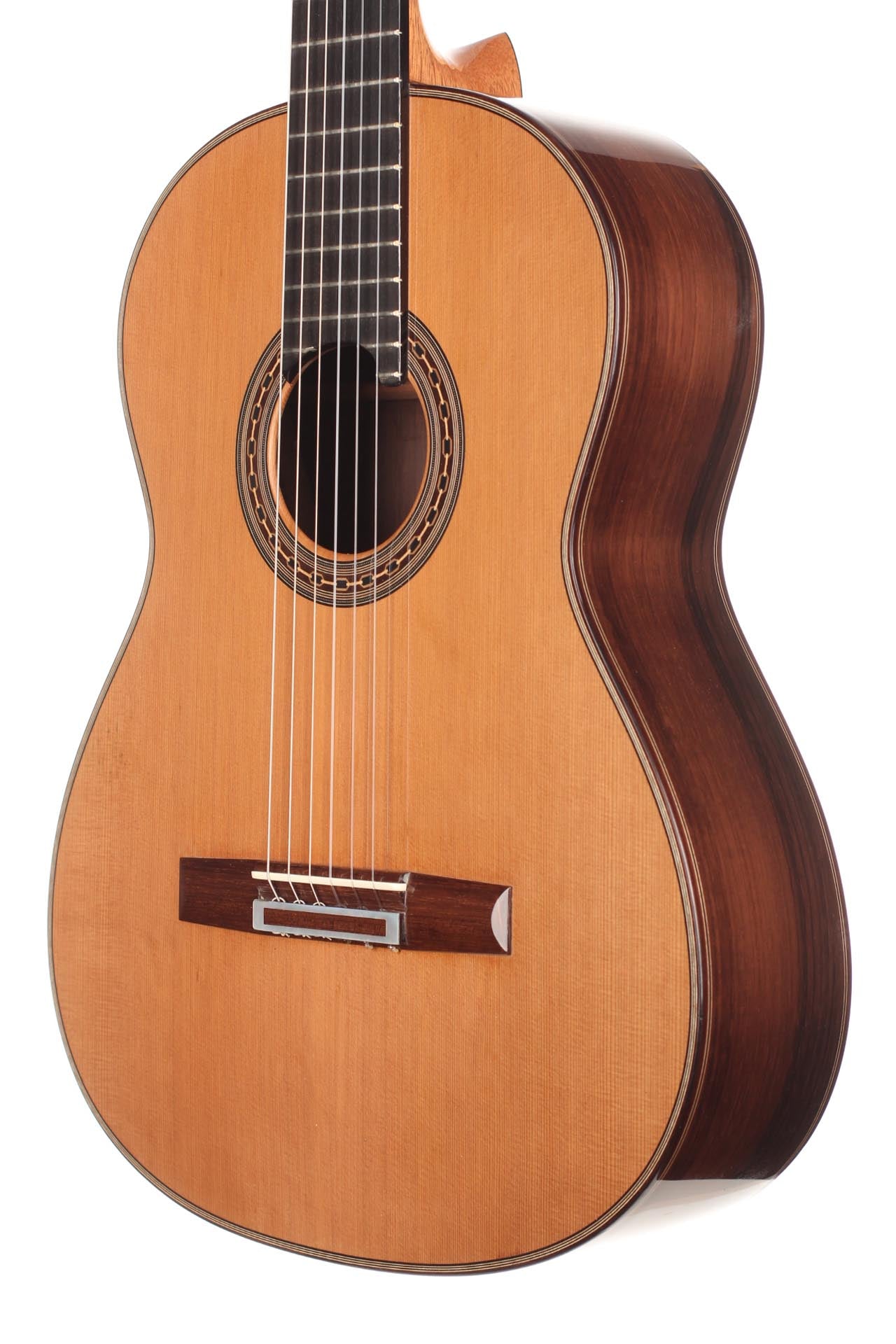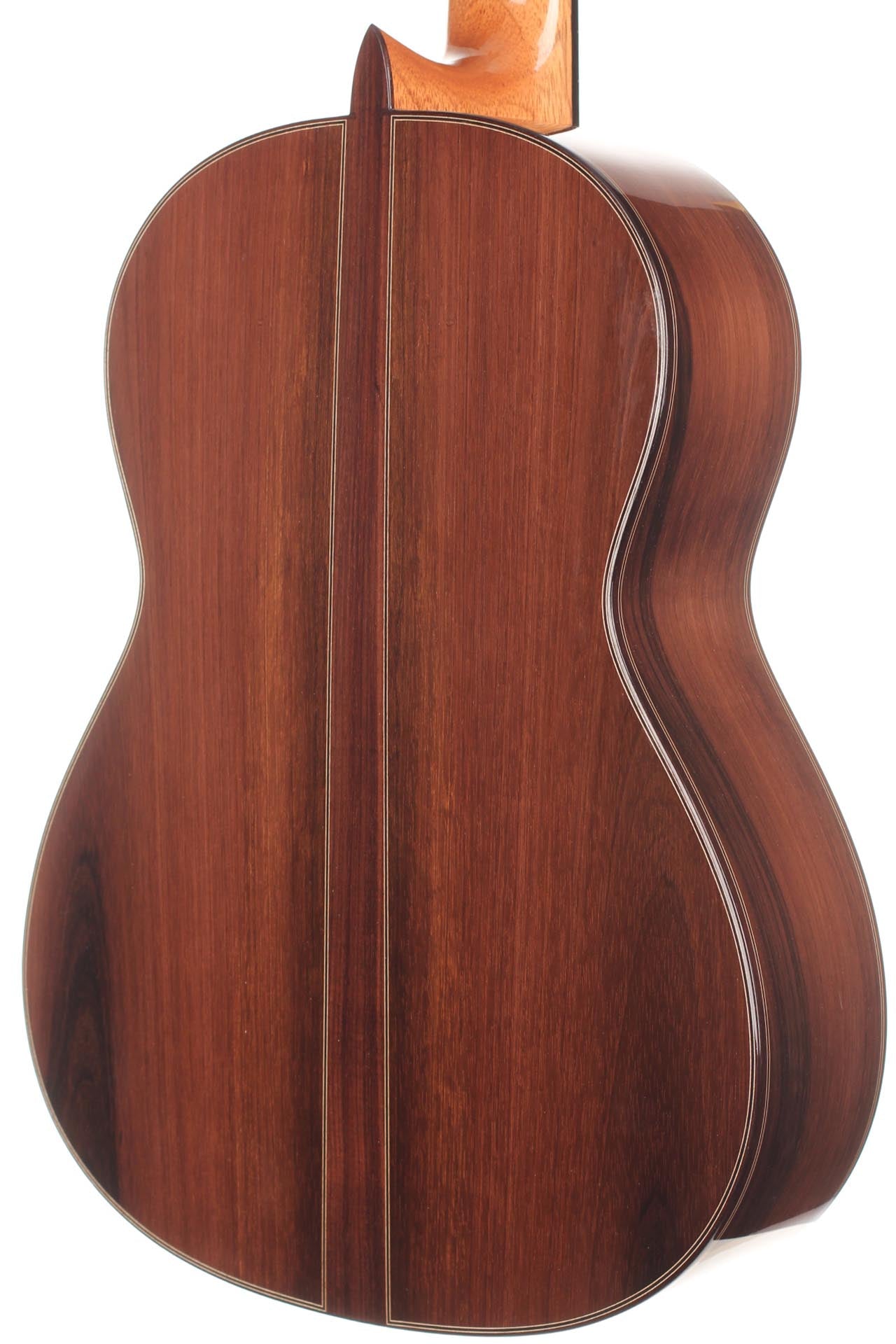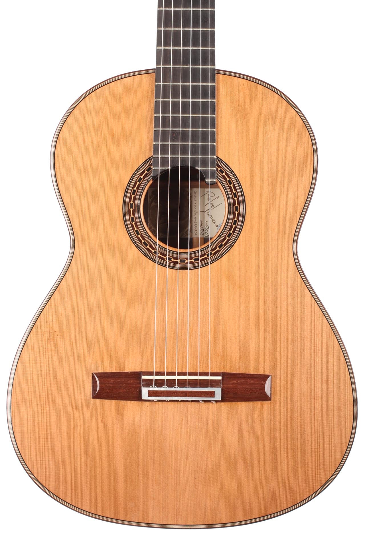 This instrument has a warm and full sound, allowing tragic dynamics and incredibly rich pianos. The guitar is very well balanced and the quality on the tone is constant all along the neck. From bass to treble, it is a generous guitar with plentiful of possibilities and a strong personality. All French-polished. A hard-shell case is included.