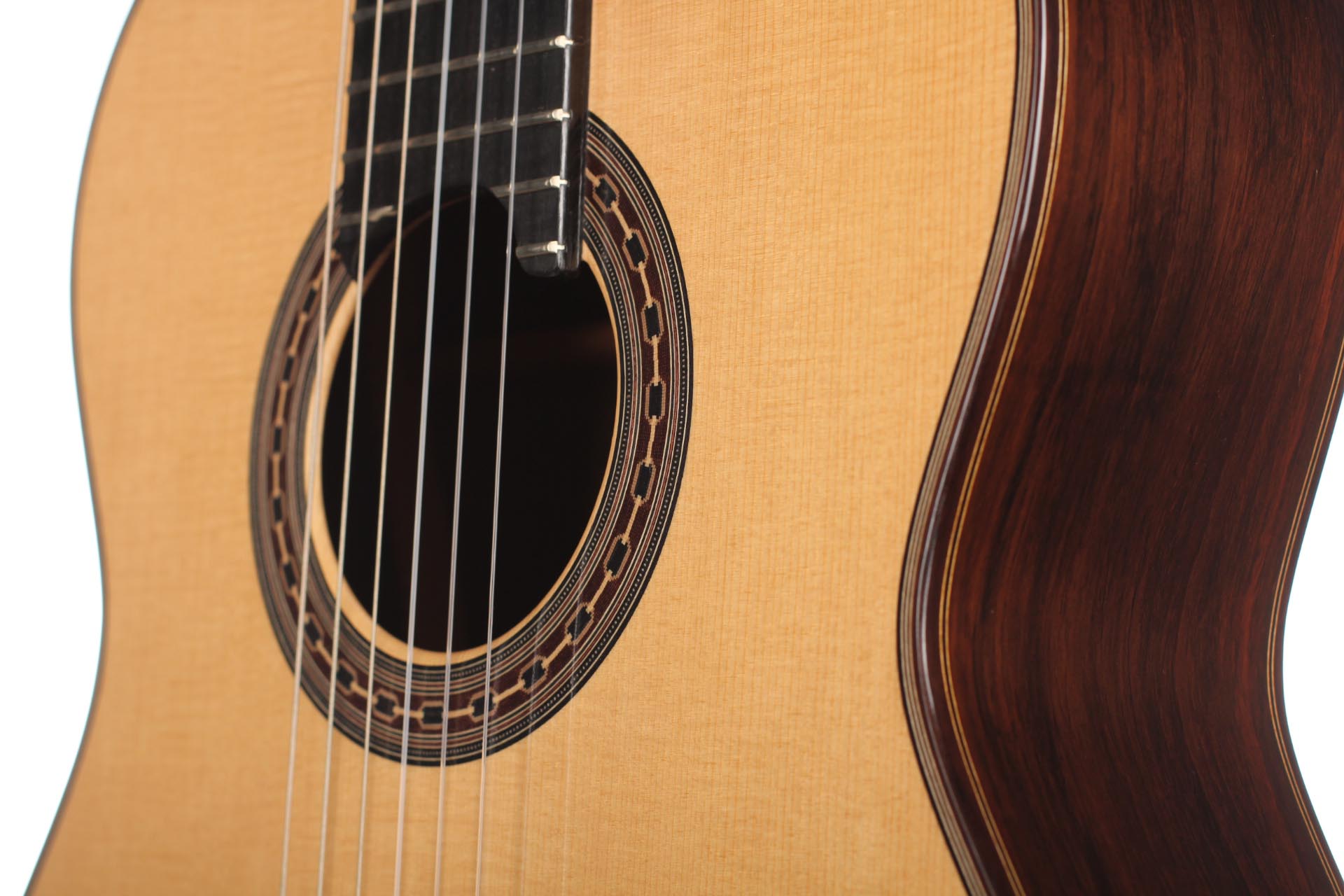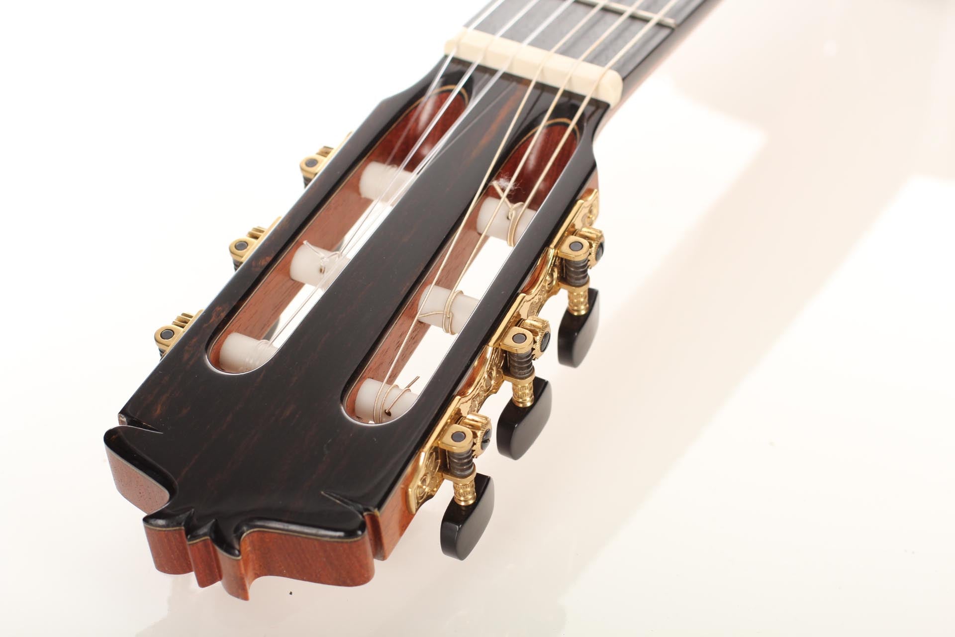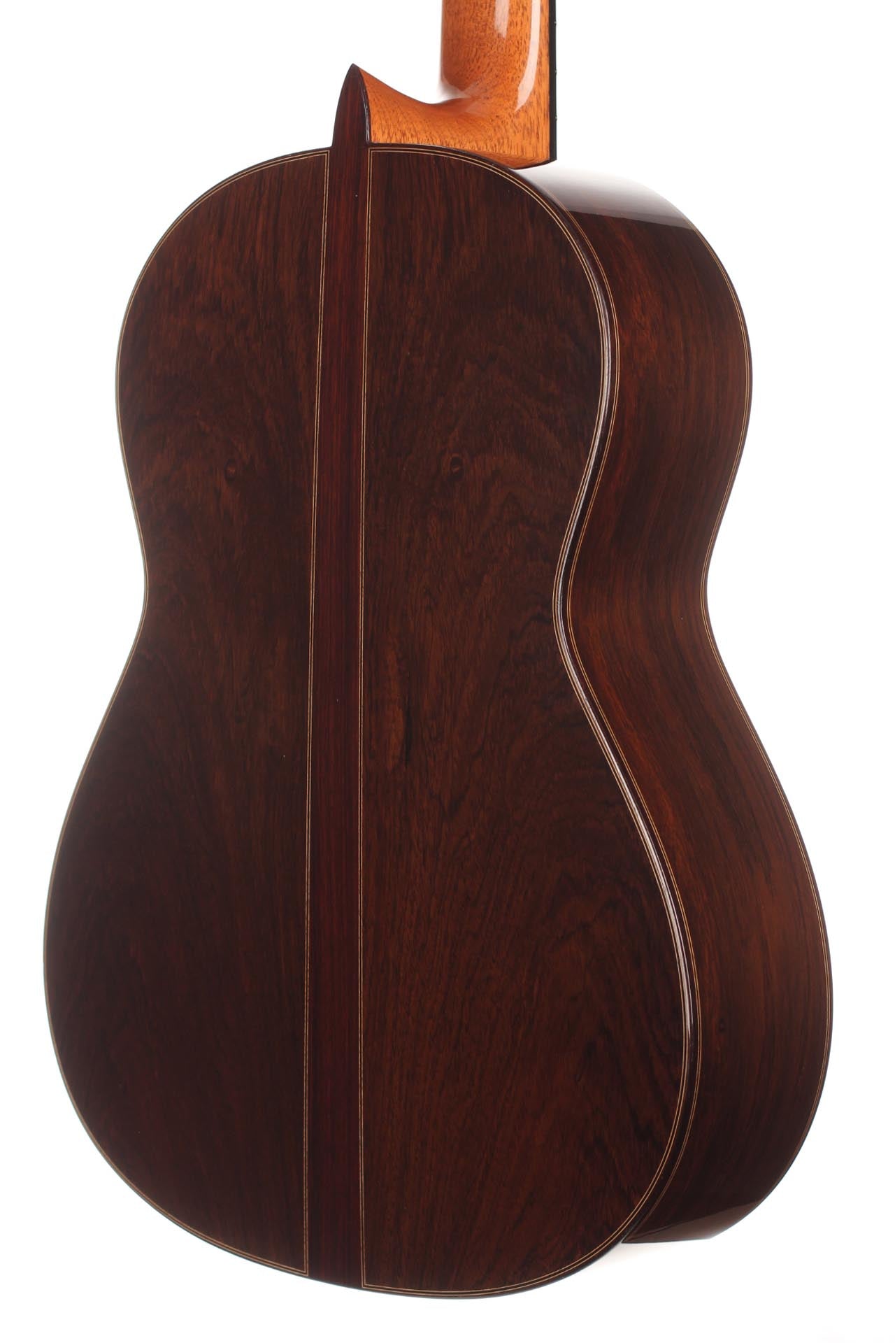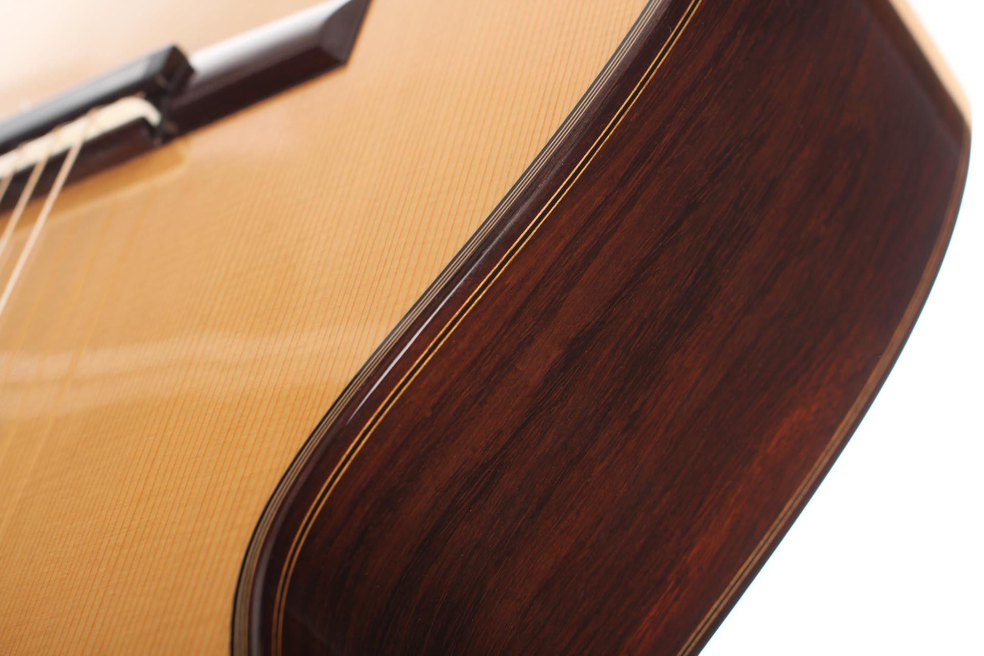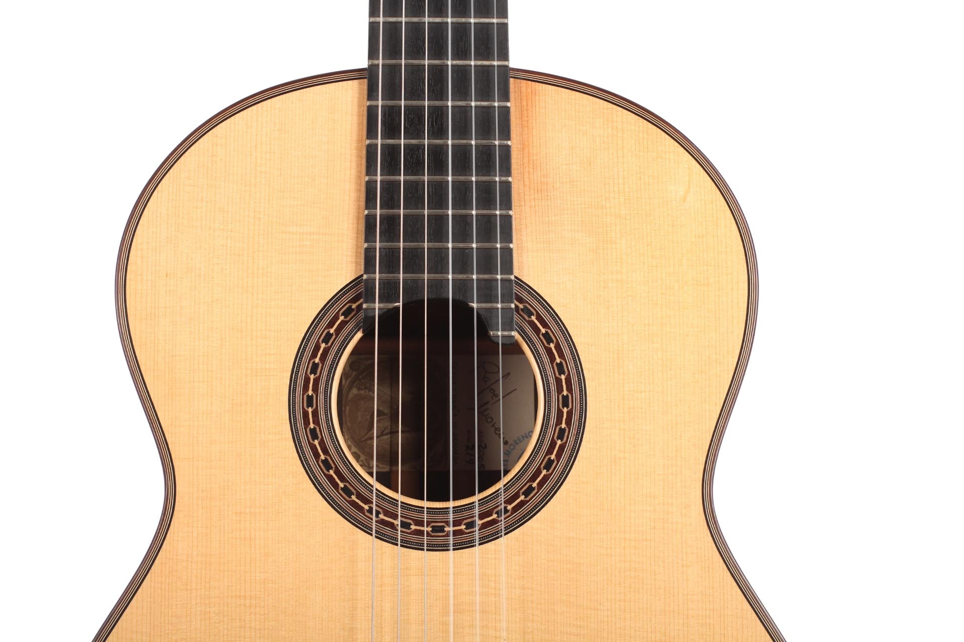 Diese klassische Gitarre wurde 2005 von Rafael Moreno gebaut. Er zählt heute zu den bekanntesten und renommiertesten Gitarrenbauern unserer Zeit. Schon mit 13 Jahren begann er eine Ausbildung in der Werkstatt von Manuel Lopez Bellido und später auch bei Antonio Marin Montero sowie Eduardo Ferrer Castillo. Schließlich, im Jahre 1976, eröffnete seine eigene Werkstatt in der Calle Jesus y Maria, Granada. Die Decke dieser wunderschönen Gitarre ist aus Fichte, der Boden und die Zargen sind aus Amazonas Palisander. Veredelt wurde die Gitarre mit einer Schellackpolitur. Die Mechaniken sind von Rubner. Es sind kleinere Spielspuren auf Boden und Zargen sichtbar. Eine Hiscox Pro II Koffer ist inklusive.