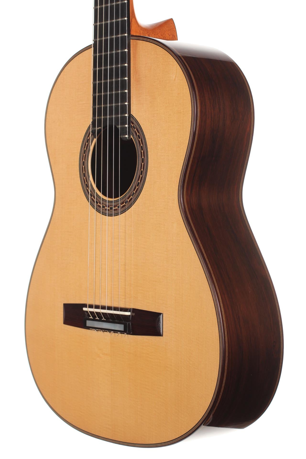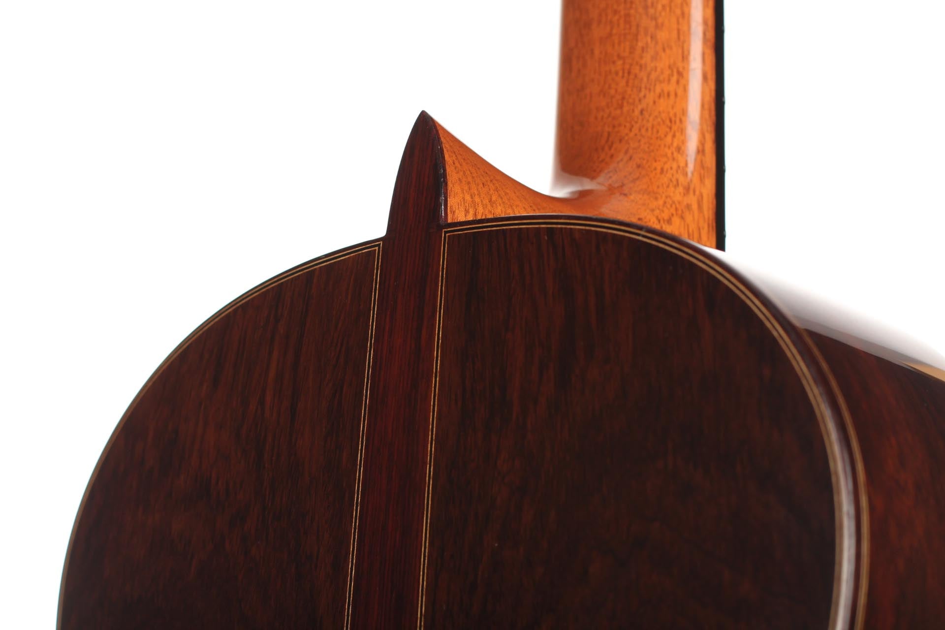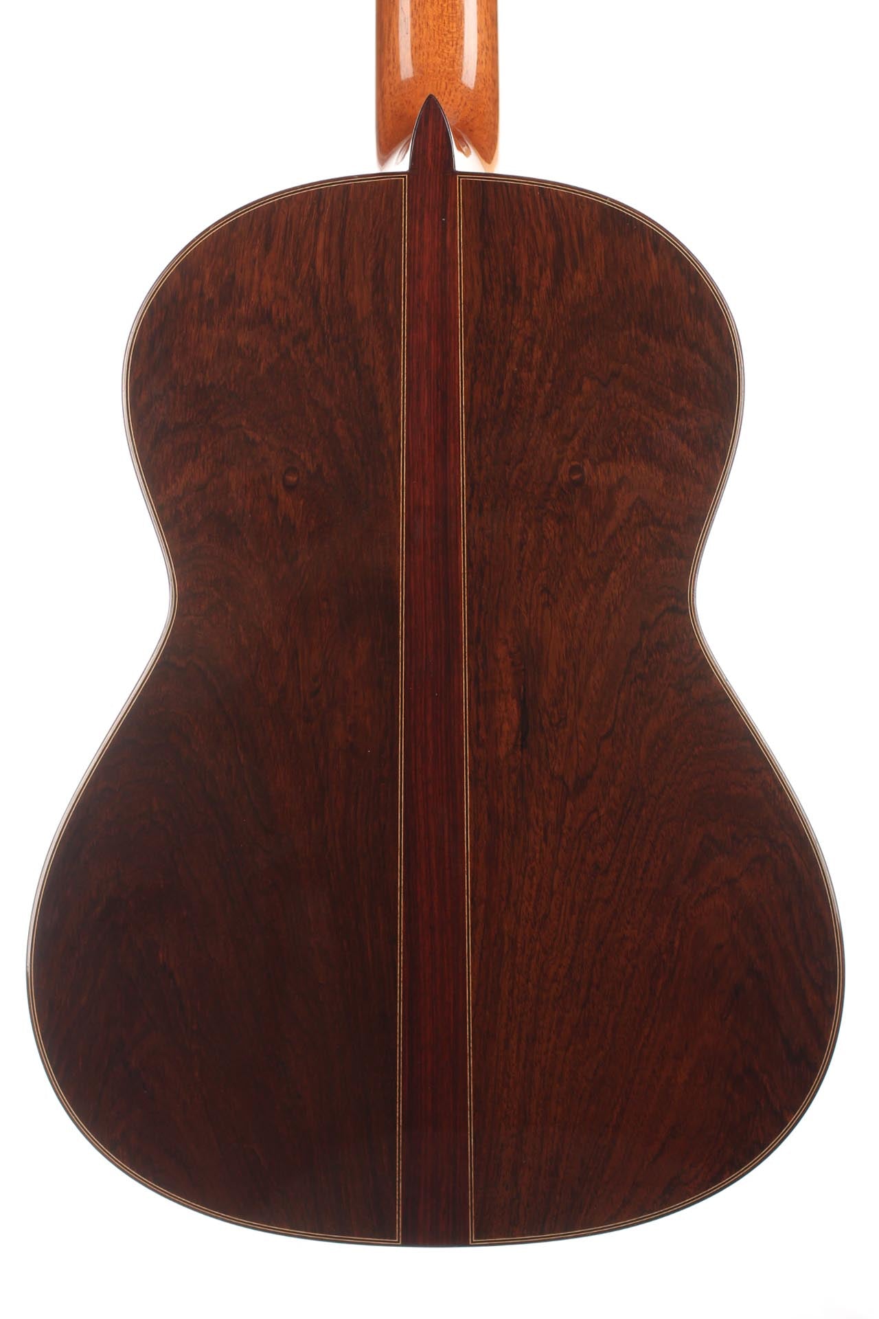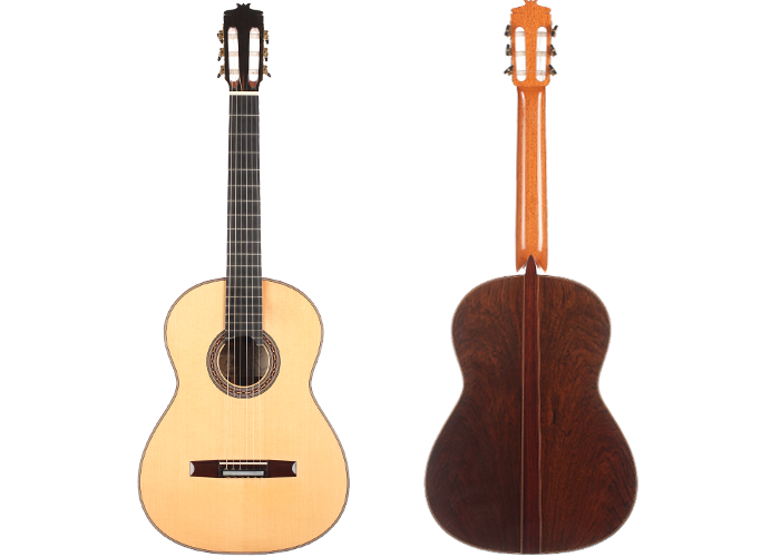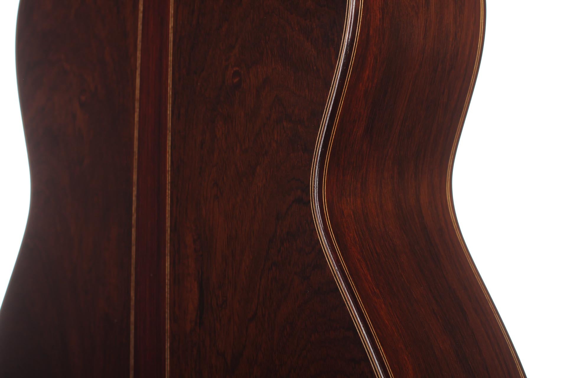 Diese klassische Gitarre wurde 2005 von Rafael Moreno gebaut. Er zählt heute zu den bekanntesten und renommiertesten Gitarrenbauern unserer Zeit. Schon mit 13 Jahren begann er eine Ausbildung in der Werkstatt von Manuel Lopez Bellido und später auch bei Antonio Marin Montero sowie Eduardo Ferrer Castillo. Schließlich, im Jahre 1976, eröffnete seine eigene Werkstatt in der Calle Jesus y Maria, Granada. Die Decke dieser wunderschönen Gitarre ist aus Fichte, der Boden und die Zargen sind aus Amazonas Palisander. Veredelt wurde die Gitarre mit einer Schellackpolitur. Die Mechaniken sind von Rubner. Es sind kleinere Spielspuren auf Boden und Zargen sichtbar. Eine Hiscox Pro II Koffer ist inklusive.