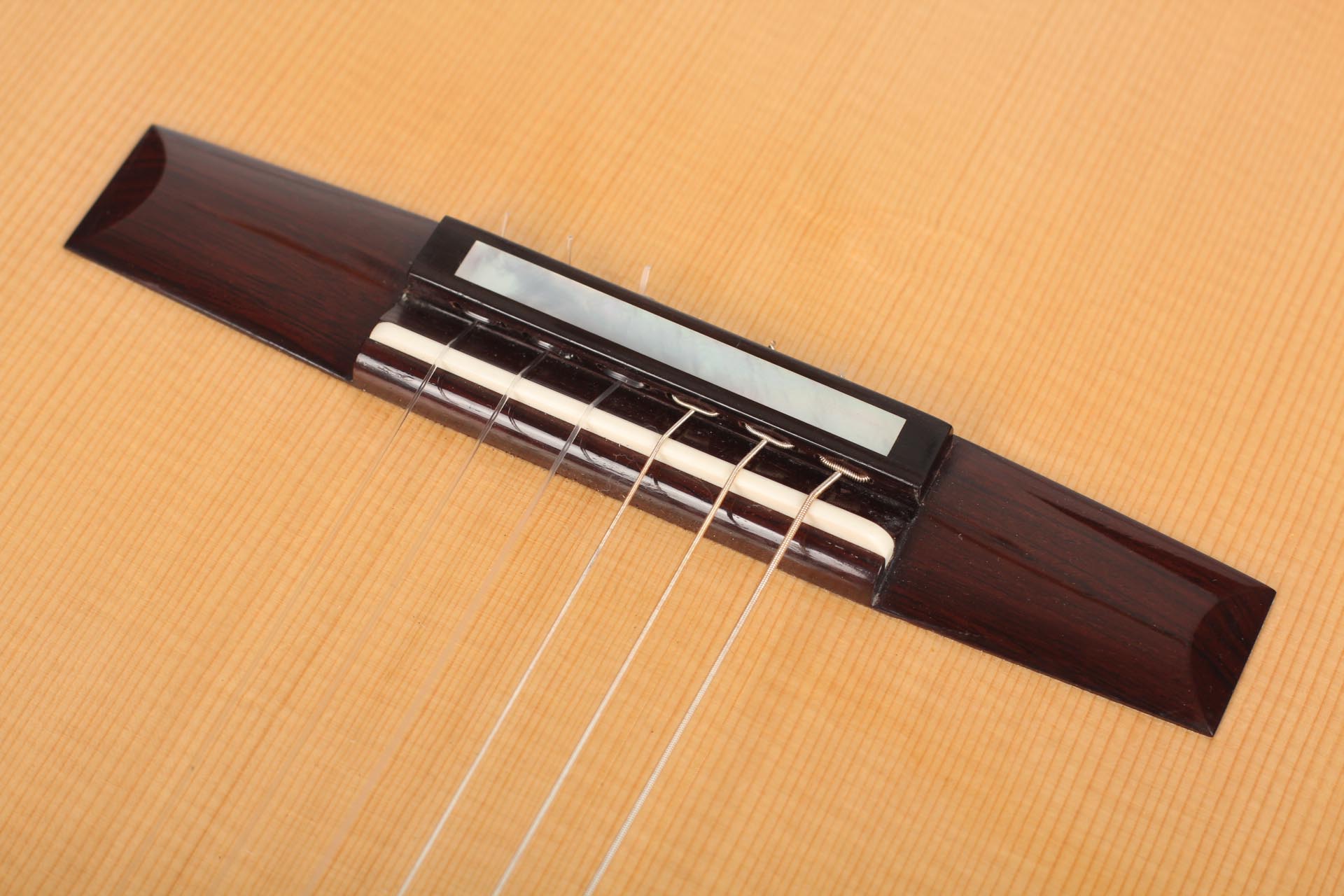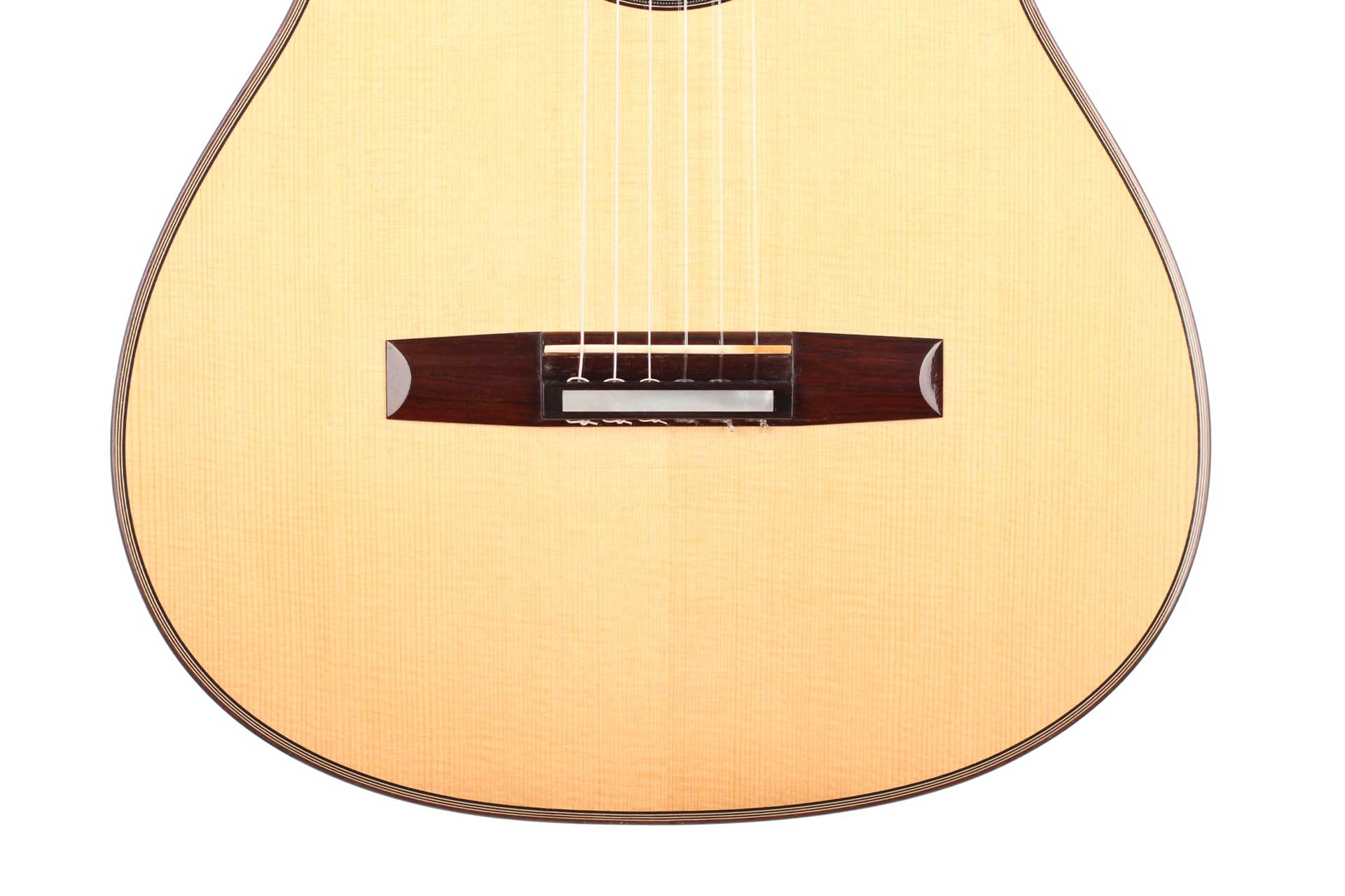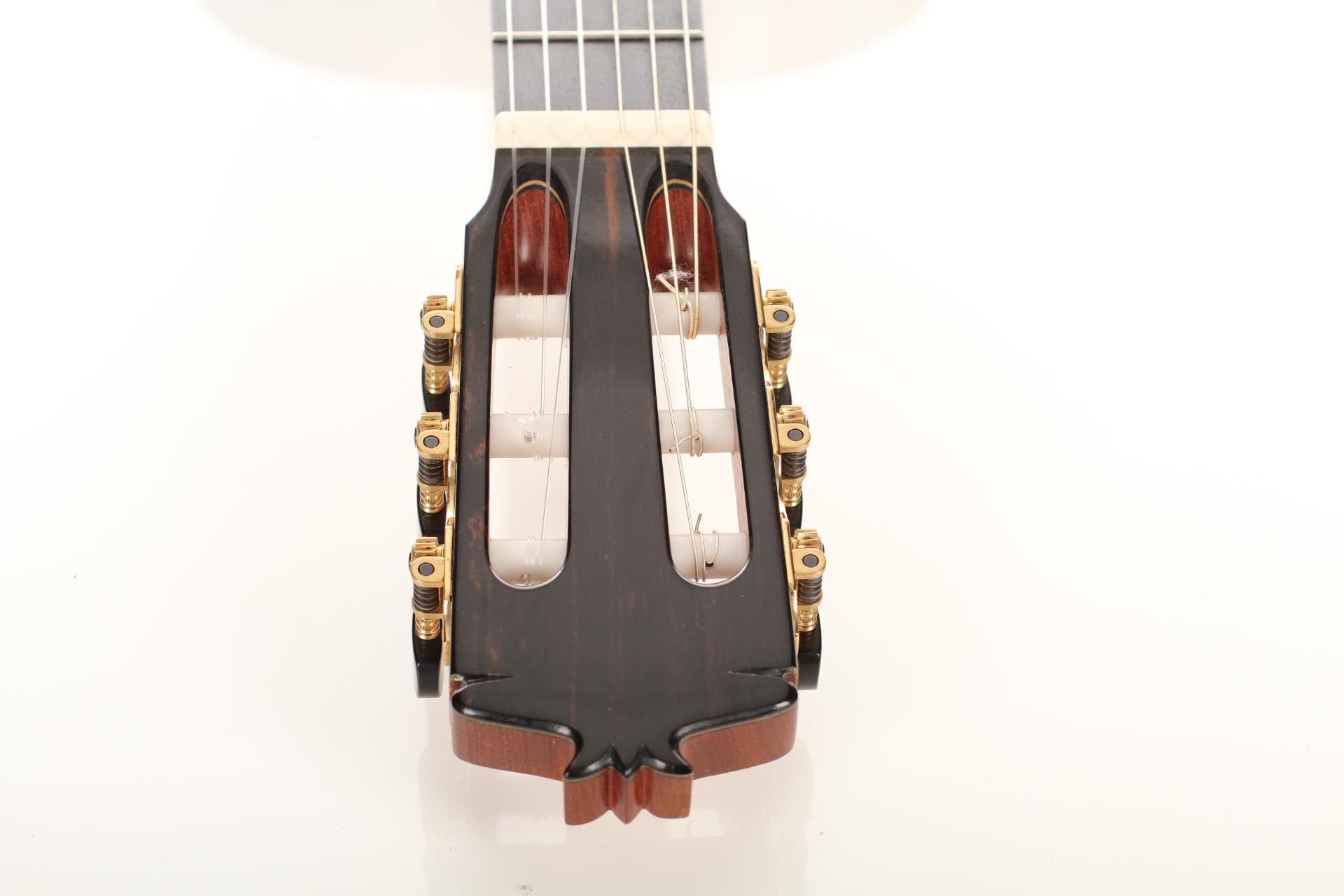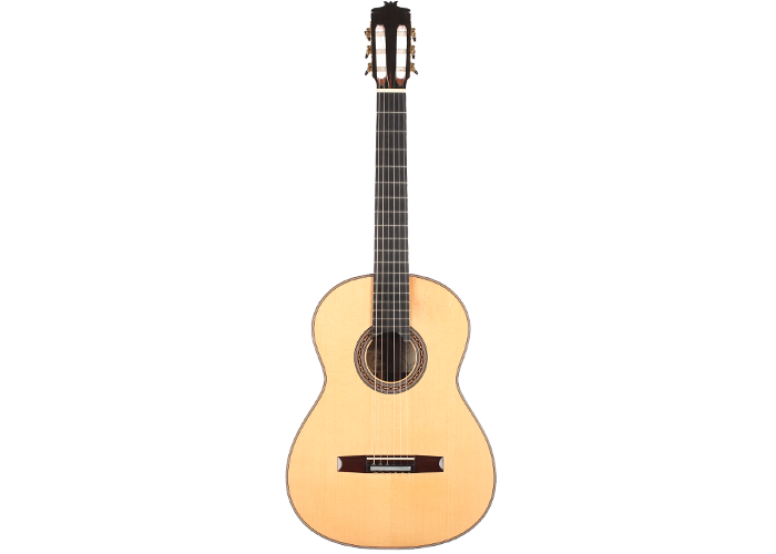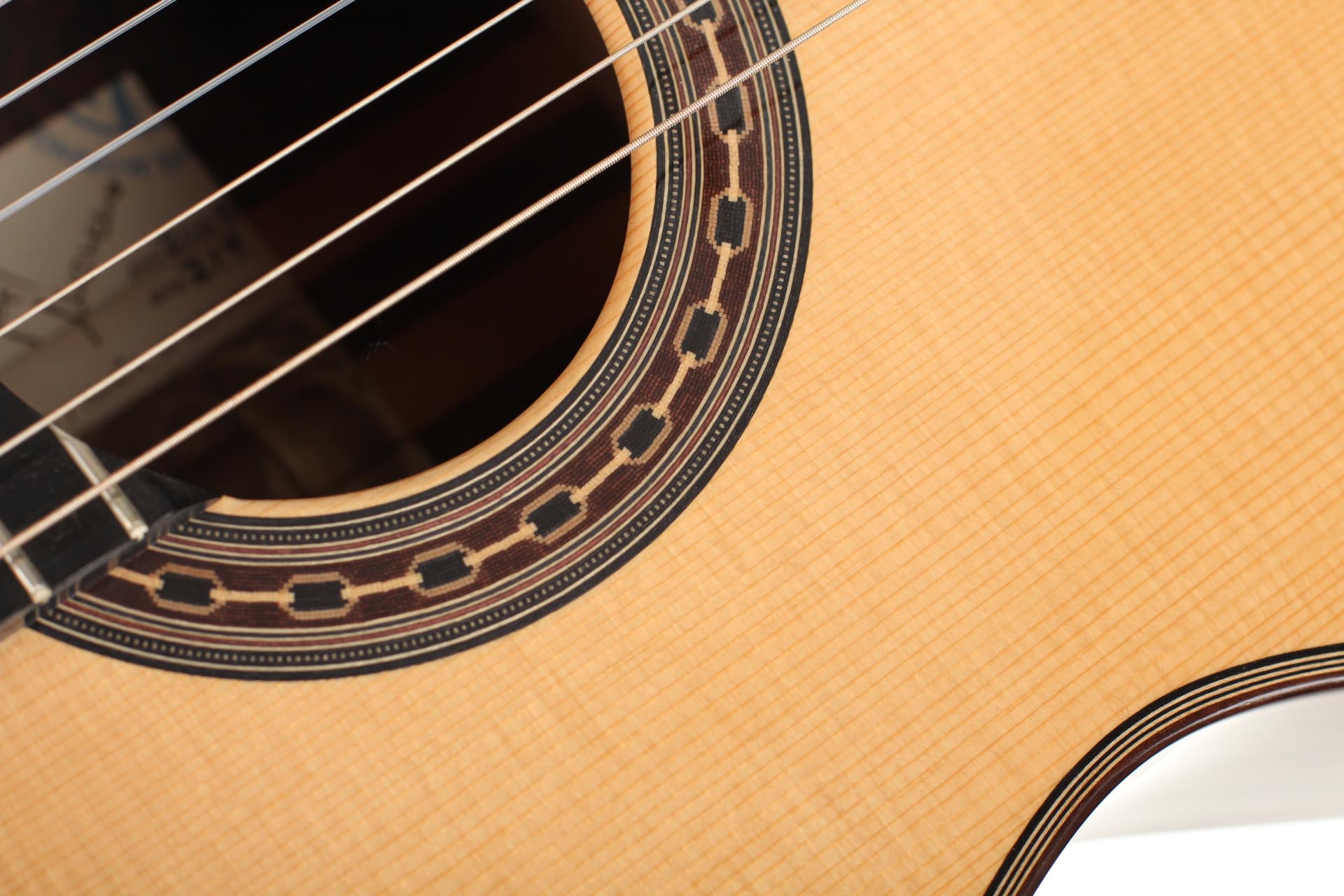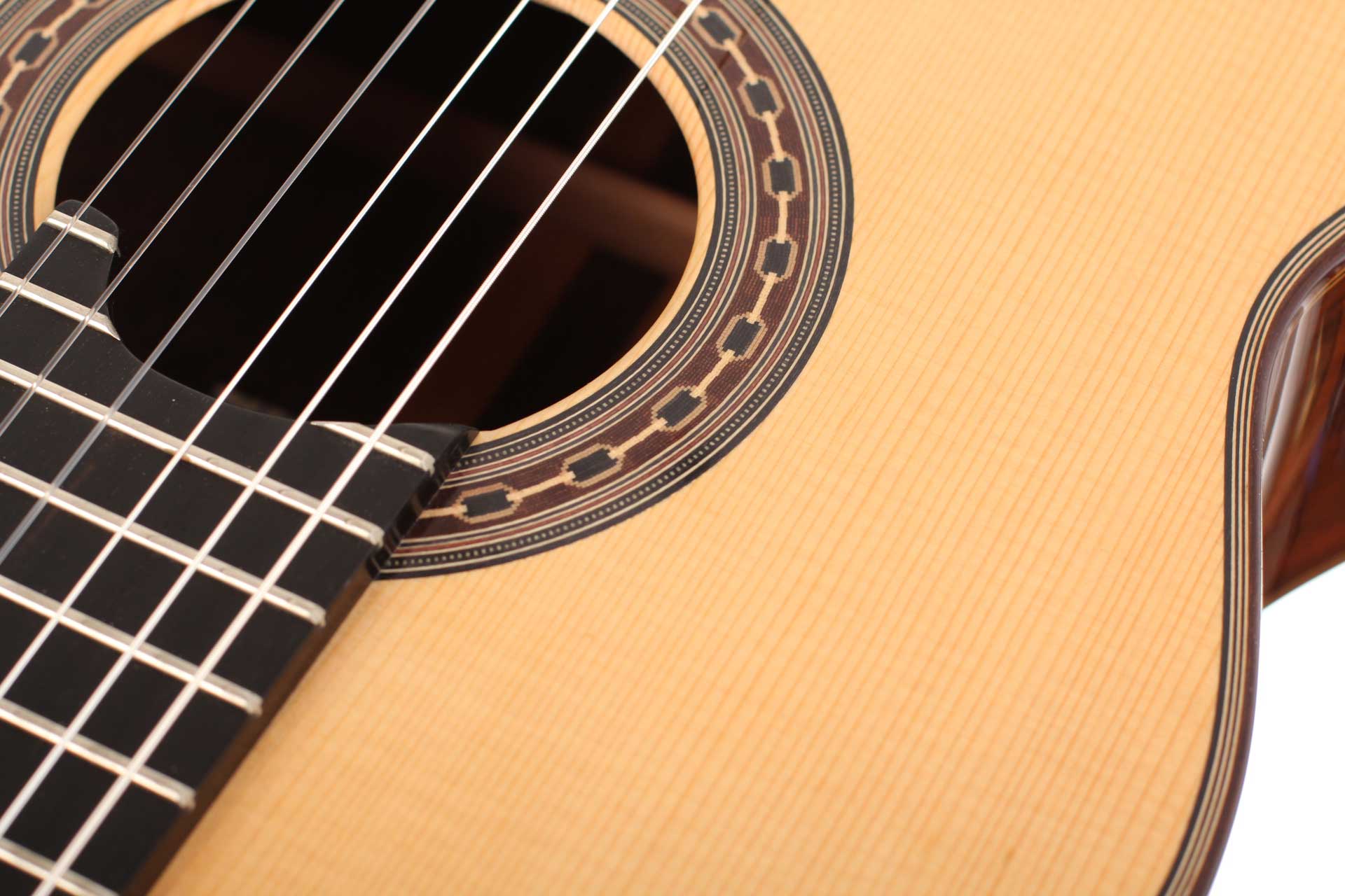 Diese klassische Gitarre wurde 2005 von Rafael Moreno gebaut. Er zählt heute zu den bekanntesten und renommiertesten Gitarrenbauern unserer Zeit. Schon mit 13 Jahren begann er eine Ausbildung in der Werkstatt von Manuel Lopez Bellido und später auch bei Antonio Marin Montero sowie Eduardo Ferrer Castillo. Schließlich, im Jahre 1976, eröffnete seine eigene Werkstatt in der Calle Jesus y Maria, Granada. Die Decke dieser wunderschönen Gitarre ist aus Fichte, der Boden und die Zargen sind aus Amazonas Palisander. Veredelt wurde die Gitarre mit einer Schellackpolitur. Die Mechaniken sind von Rubner. Es sind kleinere Spielspuren auf Boden und Zargen sichtbar. Eine Hiscox Pro II Koffer ist inklusive.
